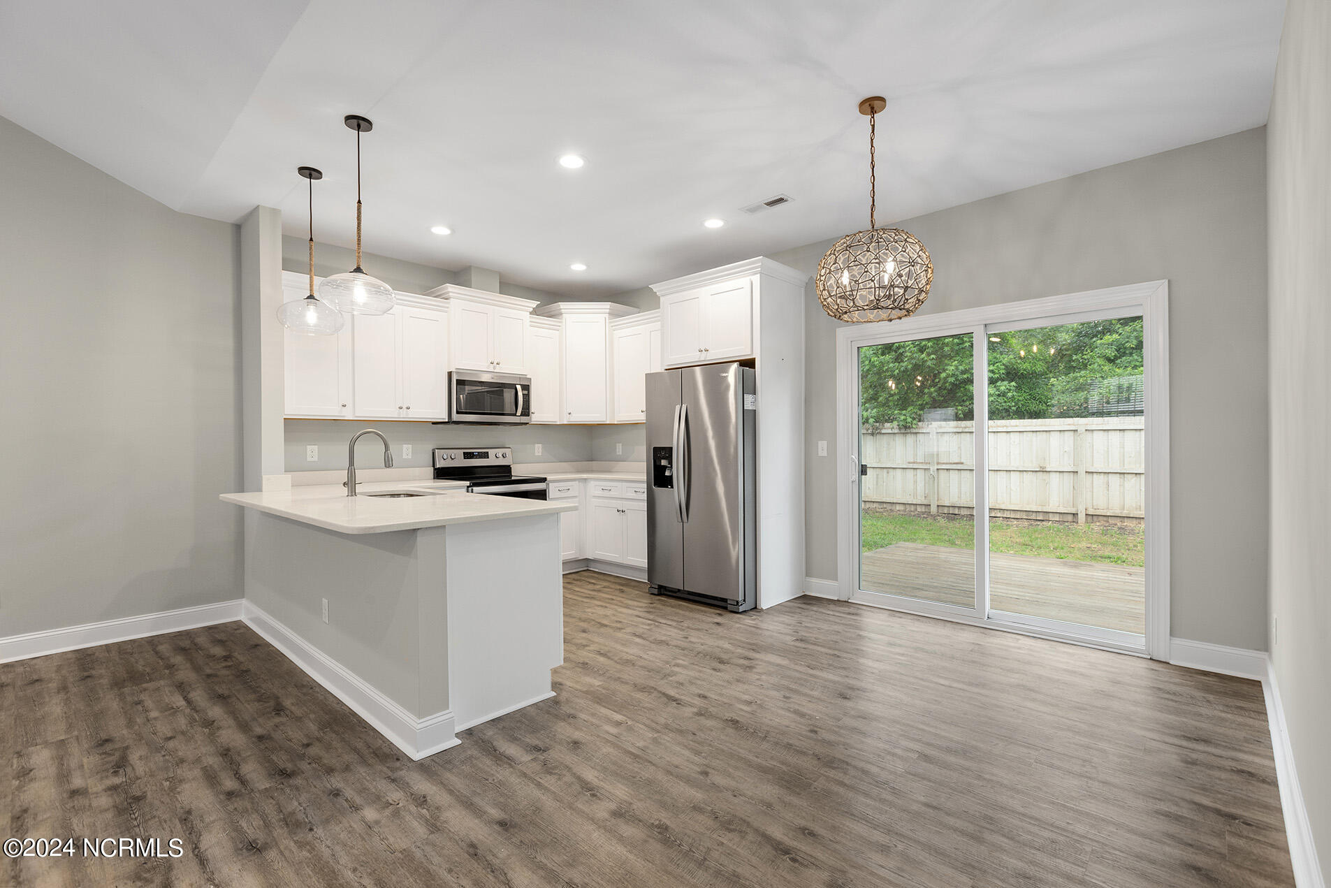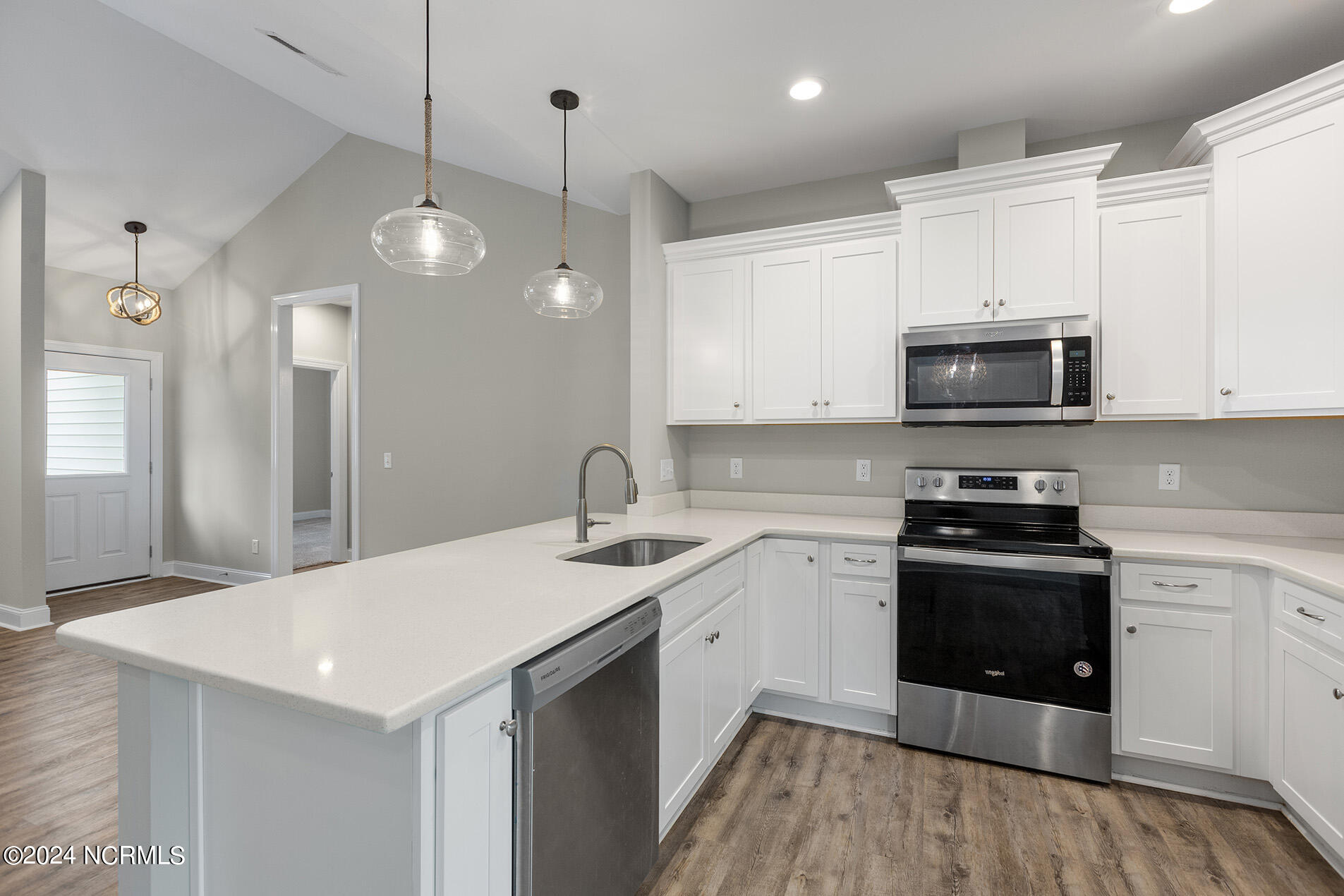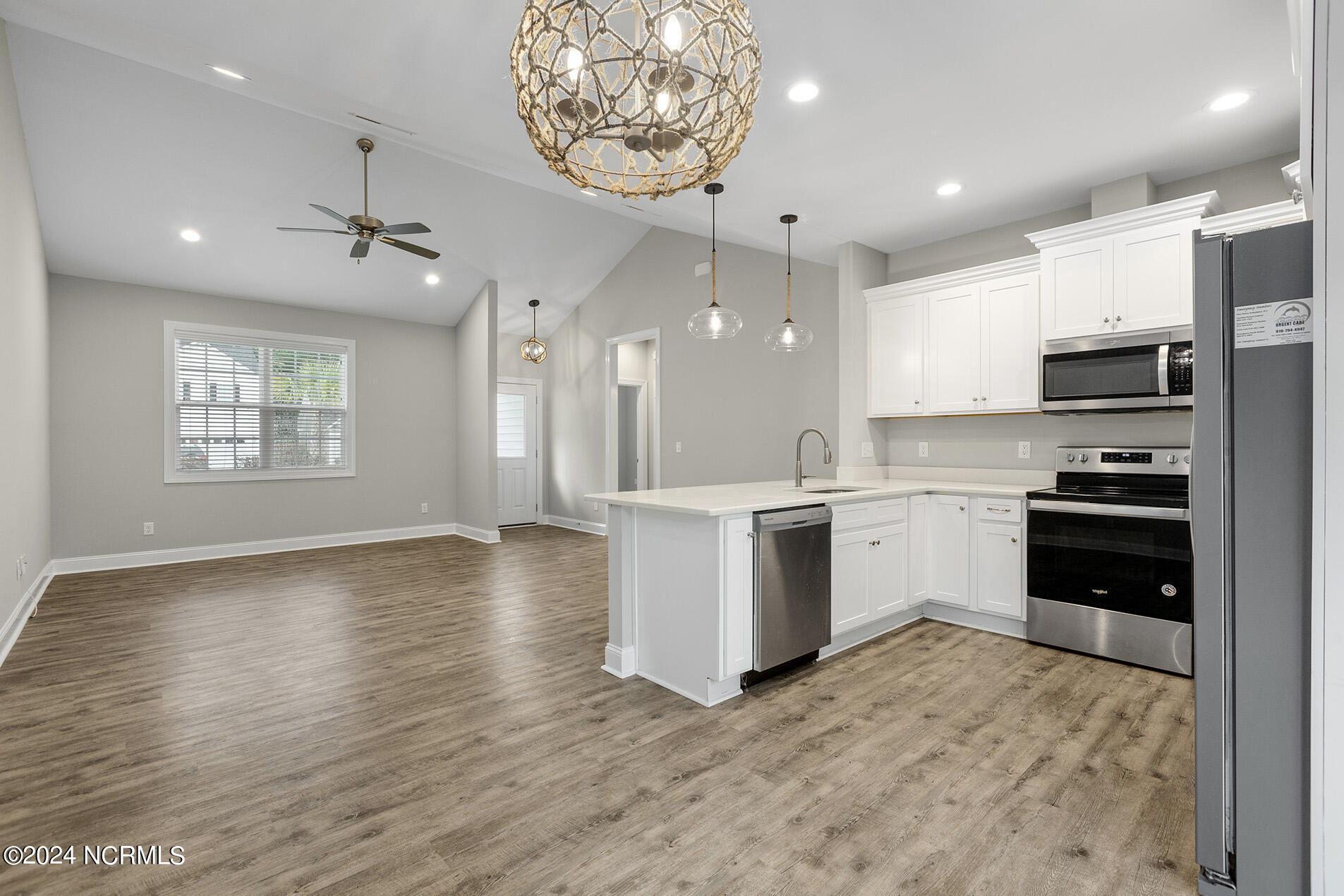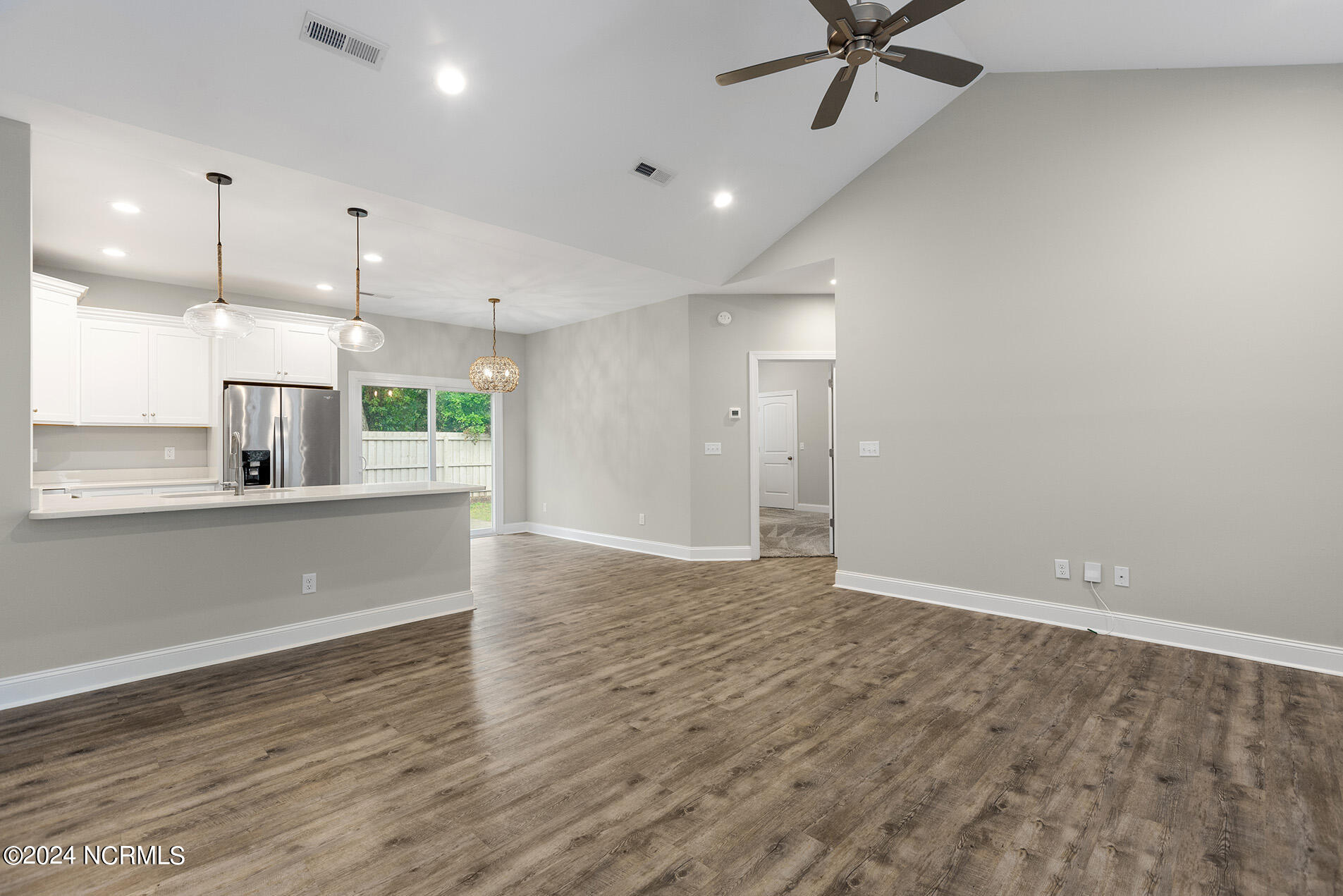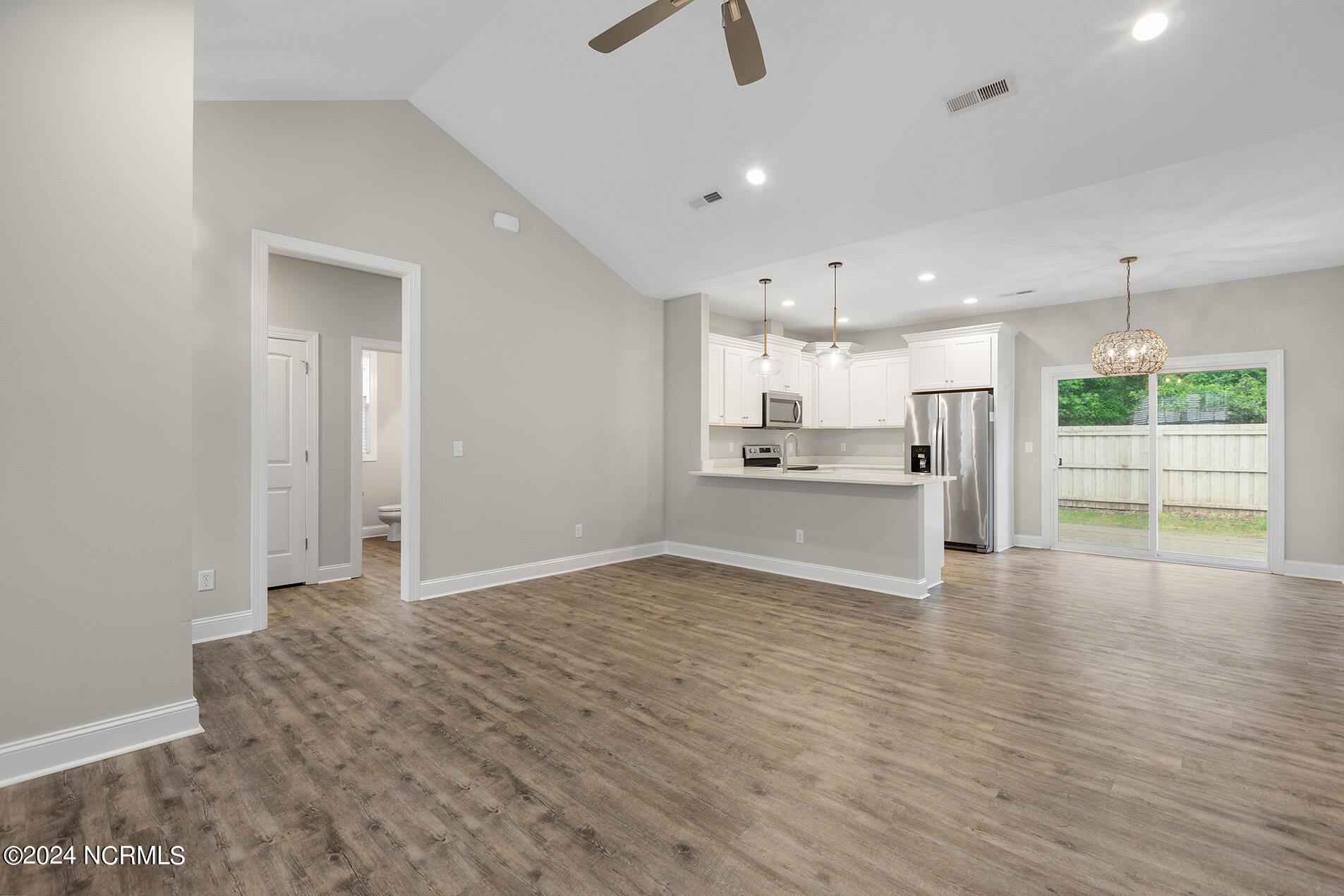 You will love this move-in ready, 3 bedroom and 2 bathroom home in the delightful community of Lily Pond. The open-designed floor plan is enhanced with vaulted ceilings, coastal light fixtures, wide plank flooring, and a neutral color palette throughout the living room and kitchen. The abundance of natural light in the living space complements the stunning white kitchen, which boasts white, slow-close shaker cabinets and quartz counters. Stainless appliances nicely accent these features, and a cheerful breakfast nook is positioned nearby. The highly sought-after split floor plan thoughtfully places the two guest rooms directly off of the entryway with a shared full bathroom in between. Beyond the kitchen, you will find the laundry room and the primary suite; the adjoining ensuite is comprised of wide plank flooring, a white shaker double vanity, brushed nickel hardware, and cultured marble countertops. A spacious bonus room, perfect for guests or a home office, is upstairs. Other features include a two-car garage, fresh paint throughout, a fenced-in yard, and a deck!