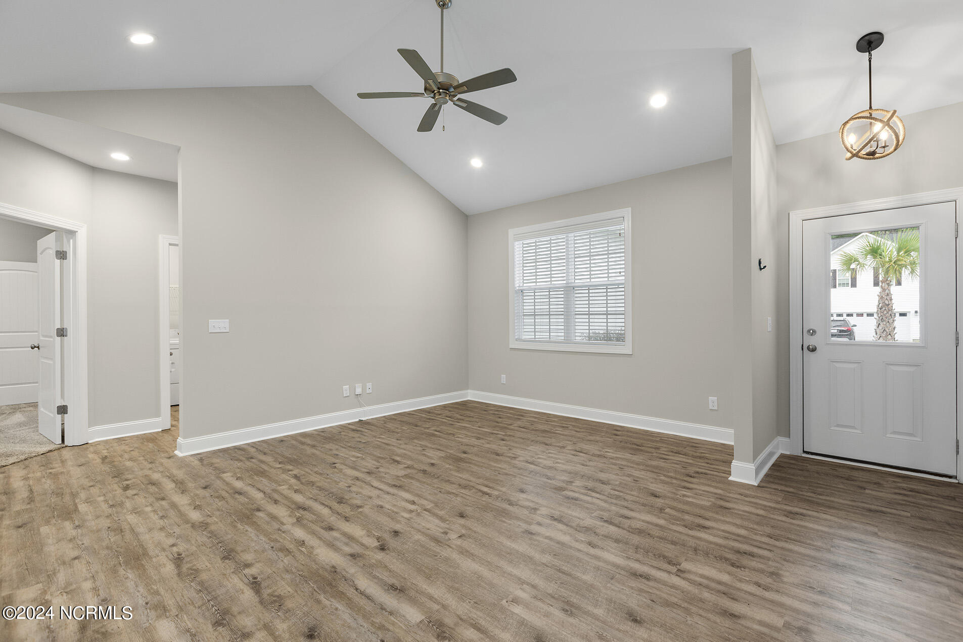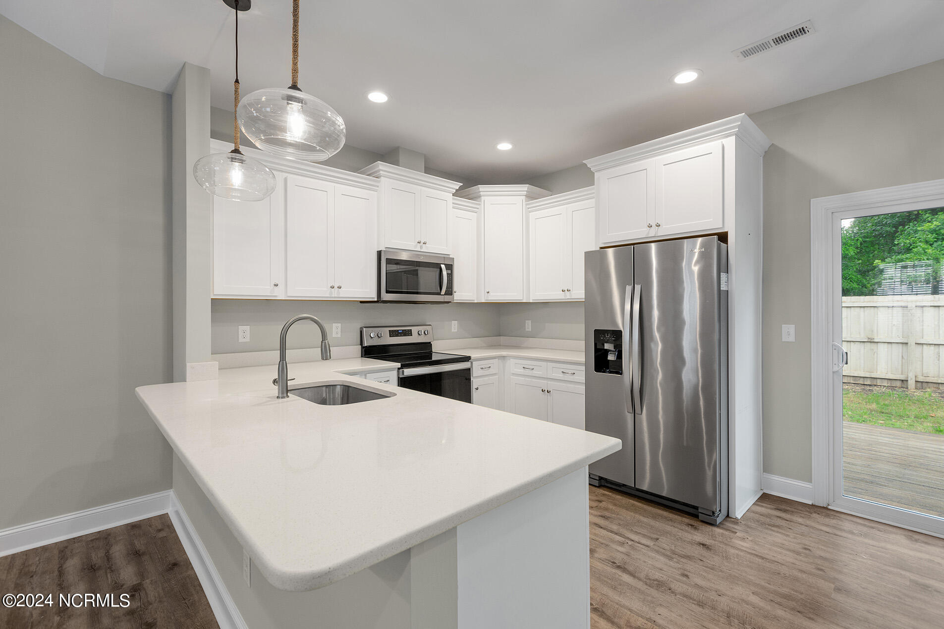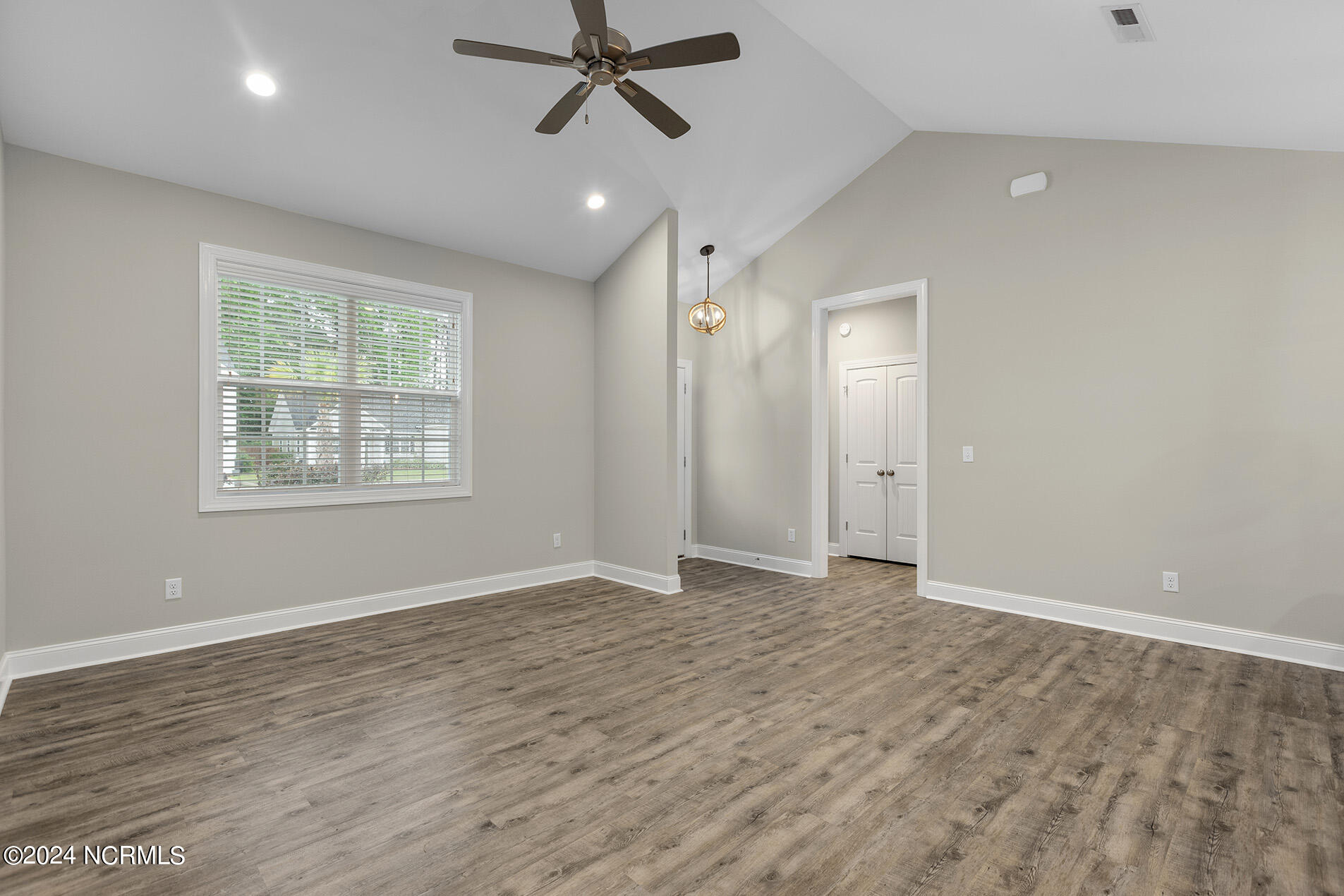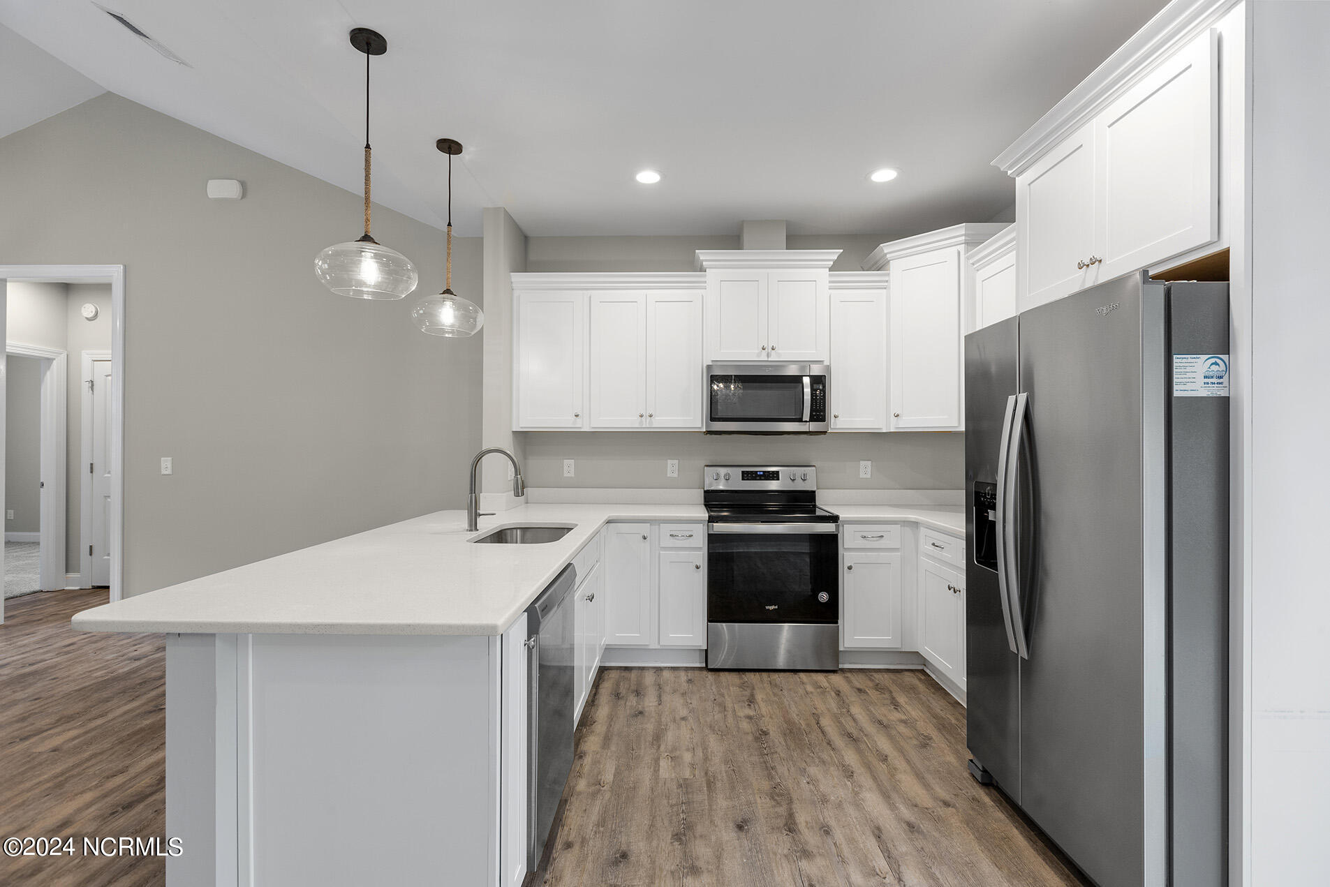 You will love this move-in ready, 3 bedroom and 2 bathroom home in the delightful community of Lily Pond. The open-designed floor plan is enhanced with vaulted ceilings, coastal light fixtures, wide plank flooring, and a neutral color palette throughout the living room and kitchen. The abundance of natural light in the living space complements the stunning white kitchen, which boasts white, slow-close shaker cabinets and quartz counters. Stainless appliances nicely accent these features, and a cheerful breakfast nook is positioned nearby. The highly sought-after split floor plan thoughtfully places the two guest rooms directly off of the entryway with a shared full bathroom in between. Beyond the kitchen, you will find the laundry room and the primary suite; the adjoining ensuite is comprised of wide plank flooring, a white shaker double vanity, brushed nickel hardware, and cultured marble countertops. A spacious bonus room, perfect for guests or a home office, is upstairs. Other features include a two-car garage, fresh paint throughout, a fenced-in yard, and a deck!