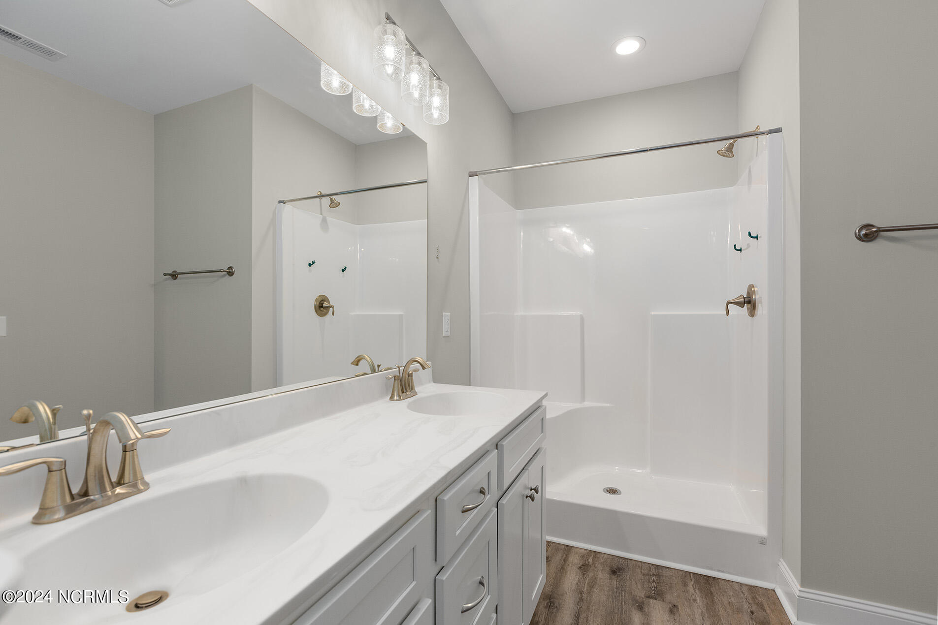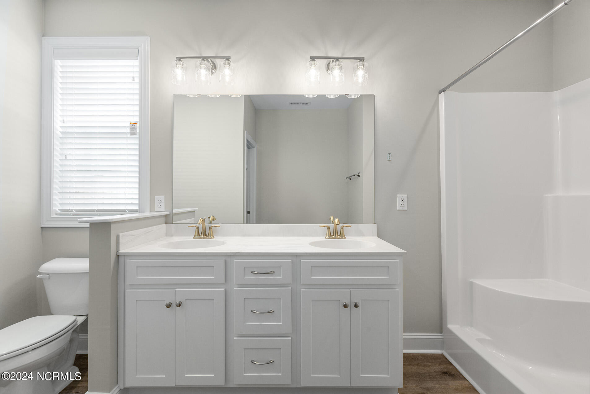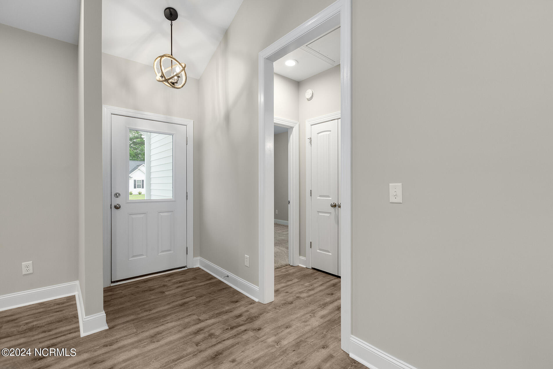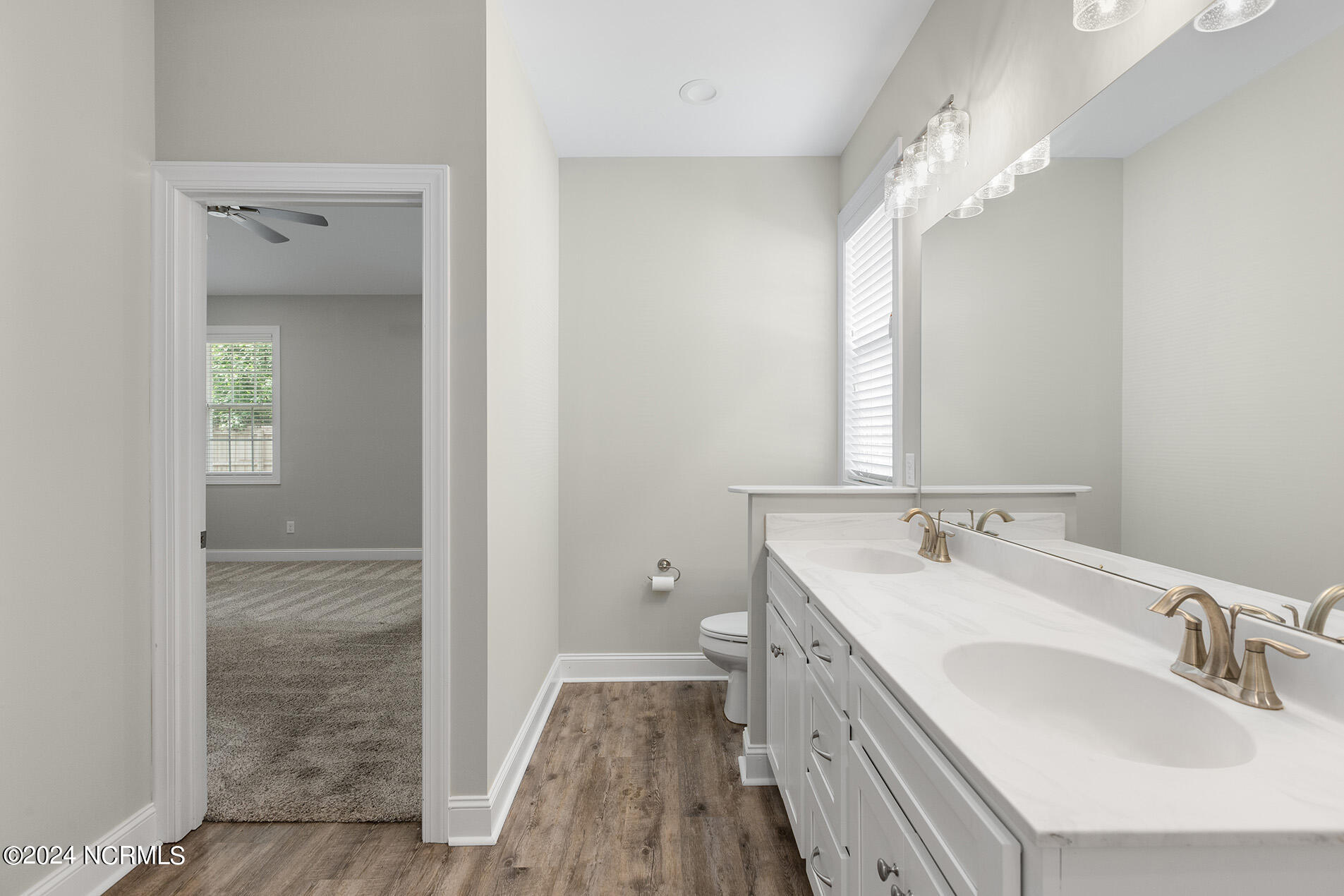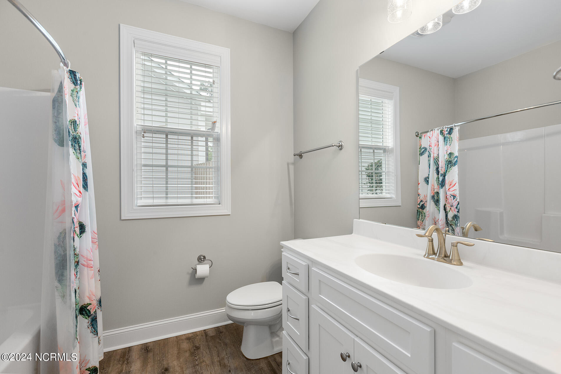 You will love this move-in ready, 3 bedroom and 2 bathroom home in the delightful community of Lily Pond. The open-designed floor plan is enhanced with vaulted ceilings, coastal light fixtures, wide plank flooring, and a neutral color palette throughout the living room and kitchen. The abundance of natural light in the living space complements the stunning white kitchen, which boasts white, slow-close shaker cabinets and quartz counters. Stainless appliances nicely accent these features, and a cheerful breakfast nook is positioned nearby. The highly sought-after split floor plan thoughtfully places the two guest rooms directly off of the entryway with a shared full bathroom in between. Beyond the kitchen, you will find the laundry room and the primary suite; the adjoining ensuite is comprised of wide plank flooring, a white shaker double vanity, brushed nickel hardware, and cultured marble countertops. A spacious bonus room, perfect for guests or a home office, is upstairs. Other features include a two-car garage, fresh paint throughout, a fenced-in yard, and a deck!
