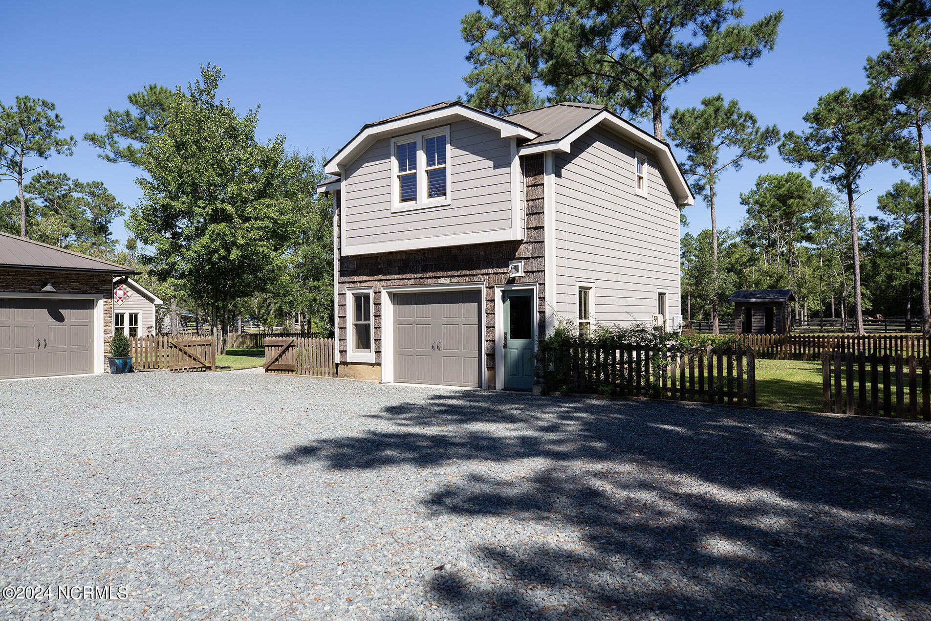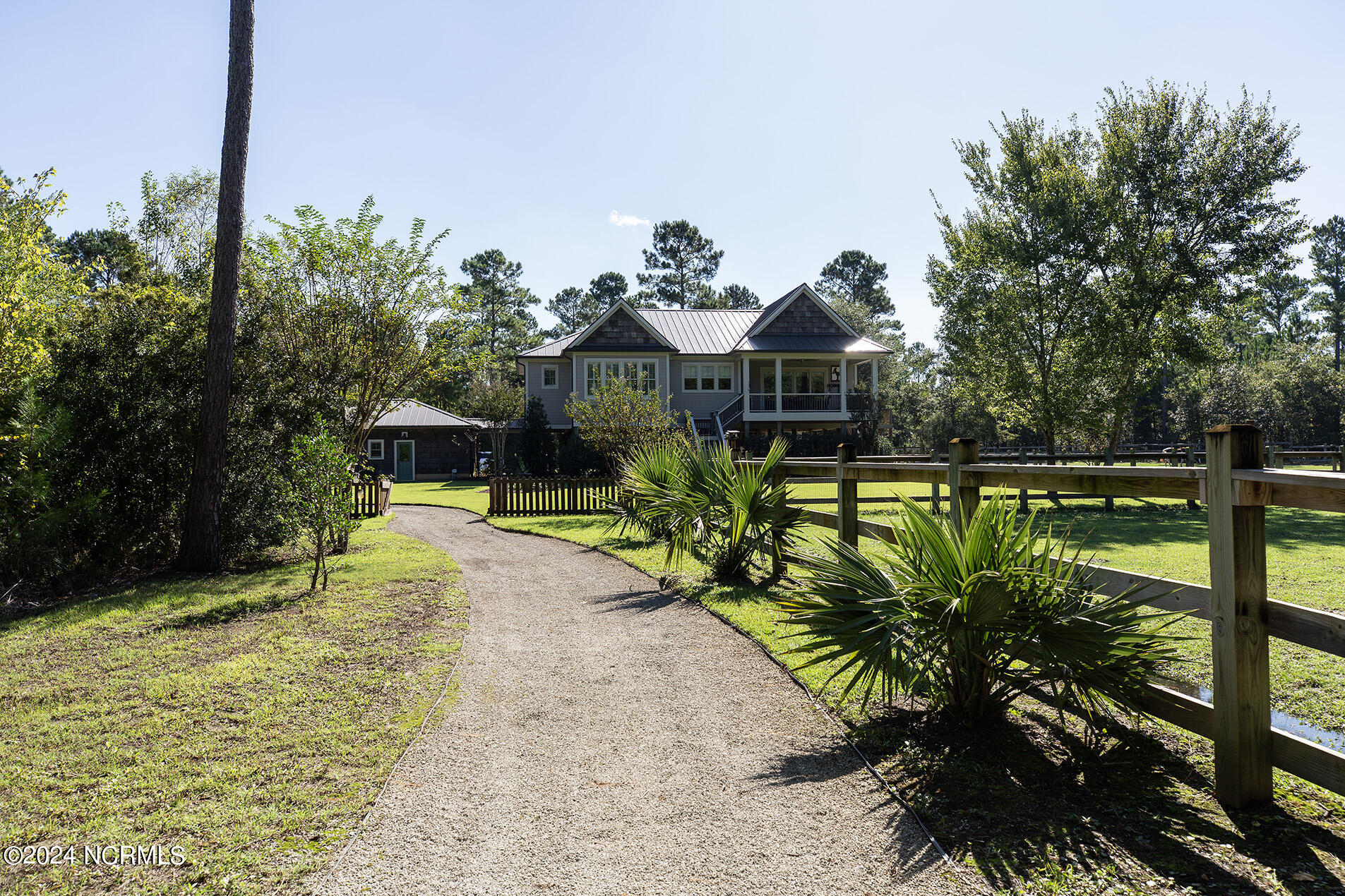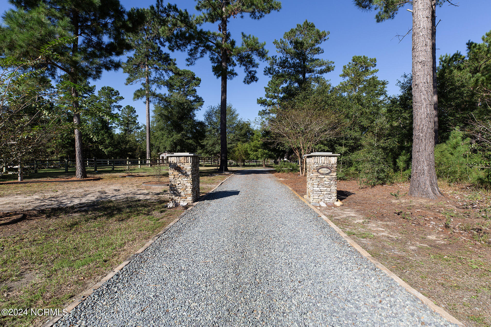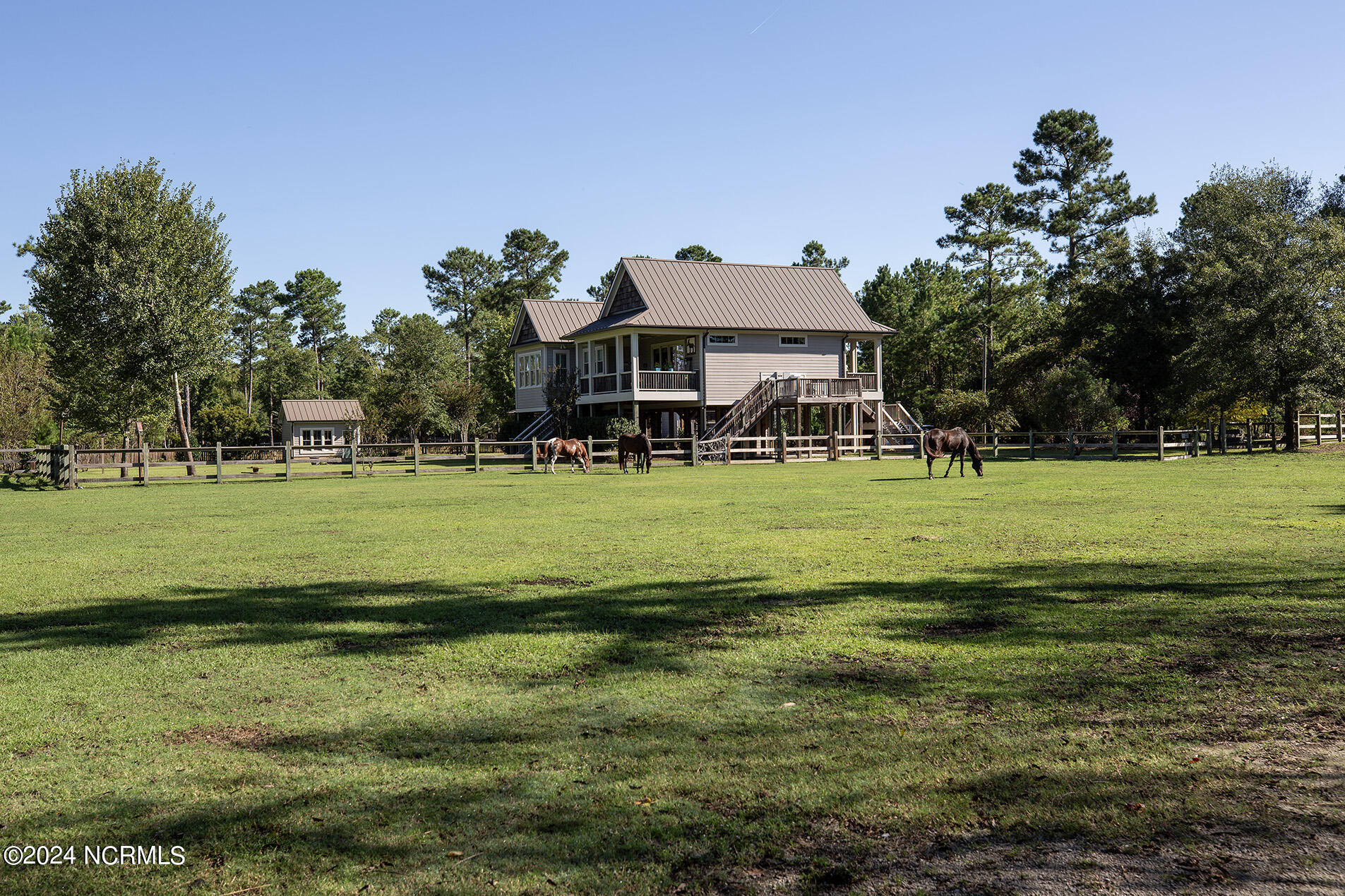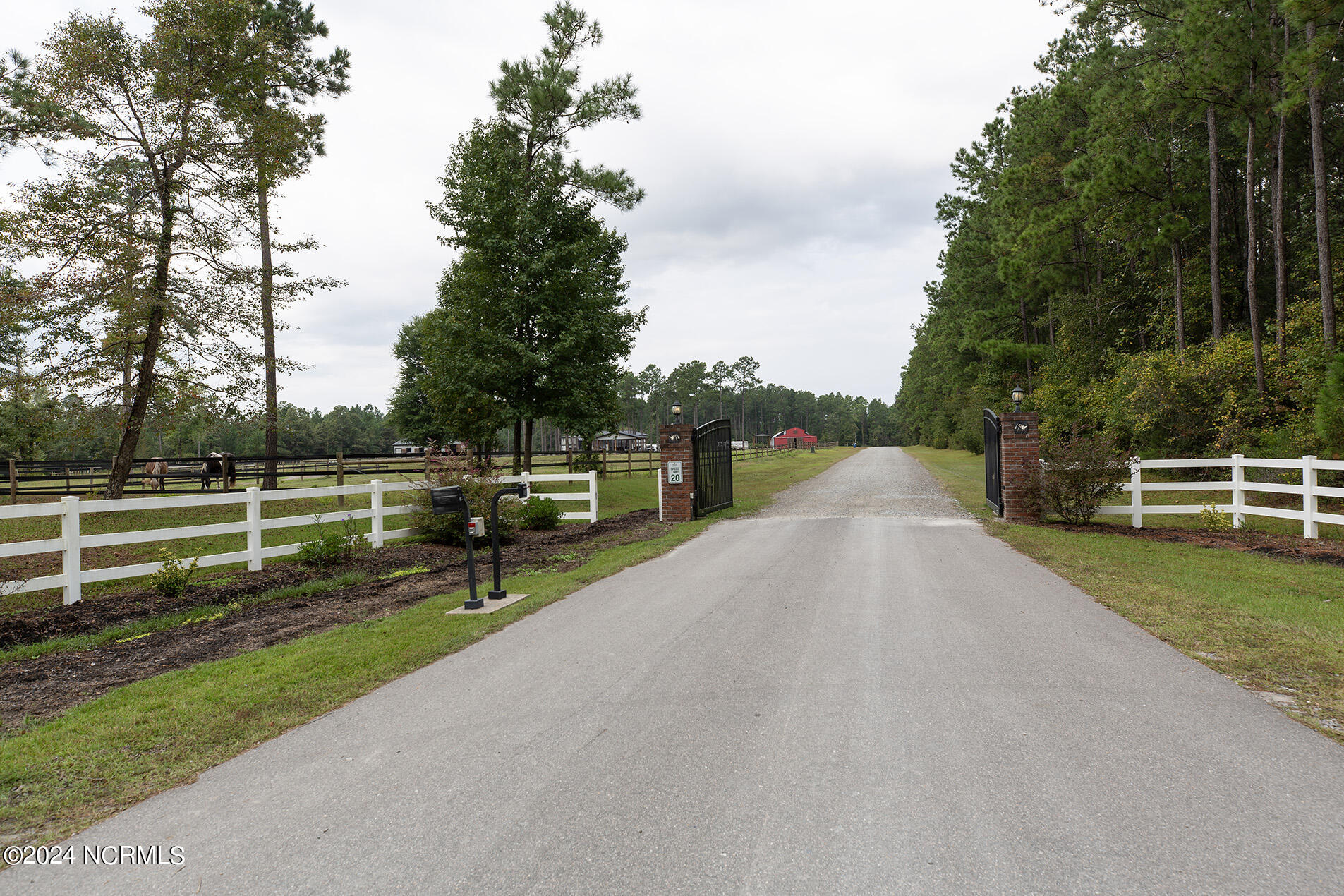 Nestled in the gated neighborhood of Equine Acres, this homestead - complete with a beautiful home, horse farm, and detached carriage house - boasts wonderful attention to detail. The home is privately positioned in the middle of groomed pastures and welcoming paths. It enjoys an open floor plan with meticulous detailing including trim molding, stylish cabinet knobs and pulls, and pendant lighting. Other notable features include a well-designed chef's kitchen, welcoming front and back porches, beautiful hardwood flooring, an elevator, and a three car attached garage. The nearby detached carriage house, also with a garage, offers a complete efficiency apartment. The barn offers a four stall center aisle construction with front and rear access from the stalls. There is a spacious tack room with feed storage as well as a washroom for essentials; a separate barn for hay storage and farm equipment is also included. The nearby pasture offers a covered hay feeder and pastures and lawns are partially irrigated with a separate well. Perfect for the avid gardener, a pump house for storage and supplies is also located nearby. The grounds are manicured and landscaped for ideal enjoyment - numerous flowering plants, bluebird houses, and a gravel walkway to the private barn are among the property's noteworthy features. Additionally, the neighborhood offers a private waterfront day dock and gathering place with a gazebo for community functions; there are also walking and riding trails throughout the wooded areas of Equine Acres.