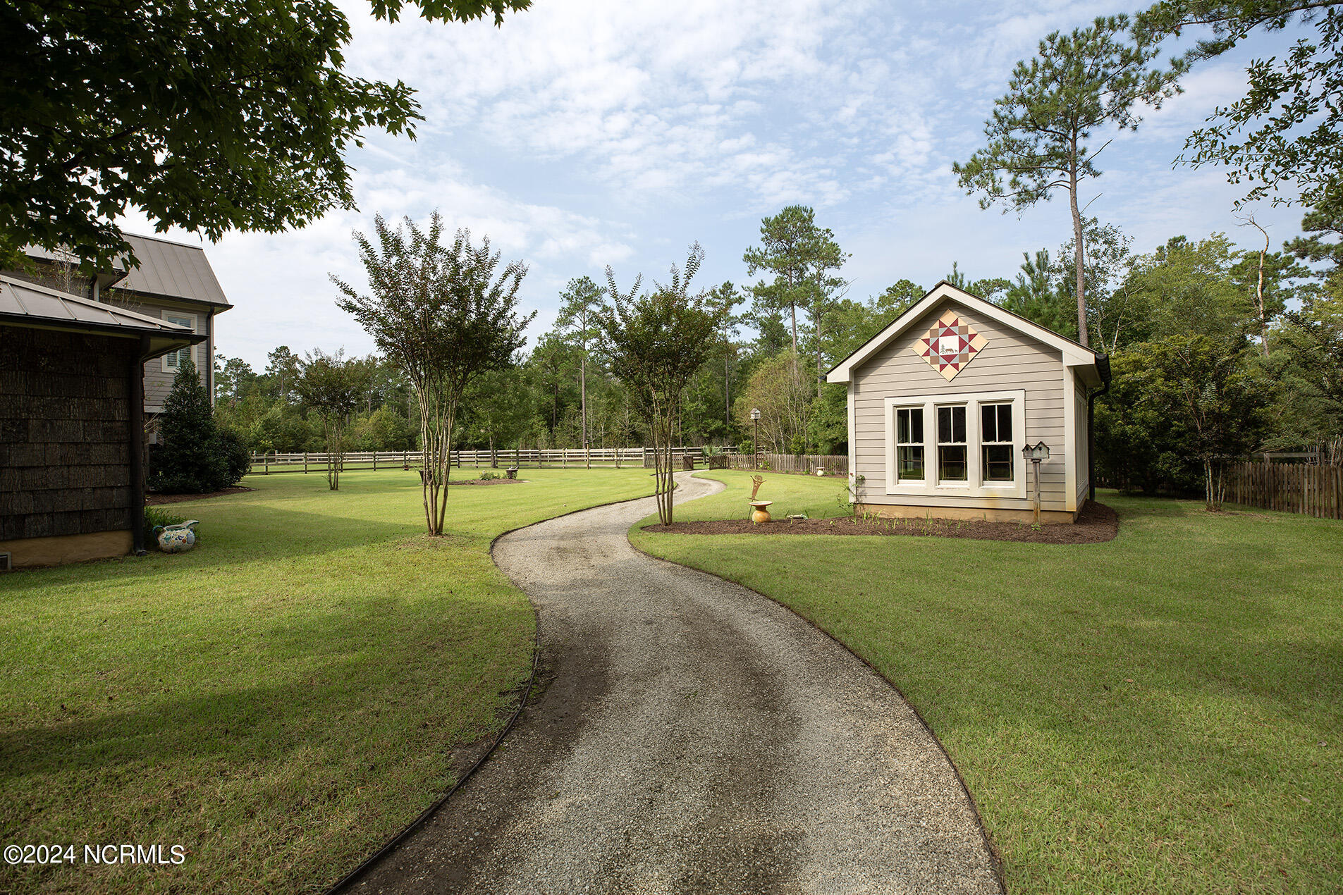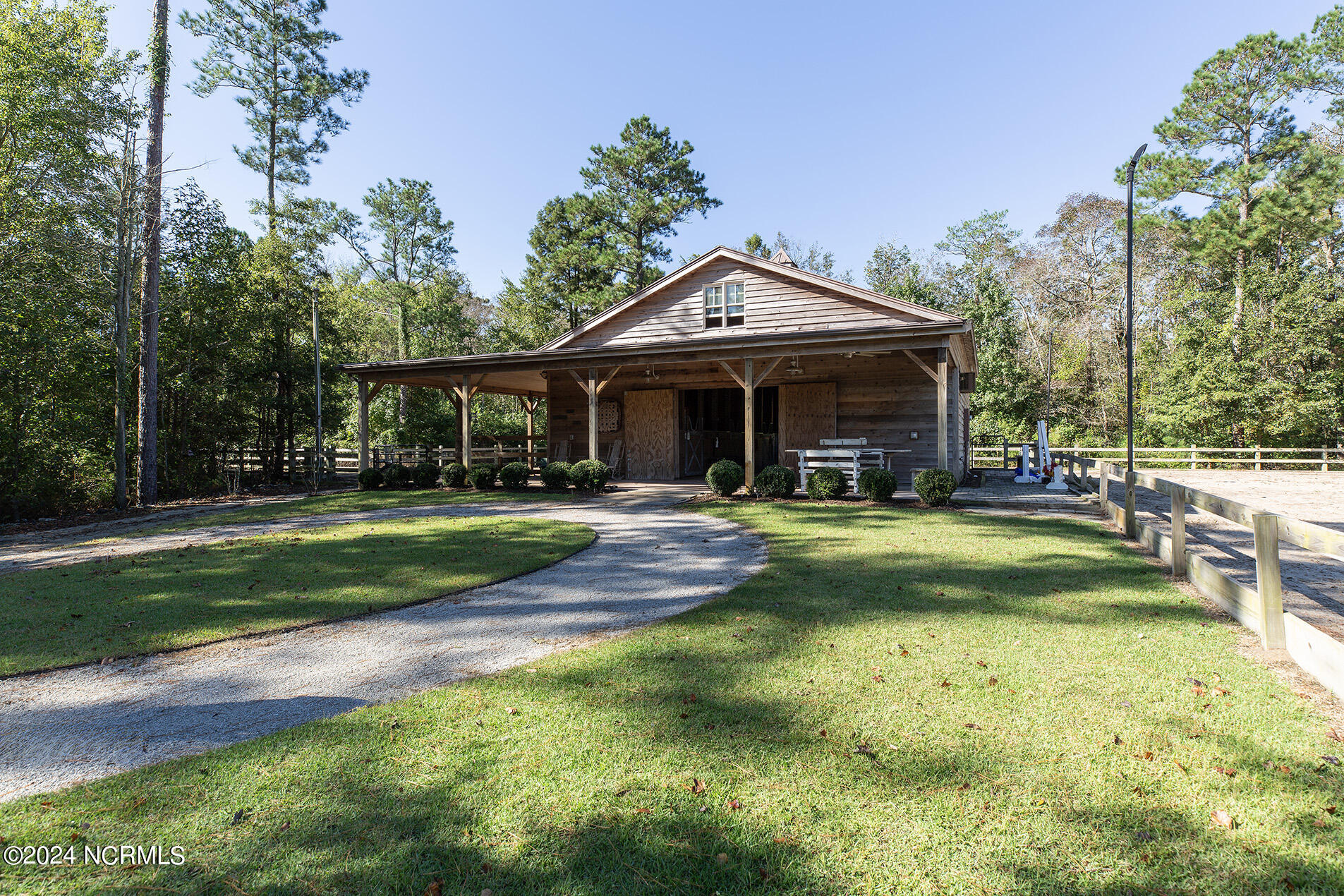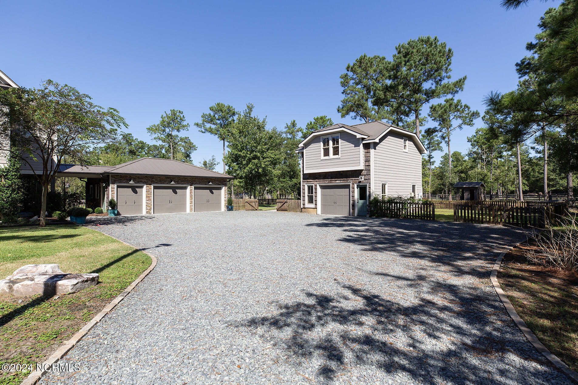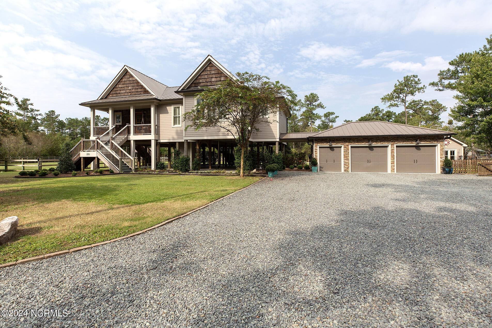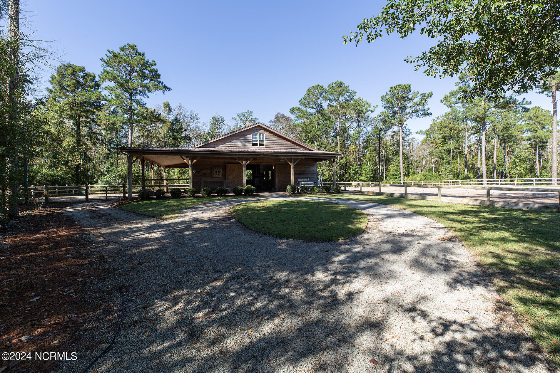 Nestled in the gated neighborhood of Equine Acres, this homestead - complete with a beautiful home, horse farm, and detached carriage house - boasts wonderful attention to detail. The home is privately positioned in the middle of groomed pastures and welcoming paths. It enjoys an open floor plan with meticulous detailing including trim molding, stylish cabinet knobs and pulls, and pendant lighting. Other notable features include a well-designed chef's kitchen, welcoming front and back porches, beautiful hardwood flooring, an elevator, and a three car attached garage. The nearby detached carriage house, also with a garage, offers a complete efficiency apartment. The barn offers a four stall center aisle construction with front and rear access from the stalls. There is a spacious tack room with feed storage as well as a washroom for essentials; a separate barn for hay storage and farm equipment is also included. The nearby pasture offers a covered hay feeder and pastures and lawns are partially irrigated with a separate well. Perfect for the avid gardener, a pump house for storage and supplies is also located nearby. The grounds are manicured and landscaped for ideal enjoyment - numerous flowering plants, bluebird houses, and a gravel walkway to the private barn are among the property's noteworthy features. Additionally, the neighborhood offers a private waterfront day dock and gathering place with a gazebo for community functions; there are also walking and riding trails throughout the wooded areas of Equine Acres.