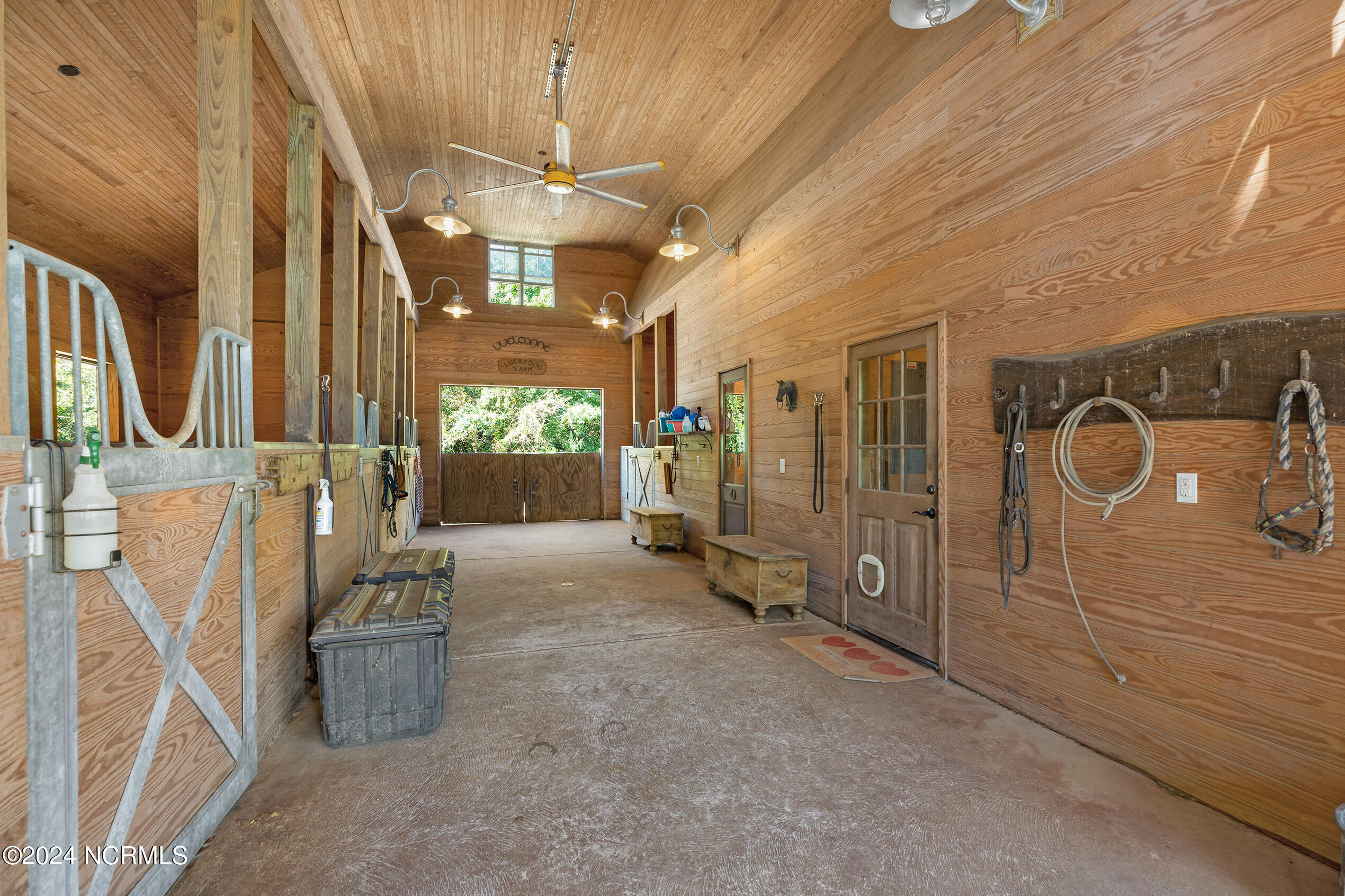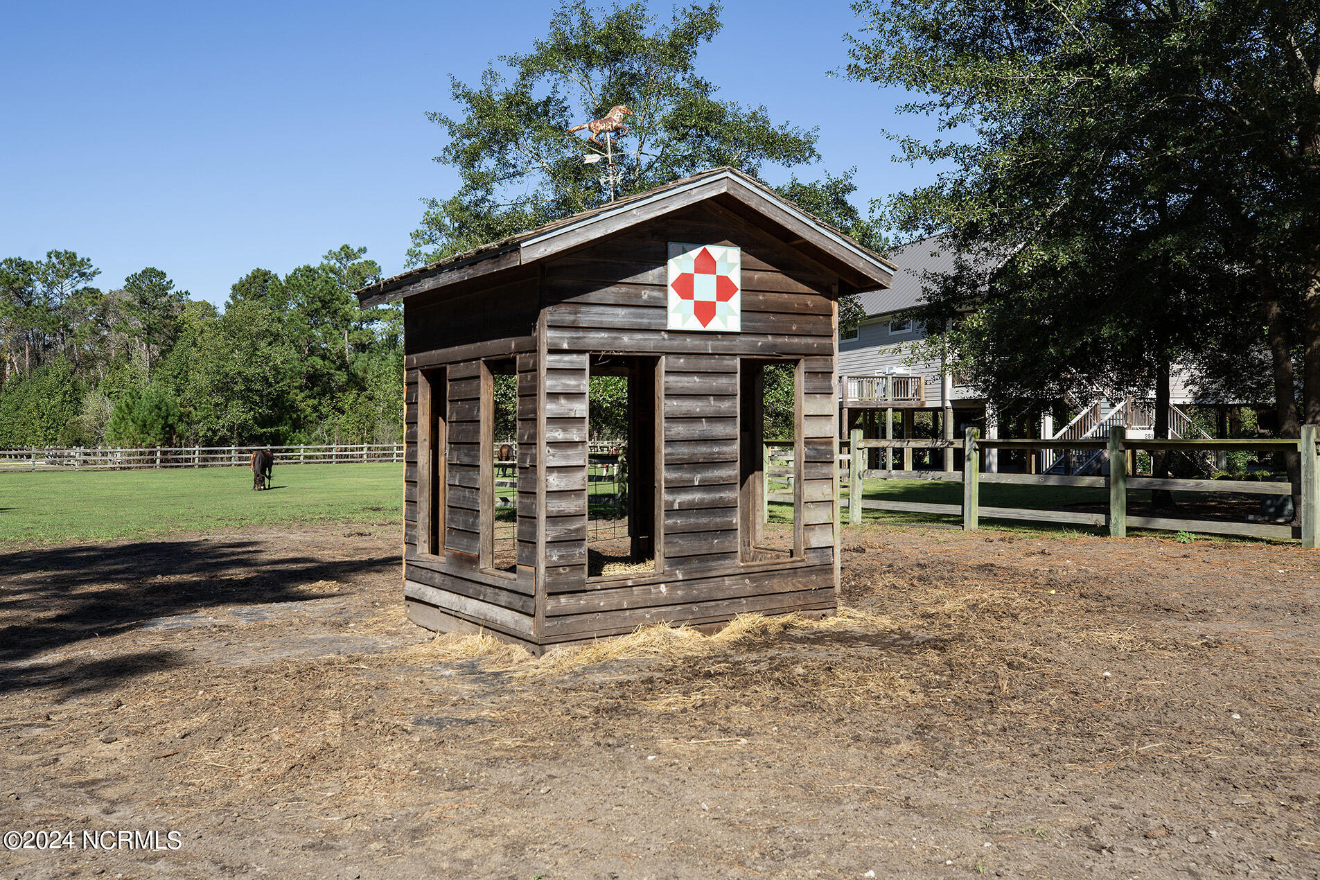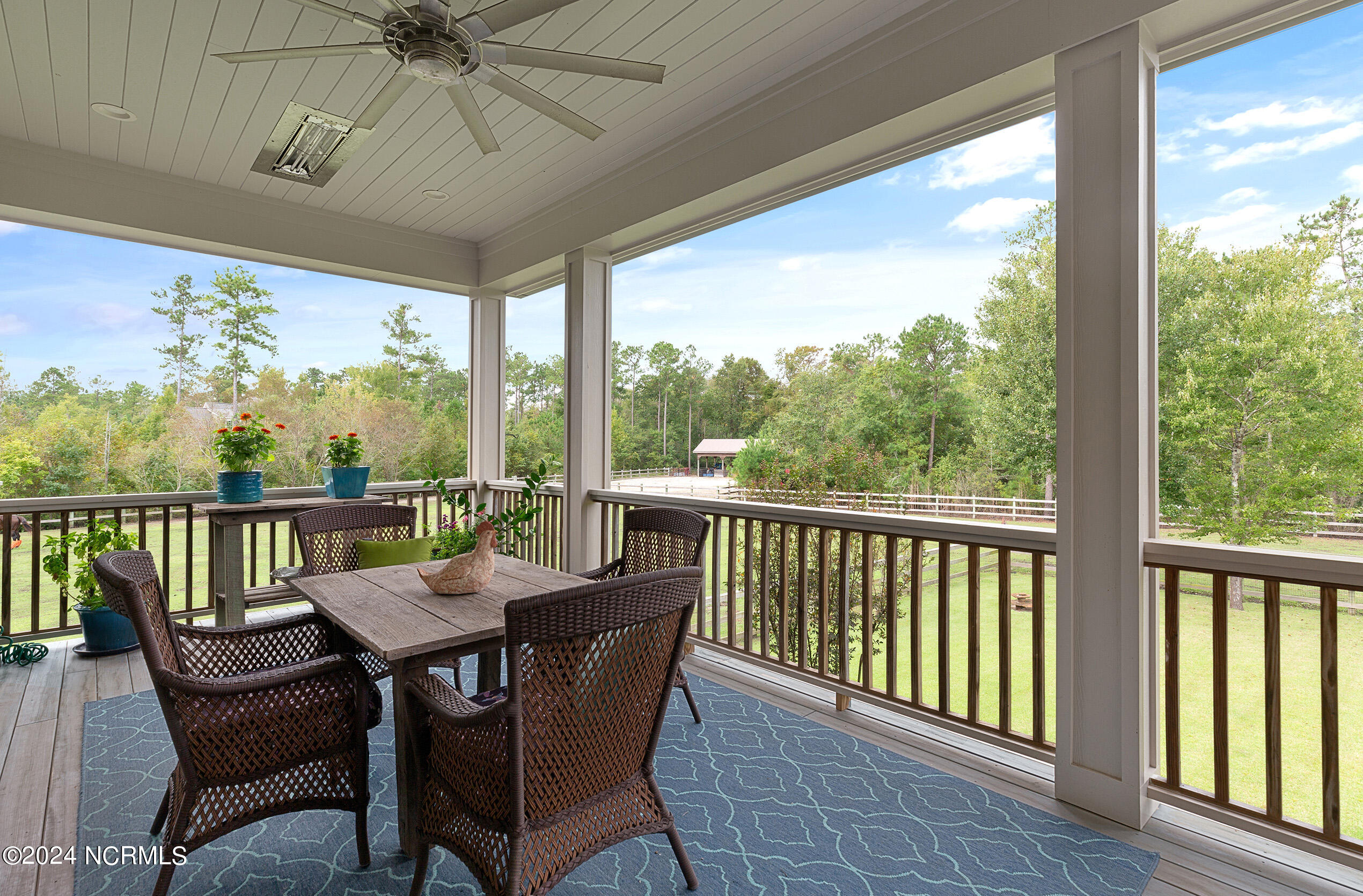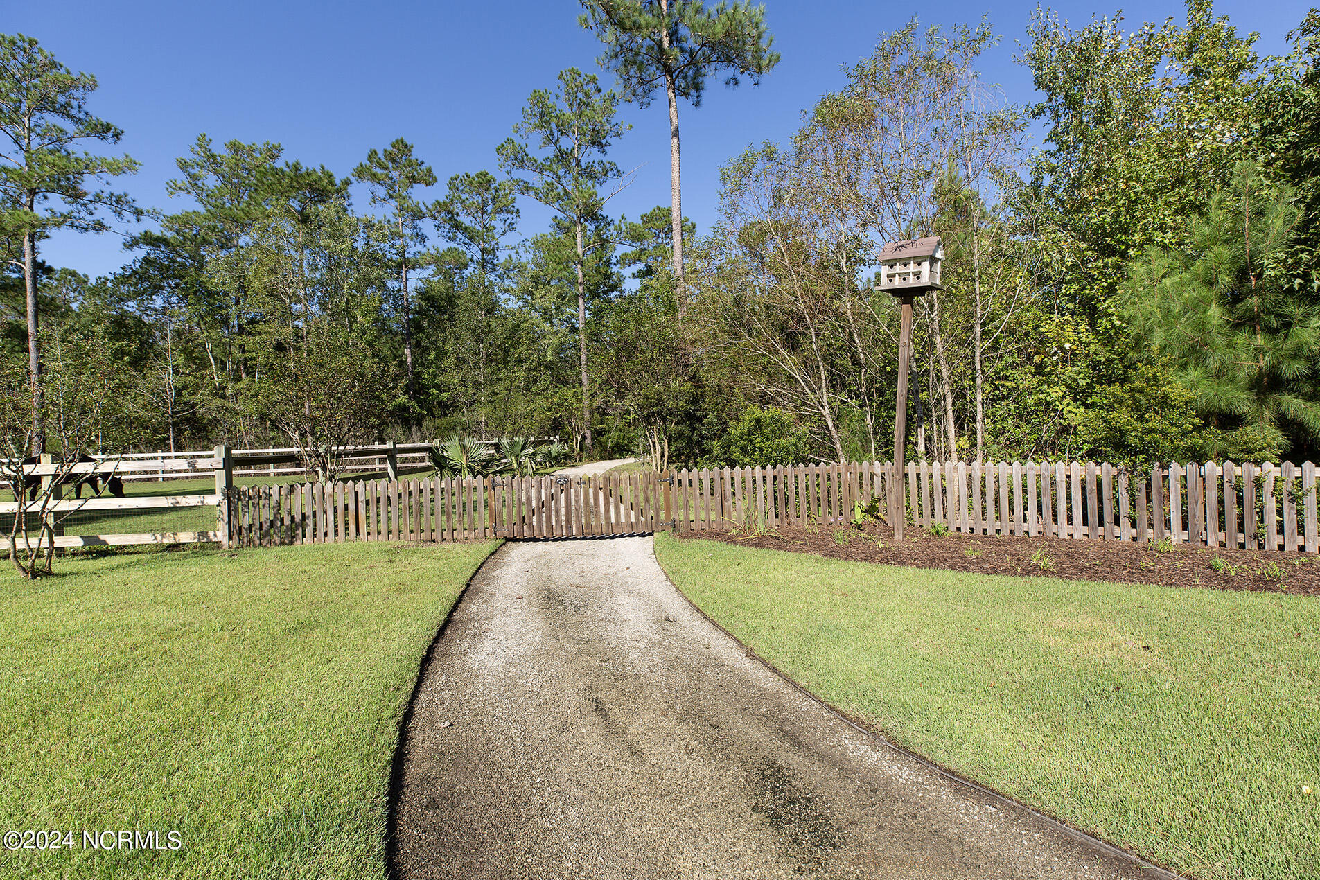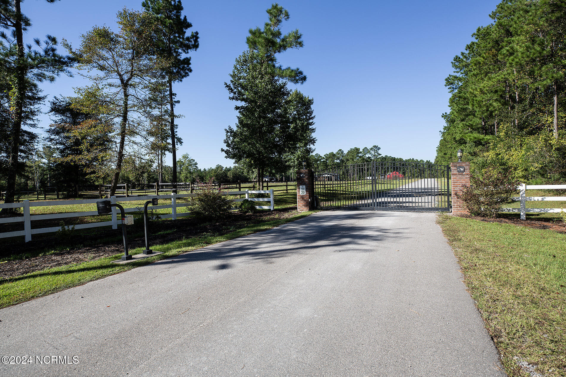 Nestled in the gated neighborhood of Equine Acres, this homestead - complete with a beautiful home, horse farm, and detached carriage house - boasts wonderful attention to detail. The home is privately positioned in the middle of groomed pastures and welcoming paths. It enjoys an open floor plan with meticulous detailing including trim molding, stylish cabinet knobs and pulls, and pendant lighting. Other notable features include a well-designed chef's kitchen, welcoming front and back porches, beautiful hardwood flooring, an elevator, and a three car attached garage. The nearby detached carriage house, also with a garage, offers a complete efficiency apartment. The barn offers a four stall center aisle construction with front and rear access from the stalls. There is a spacious tack room with feed storage as well as a washroom for essentials; a separate barn for hay storage and farm equipment is also included. The nearby pasture offers a covered hay feeder and pastures and lawns are partially irrigated with a separate well. Perfect for the avid gardener, a pump house for storage and supplies is also located nearby. The grounds are manicured and landscaped for ideal enjoyment - numerous flowering plants, bluebird houses, and a gravel walkway to the private barn are among the property's noteworthy features. Additionally, the neighborhood offers a private waterfront day dock and gathering place with a gazebo for community functions; there are also walking and riding trails throughout the wooded areas of Equine Acres.