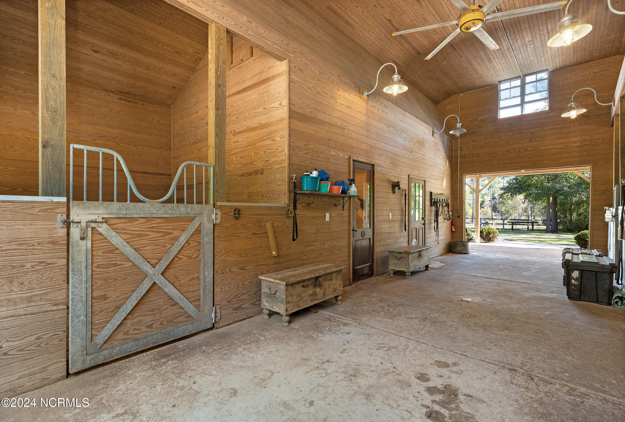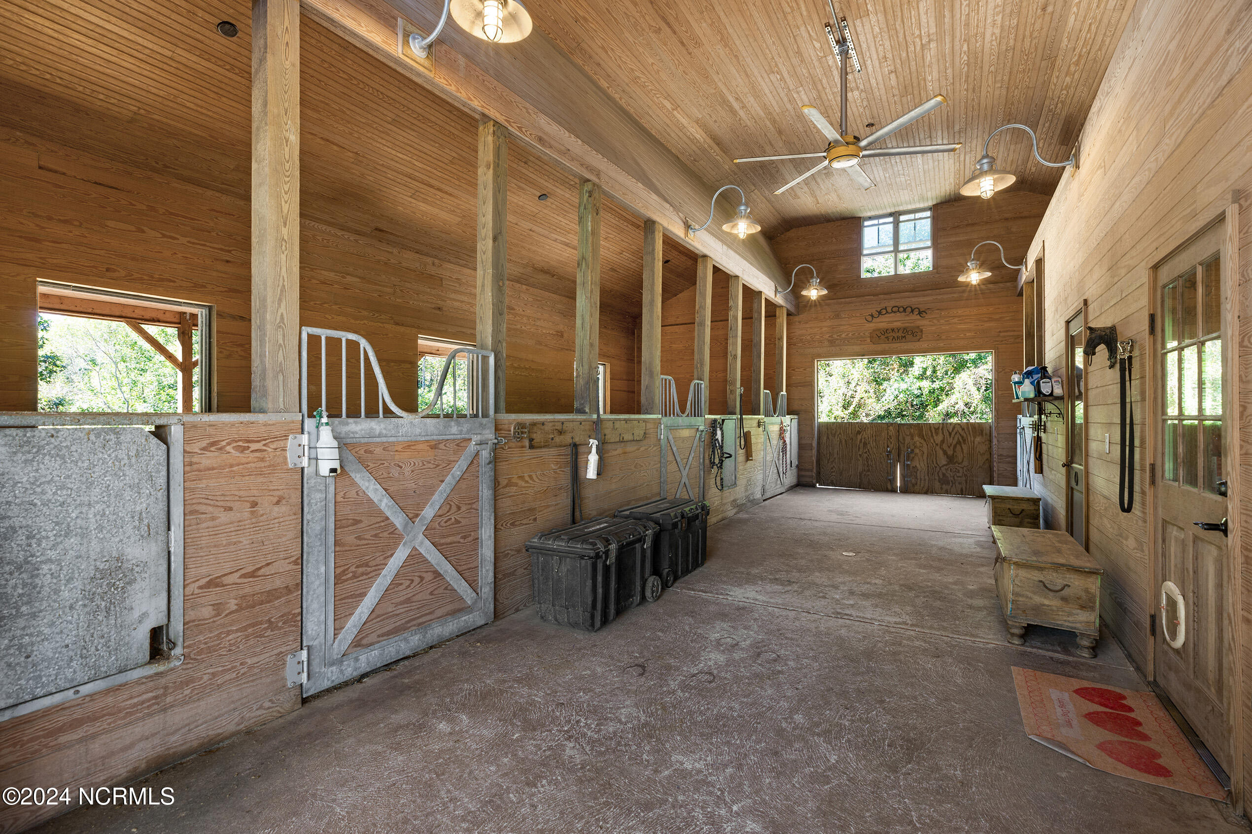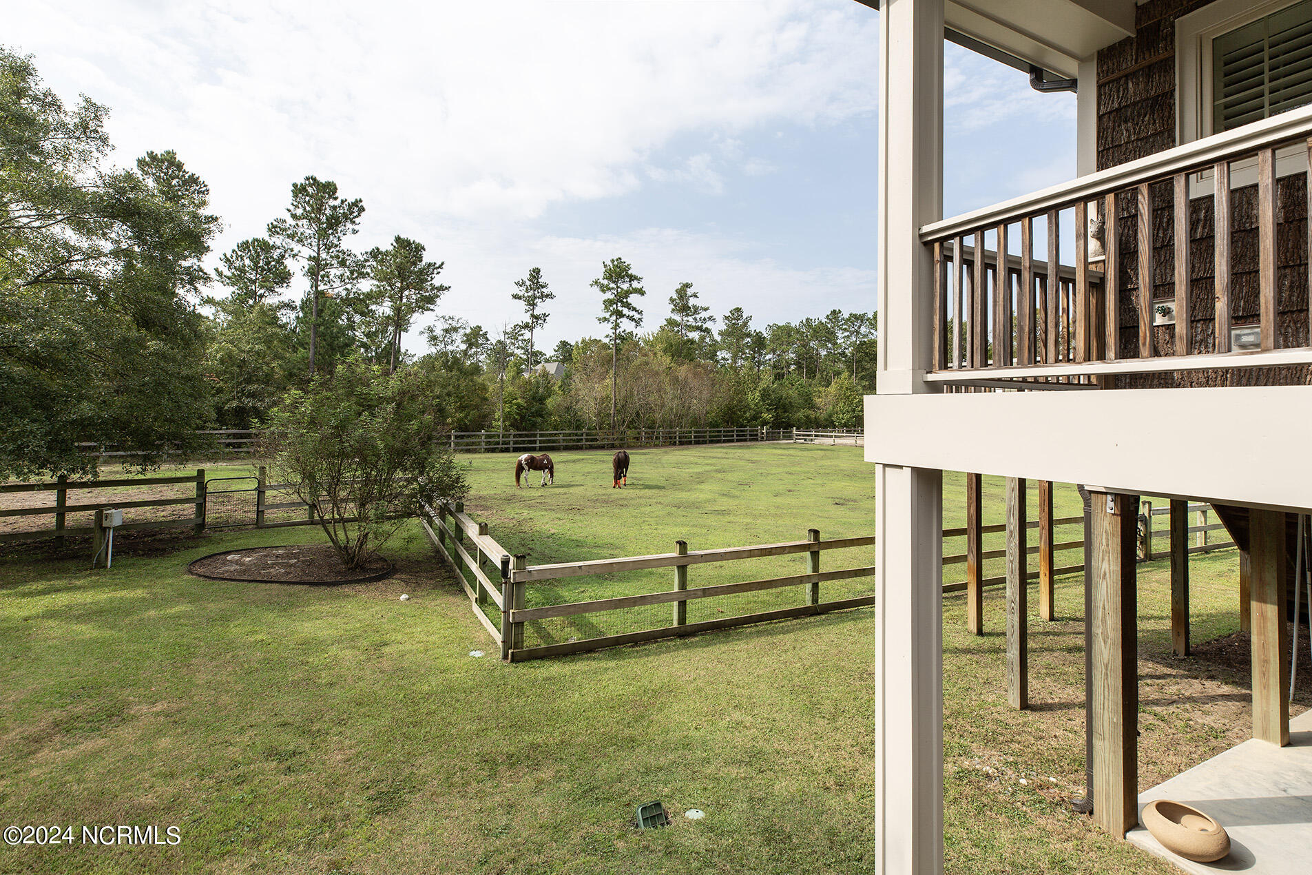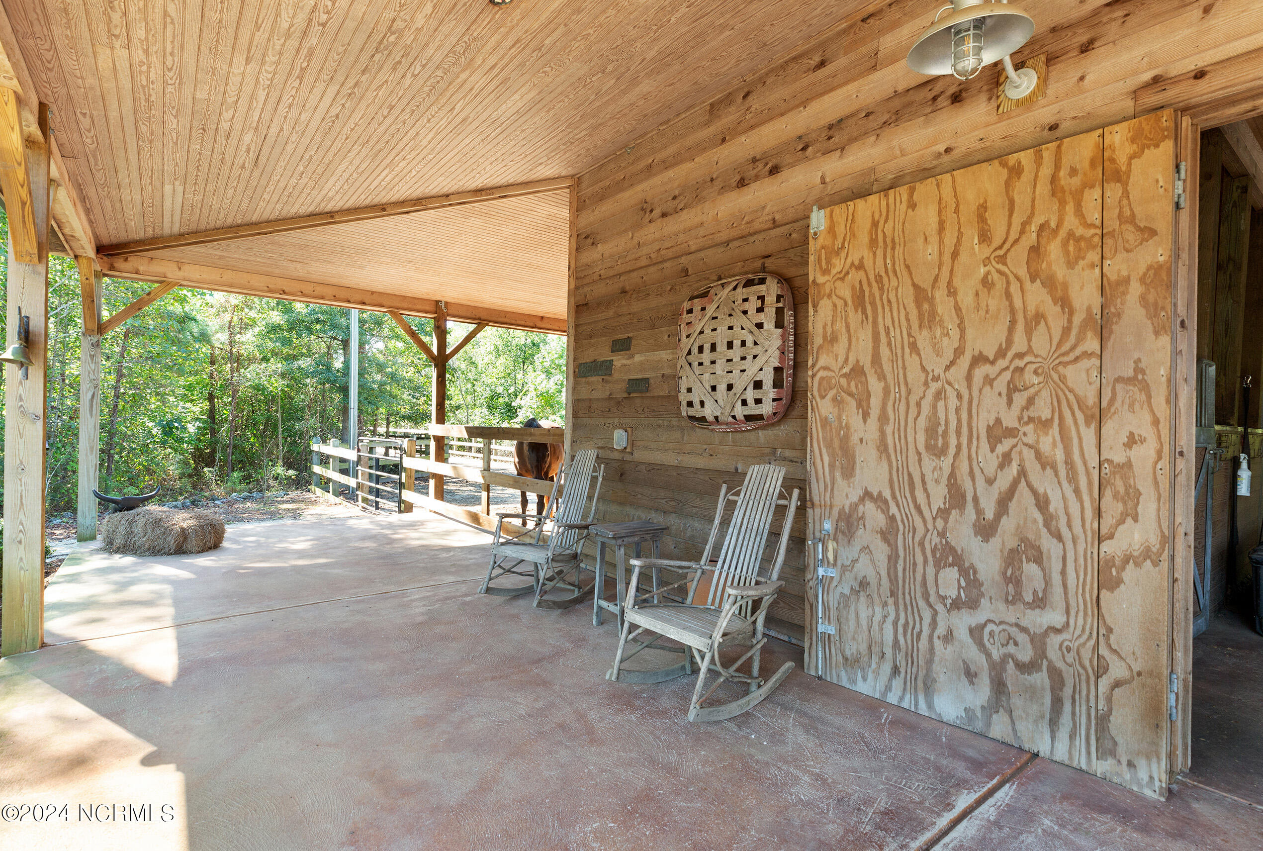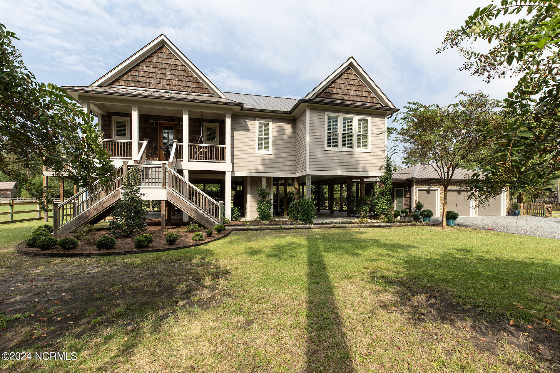 Nestled in the gated neighborhood of Equine Acres, this homestead - complete with a beautiful home, horse farm, and detached carriage house - boasts wonderful attention to detail. The home is privately positioned in the middle of groomed pastures and welcoming paths. It enjoys an open floor plan with meticulous detailing including trim molding, stylish cabinet knobs and pulls, and pendant lighting. Other notable features include a well-designed chef's kitchen, welcoming front and back porches, beautiful hardwood flooring, an elevator, and a three car attached garage. The nearby detached carriage house, also with a garage, offers a complete efficiency apartment. The barn offers a four stall center aisle construction with front and rear access from the stalls. There is a spacious tack room with feed storage as well as a washroom for essentials; a separate barn for hay storage and farm equipment is also included. The nearby pasture offers a covered hay feeder and pastures and lawns are partially irrigated with a separate well. Perfect for the avid gardener, a pump house for storage and supplies is also located nearby. The grounds are manicured and landscaped for ideal enjoyment - numerous flowering plants, bluebird houses, and a gravel walkway to the private barn are among the property's noteworthy features. Additionally, the neighborhood offers a private waterfront day dock and gathering place with a gazebo for community functions; there are also walking and riding trails throughout the wooded areas of Equine Acres.