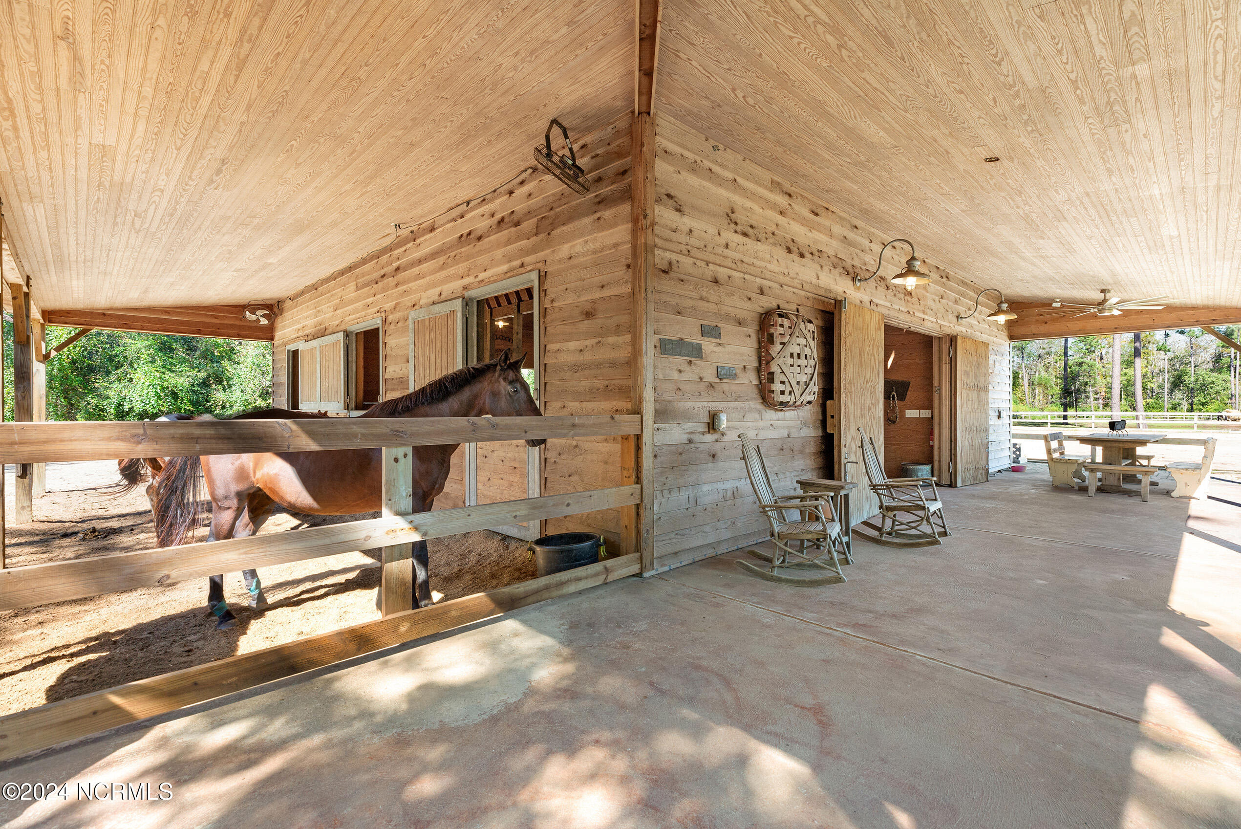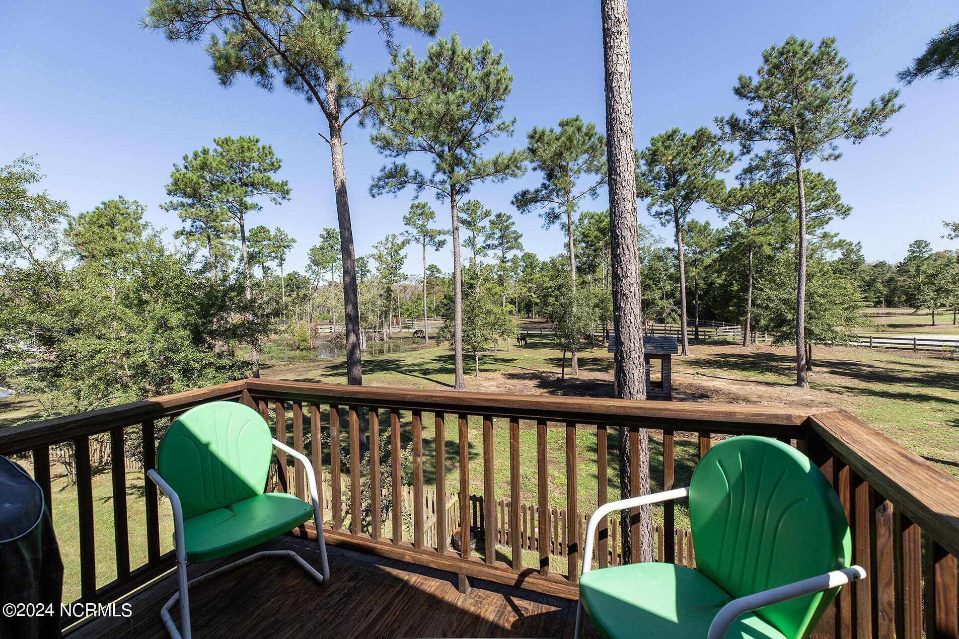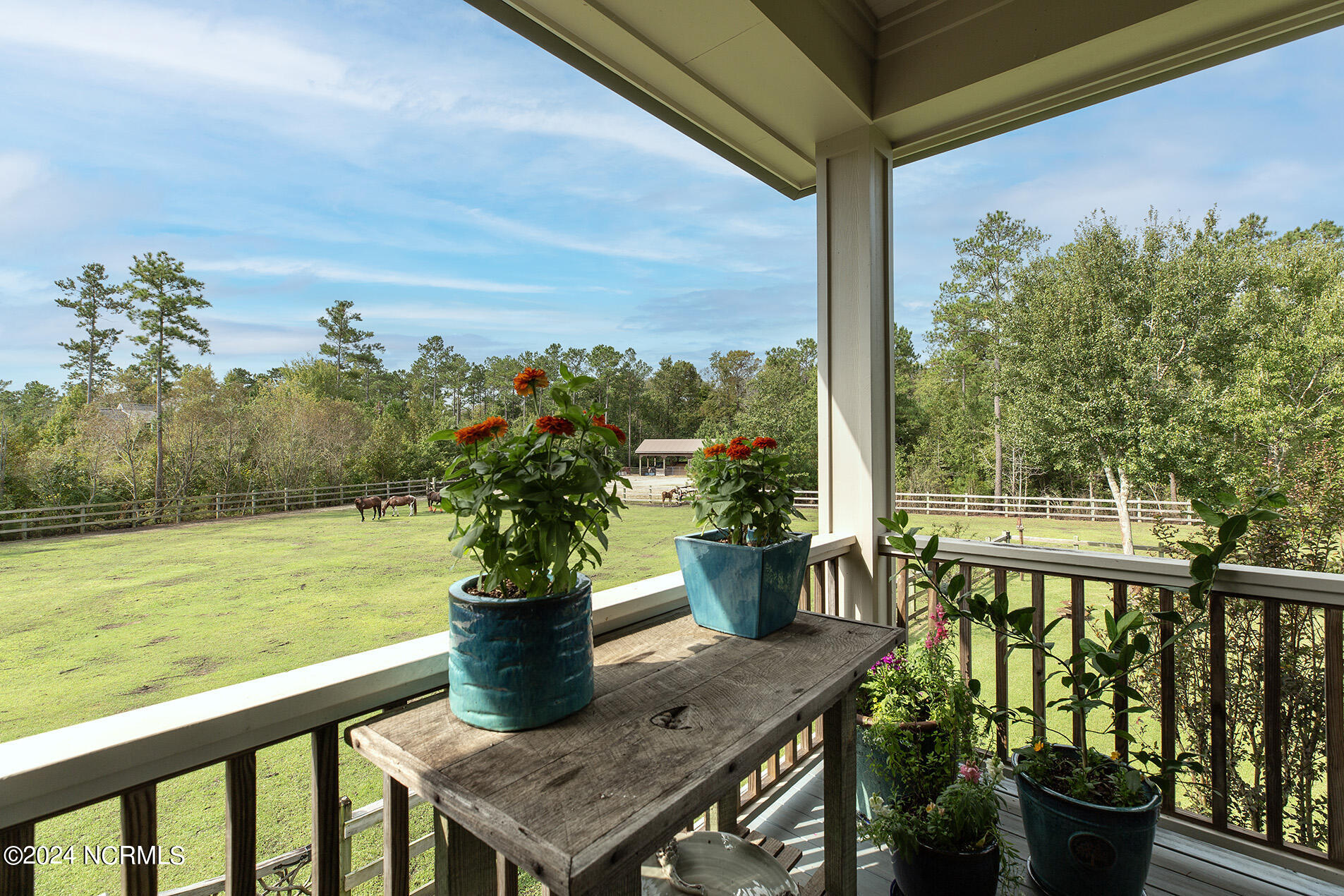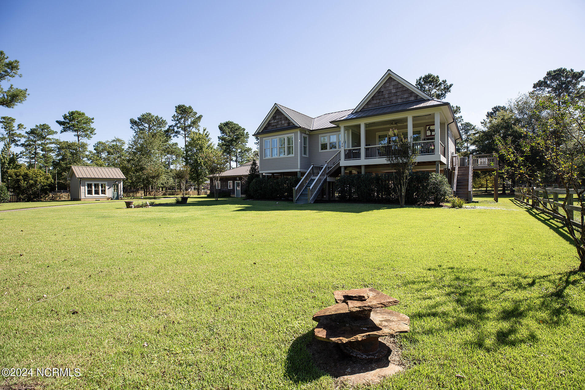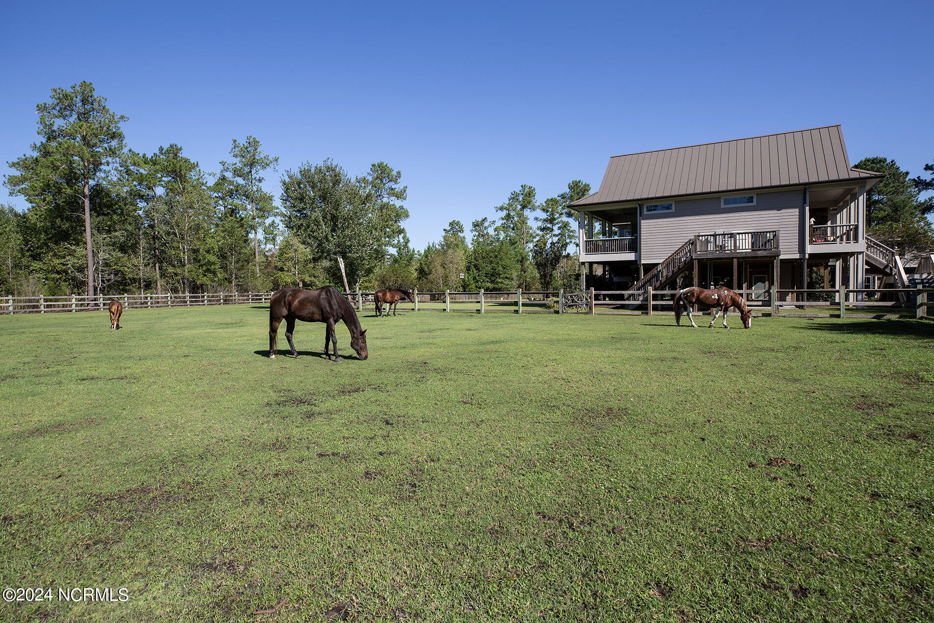 Nestled in the gated neighborhood of Equine Acres, this homestead - complete with a beautiful home, horse farm, and detached carriage house - boasts wonderful attention to detail. The home is privately positioned in the middle of groomed pastures and welcoming paths. It enjoys an open floor plan with meticulous detailing including trim molding, stylish cabinet knobs and pulls, and pendant lighting. Other notable features include a well-designed chef's kitchen, welcoming front and back porches, beautiful hardwood flooring, an elevator, and a three car attached garage. The nearby detached carriage house, also with a garage, offers a complete efficiency apartment. The barn offers a four stall center aisle construction with front and rear access from the stalls. There is a spacious tack room with feed storage as well as a washroom for essentials; a separate barn for hay storage and farm equipment is also included. The nearby pasture offers a covered hay feeder and pastures and lawns are partially irrigated with a separate well. Perfect for the avid gardener, a pump house for storage and supplies is also located nearby. The grounds are manicured and landscaped for ideal enjoyment - numerous flowering plants, bluebird houses, and a gravel walkway to the private barn are among the property's noteworthy features. Additionally, the neighborhood offers a private waterfront day dock and gathering place with a gazebo for community functions; there are also walking and riding trails throughout the wooded areas of Equine Acres.