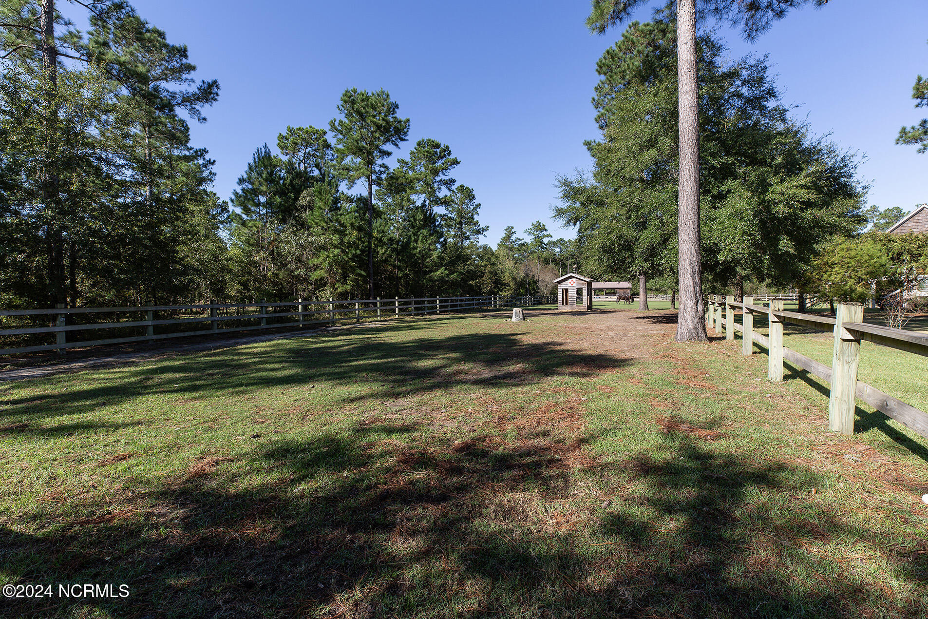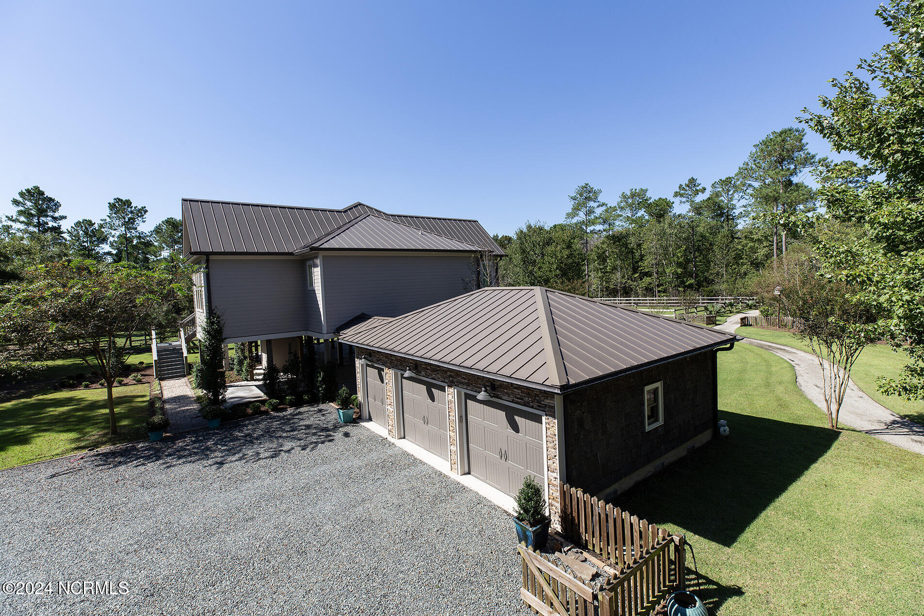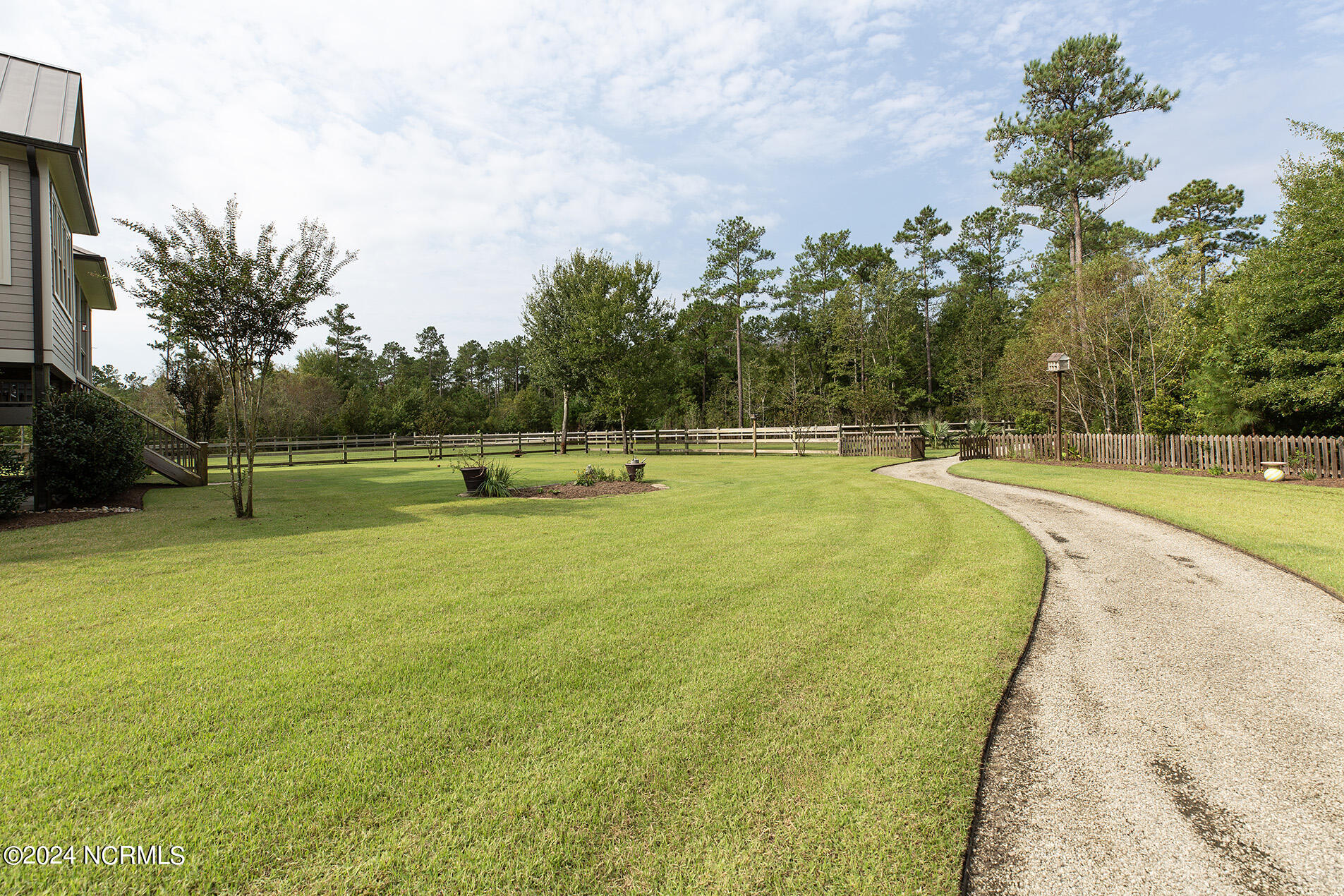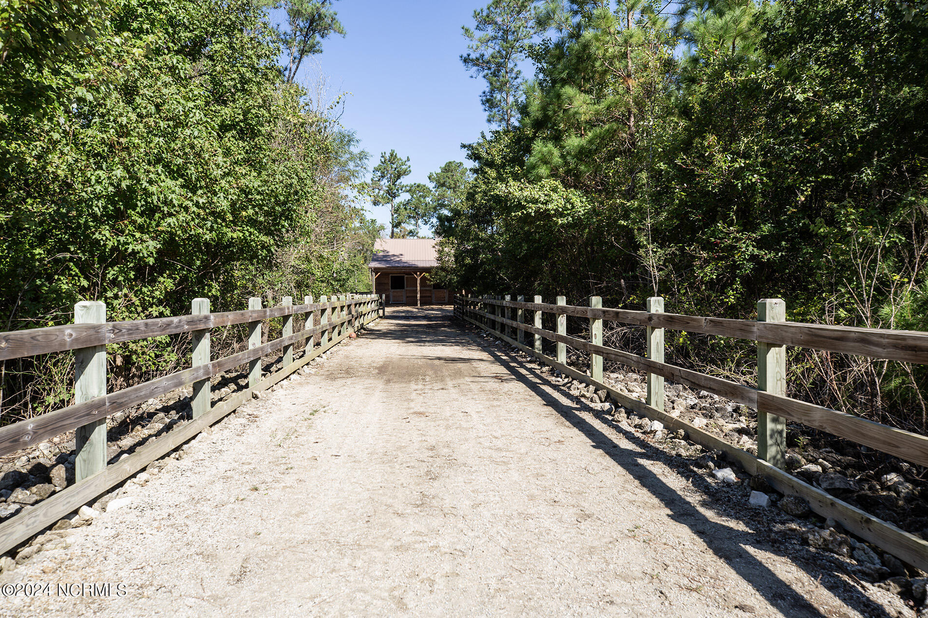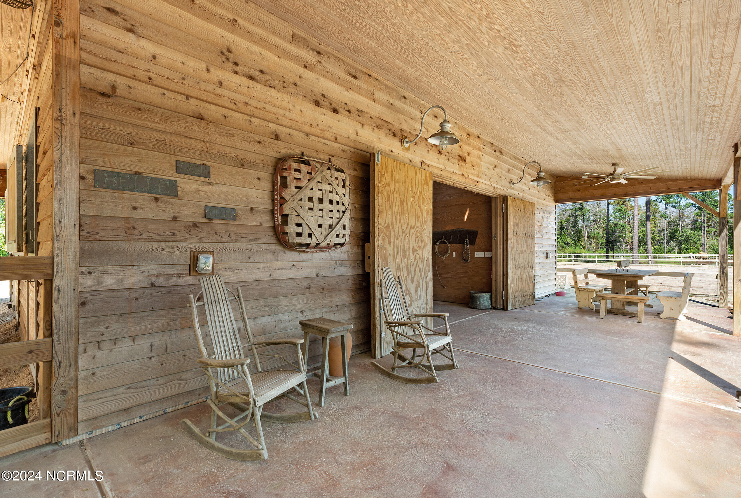 Nestled in the gated neighborhood of Equine Acres, this homestead - complete with a beautiful home, horse farm, and detached carriage house - boasts wonderful attention to detail. The home is privately positioned in the middle of groomed pastures and welcoming paths. It enjoys an open floor plan with meticulous detailing including trim molding, stylish cabinet knobs and pulls, and pendant lighting. Other notable features include a well-designed chef's kitchen, welcoming front and back porches, beautiful hardwood flooring, an elevator, and a three car attached garage. The nearby detached carriage house, also with a garage, offers a complete efficiency apartment. The barn offers a four stall center aisle construction with front and rear access from the stalls. There is a spacious tack room with feed storage as well as a washroom for essentials; a separate barn for hay storage and farm equipment is also included. The nearby pasture offers a covered hay feeder and pastures and lawns are partially irrigated with a separate well. Perfect for the avid gardener, a pump house for storage and supplies is also located nearby. The grounds are manicured and landscaped for ideal enjoyment - numerous flowering plants, bluebird houses, and a gravel walkway to the private barn are among the property's noteworthy features. Additionally, the neighborhood offers a private waterfront day dock and gathering place with a gazebo for community functions; there are also walking and riding trails throughout the wooded areas of Equine Acres.