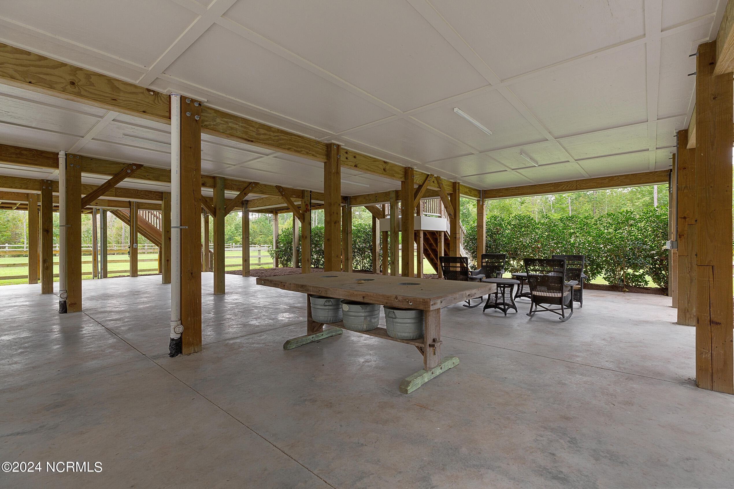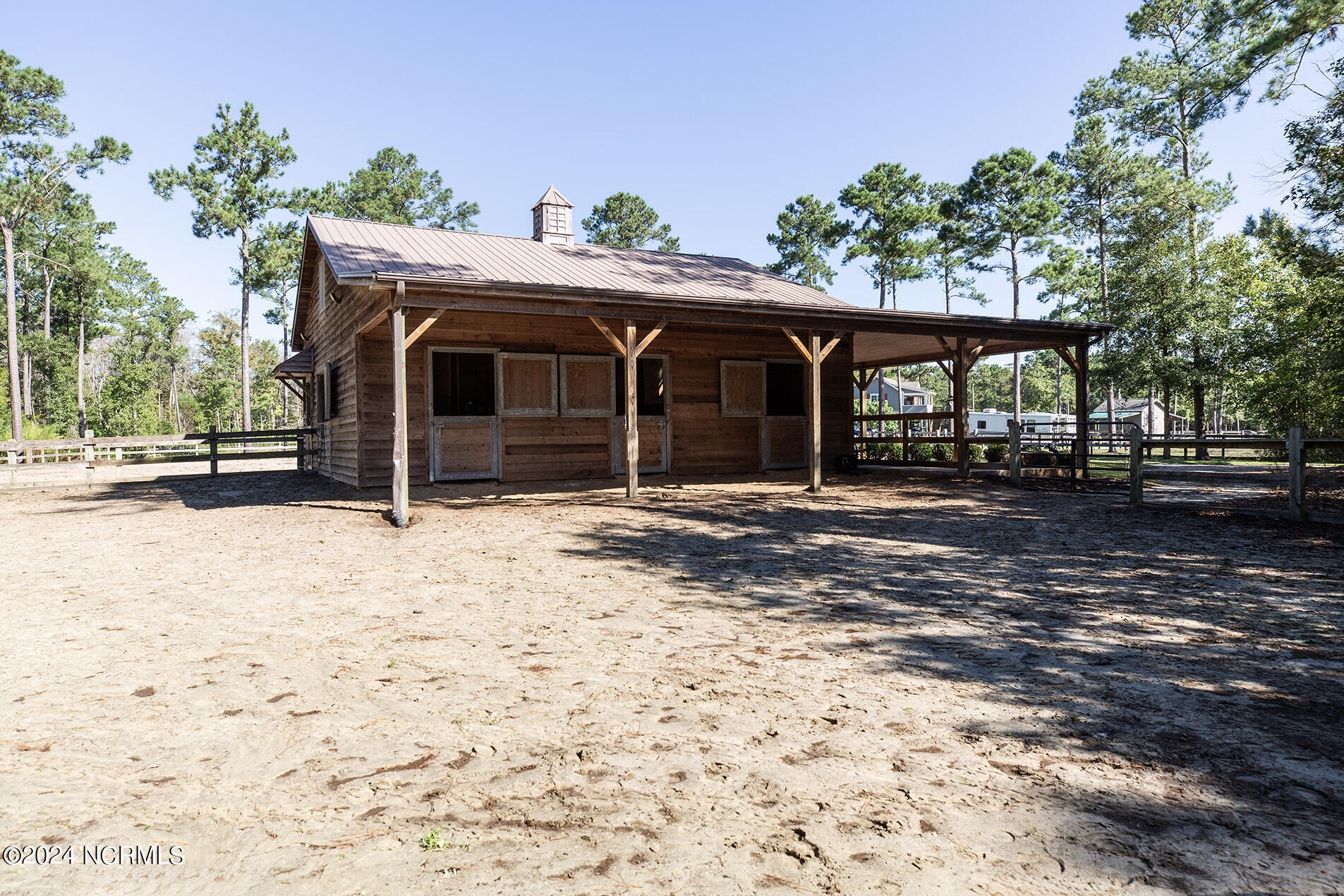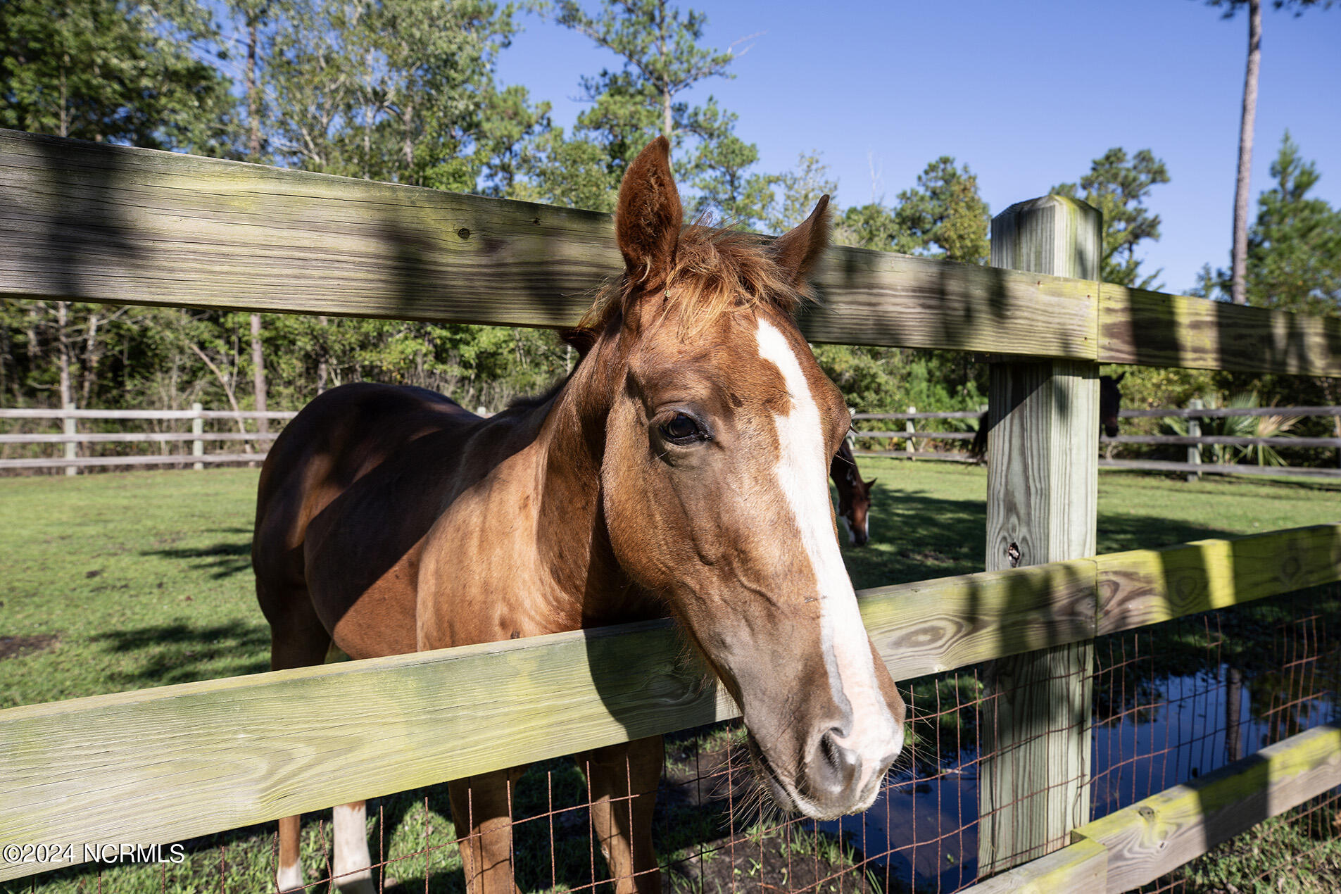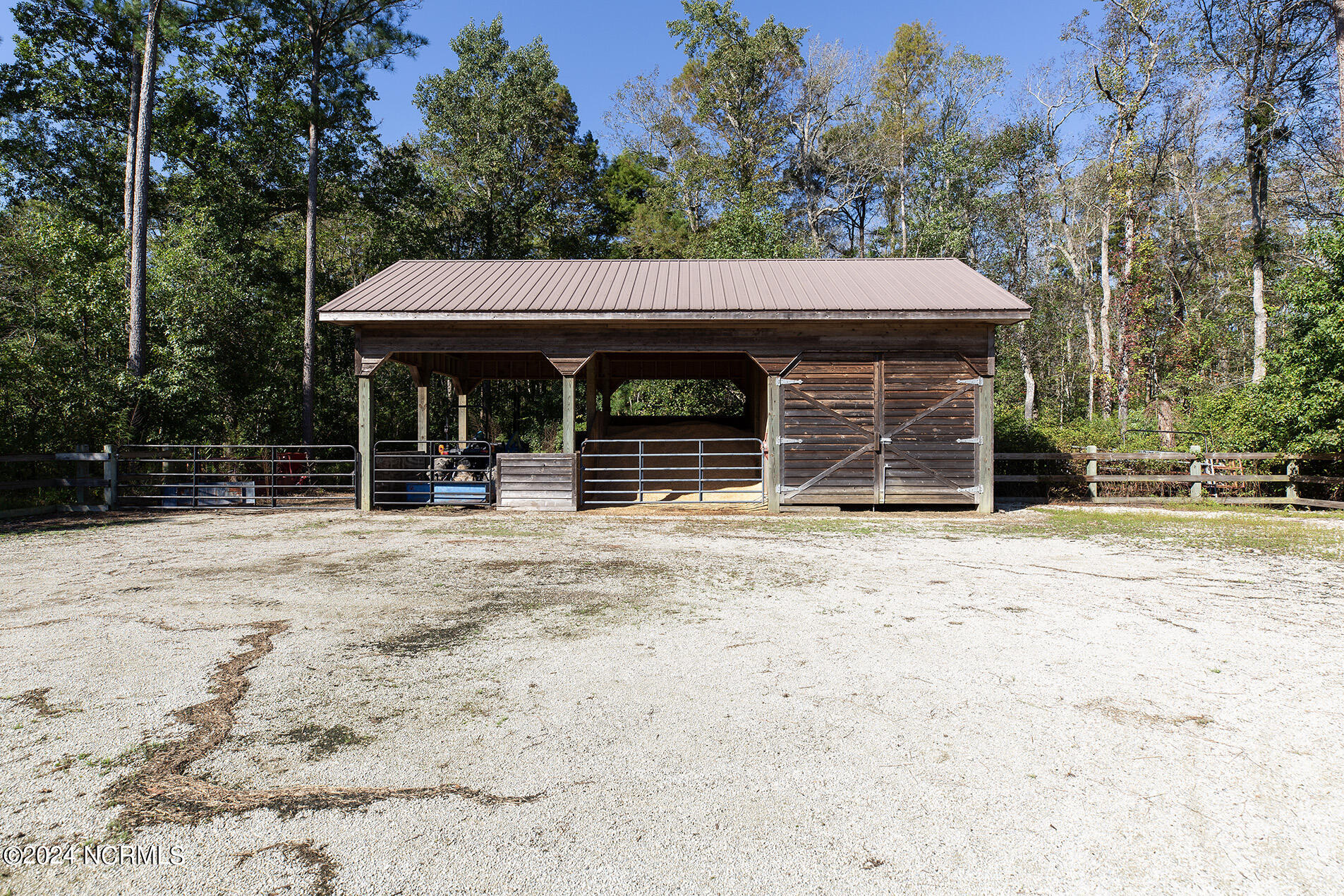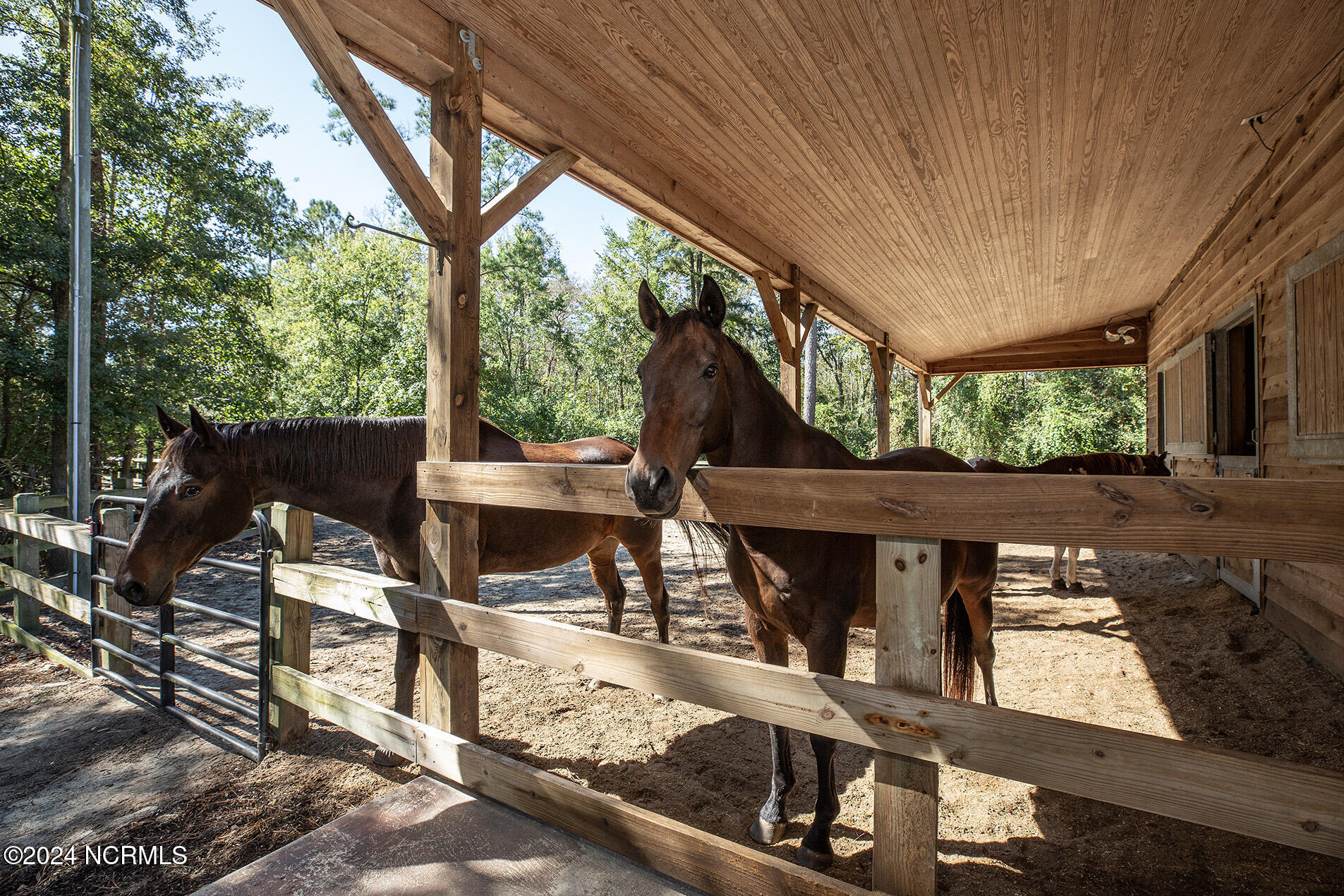 Nestled in the gated neighborhood of Equine Acres, this homestead - complete with a beautiful home, horse farm, and detached carriage house - boasts wonderful attention to detail. The home is privately positioned in the middle of groomed pastures and welcoming paths. It enjoys an open floor plan with meticulous detailing including trim molding, stylish cabinet knobs and pulls, and pendant lighting. Other notable features include a well-designed chef's kitchen, welcoming front and back porches, beautiful hardwood flooring, an elevator, and a three car attached garage. The nearby detached carriage house, also with a garage, offers a complete efficiency apartment. The barn offers a four stall center aisle construction with front and rear access from the stalls. There is a spacious tack room with feed storage as well as a washroom for essentials; a separate barn for hay storage and farm equipment is also included. The nearby pasture offers a covered hay feeder and pastures and lawns are partially irrigated with a separate well. Perfect for the avid gardener, a pump house for storage and supplies is also located nearby. The grounds are manicured and landscaped for ideal enjoyment - numerous flowering plants, bluebird houses, and a gravel walkway to the private barn are among the property's noteworthy features. Additionally, the neighborhood offers a private waterfront day dock and gathering place with a gazebo for community functions; there are also walking and riding trails throughout the wooded areas of Equine Acres.