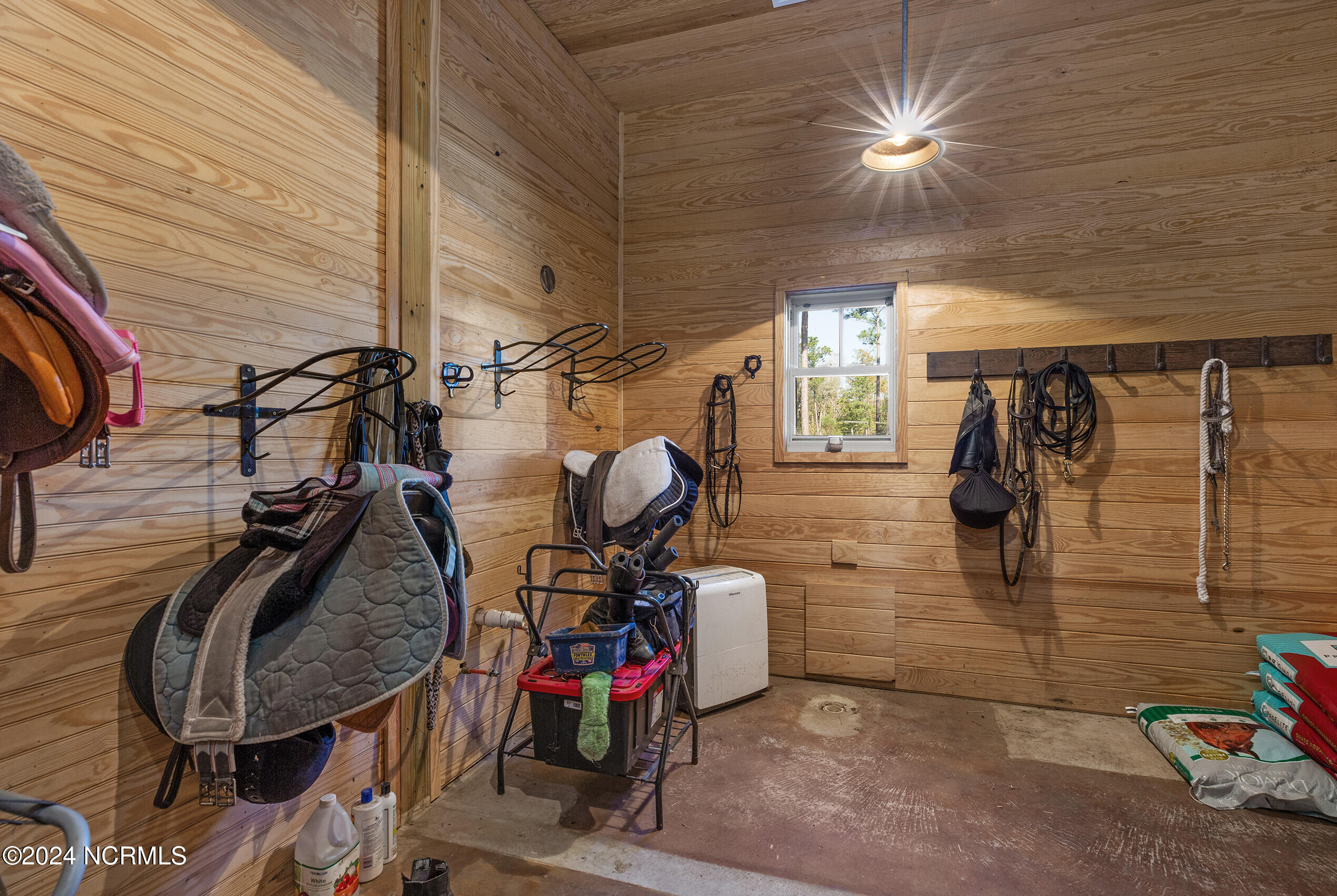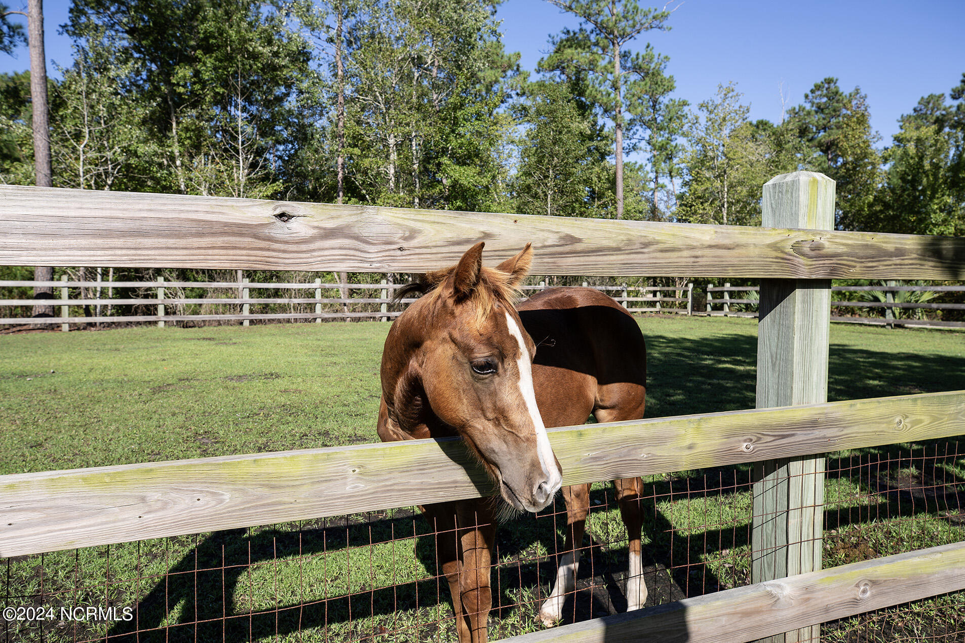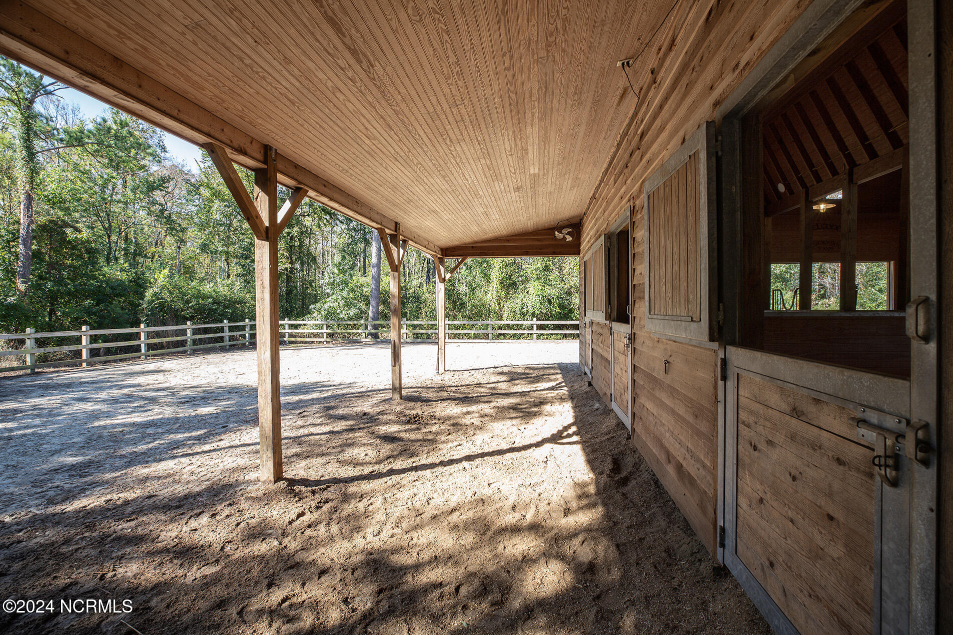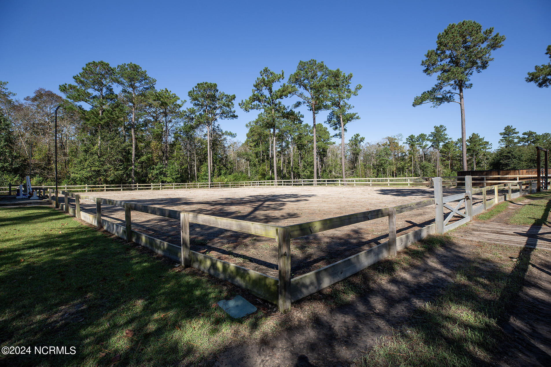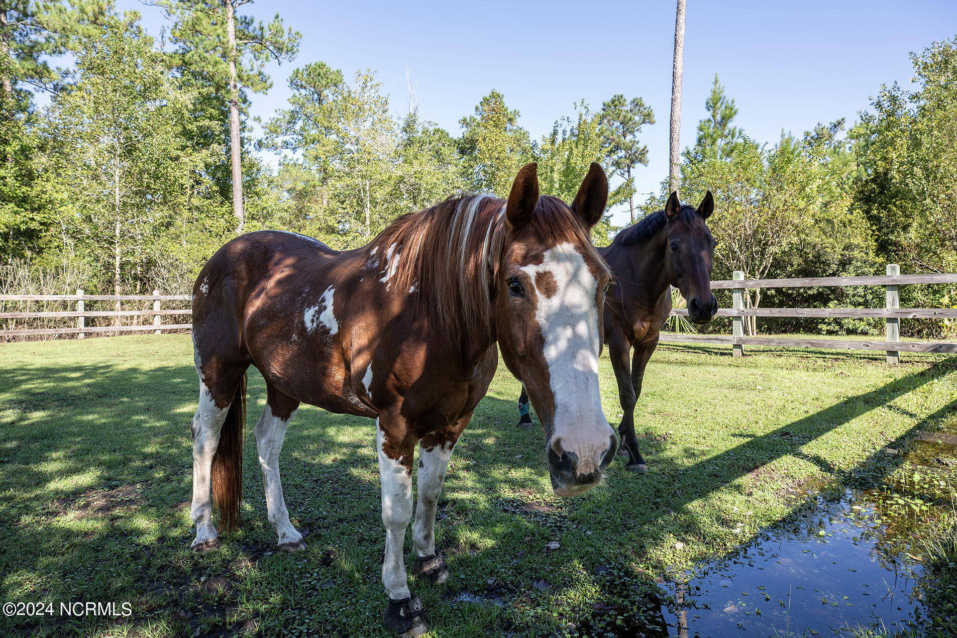 Nestled in the gated neighborhood of Equine Acres, this homestead - complete with a beautiful home, horse farm, and detached carriage house - boasts wonderful attention to detail. The home is privately positioned in the middle of groomed pastures and welcoming paths. It enjoys an open floor plan with meticulous detailing including trim molding, stylish cabinet knobs and pulls, and pendant lighting. Other notable features include a well-designed chef's kitchen, welcoming front and back porches, beautiful hardwood flooring, an elevator, and a three car attached garage. The nearby detached carriage house, also with a garage, offers a complete efficiency apartment. The barn offers a four stall center aisle construction with front and rear access from the stalls. There is a spacious tack room with feed storage as well as a washroom for essentials; a separate barn for hay storage and farm equipment is also included. The nearby pasture offers a covered hay feeder and pastures and lawns are partially irrigated with a separate well. Perfect for the avid gardener, a pump house for storage and supplies is also located nearby. The grounds are manicured and landscaped for ideal enjoyment - numerous flowering plants, bluebird houses, and a gravel walkway to the private barn are among the property's noteworthy features. Additionally, the neighborhood offers a private waterfront day dock and gathering place with a gazebo for community functions; there are also walking and riding trails throughout the wooded areas of Equine Acres.