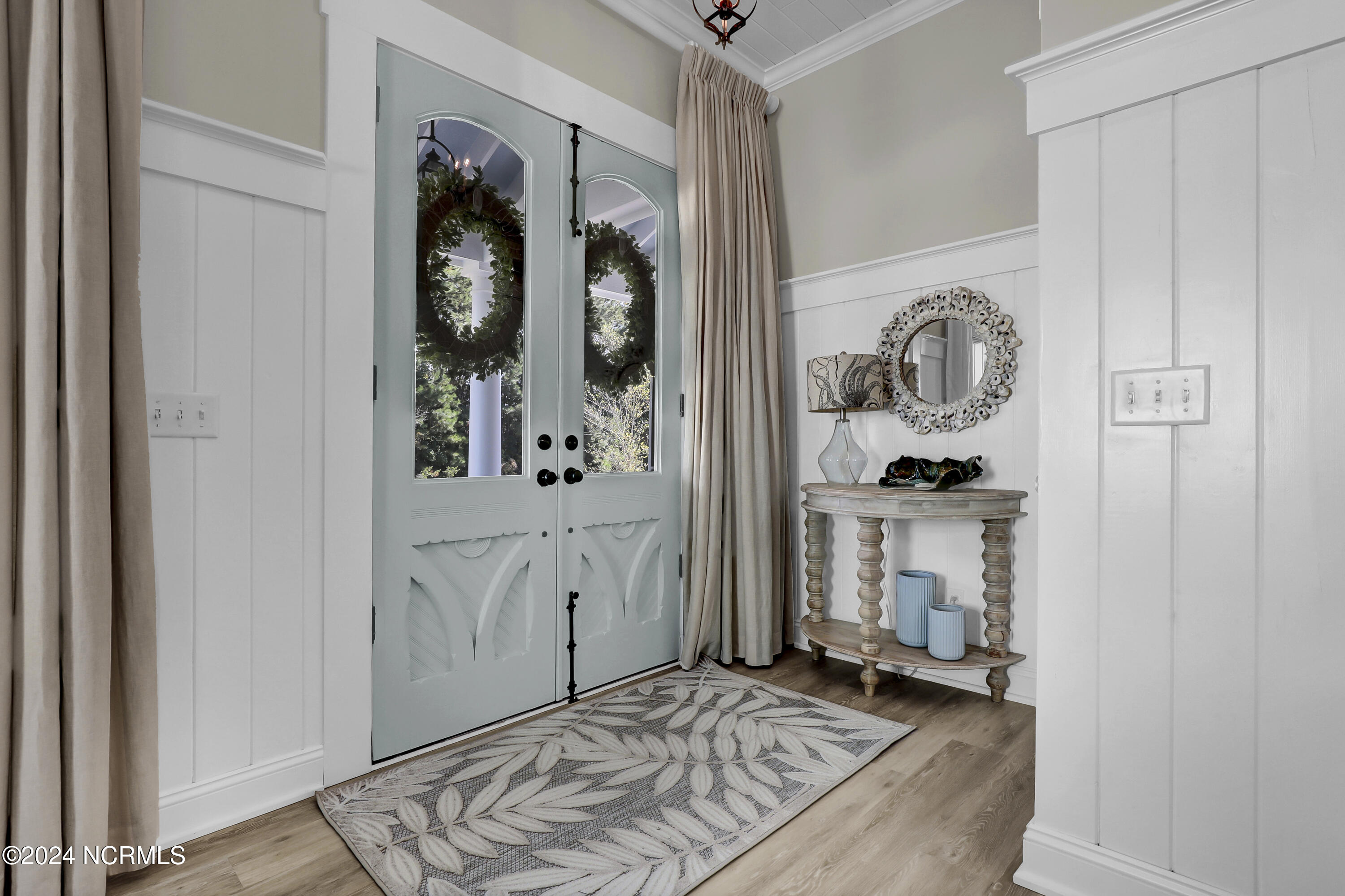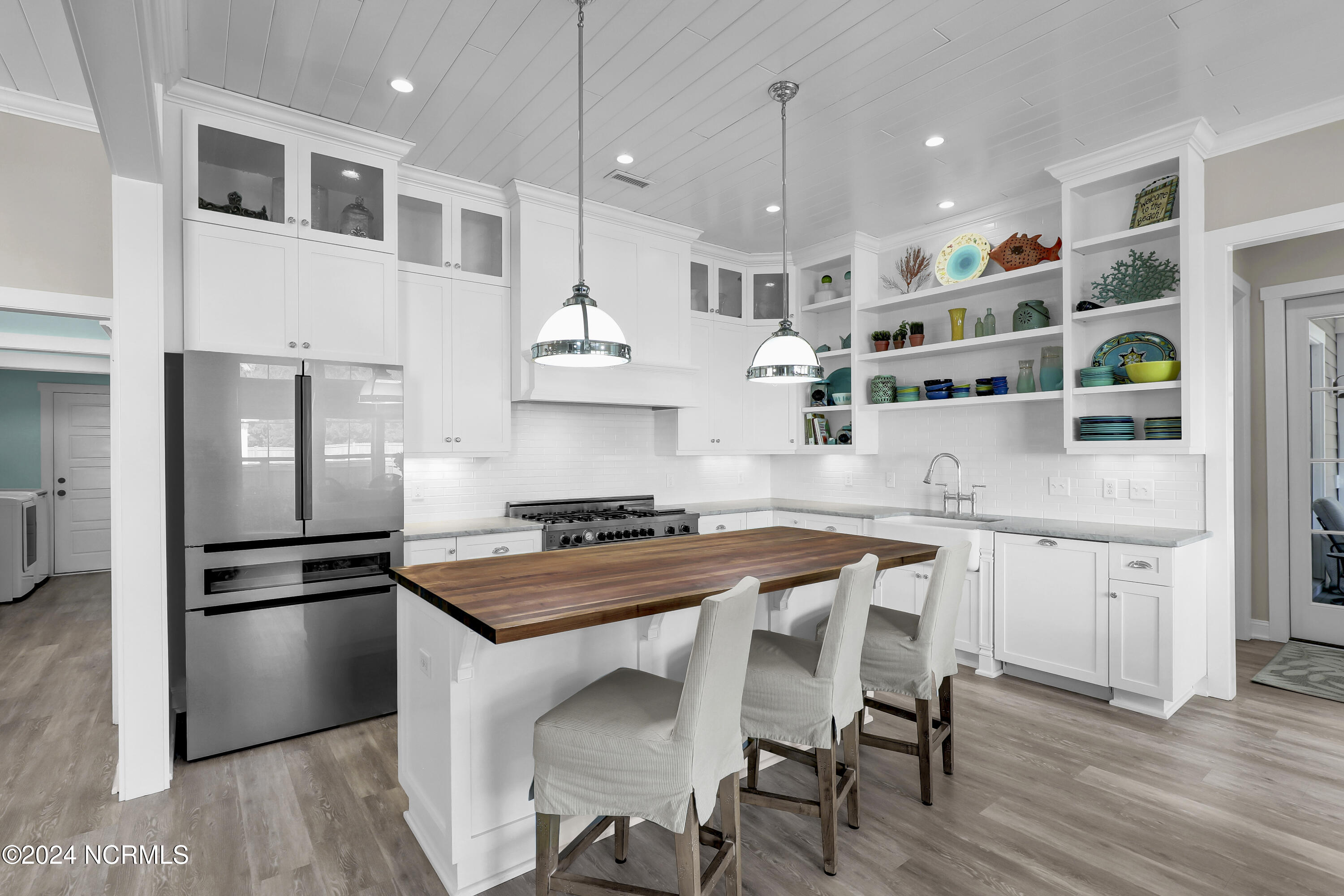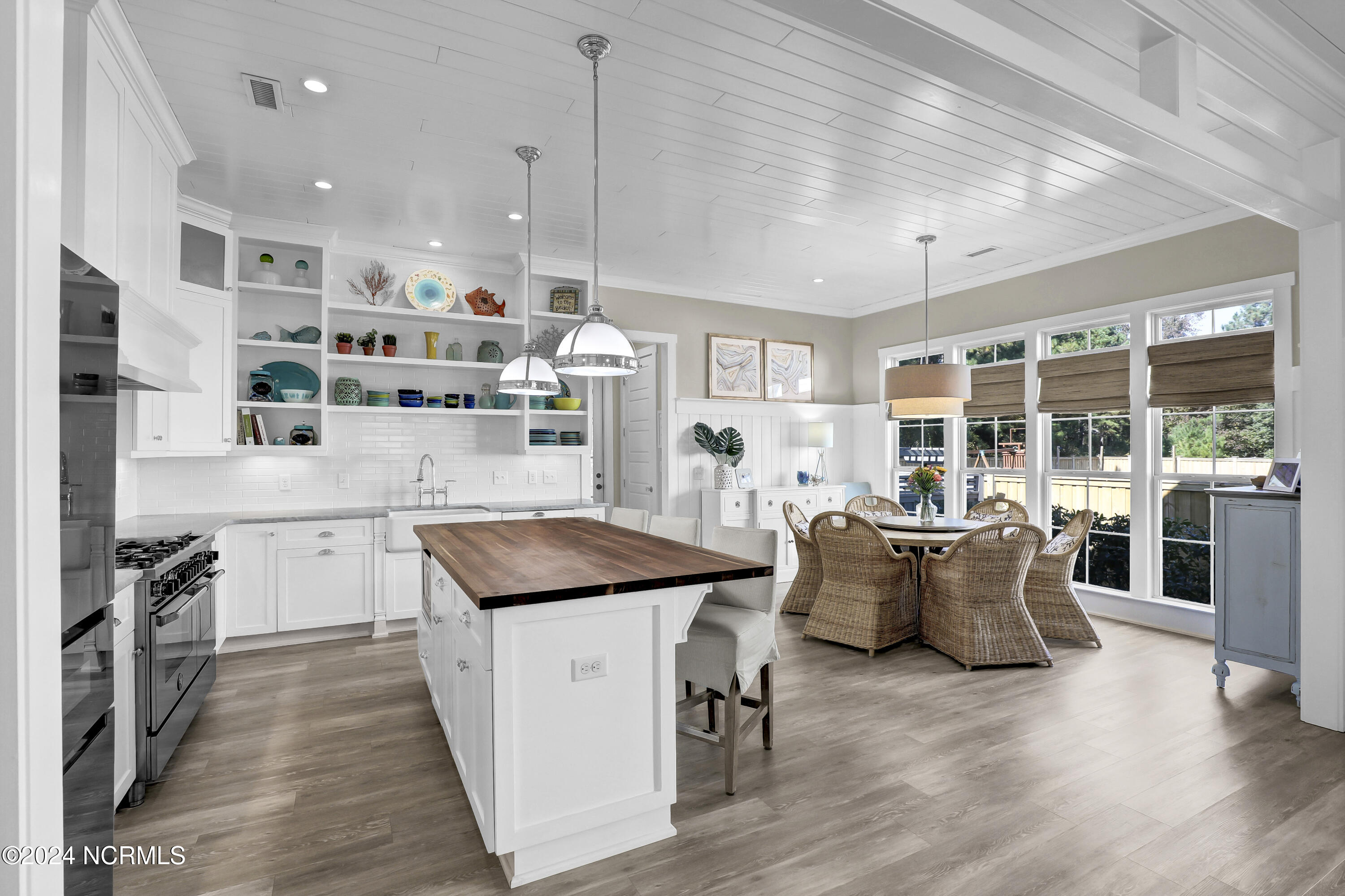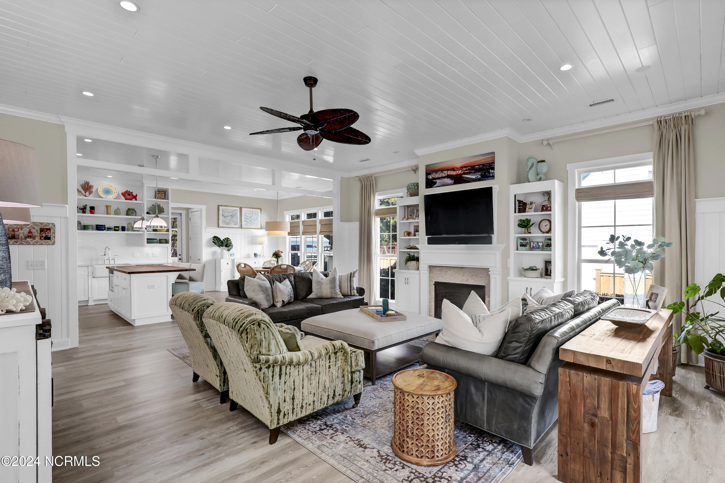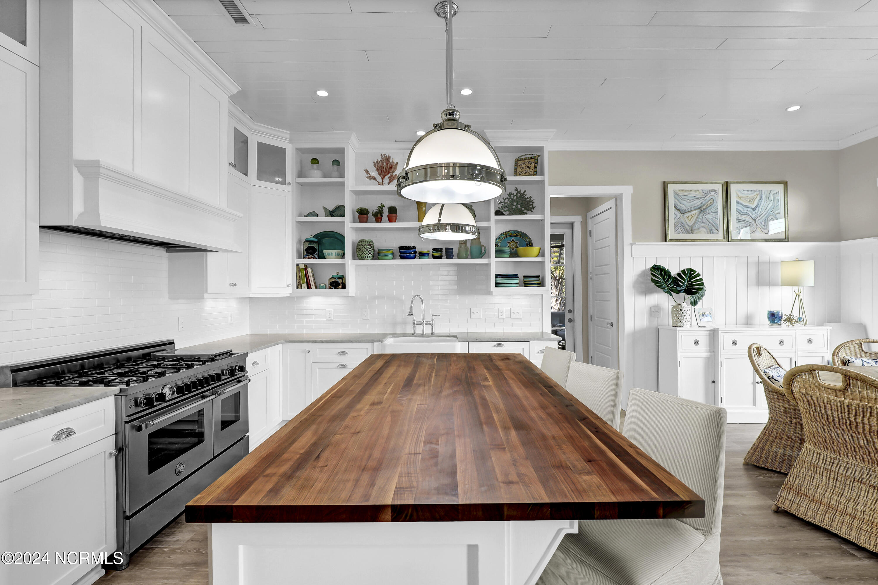 Welcome to this enchanted and custom-built gem by Chris Martin, surrounded by breath-taking landscaping; to include Zoysia Emerald grass and nestled in an upscale waterfront community on the edge of the coastal towns of Hampstead and Surf City. A Southern porch with an almost 100 year old antique double front door and exposed rafter tails serves as a focal point and beckons you to sit on your swing and gather with friends and neighbors. You will be blown away with the craftsmanship and detailed trim work with each step. As you enter the grand foyer, you will immediately notice gorgeous LVP floors installed throughout the entire main home. Elegant Emtek crystal doorknobs, 8' interior doors and transom windows with custom motorized blinds and custom-made drapes further highlight the aesthetic appeal. A large and bright living room with built-ins, board & batten design on the walls and tongue & groove ceiling which welcomes you and feels as though it was made for cozy evenings around a fireplace with a nice glass of wine, reading your favorite author, playing family games, conducting deep conversations or just watching movies. The open concept connects the living room with a dining room and a kitchen. The dining room awaits the new owners to host their holiday meals and overlooks a gourmet kitchen which offers custom built executive cabinetry with a soft closing system which provides a wealth of storage space, glistening Carrera marble counter tops, a custom walnut block 7' long island, Shaw fireclay farm sink, stainless-steel appliances, Italian 6-burner Bertazzoni gas stove, 2 ovens & griddle, custom open shelving and a pantry with wooden shelves and coffee area and recently professionally wallpapered. This kitchen will please every chef and make any cooking experience much more enjoyable.