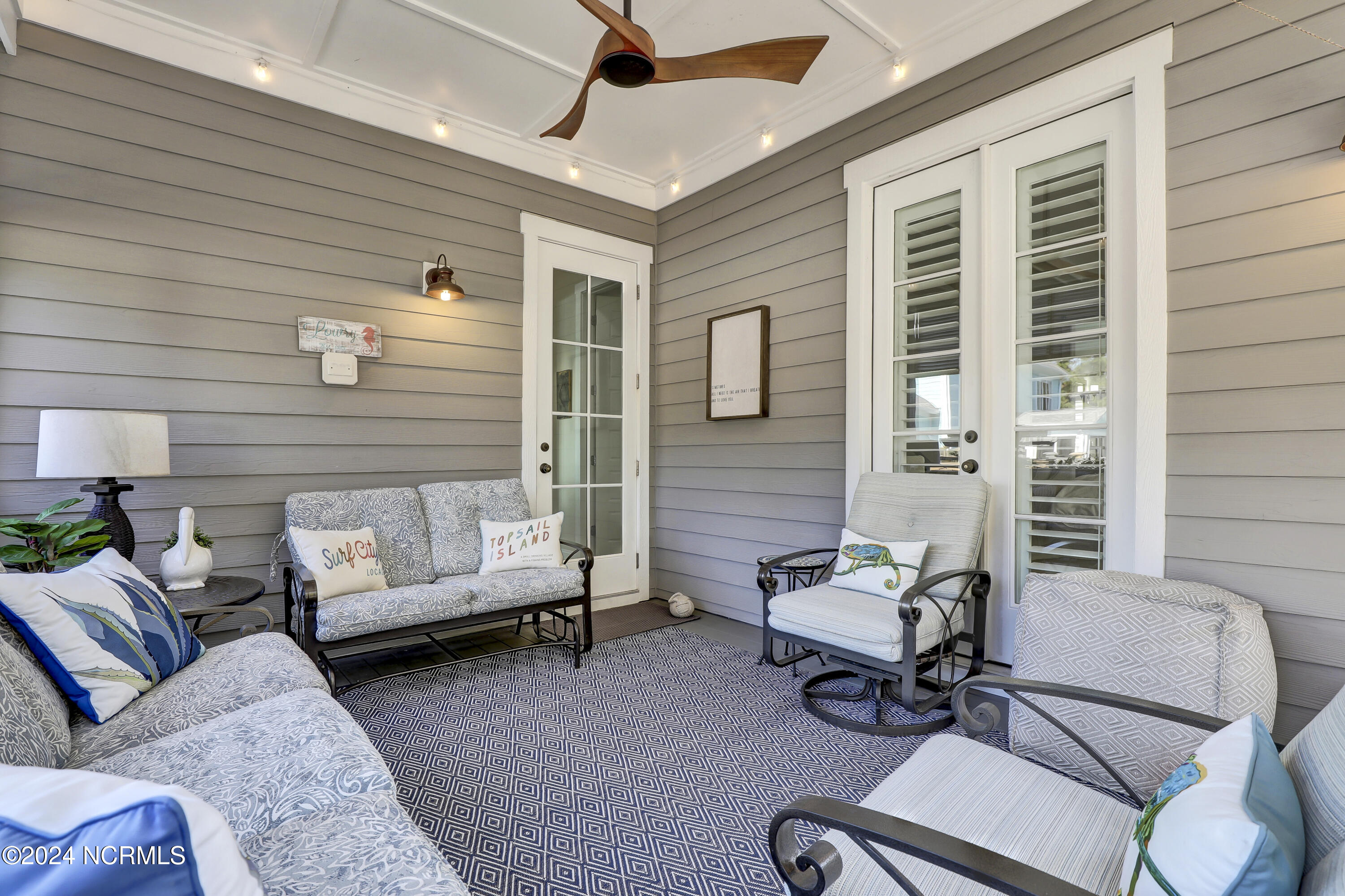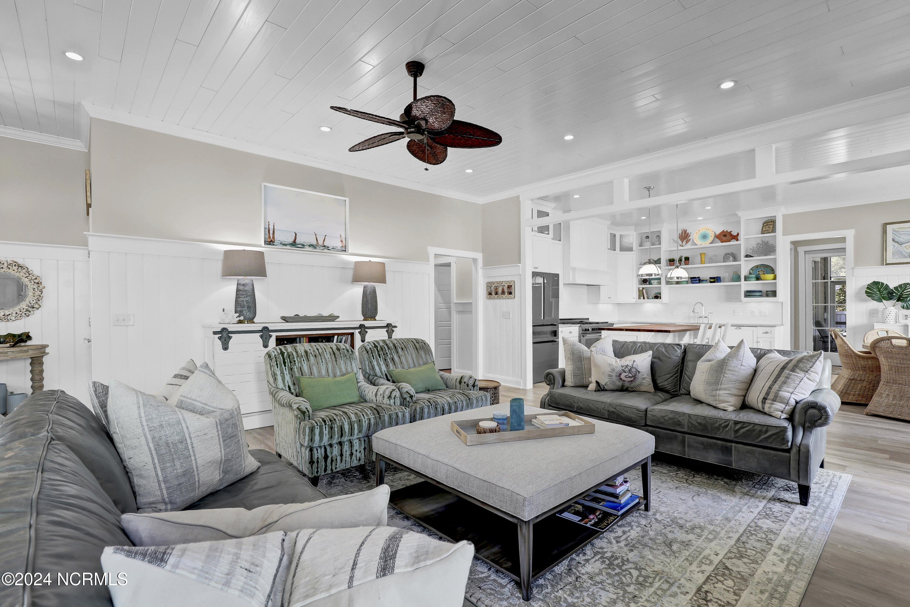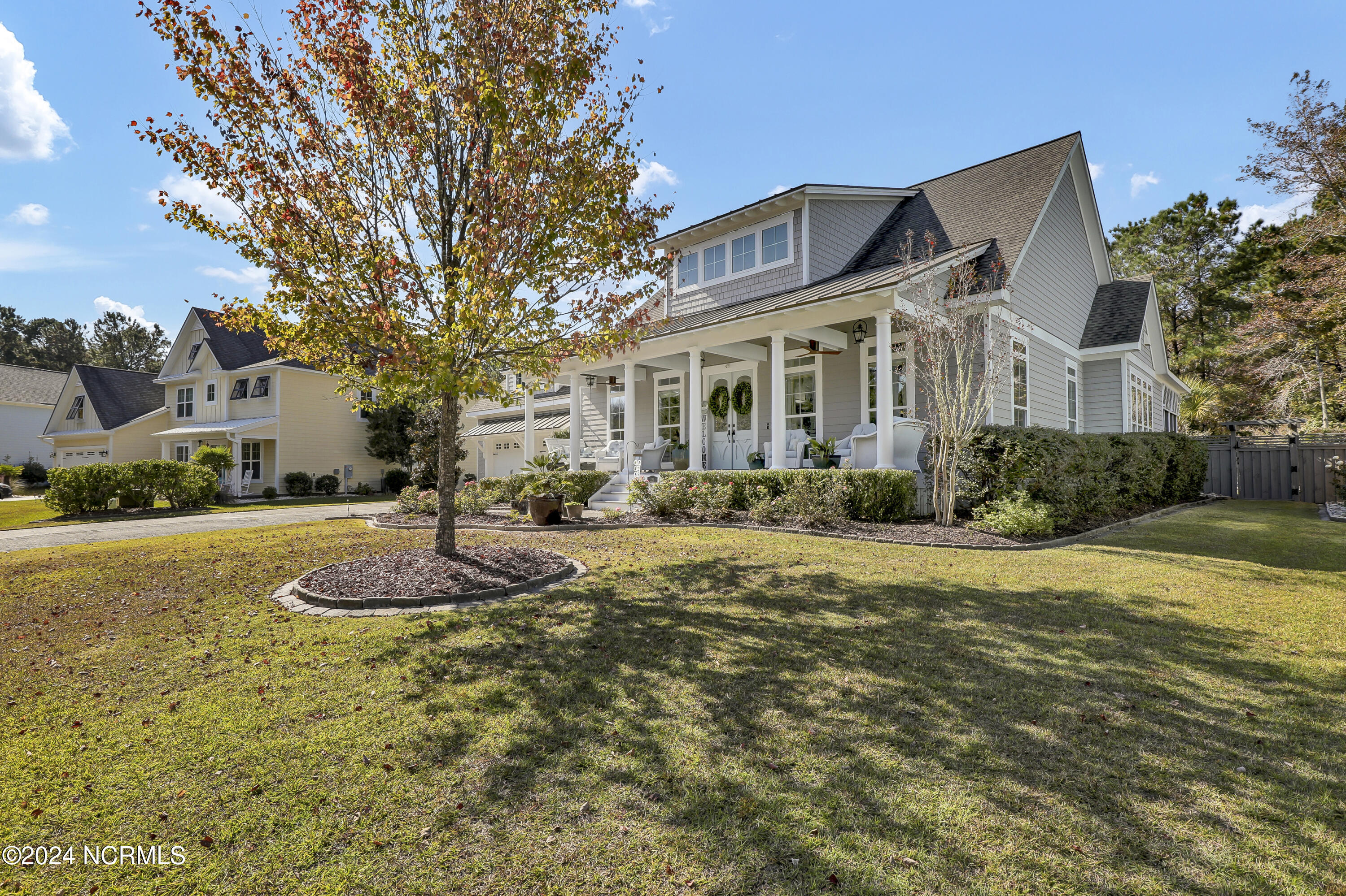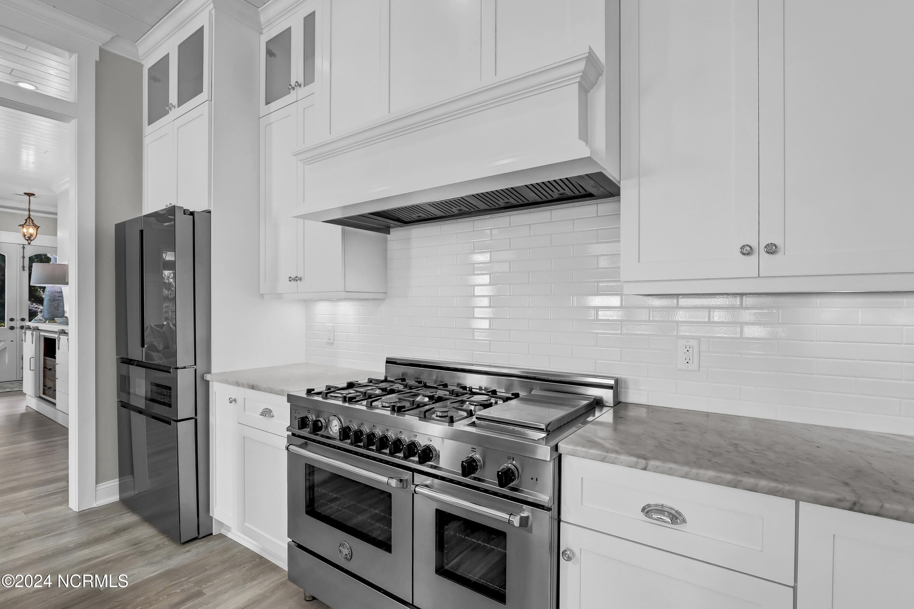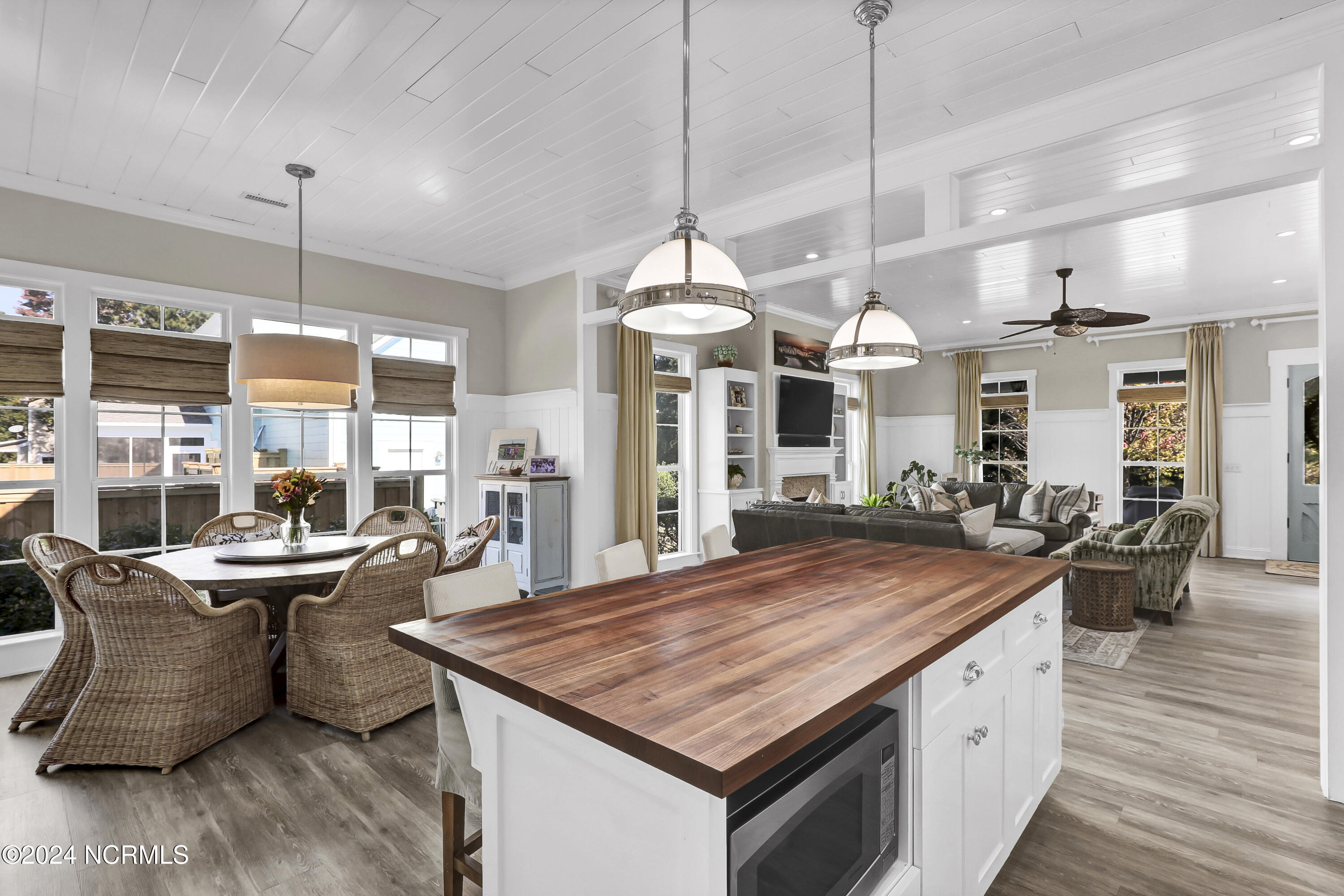 Welcome to this enchanted and custom-built gem by Chris Martin, surrounded by breath-taking landscaping; to include Zoysia Emerald grass and nestled in an upscale waterfront community on the edge of the coastal towns of Hampstead and Surf City. A Southern porch with an almost 100 year old antique double front door and exposed rafter tails serves as a focal point and beckons you to sit on your swing and gather with friends and neighbors. You will be blown away with the craftsmanship and detailed trim work with each step. As you enter the grand foyer, you will immediately notice gorgeous LVP floors installed throughout the entire main home. Elegant Emtek crystal doorknobs, 8' interior doors and transom windows with custom motorized blinds and custom-made drapes further highlight the aesthetic appeal. A large and bright living room with built-ins, board & batten design on the walls and tongue & groove ceiling which welcomes you and feels as though it was made for cozy evenings around a fireplace with a nice glass of wine, reading your favorite author, playing family games, conducting deep conversations or just watching movies. The open concept connects the living room with a dining room and a kitchen. The dining room awaits the new owners to host their holiday meals and overlooks a gourmet kitchen which offers custom built executive cabinetry with a soft closing system which provides a wealth of storage space, glistening Carrera marble counter tops, a custom walnut block 7' long island, Shaw fireclay farm sink, stainless-steel appliances, Italian 6-burner Bertazzoni gas stove, 2 ovens & griddle, custom open shelving and a pantry with wooden shelves and coffee area and recently professionally wallpapered. This kitchen will please every chef and make any cooking experience much more enjoyable.