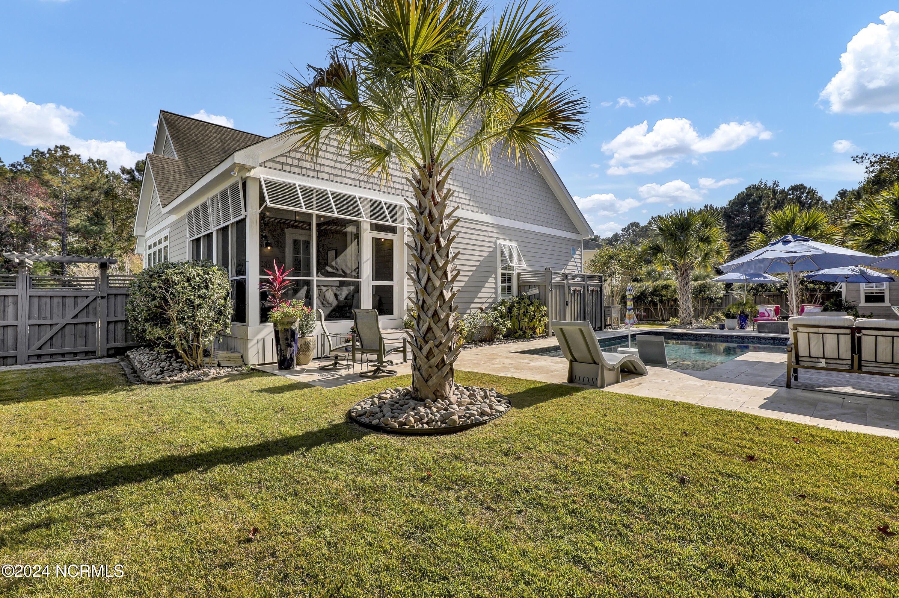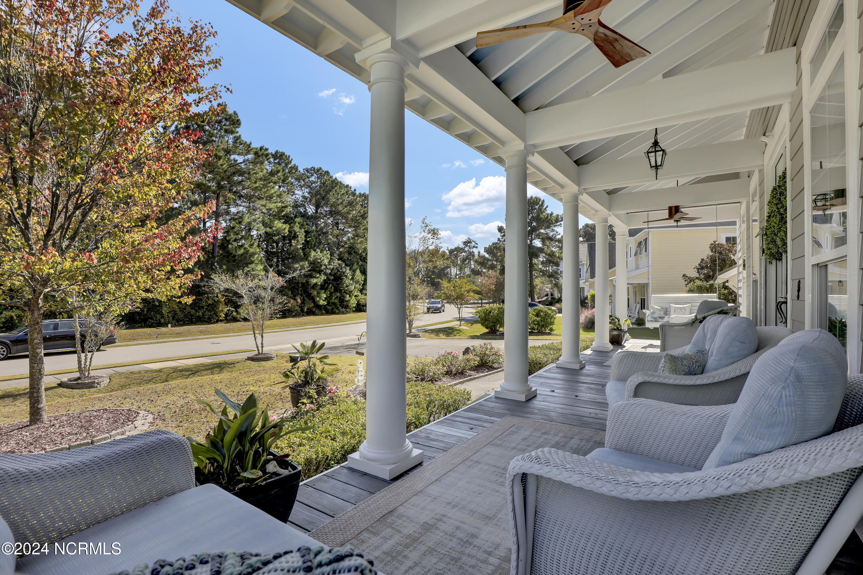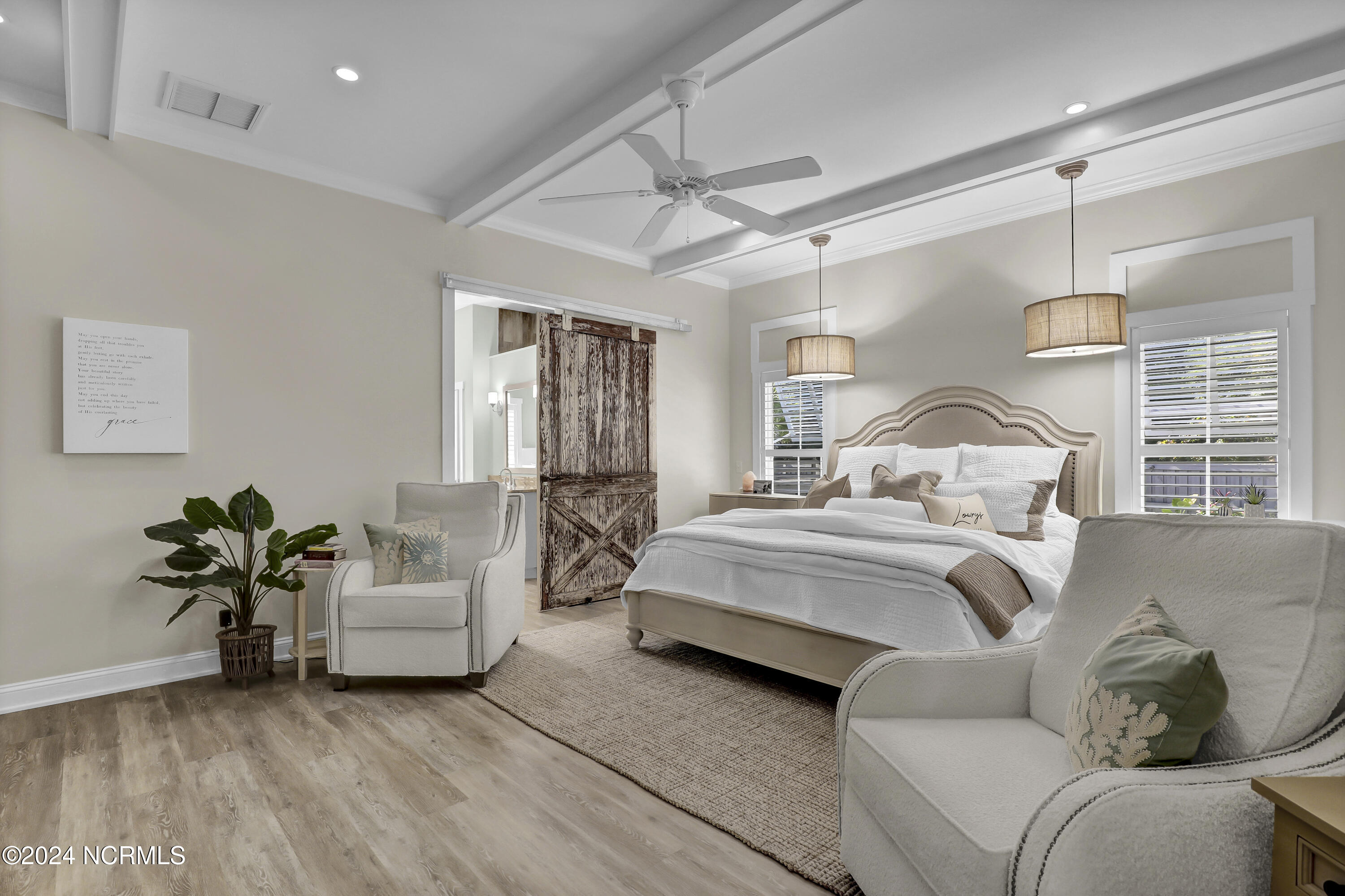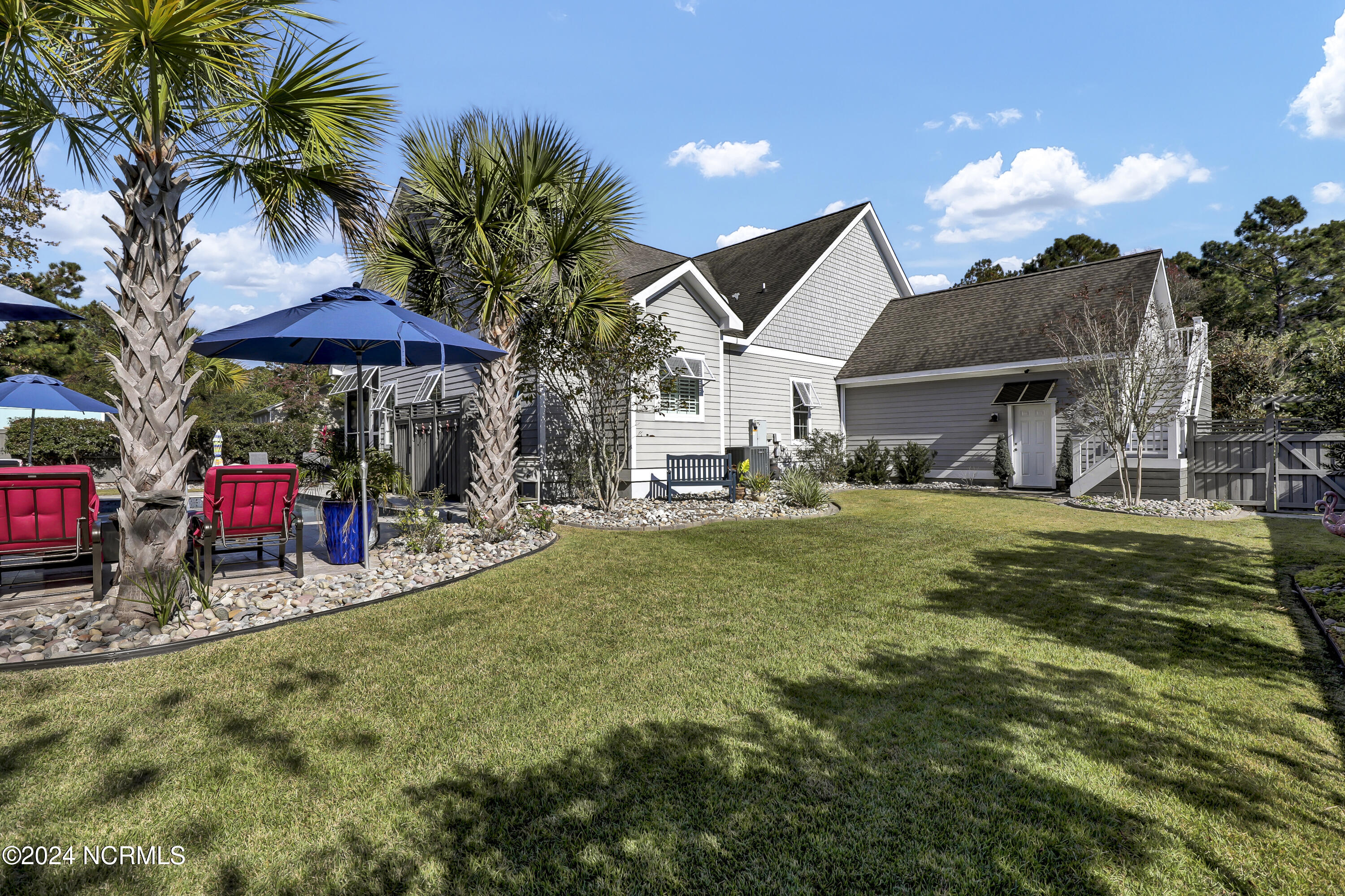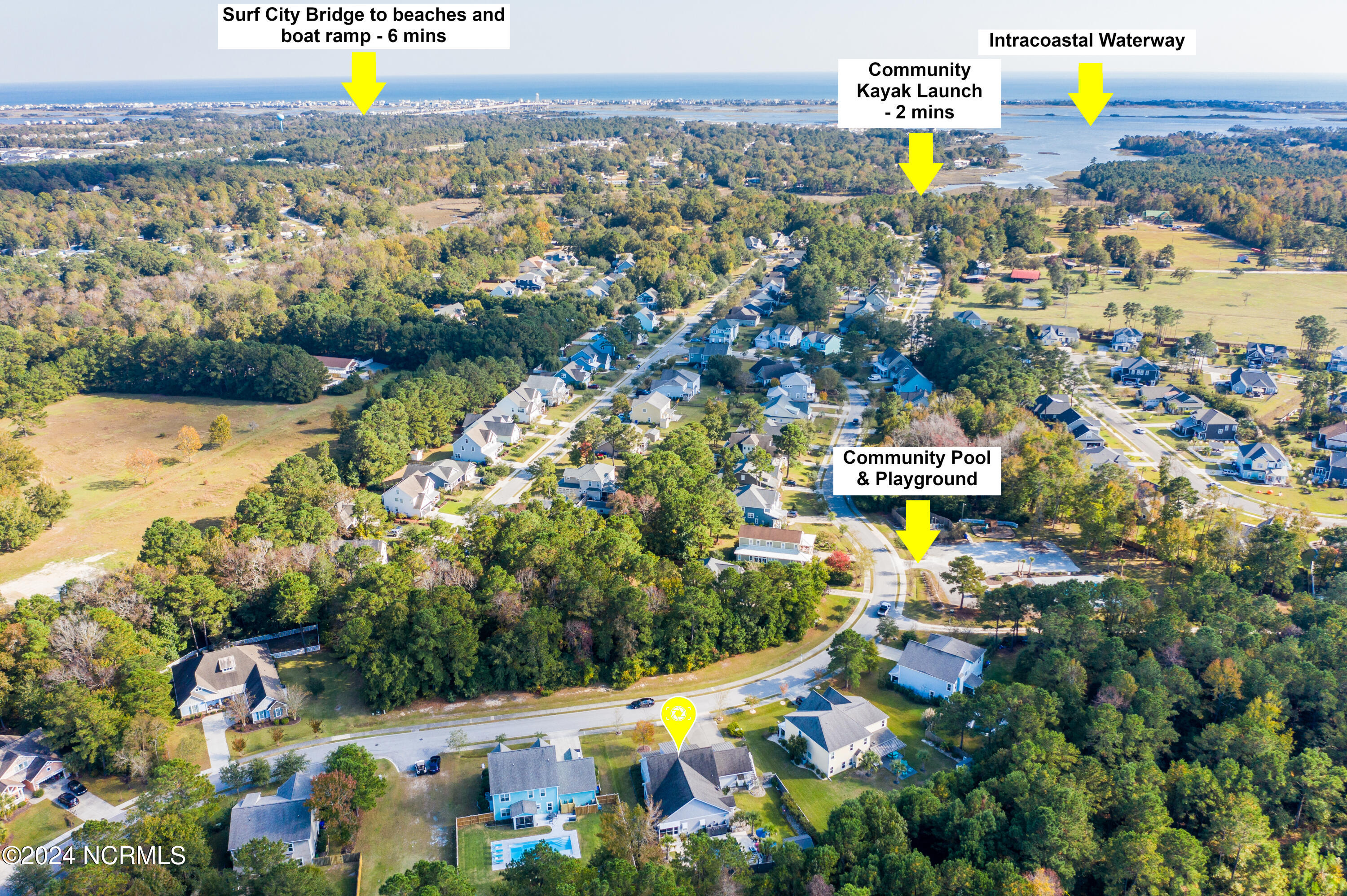 Welcome to this enchanted and custom-built gem by Chris Martin, surrounded by breath-taking landscaping; to include Zoysia Emerald grass and nestled in an upscale waterfront community on the edge of the coastal towns of Hampstead and Surf City. A Southern porch with an almost 100 year old antique double front door and exposed rafter tails serves as a focal point and beckons you to sit on your swing and gather with friends and neighbors. You will be blown away with the craftsmanship and detailed trim work with each step. As you enter the grand foyer, you will immediately notice gorgeous LVP floors installed throughout the entire main home. Elegant Emtek crystal doorknobs, 8' interior doors and transom windows with custom motorized blinds and custom-made drapes further highlight the aesthetic appeal. A large and bright living room with built-ins, board & batten design on the walls and tongue & groove ceiling which welcomes you and feels as though it was made for cozy evenings around a fireplace with a nice glass of wine, reading your favorite author, playing family games, conducting deep conversations or just watching movies. The open concept connects the living room with a dining room and a kitchen. The dining room awaits the new owners to host their holiday meals and overlooks a gourmet kitchen which offers custom built executive cabinetry with a soft closing system which provides a wealth of storage space, glistening Carrera marble counter tops, a custom walnut block 7' long island, Shaw fireclay farm sink, stainless-steel appliances, Italian 6-burner Bertazzoni gas stove, 2 ovens & griddle, custom open shelving and a pantry with wooden shelves and coffee area and recently professionally wallpapered. This kitchen will please every chef and make any cooking experience much more enjoyable.