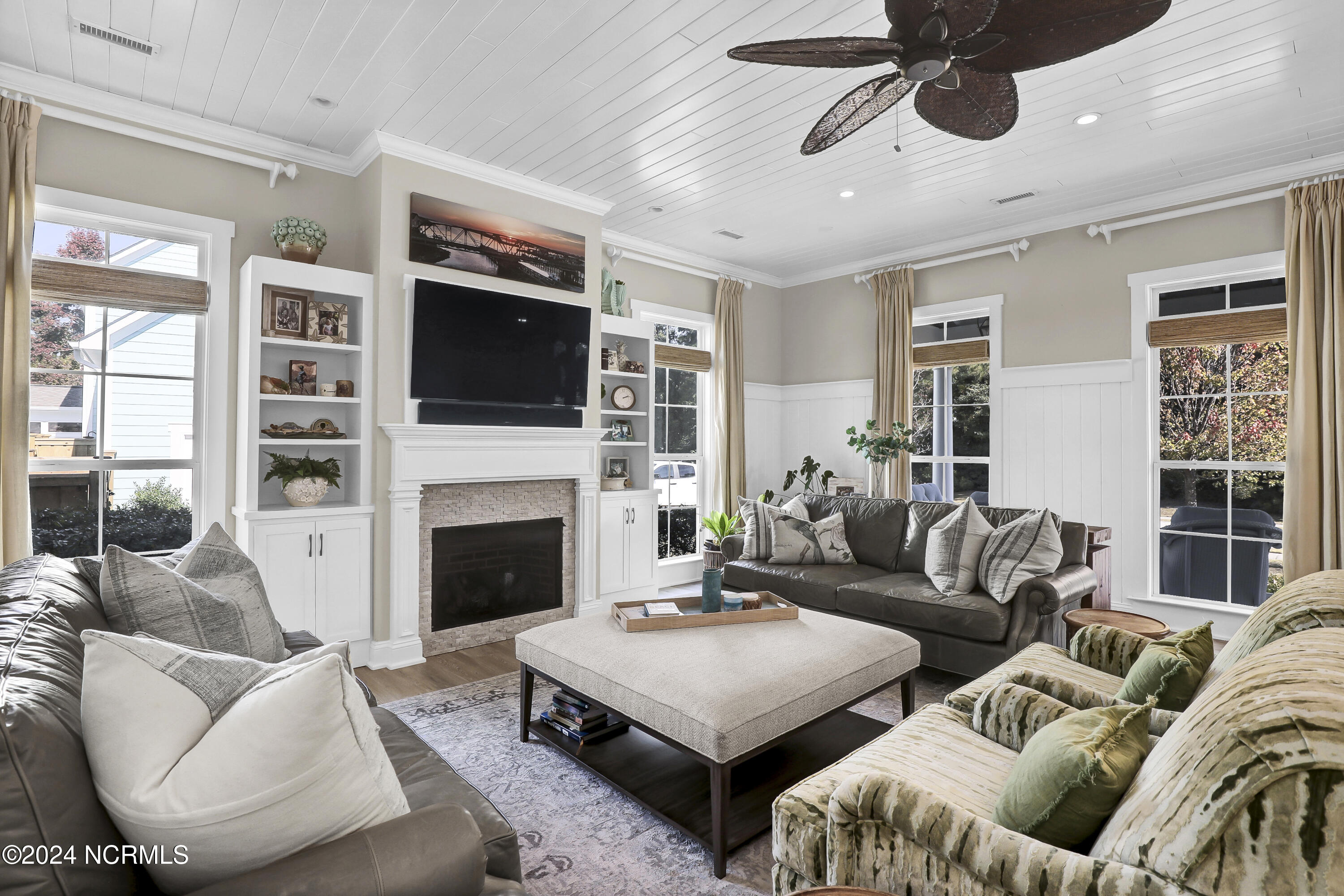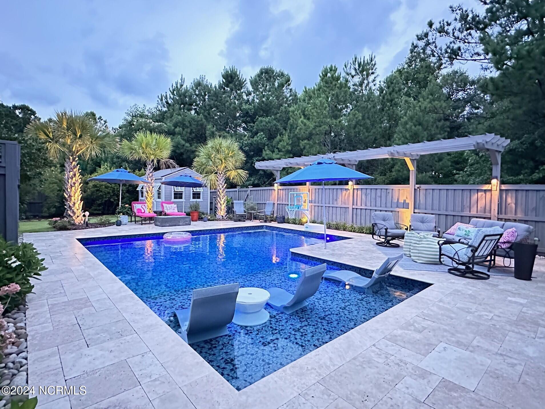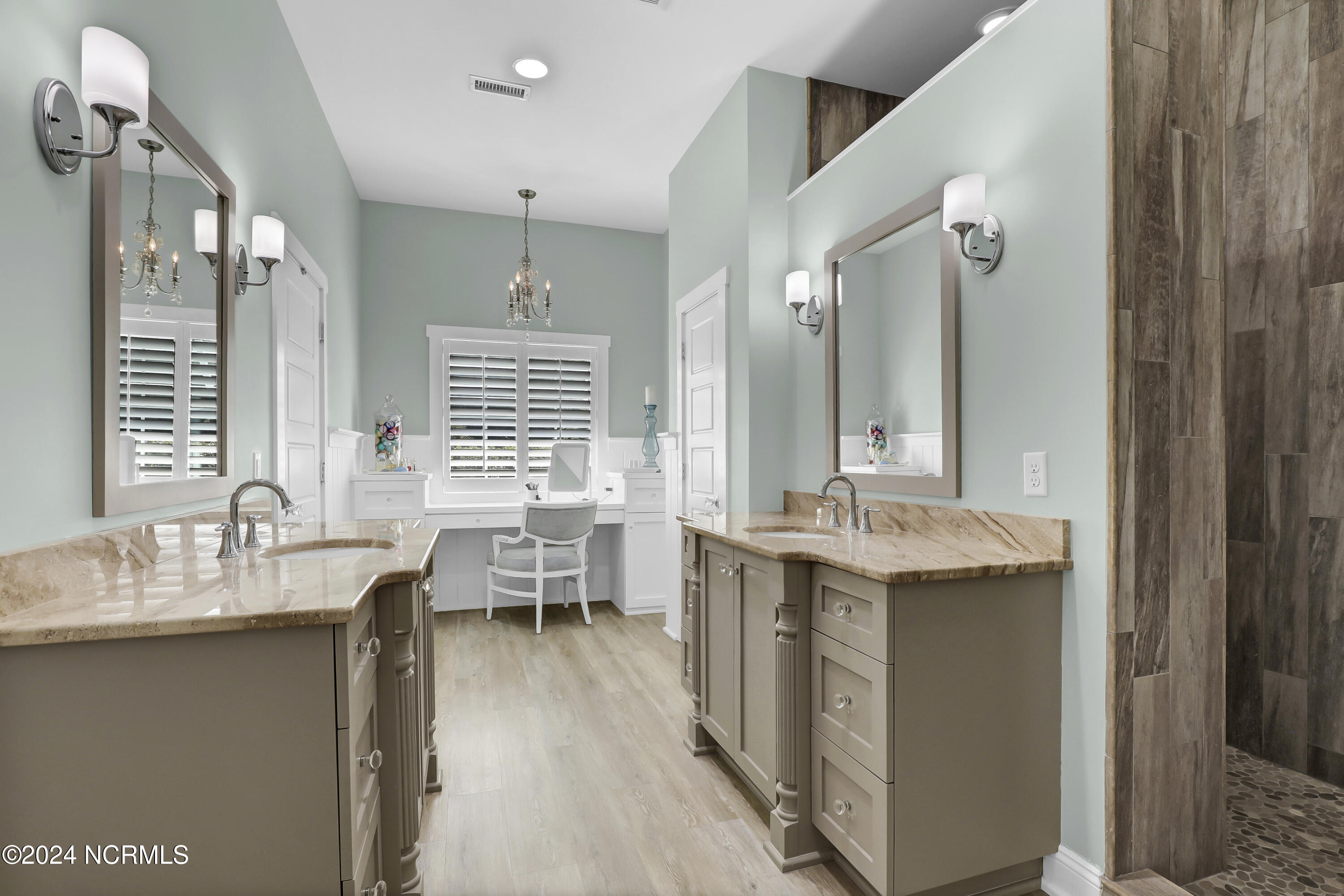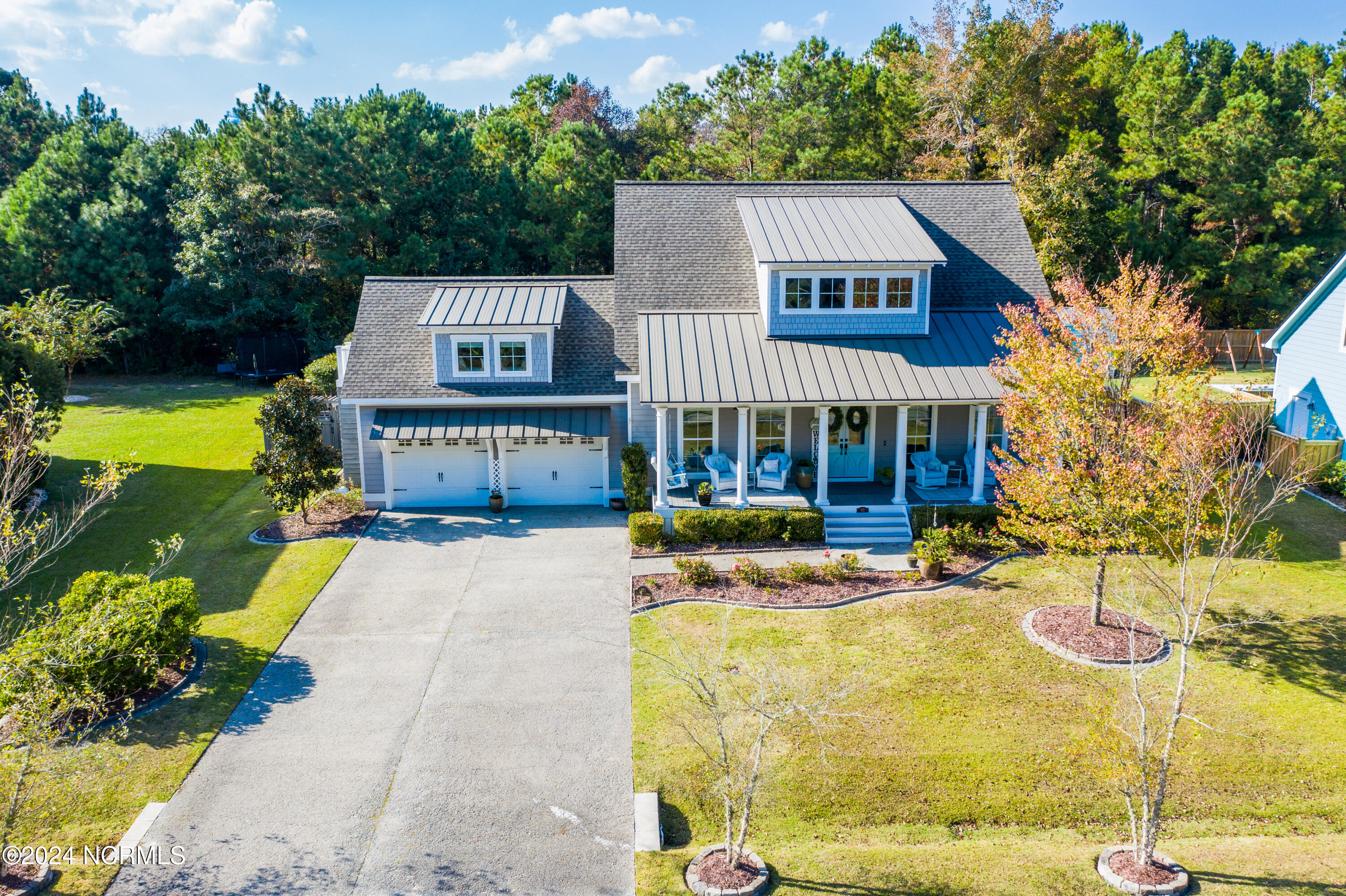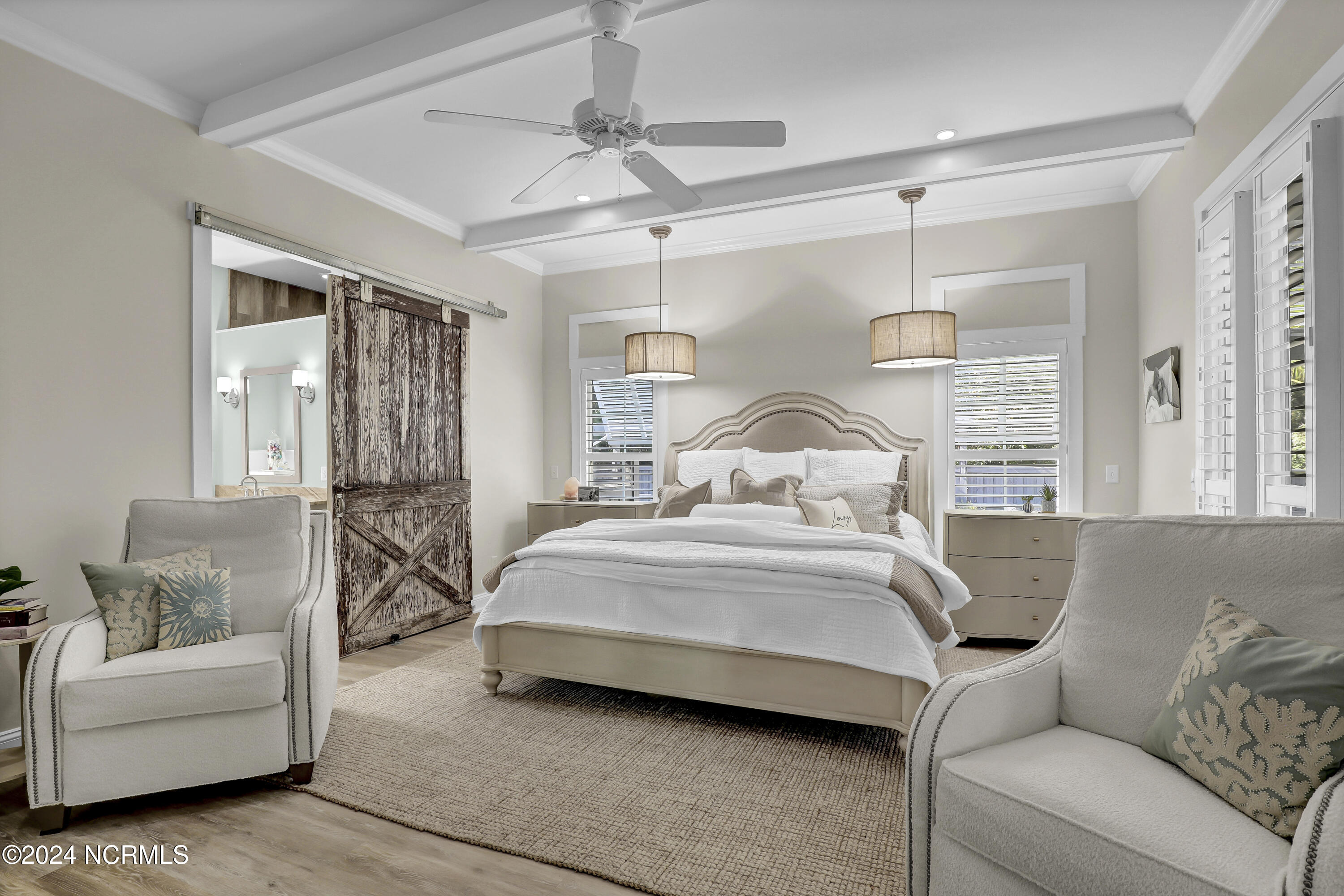 Welcome to this enchanted and custom-built gem by Chris Martin, surrounded by breath-taking landscaping; to include Zoysia Emerald grass and nestled in an upscale waterfront community on the edge of the coastal towns of Hampstead and Surf City. A Southern porch with an almost 100 year old antique double front door and exposed rafter tails serves as a focal point and beckons you to sit on your swing and gather with friends and neighbors. You will be blown away with the craftsmanship and detailed trim work with each step. As you enter the grand foyer, you will immediately notice gorgeous LVP floors installed throughout the entire main home. Elegant Emtek crystal doorknobs, 8' interior doors and transom windows with custom motorized blinds and custom-made drapes further highlight the aesthetic appeal. A large and bright living room with built-ins, board & batten design on the walls and tongue & groove ceiling which welcomes you and feels as though it was made for cozy evenings around a fireplace with a nice glass of wine, reading your favorite author, playing family games, conducting deep conversations or just watching movies. The open concept connects the living room with a dining room and a kitchen. The dining room awaits the new owners to host their holiday meals and overlooks a gourmet kitchen which offers custom built executive cabinetry with a soft closing system which provides a wealth of storage space, glistening Carrera marble counter tops, a custom walnut block 7' long island, Shaw fireclay farm sink, stainless-steel appliances, Italian 6-burner Bertazzoni gas stove, 2 ovens & griddle, custom open shelving and a pantry with wooden shelves and coffee area and recently professionally wallpapered. This kitchen will please every chef and make any cooking experience much more enjoyable.