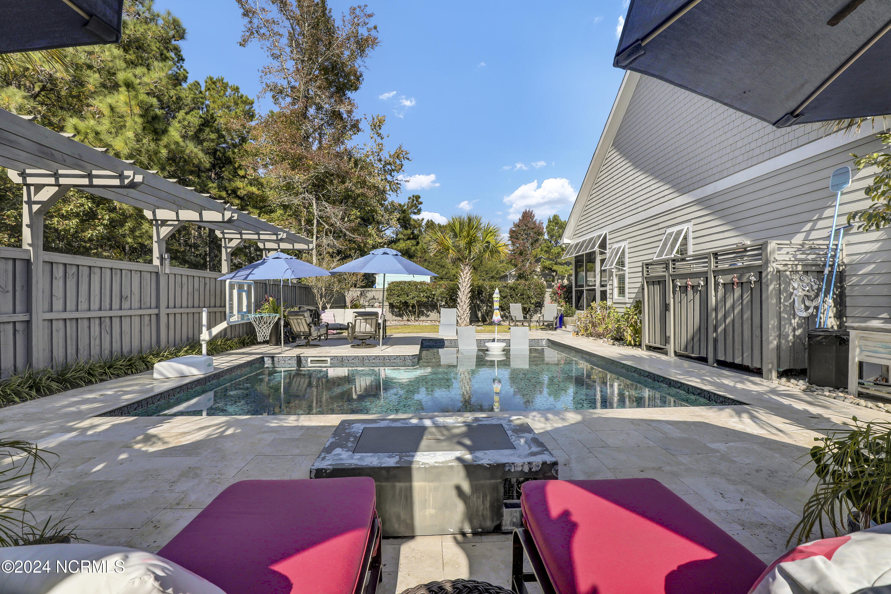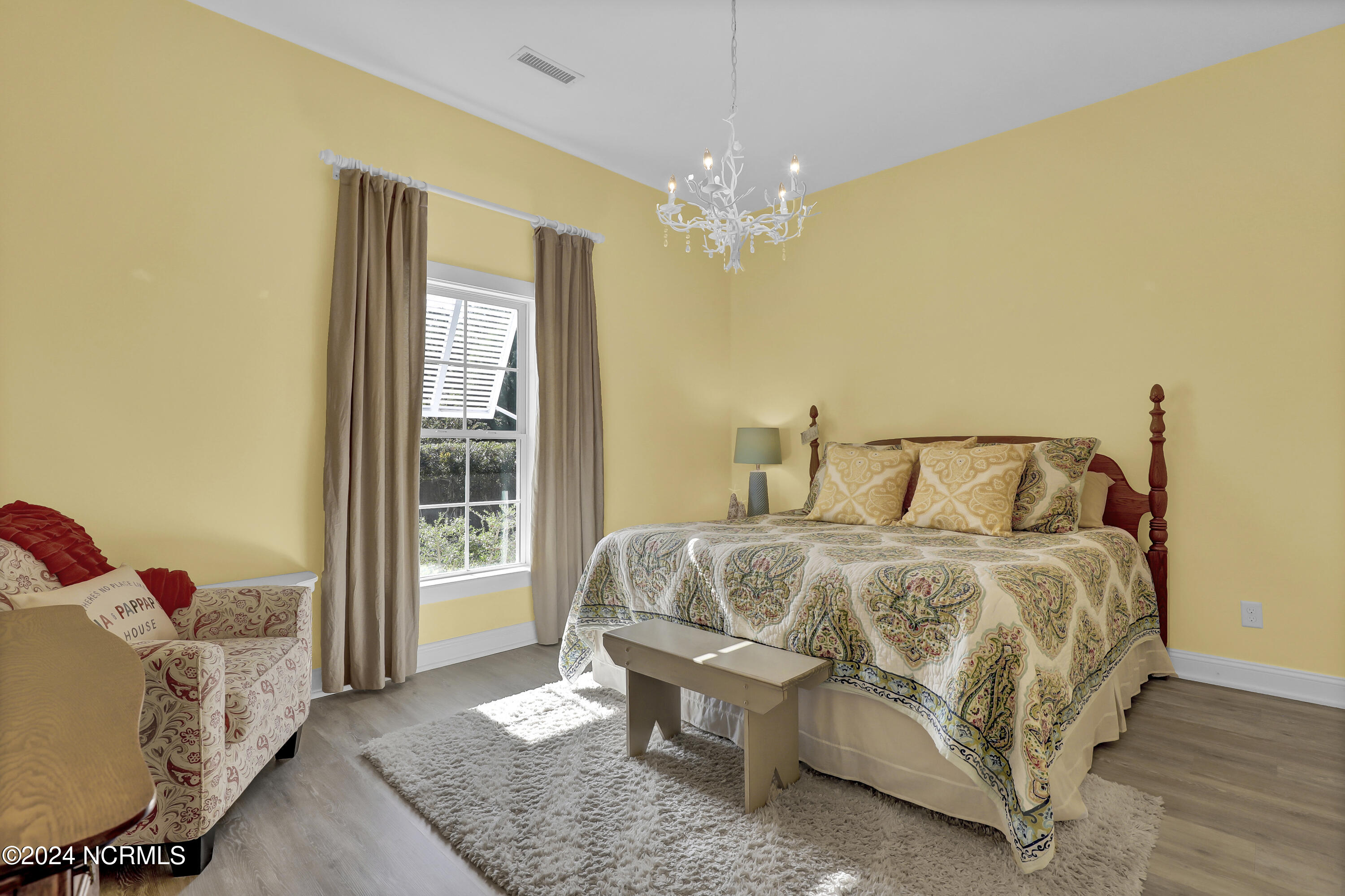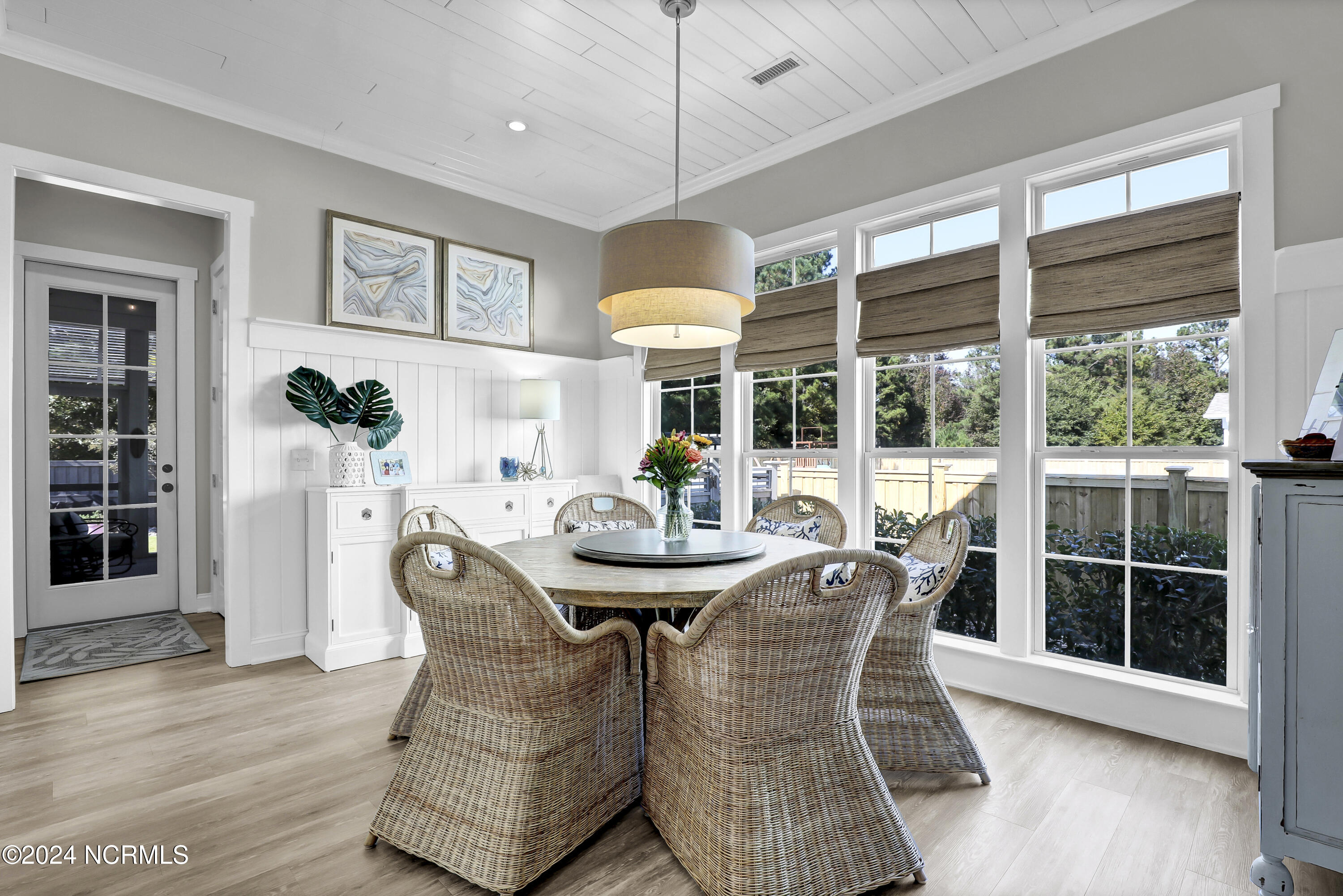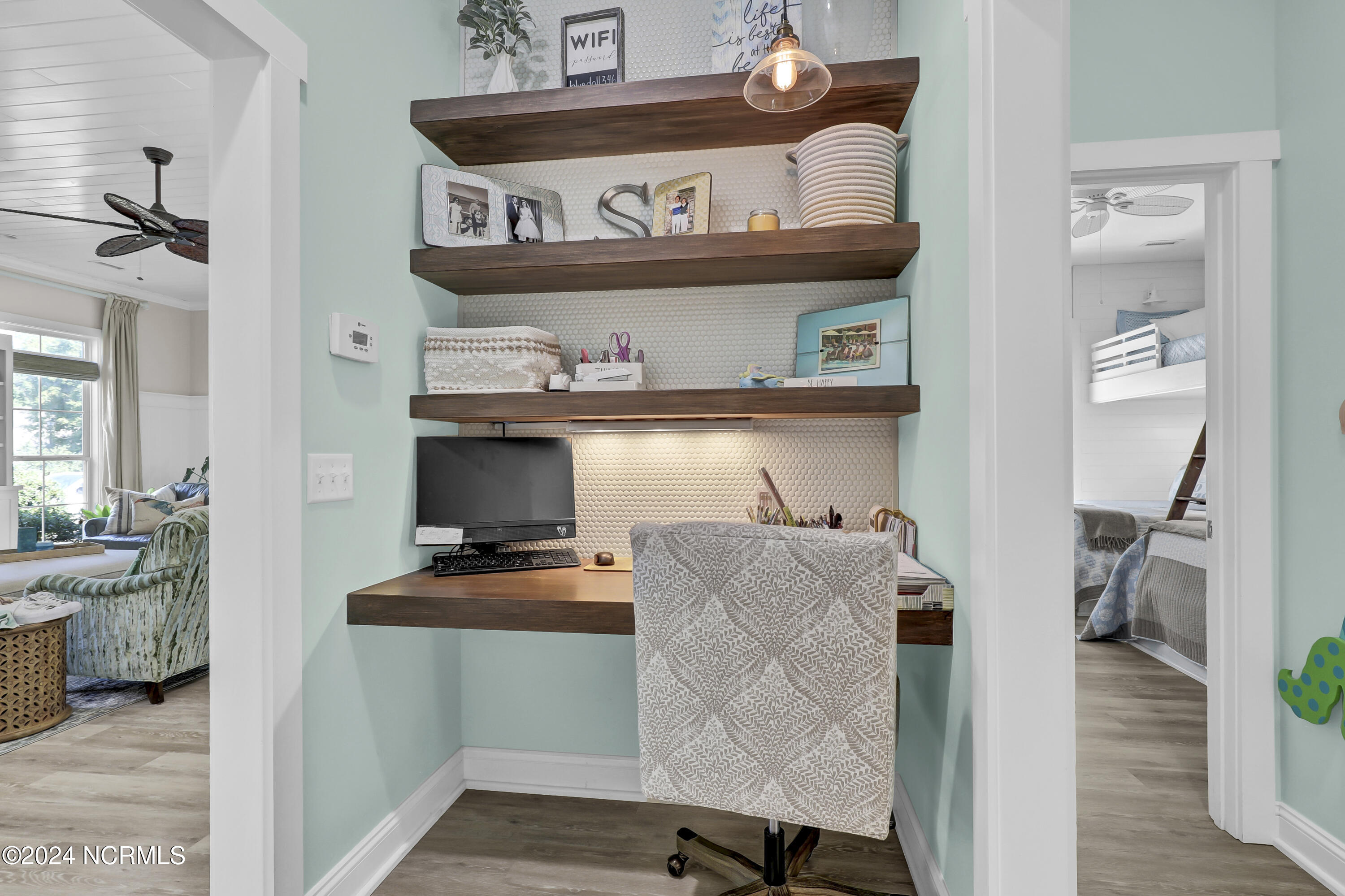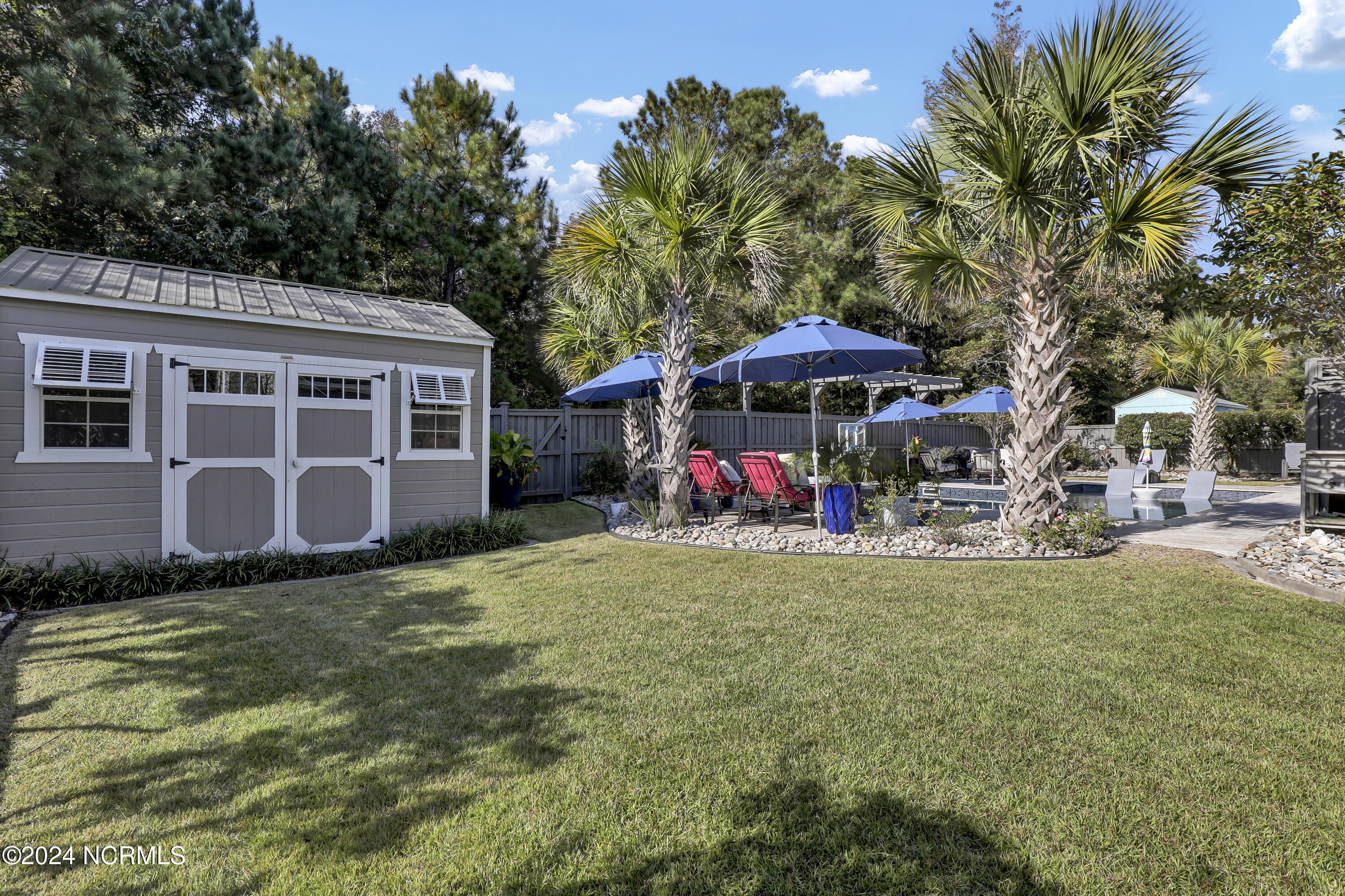 Welcome to this enchanted and custom-built gem by Chris Martin, surrounded by breath-taking landscaping; to include Zoysia Emerald grass and nestled in an upscale waterfront community on the edge of the coastal towns of Hampstead and Surf City. A Southern porch with an almost 100 year old antique double front door and exposed rafter tails serves as a focal point and beckons you to sit on your swing and gather with friends and neighbors. You will be blown away with the craftsmanship and detailed trim work with each step. As you enter the grand foyer, you will immediately notice gorgeous LVP floors installed throughout the entire main home. Elegant Emtek crystal doorknobs, 8' interior doors and transom windows with custom motorized blinds and custom-made drapes further highlight the aesthetic appeal. A large and bright living room with built-ins, board & batten design on the walls and tongue & groove ceiling which welcomes you and feels as though it was made for cozy evenings around a fireplace with a nice glass of wine, reading your favorite author, playing family games, conducting deep conversations or just watching movies. The open concept connects the living room with a dining room and a kitchen. The dining room awaits the new owners to host their holiday meals and overlooks a gourmet kitchen which offers custom built executive cabinetry with a soft closing system which provides a wealth of storage space, glistening Carrera marble counter tops, a custom walnut block 7' long island, Shaw fireclay farm sink, stainless-steel appliances, Italian 6-burner Bertazzoni gas stove, 2 ovens & griddle, custom open shelving and a pantry with wooden shelves and coffee area and recently professionally wallpapered. This kitchen will please every chef and make any cooking experience much more enjoyable.