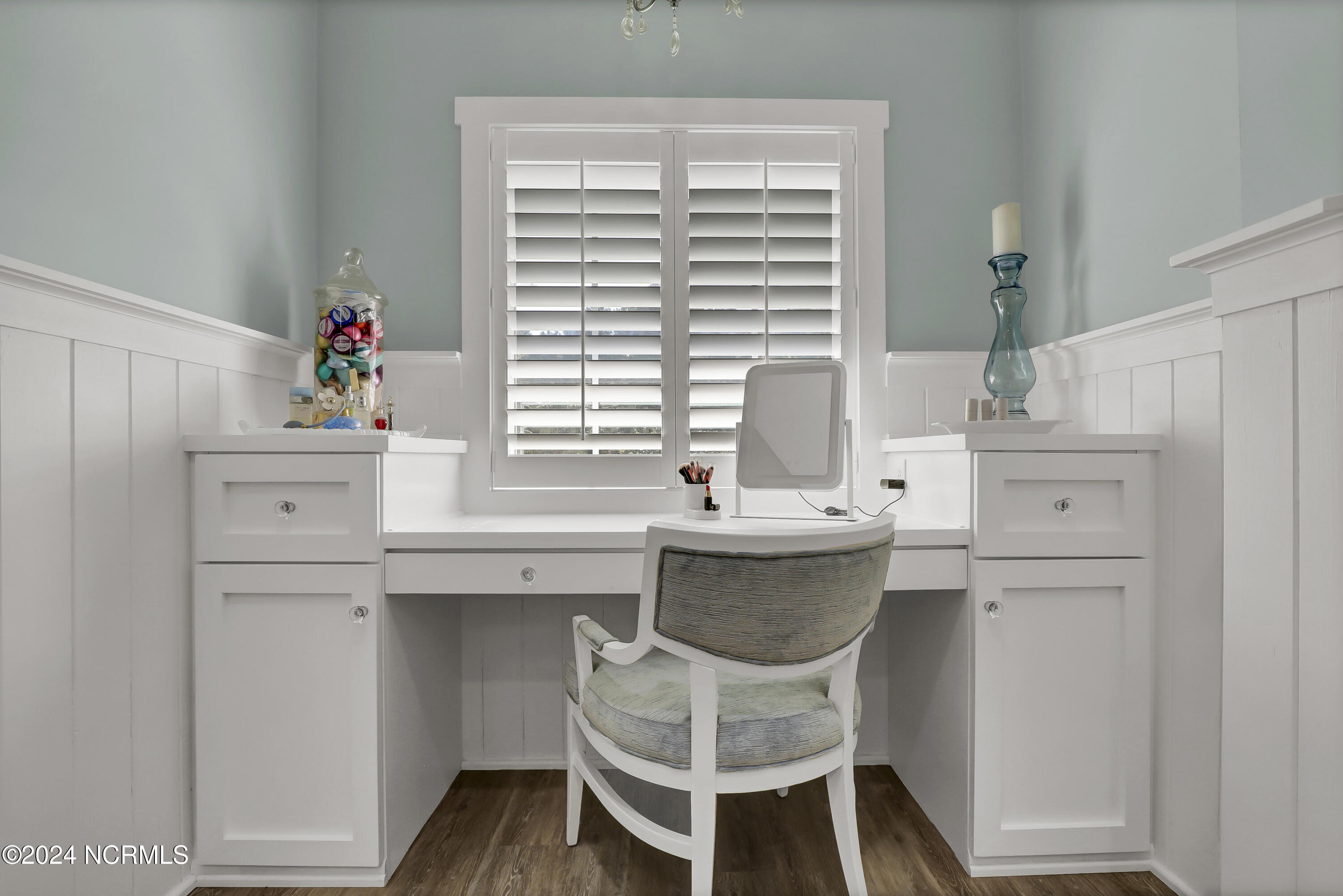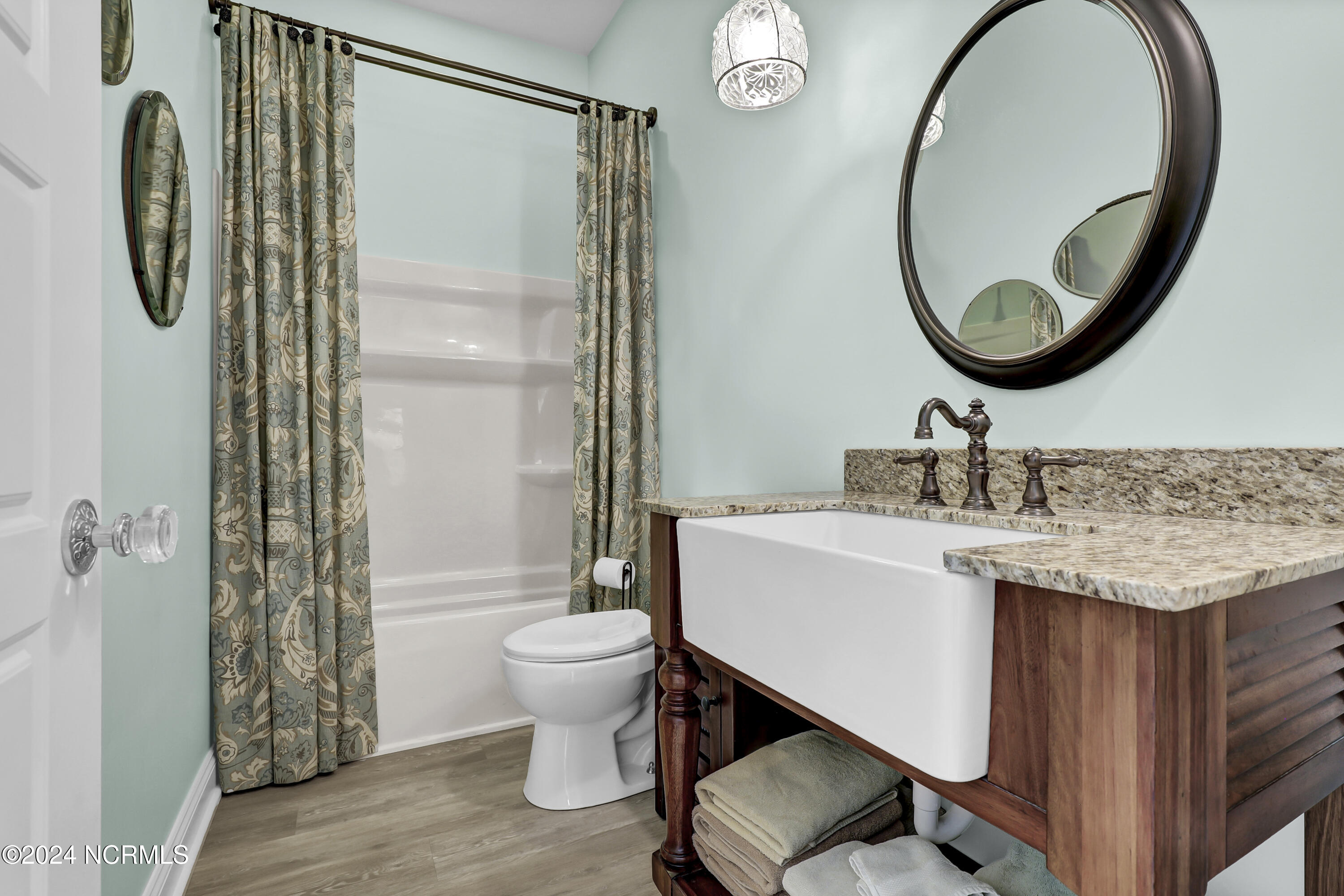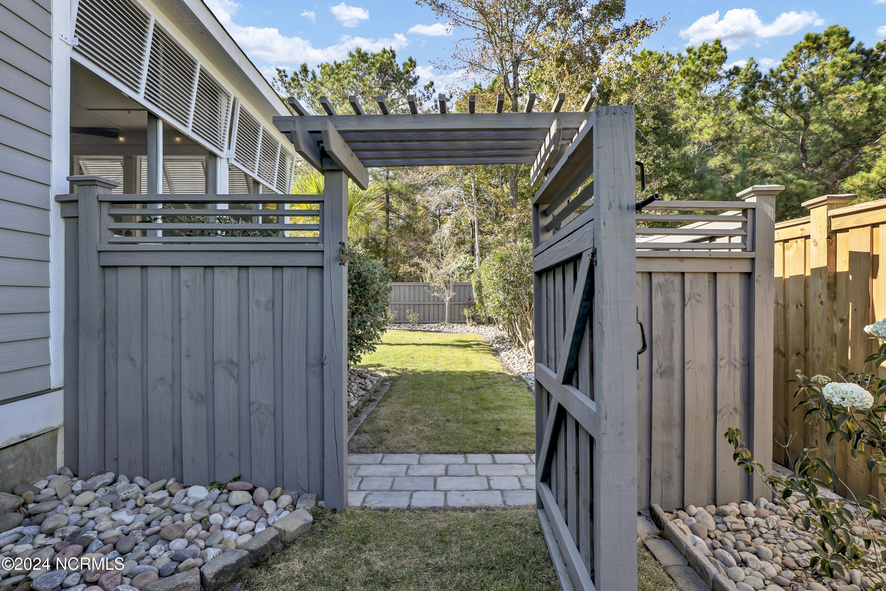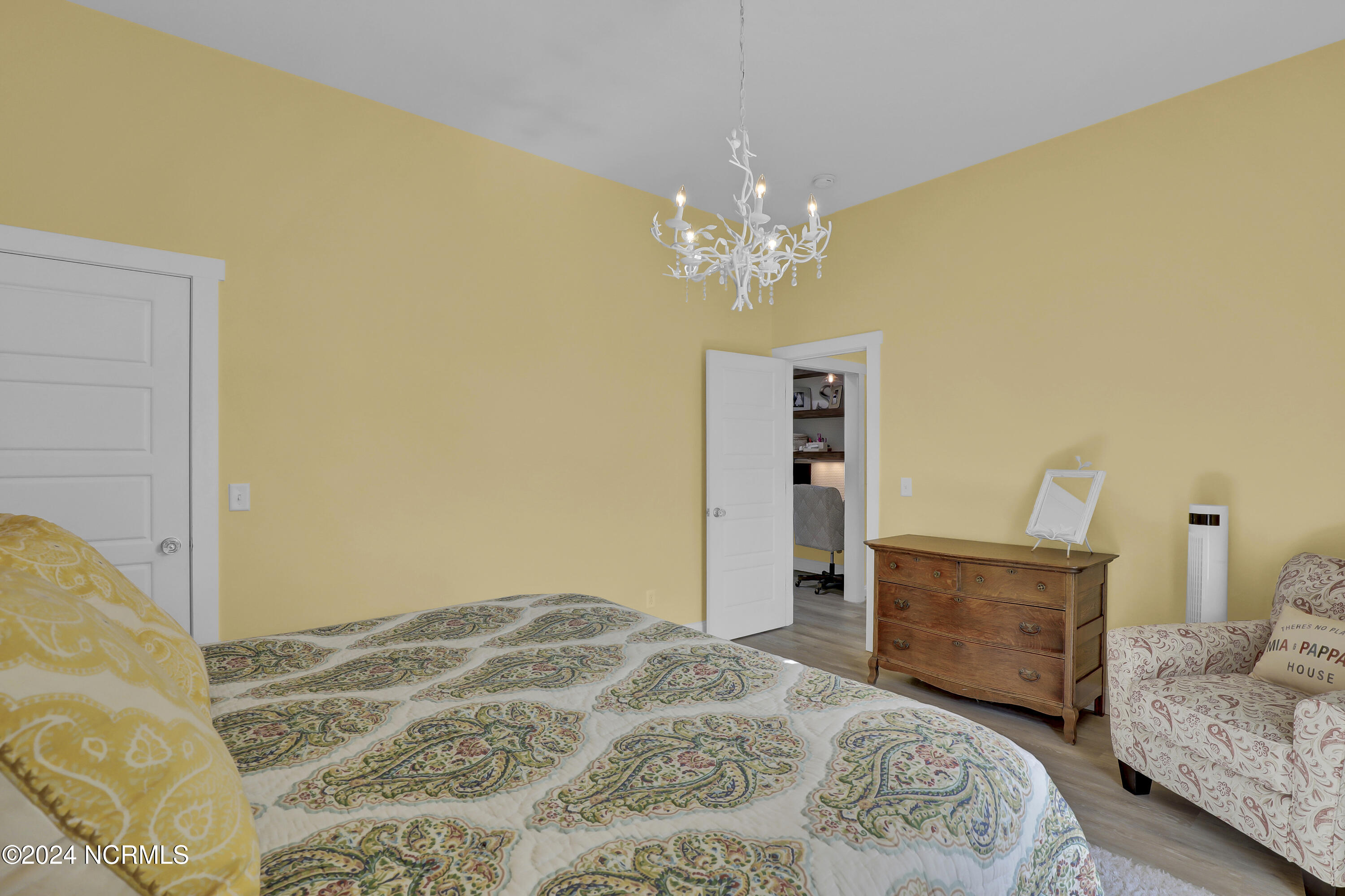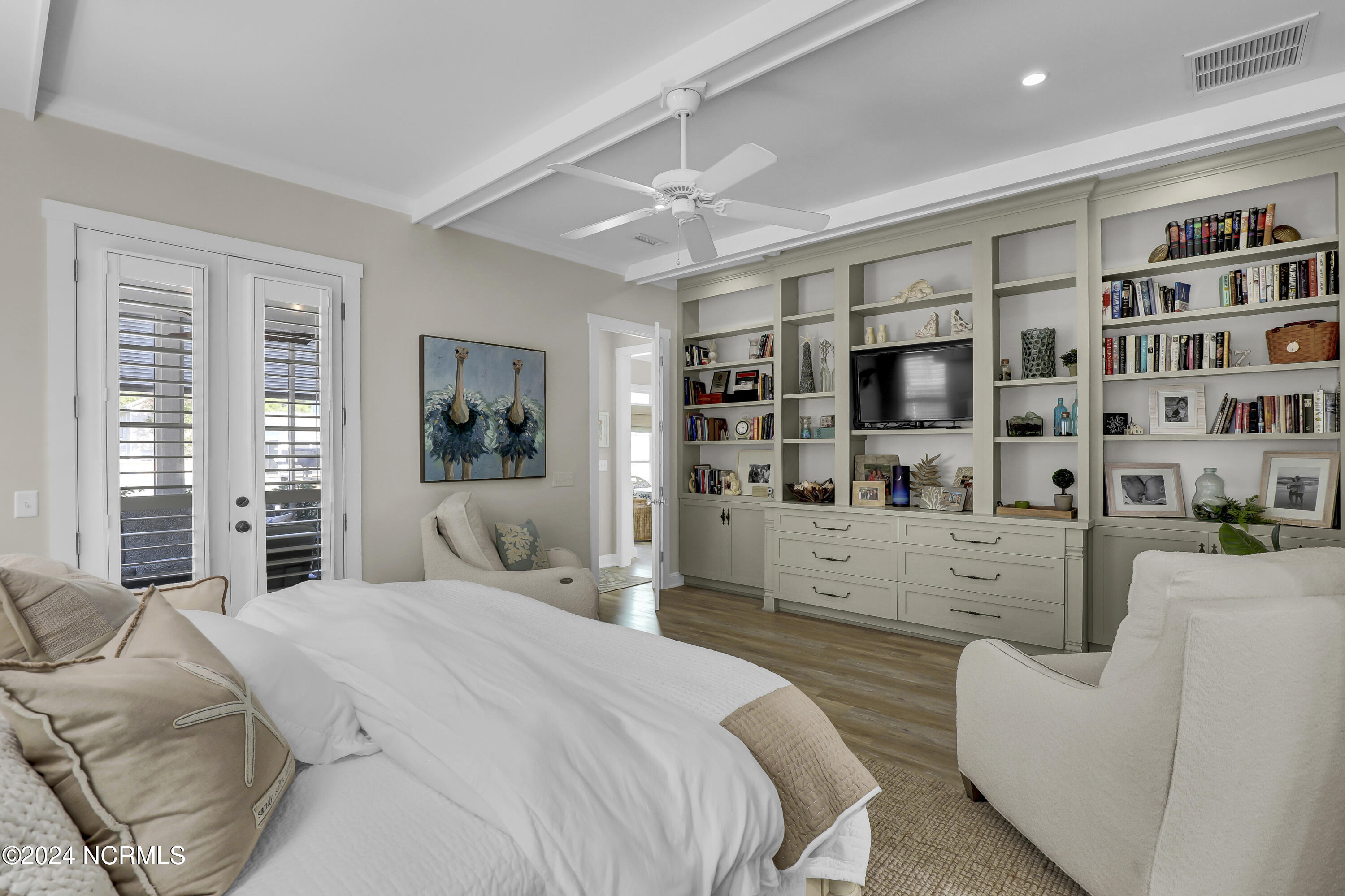 Welcome to this enchanted and custom-built gem by Chris Martin, surrounded by breath-taking landscaping; to include Zoysia Emerald grass and nestled in an upscale waterfront community on the edge of the coastal towns of Hampstead and Surf City. A Southern porch with an almost 100 year old antique double front door and exposed rafter tails serves as a focal point and beckons you to sit on your swing and gather with friends and neighbors. You will be blown away with the craftsmanship and detailed trim work with each step. As you enter the grand foyer, you will immediately notice gorgeous LVP floors installed throughout the entire main home. Elegant Emtek crystal doorknobs, 8' interior doors and transom windows with custom motorized blinds and custom-made drapes further highlight the aesthetic appeal. A large and bright living room with built-ins, board & batten design on the walls and tongue & groove ceiling which welcomes you and feels as though it was made for cozy evenings around a fireplace with a nice glass of wine, reading your favorite author, playing family games, conducting deep conversations or just watching movies. The open concept connects the living room with a dining room and a kitchen. The dining room awaits the new owners to host their holiday meals and overlooks a gourmet kitchen which offers custom built executive cabinetry with a soft closing system which provides a wealth of storage space, glistening Carrera marble counter tops, a custom walnut block 7' long island, Shaw fireclay farm sink, stainless-steel appliances, Italian 6-burner Bertazzoni gas stove, 2 ovens & griddle, custom open shelving and a pantry with wooden shelves and coffee area and recently professionally wallpapered. This kitchen will please every chef and make any cooking experience much more enjoyable.
