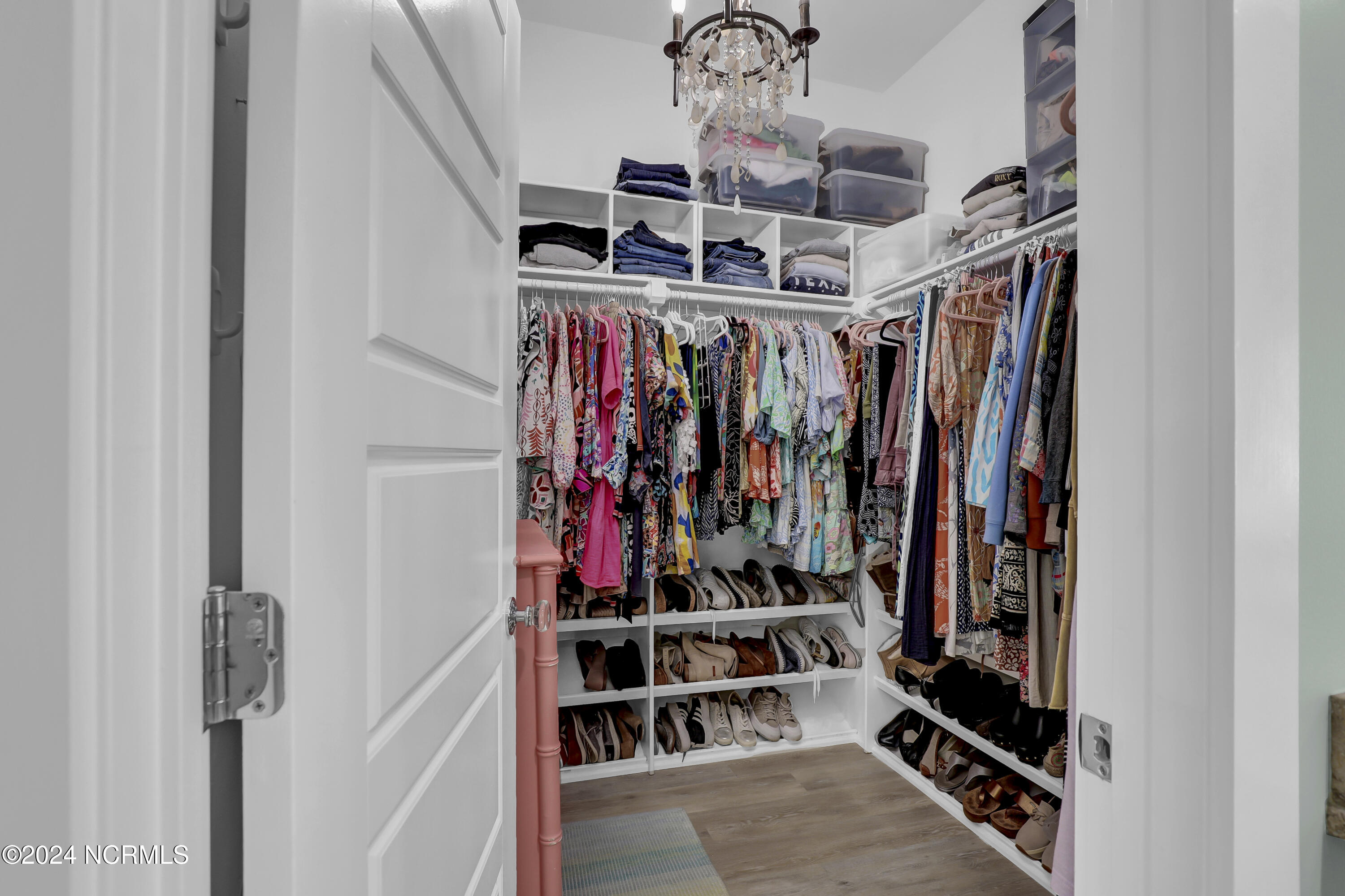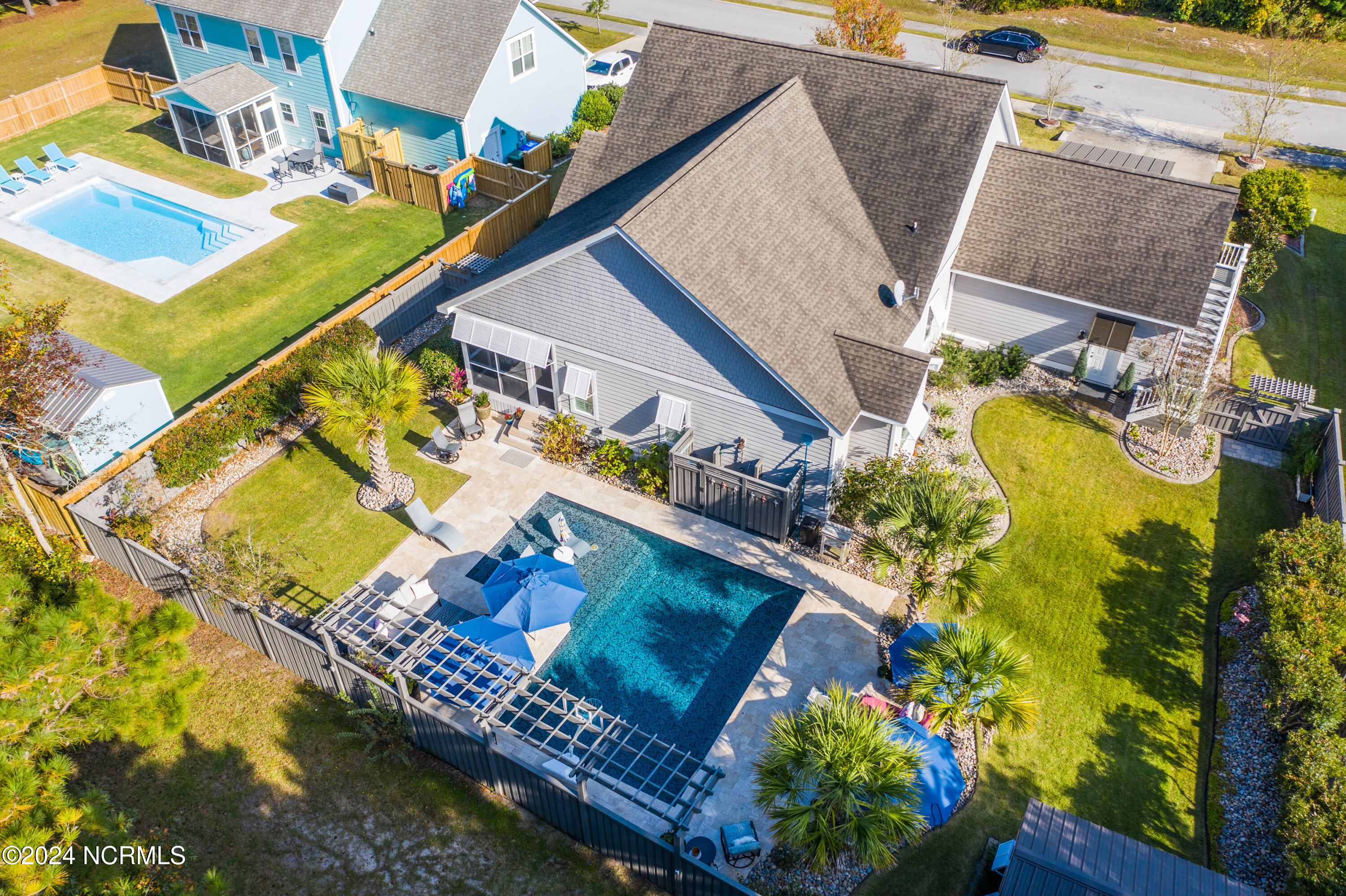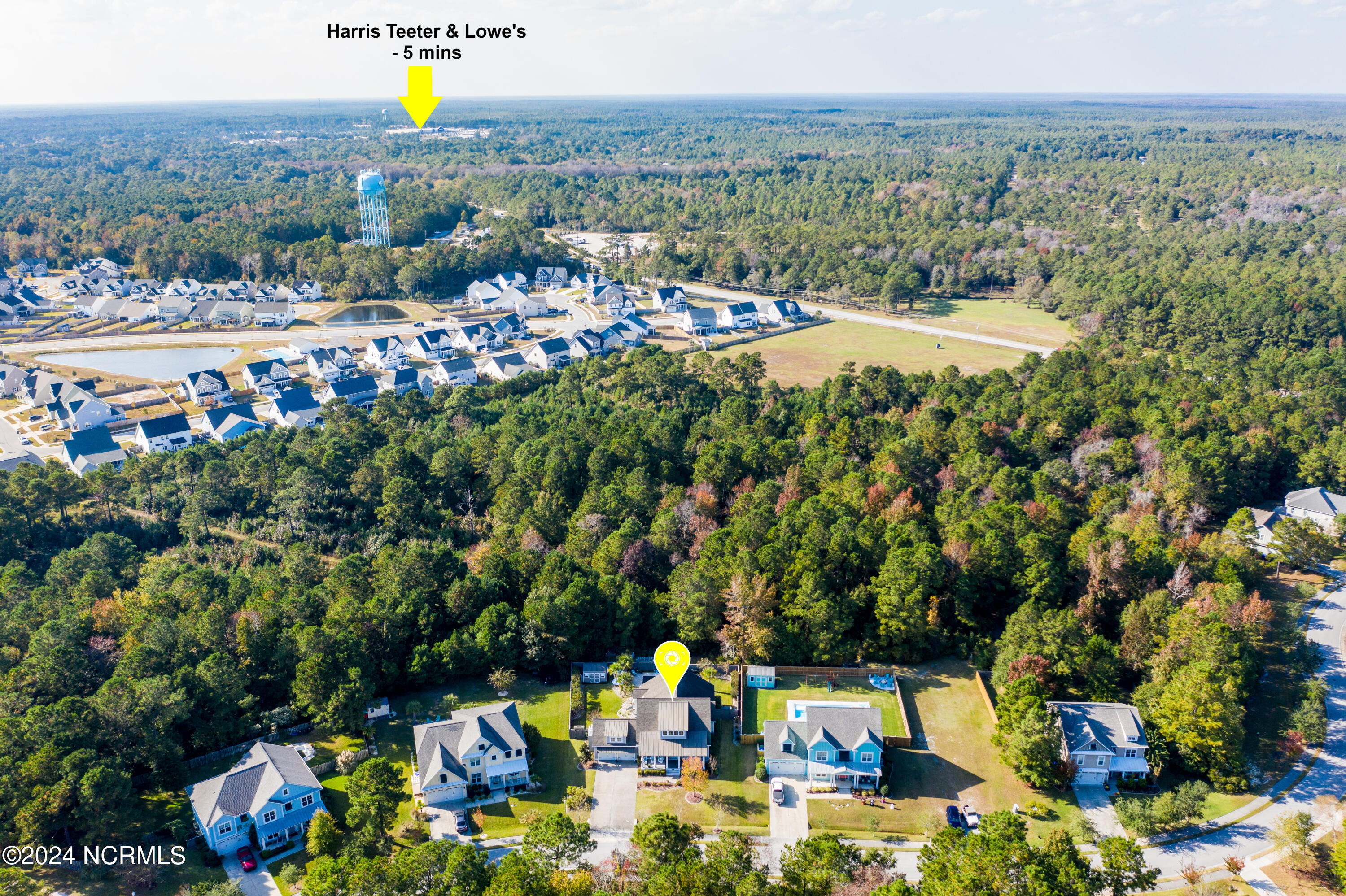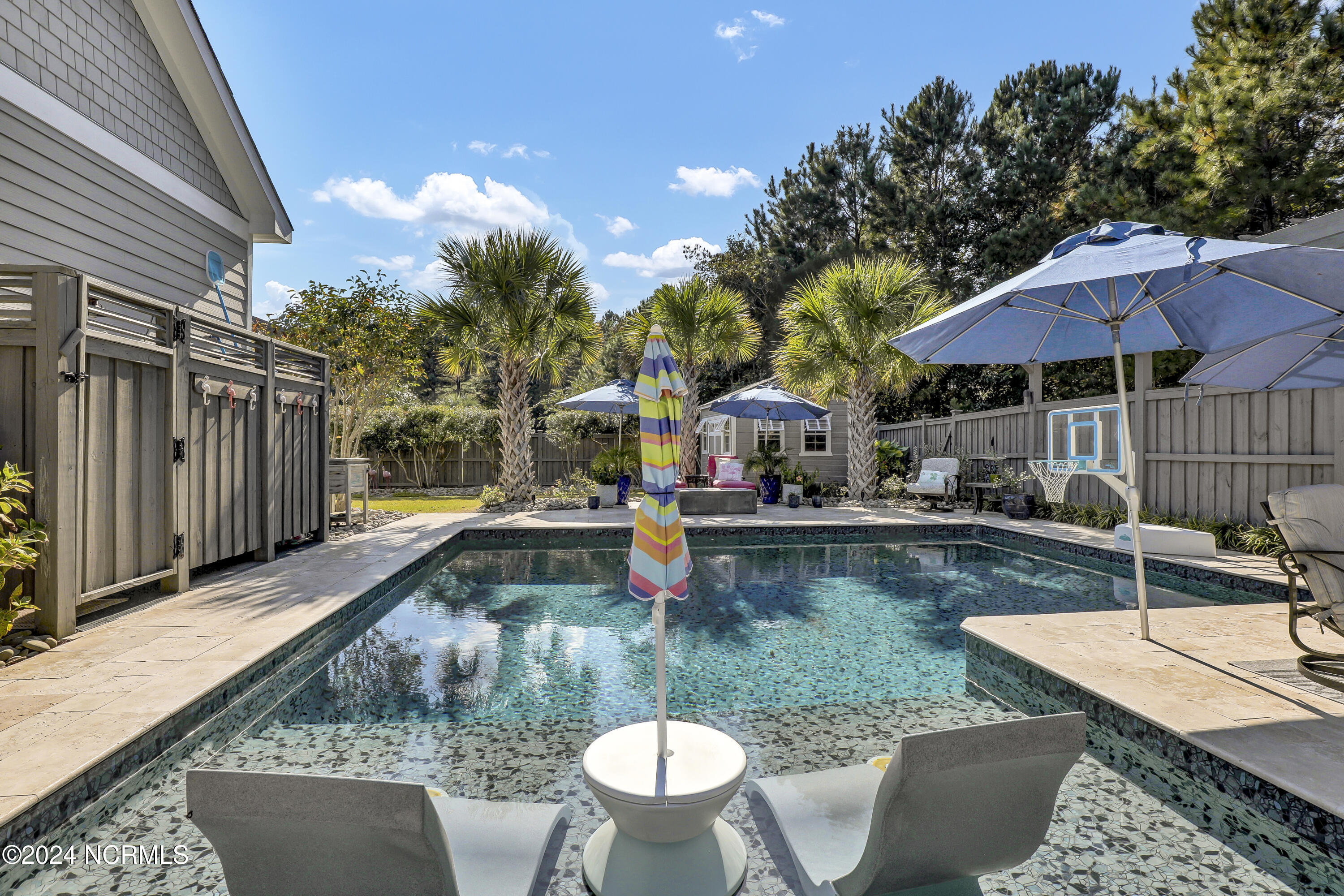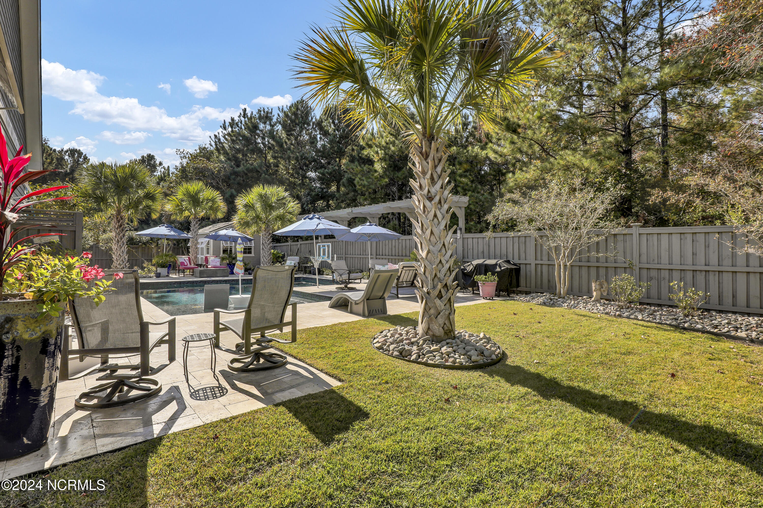 Welcome to this enchanted and custom-built gem by Chris Martin, surrounded by breath-taking landscaping; to include Zoysia Emerald grass and nestled in an upscale waterfront community on the edge of the coastal towns of Hampstead and Surf City. A Southern porch with an almost 100 year old antique double front door and exposed rafter tails serves as a focal point and beckons you to sit on your swing and gather with friends and neighbors. You will be blown away with the craftsmanship and detailed trim work with each step. As you enter the grand foyer, you will immediately notice gorgeous LVP floors installed throughout the entire main home. Elegant Emtek crystal doorknobs, 8' interior doors and transom windows with custom motorized blinds and custom-made drapes further highlight the aesthetic appeal. A large and bright living room with built-ins, board & batten design on the walls and tongue & groove ceiling which welcomes you and feels as though it was made for cozy evenings around a fireplace with a nice glass of wine, reading your favorite author, playing family games, conducting deep conversations or just watching movies. The open concept connects the living room with a dining room and a kitchen. The dining room awaits the new owners to host their holiday meals and overlooks a gourmet kitchen which offers custom built executive cabinetry with a soft closing system which provides a wealth of storage space, glistening Carrera marble counter tops, a custom walnut block 7' long island, Shaw fireclay farm sink, stainless-steel appliances, Italian 6-burner Bertazzoni gas stove, 2 ovens & griddle, custom open shelving and a pantry with wooden shelves and coffee area and recently professionally wallpapered. This kitchen will please every chef and make any cooking experience much more enjoyable.
