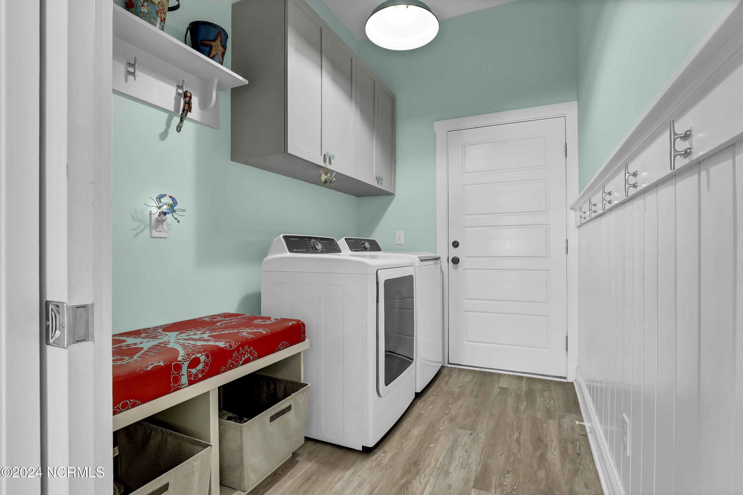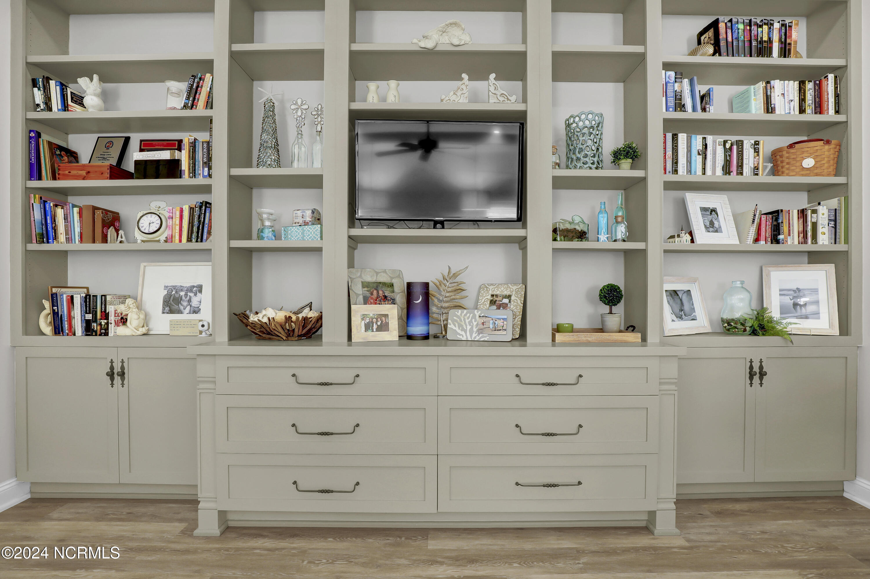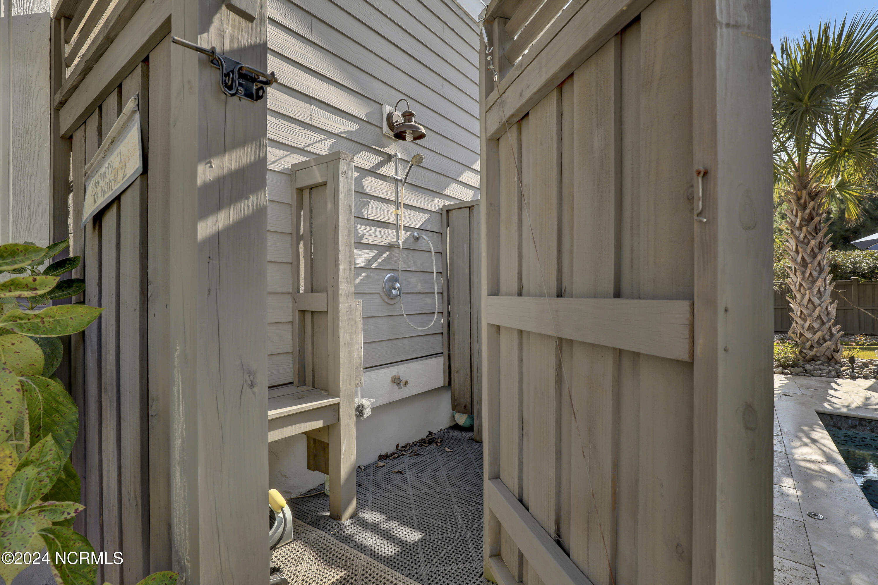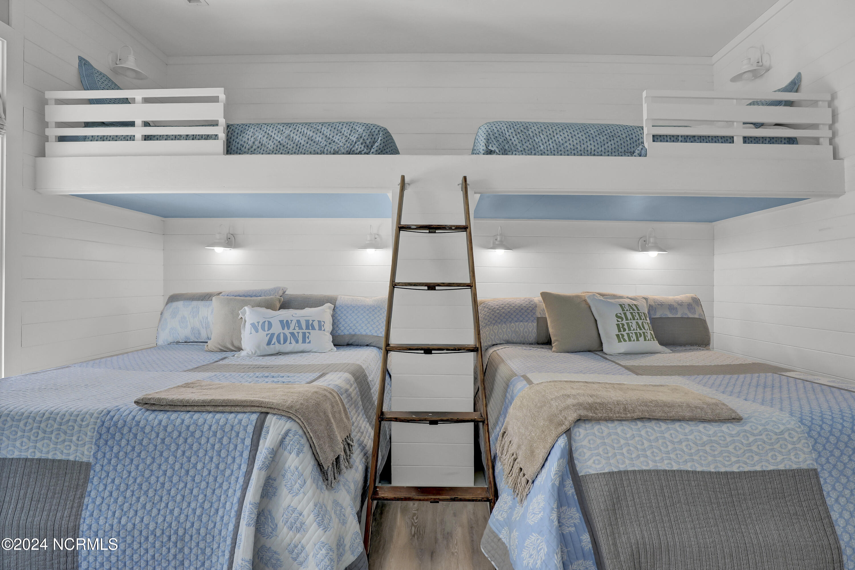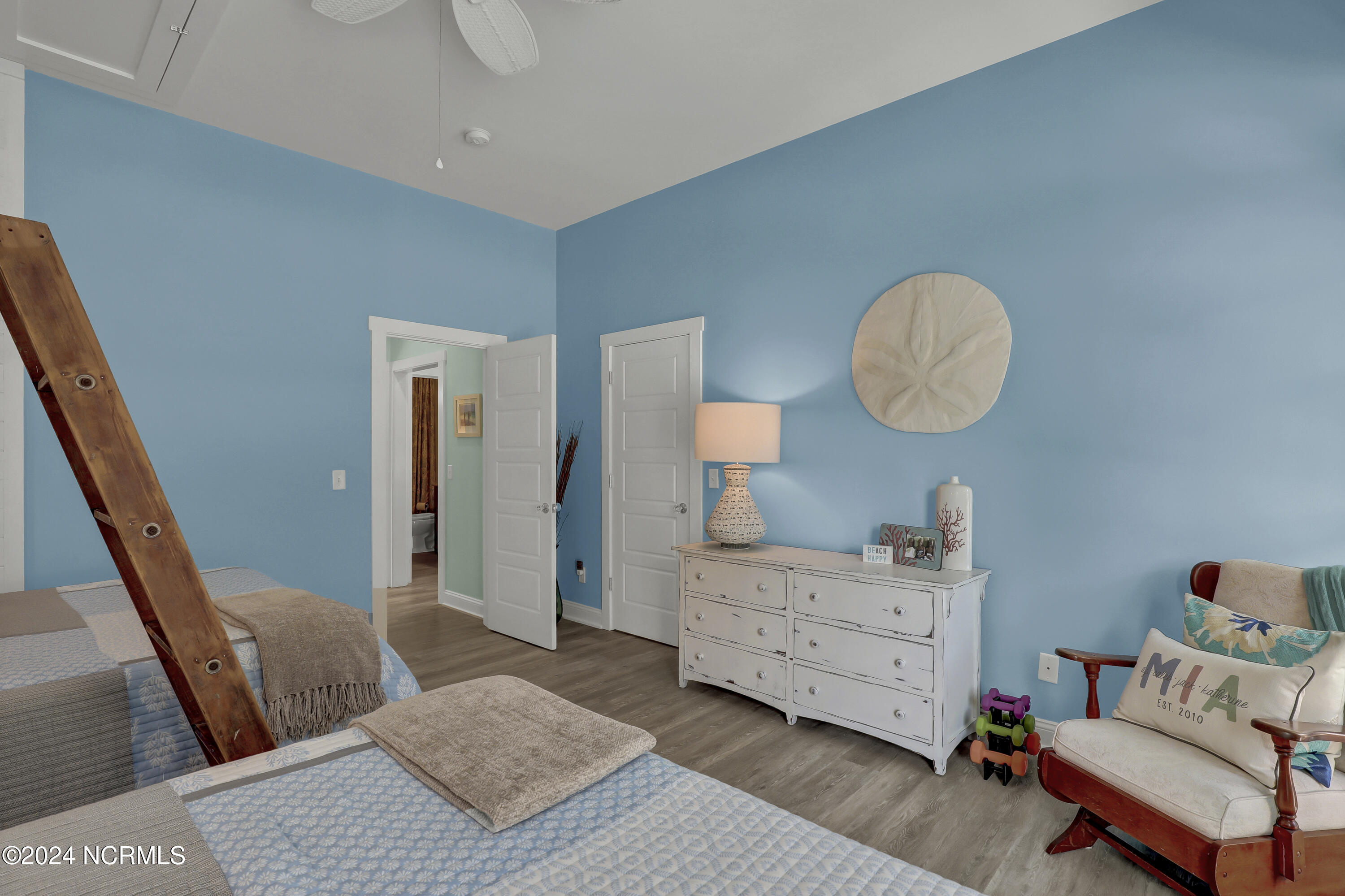 Welcome to this enchanted and custom-built gem by Chris Martin, surrounded by breath-taking landscaping; to include Zoysia Emerald grass and nestled in an upscale waterfront community on the edge of the coastal towns of Hampstead and Surf City. A Southern porch with an almost 100 year old antique double front door and exposed rafter tails serves as a focal point and beckons you to sit on your swing and gather with friends and neighbors. You will be blown away with the craftsmanship and detailed trim work with each step. As you enter the grand foyer, you will immediately notice gorgeous LVP floors installed throughout the entire main home. Elegant Emtek crystal doorknobs, 8' interior doors and transom windows with custom motorized blinds and custom-made drapes further highlight the aesthetic appeal. A large and bright living room with built-ins, board & batten design on the walls and tongue & groove ceiling which welcomes you and feels as though it was made for cozy evenings around a fireplace with a nice glass of wine, reading your favorite author, playing family games, conducting deep conversations or just watching movies. The open concept connects the living room with a dining room and a kitchen. The dining room awaits the new owners to host their holiday meals and overlooks a gourmet kitchen which offers custom built executive cabinetry with a soft closing system which provides a wealth of storage space, glistening Carrera marble counter tops, a custom walnut block 7' long island, Shaw fireclay farm sink, stainless-steel appliances, Italian 6-burner Bertazzoni gas stove, 2 ovens & griddle, custom open shelving and a pantry with wooden shelves and coffee area and recently professionally wallpapered. This kitchen will please every chef and make any cooking experience much more enjoyable.