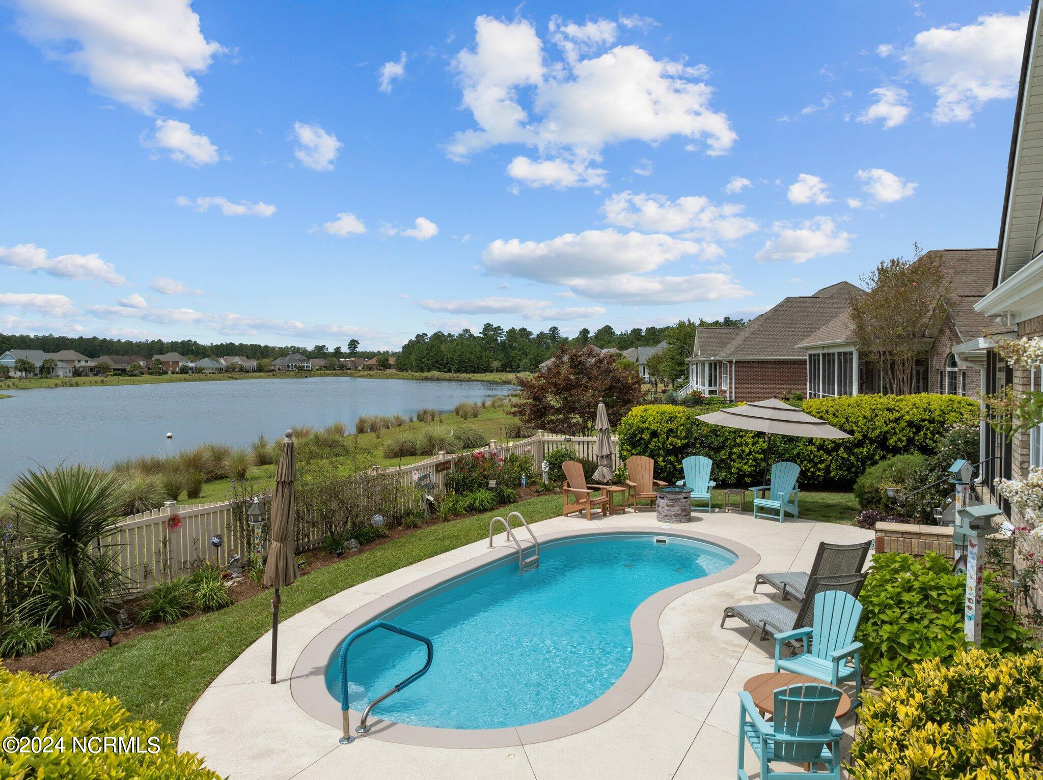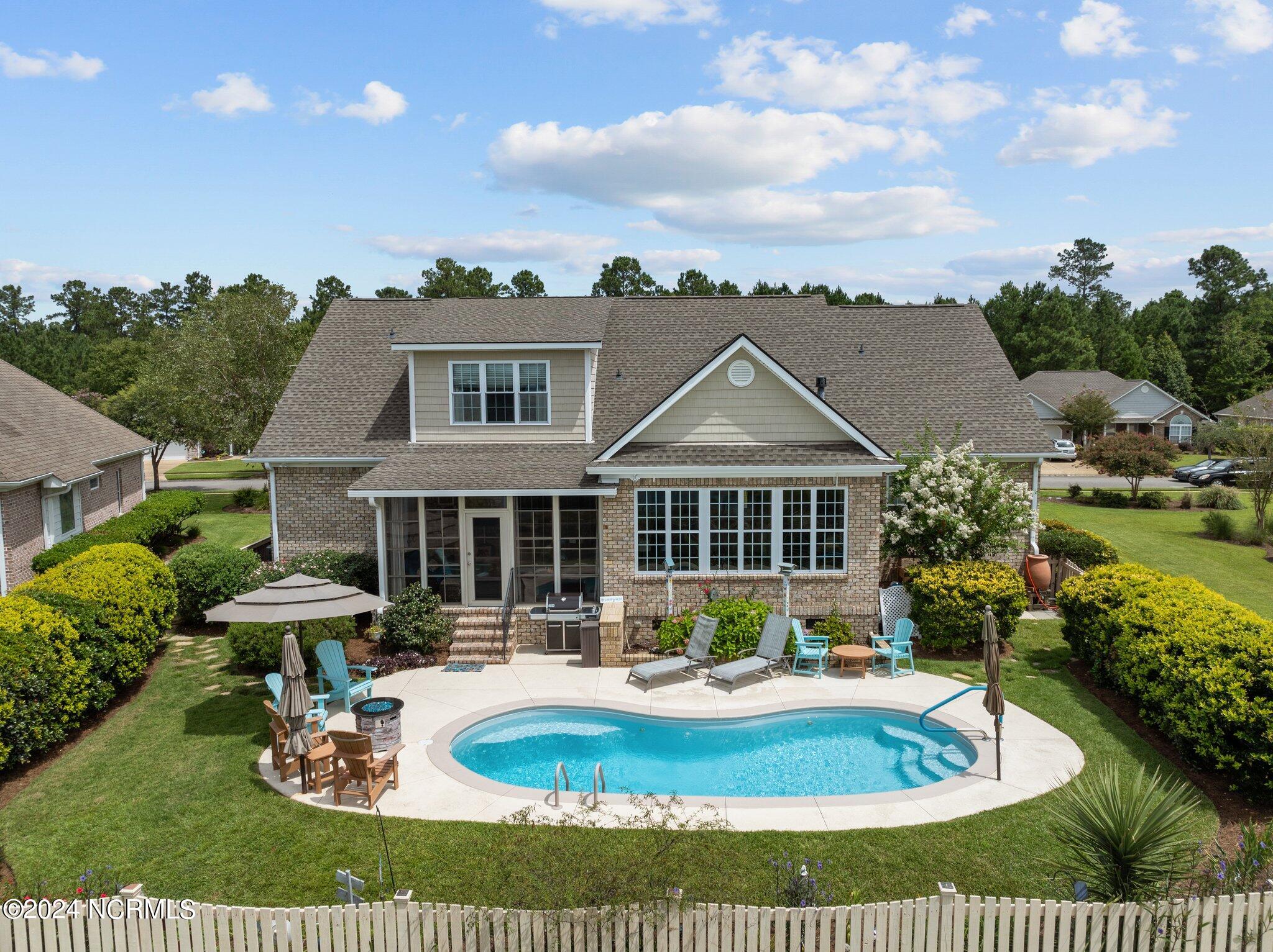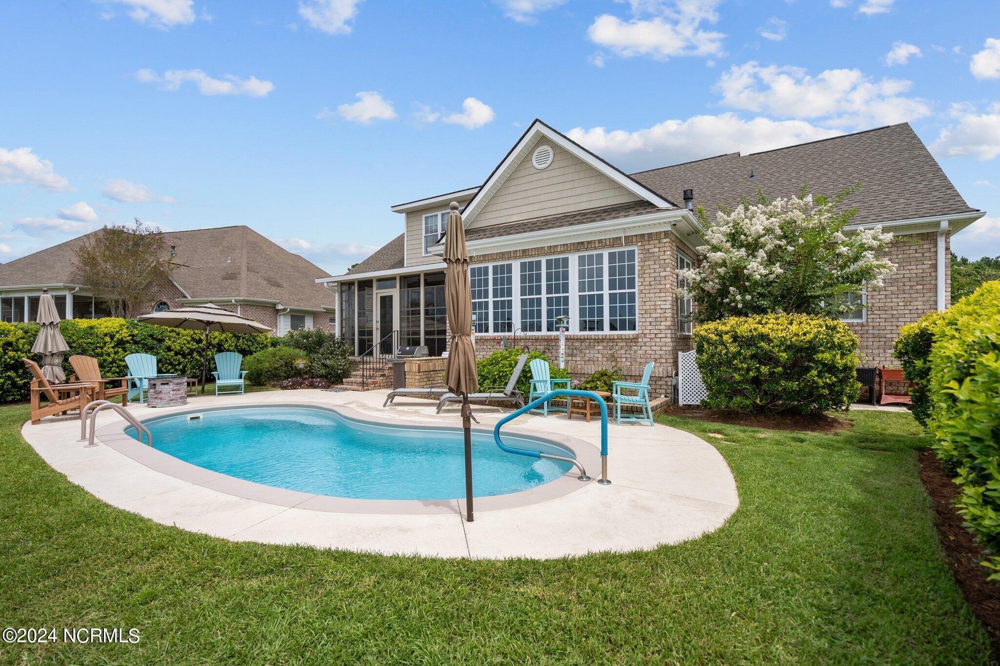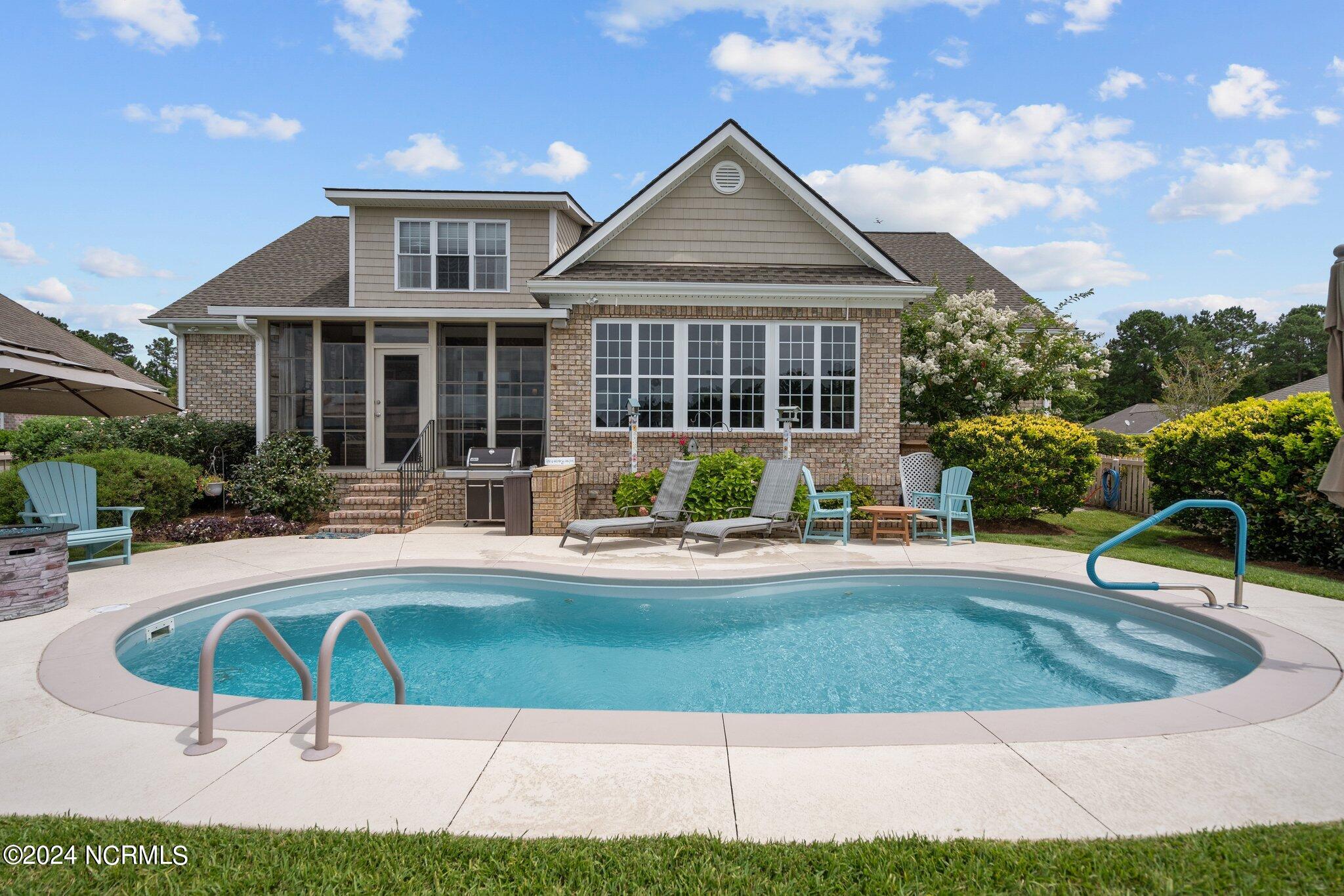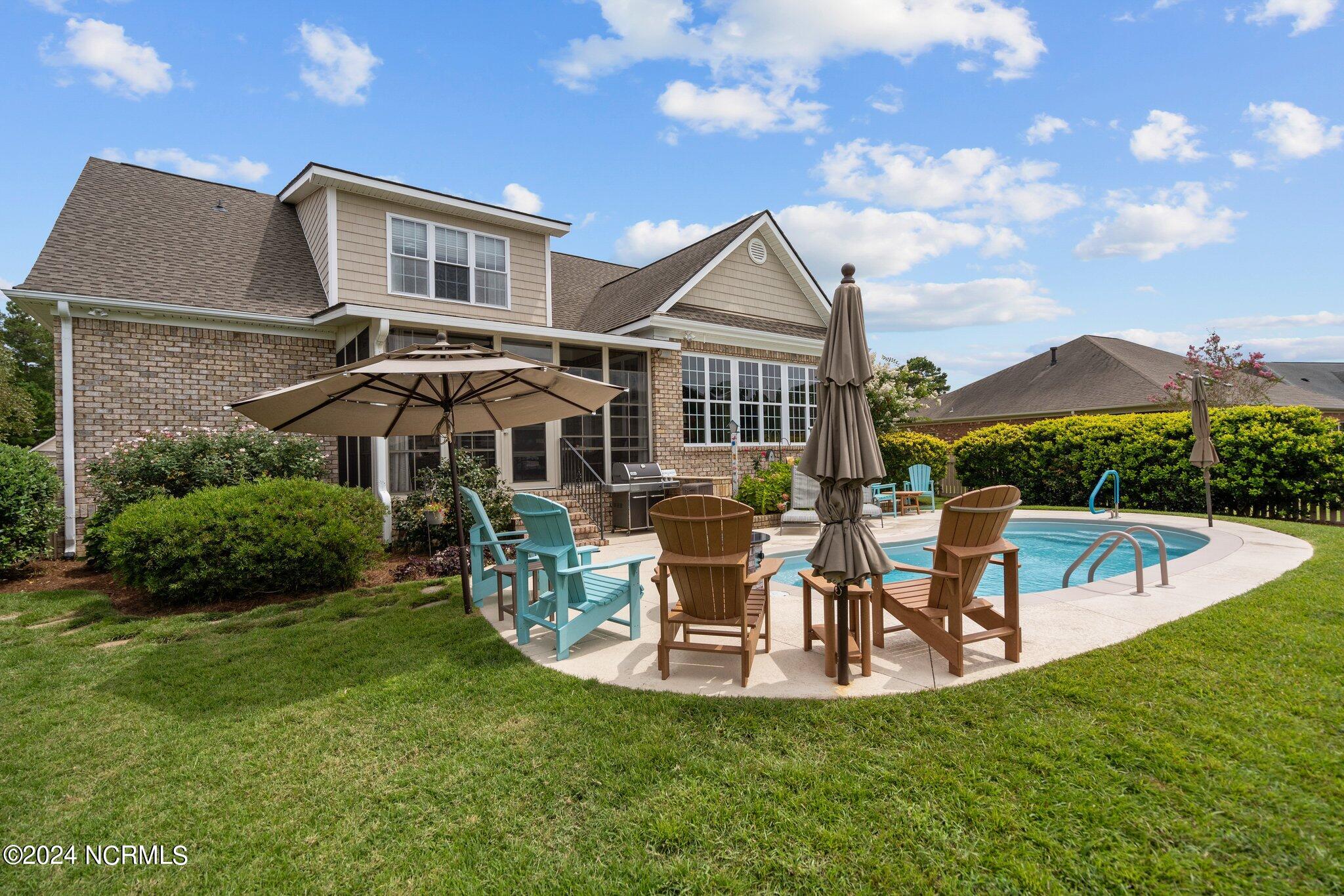 This meticulously maintained brick home features 5 spacious bedrooms and 3 luxurious baths. This can also be used as a 4 bedroom with a bonus room since the FROG is a flex space. Enjoy the elegance of a formal dining room for entertaining and a cozy breakfast nook for tea with friends. Natural light floods the interior, highlighting the exquisite granite countertops and stainless steel appliances, including a double oven, in the well-appointed kitchen. Relax on the EZE Breeze screened back porch, making this a 3 season room, while enjoying drinks with friends. Read a good book on the covered front porch or in the inviting sunroom that features elegant plantation shutters. The beautifully landscaped lawn and garden are complemented by an in-ground saltwater pool that offers serene views of the pond. The first floor master suite is a true retreat with dual vanities, a makeup table area, garden tub, and a separate glass shower. A large walk-in closet provides ample storage. Additionally, the home features an office or artist area that separates two of the bedrooms upstairs, offering versatile space for your needs. This gem boasts strand bamboo floors and luxury vinyl flooring. You'll be impressed with the combination of elegance and comfort with thoughtful design and attention to detail.