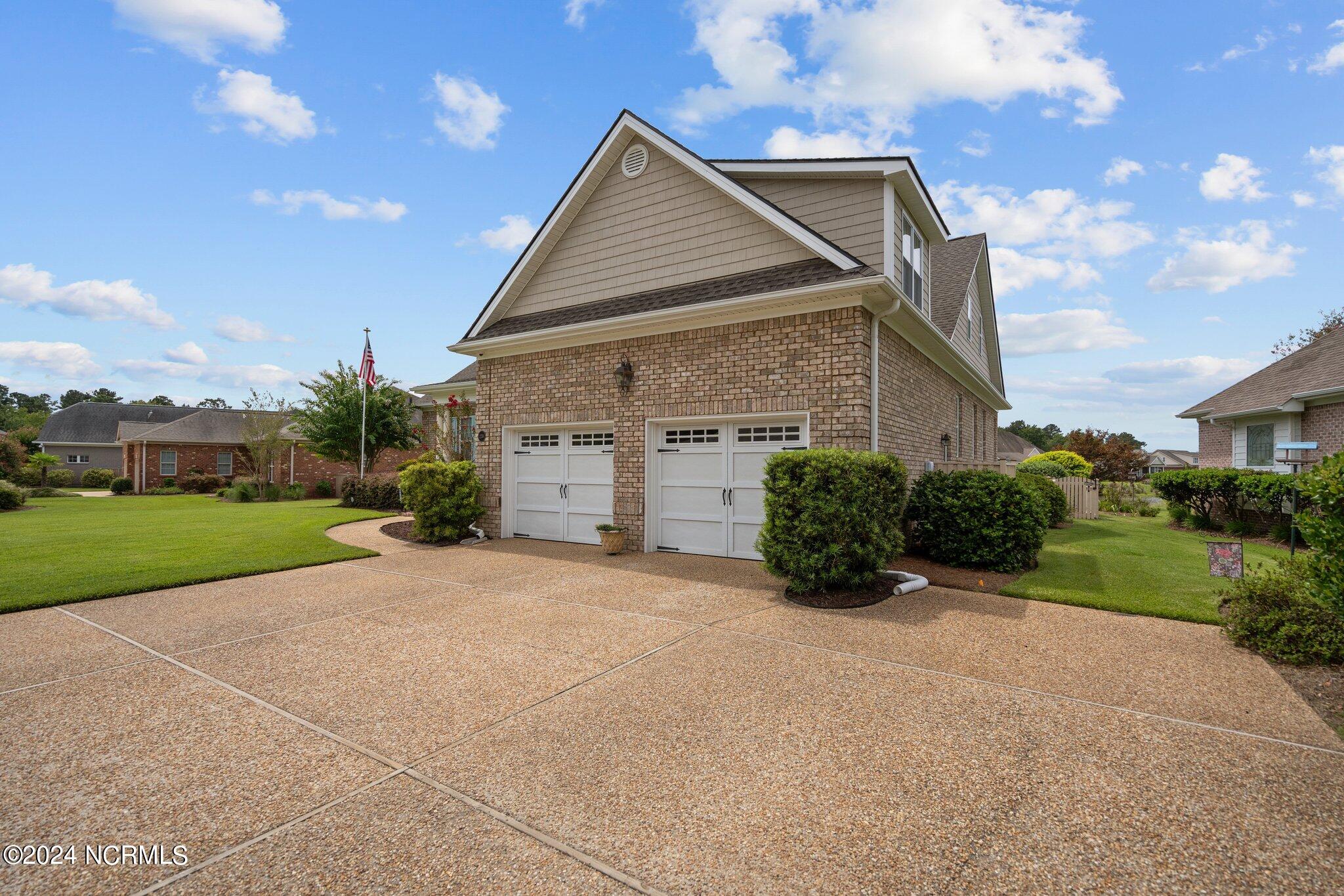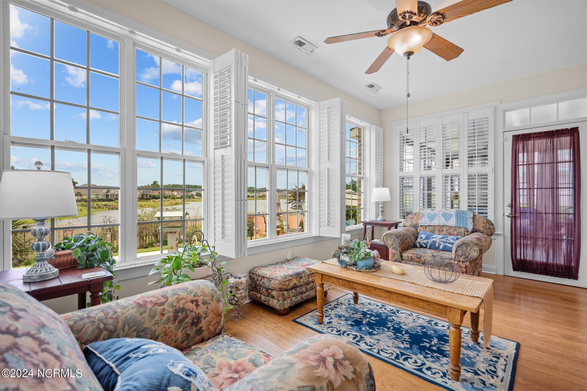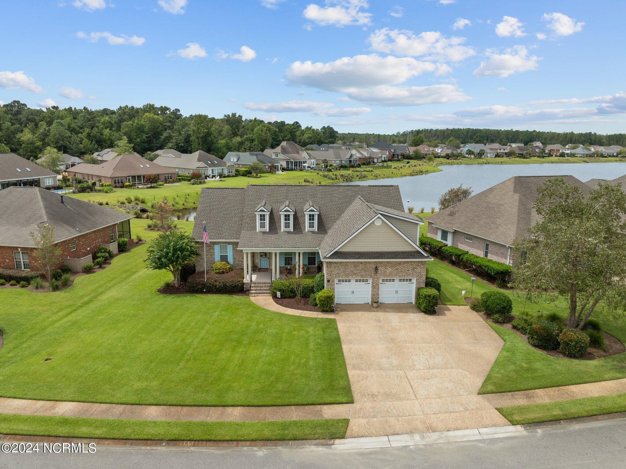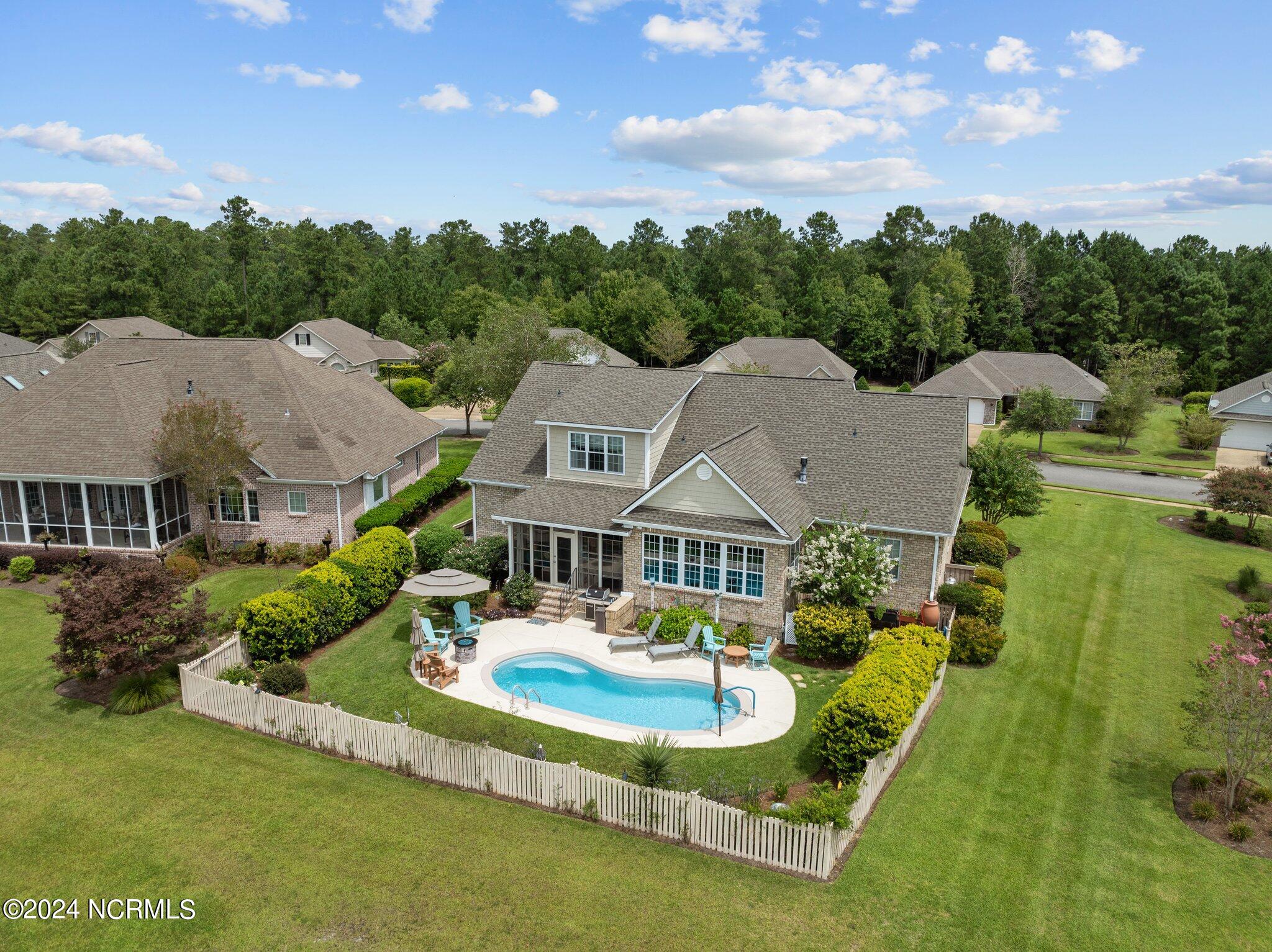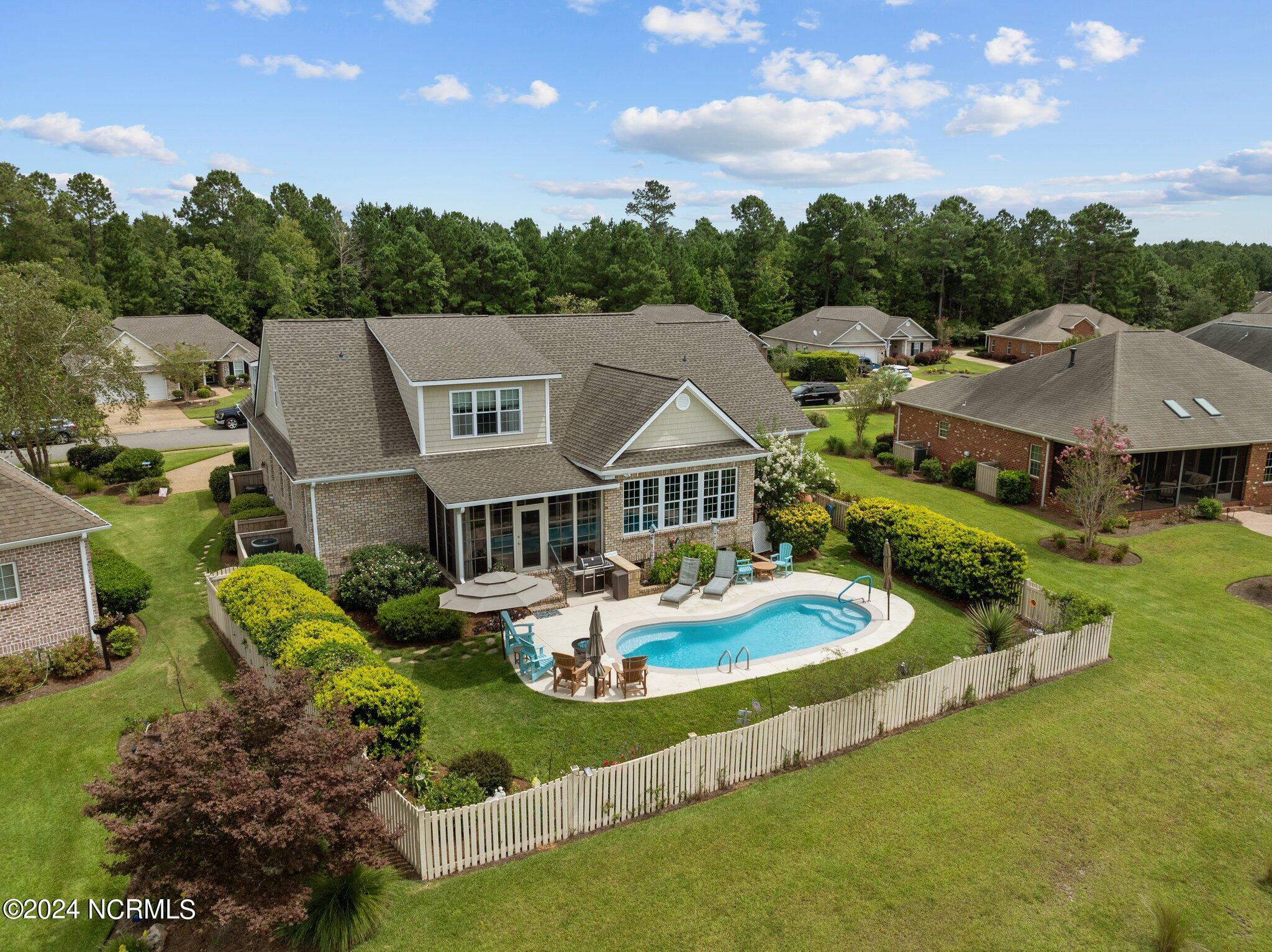 This meticulously maintained brick home features 5 spacious bedrooms and 3 luxurious baths. This can also be used as a 4 bedroom with a bonus room since the FROG is a flex space. Enjoy the elegance of a formal dining room for entertaining and a cozy breakfast nook for tea with friends. Natural light floods the interior, highlighting the exquisite granite countertops and stainless steel appliances, including a double oven, in the well-appointed kitchen. Relax on the EZE Breeze screened back porch, making this a 3 season room, while enjoying drinks with friends. Read a good book on the covered front porch or in the inviting sunroom that features elegant plantation shutters. The beautifully landscaped lawn and garden are complemented by an in-ground saltwater pool that offers serene views of the pond. The first floor master suite is a true retreat with dual vanities, a makeup table area, garden tub, and a separate glass shower. A large walk-in closet provides ample storage. Additionally, the home features an office or artist area that separates two of the bedrooms upstairs, offering versatile space for your needs. This gem boasts strand bamboo floors and luxury vinyl flooring. You'll be impressed with the combination of elegance and comfort with thoughtful design and attention to detail.