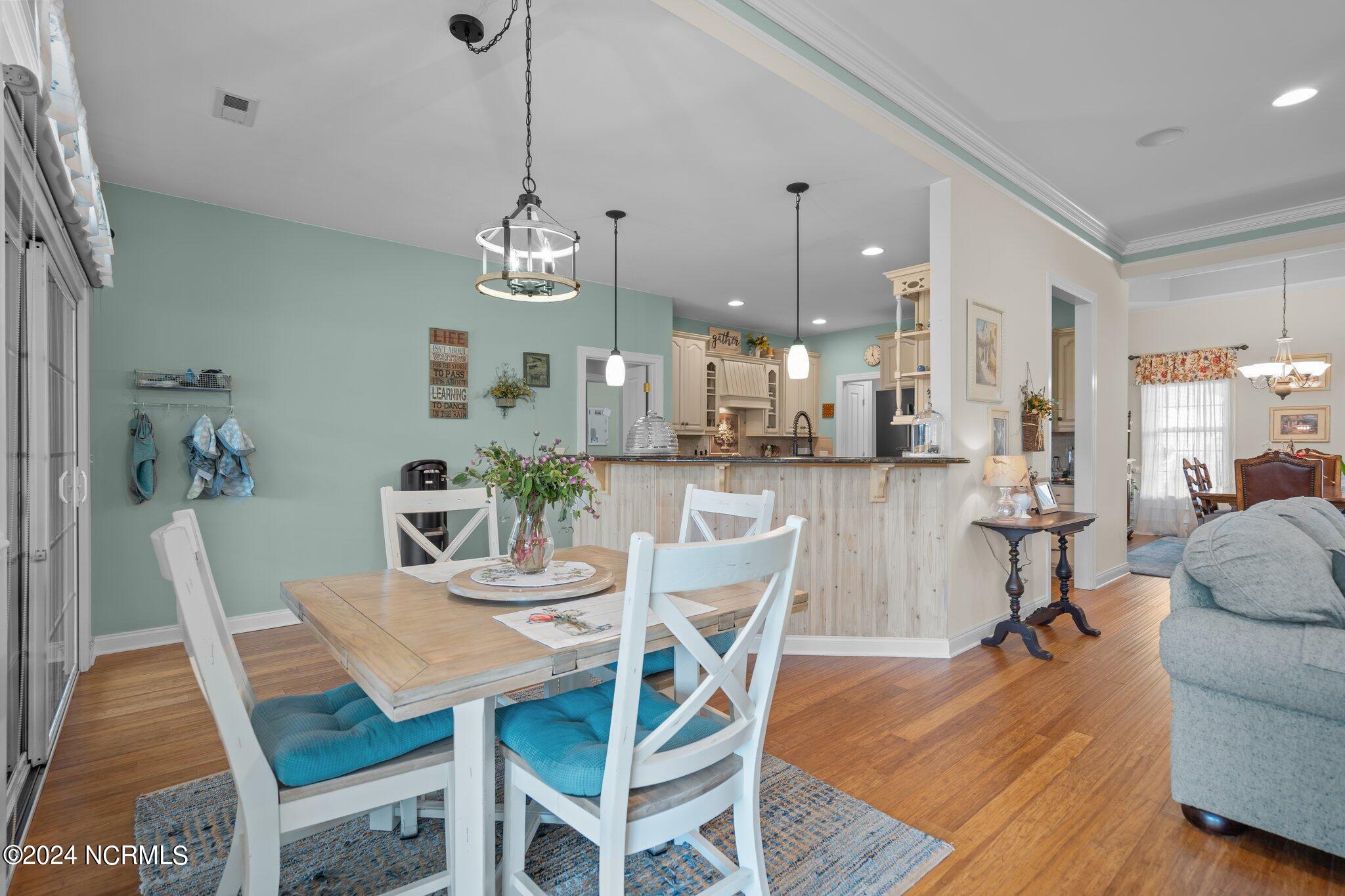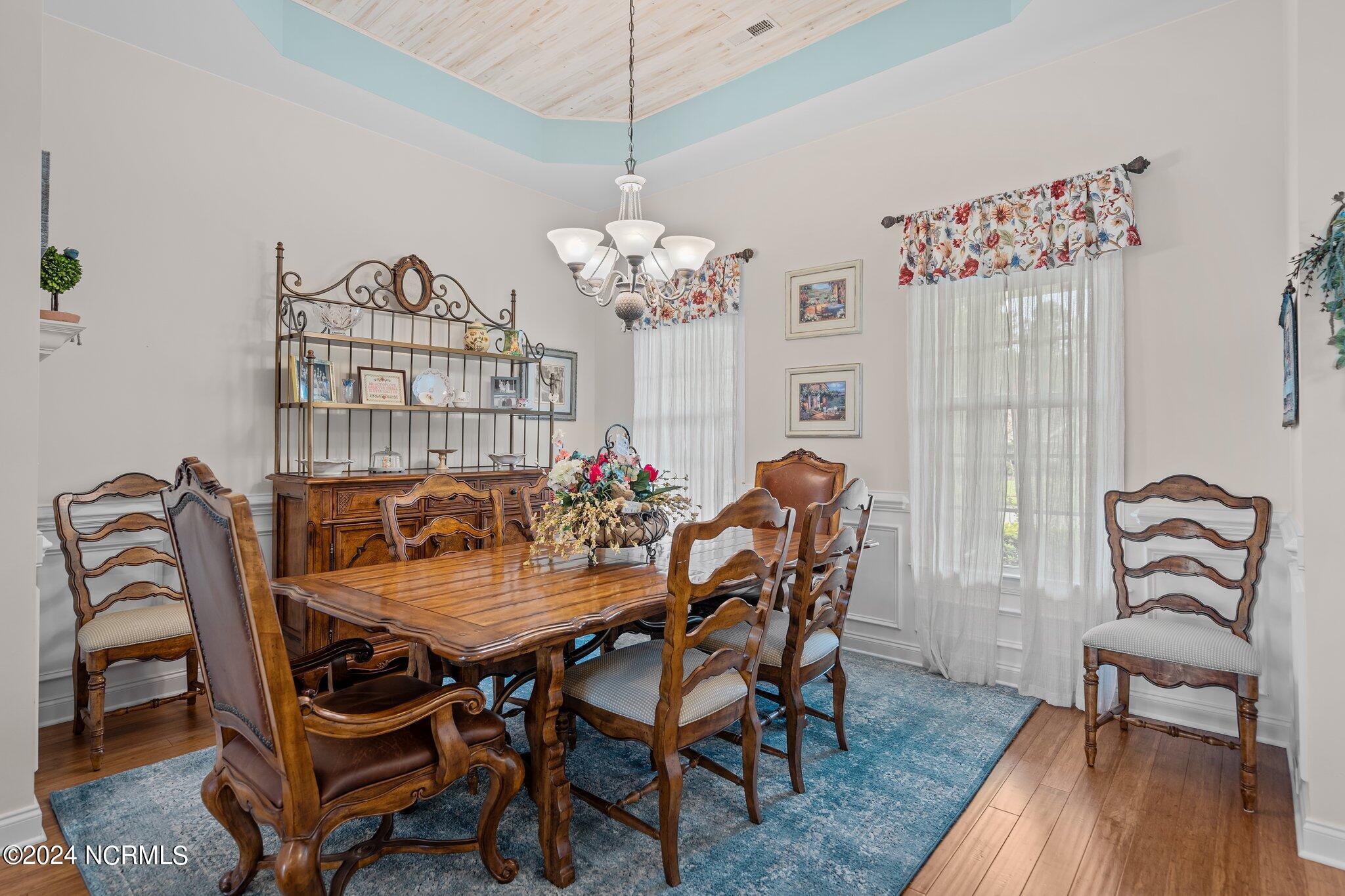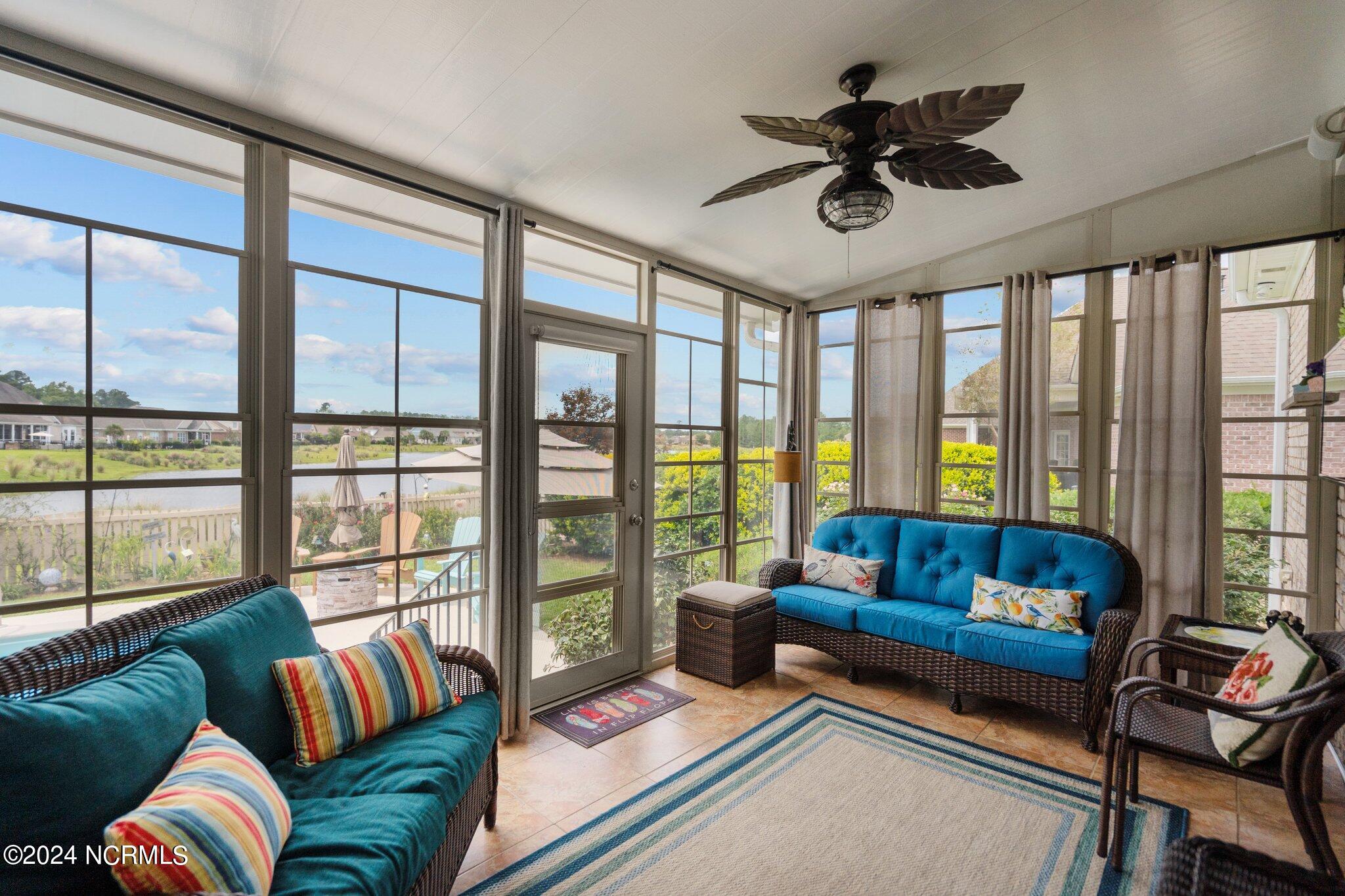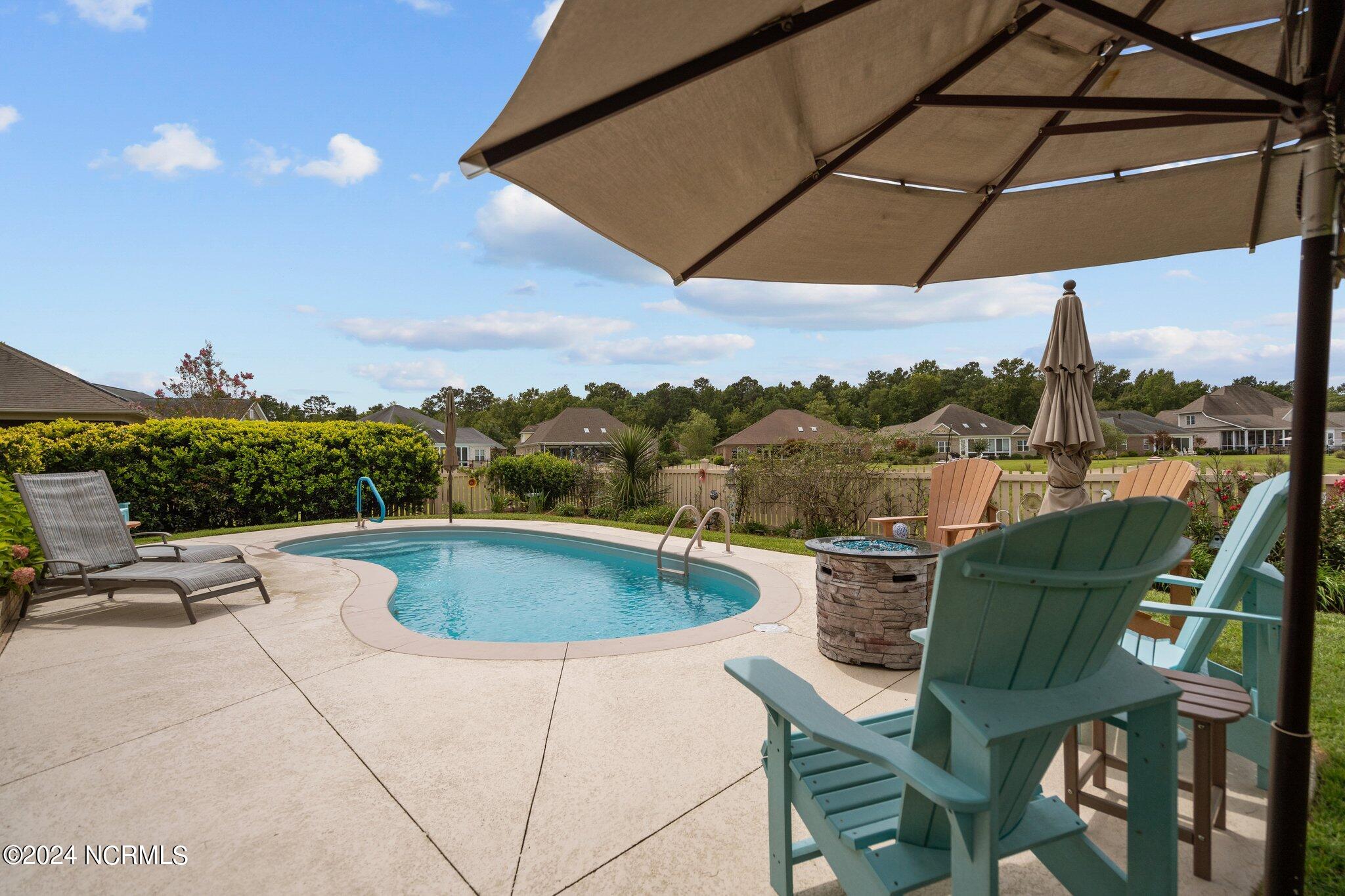 This meticulously maintained brick home features 5 spacious bedrooms and 3 luxurious baths. This can also be used as a 4 bedroom with a bonus room since the FROG is a flex space. Enjoy the elegance of a formal dining room for entertaining and a cozy breakfast nook for tea with friends. Natural light floods the interior, highlighting the exquisite granite countertops and stainless steel appliances, including a double oven, in the well-appointed kitchen. Relax on the EZE Breeze screened back porch, making this a 3 season room, while enjoying drinks with friends. Read a good book on the covered front porch or in the inviting sunroom that features elegant plantation shutters. The beautifully landscaped lawn and garden are complemented by an in-ground saltwater pool that offers serene views of the pond. The first floor master suite is a true retreat with dual vanities, a makeup table area, garden tub, and a separate glass shower. A large walk-in closet provides ample storage. Additionally, the home features an office or artist area that separates two of the bedrooms upstairs, offering versatile space for your needs. This gem boasts strand bamboo floors and luxury vinyl flooring. You'll be impressed with the combination of elegance and comfort with thoughtful design and attention to detail.