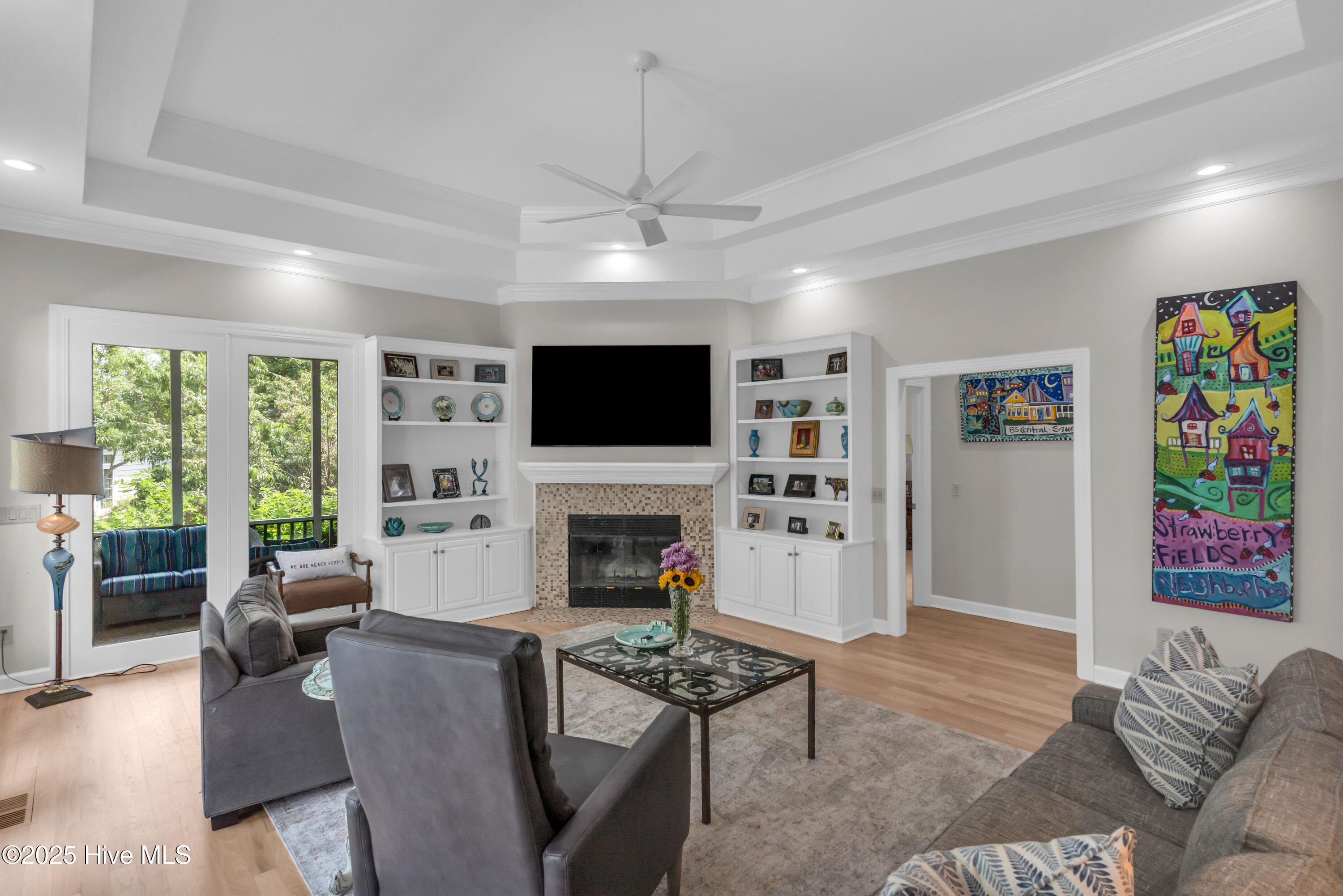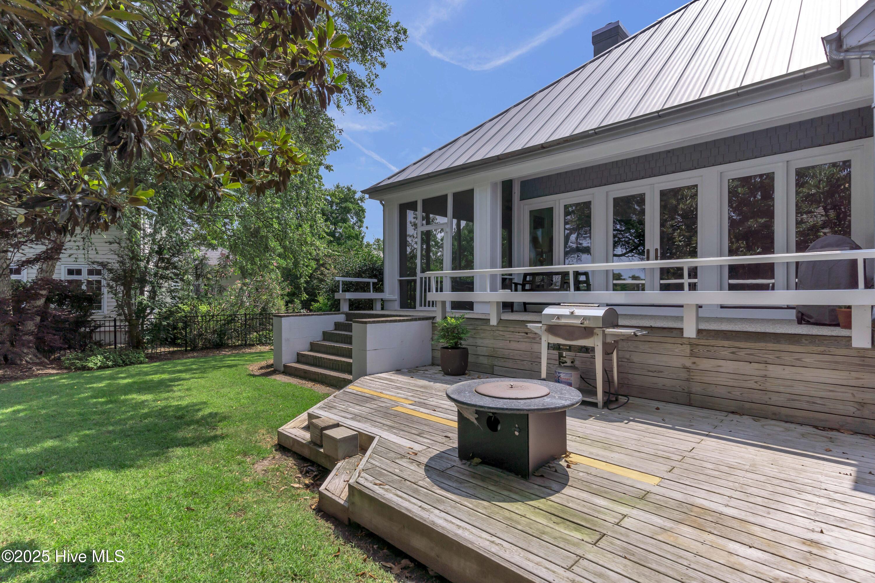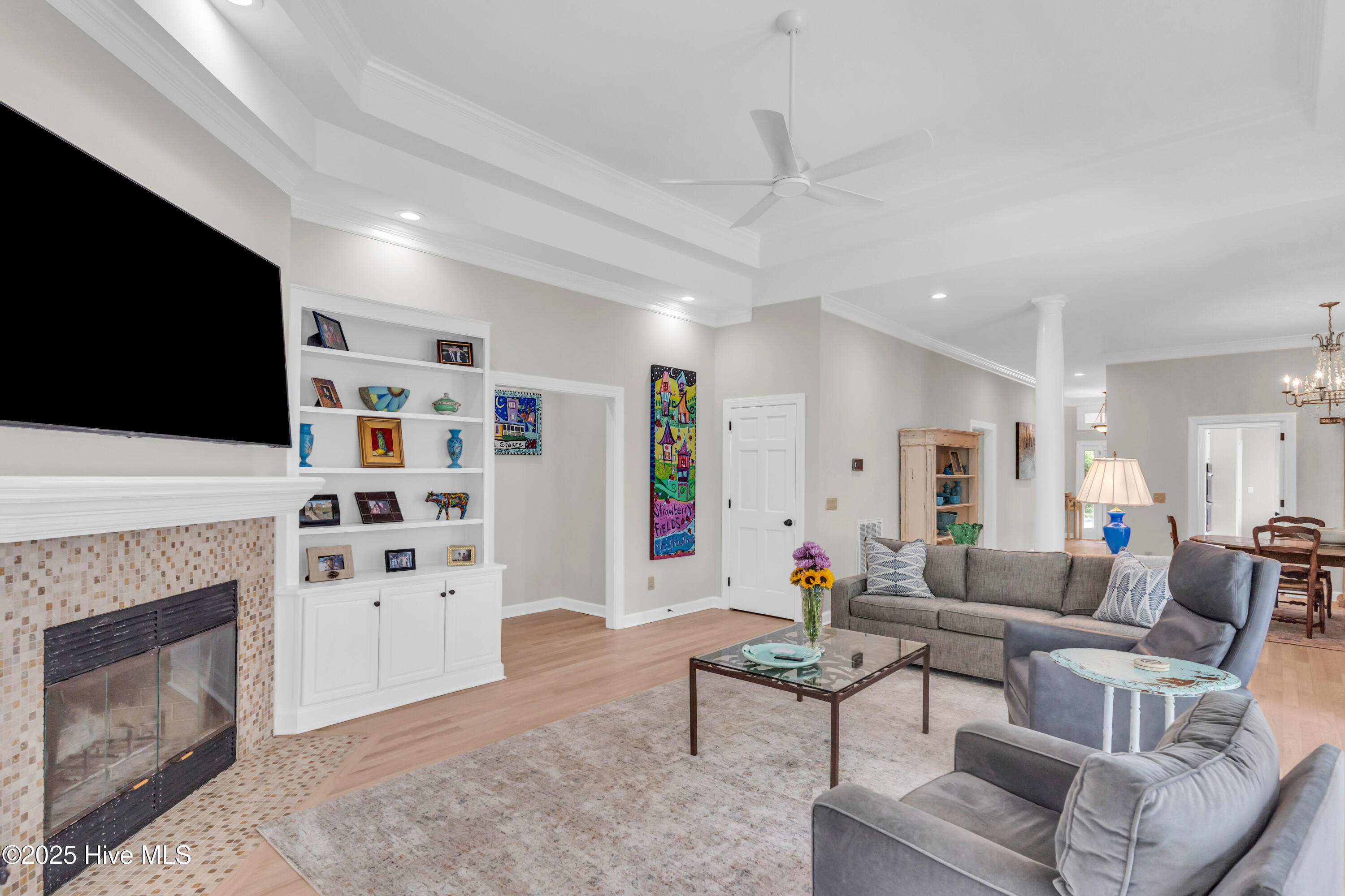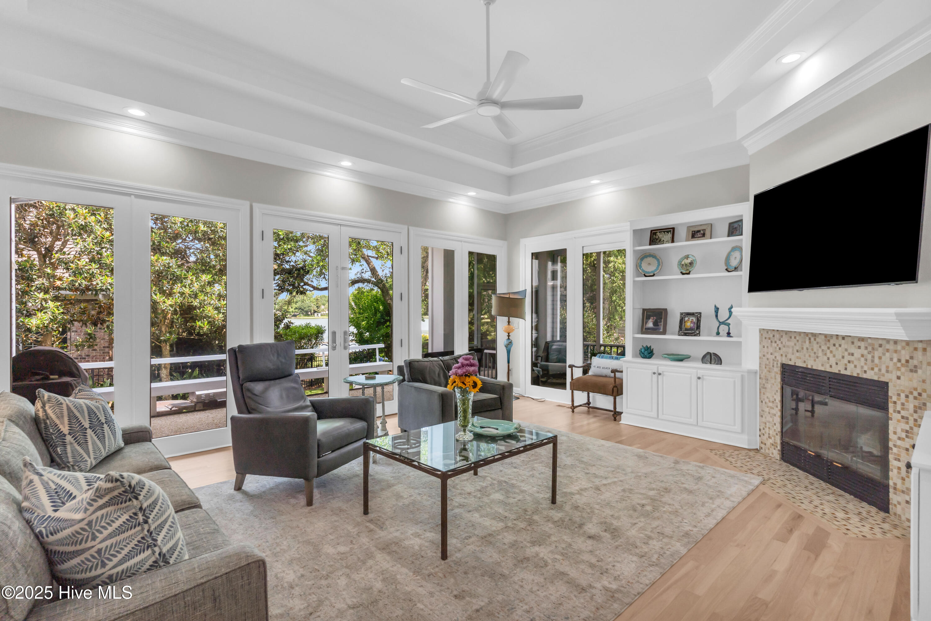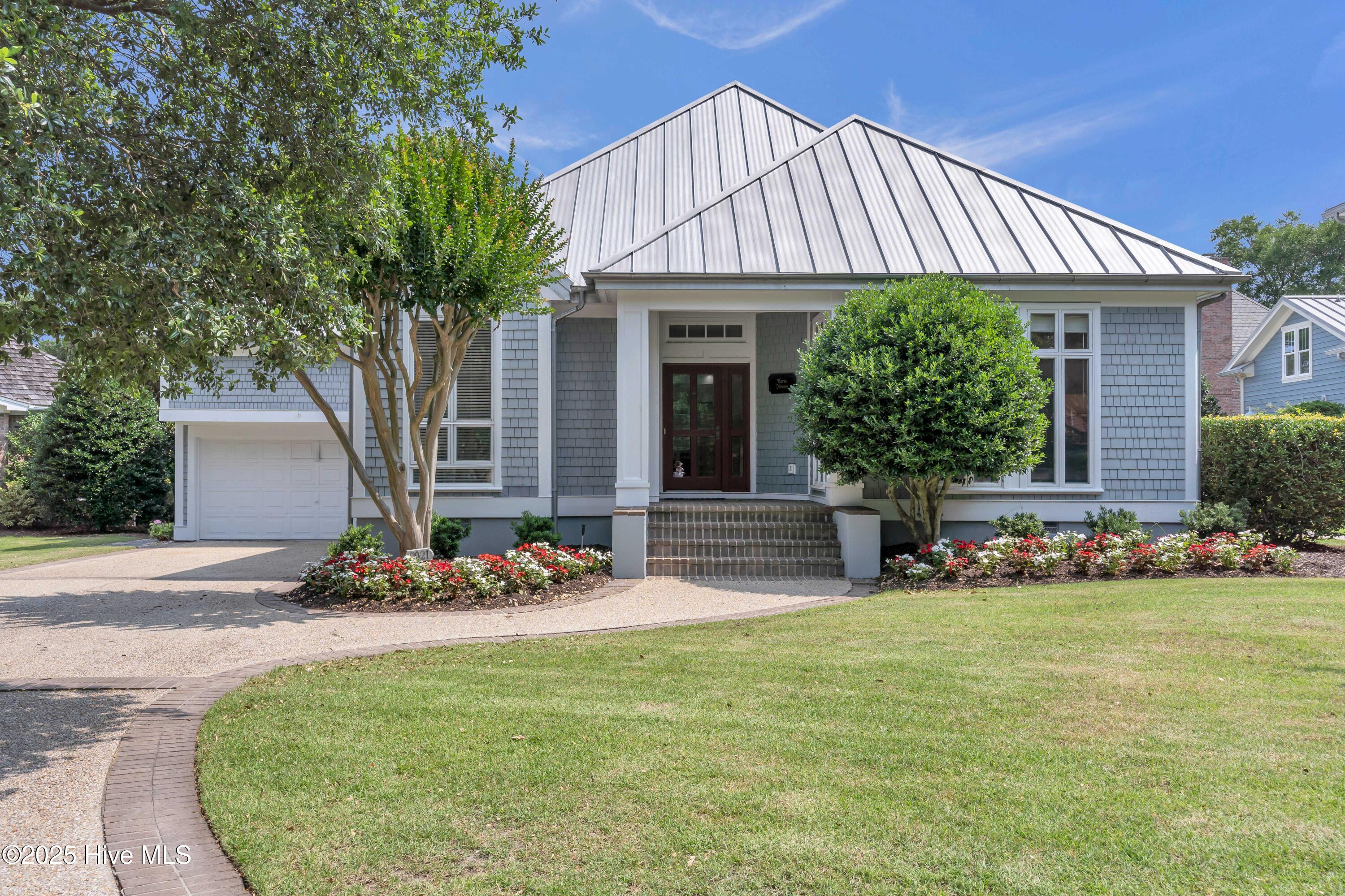 Welcome to Lakeside Villas, located within the prestigious gated community of Landfall. This beautifully updated home offers convenient one-level living with 3 spacious bedrooms, 2.5 bathrooms, and a versatile bonus room above the garage. The inviting living room features a wall of French doors that flood the space with natural light and offer lovely views, along with built-in shelving flanking a stylish tiled fireplace. The adjacent dining room is ideal for formal gatherings, while the kitchen offers a sunny breakfast nook for more casual meals. A large center island with cooktop, double wall ovens, and abundant cabinetry enhance the bright and airy kitchen. The owner's suite is a serene retreat with its own fireplace and private access to the screened porch. The spa-inspired ensuite bath includes double vanities, a soaking tub, a separate glass-enclosed shower, and a generous walk-in closet. Two additional bedrooms, both spacious and filled with natural light, each feature walk-in closets and share a well-appointed bathroom. Upstairs, the bonus room provides flexible space for a home office, gym, or playroom. Enjoy peaceful mornings or relaxing evenings on the screened porch or the deck, which offers tranquil, partial views of Dye Lake. Lakeside Villas' HOA maintains the yard, offering a truly low-maintenance lifestyle. Ideally situated off Pembroke Jones Drive, the home is close to both the Eastwood Gate and the Drysdale entrance and Sports Center. Community amenities include scenic parks, playgrounds, ball fields, miles of nature trails, picturesque lakes, and hundreds of acres of preserved natural areas.