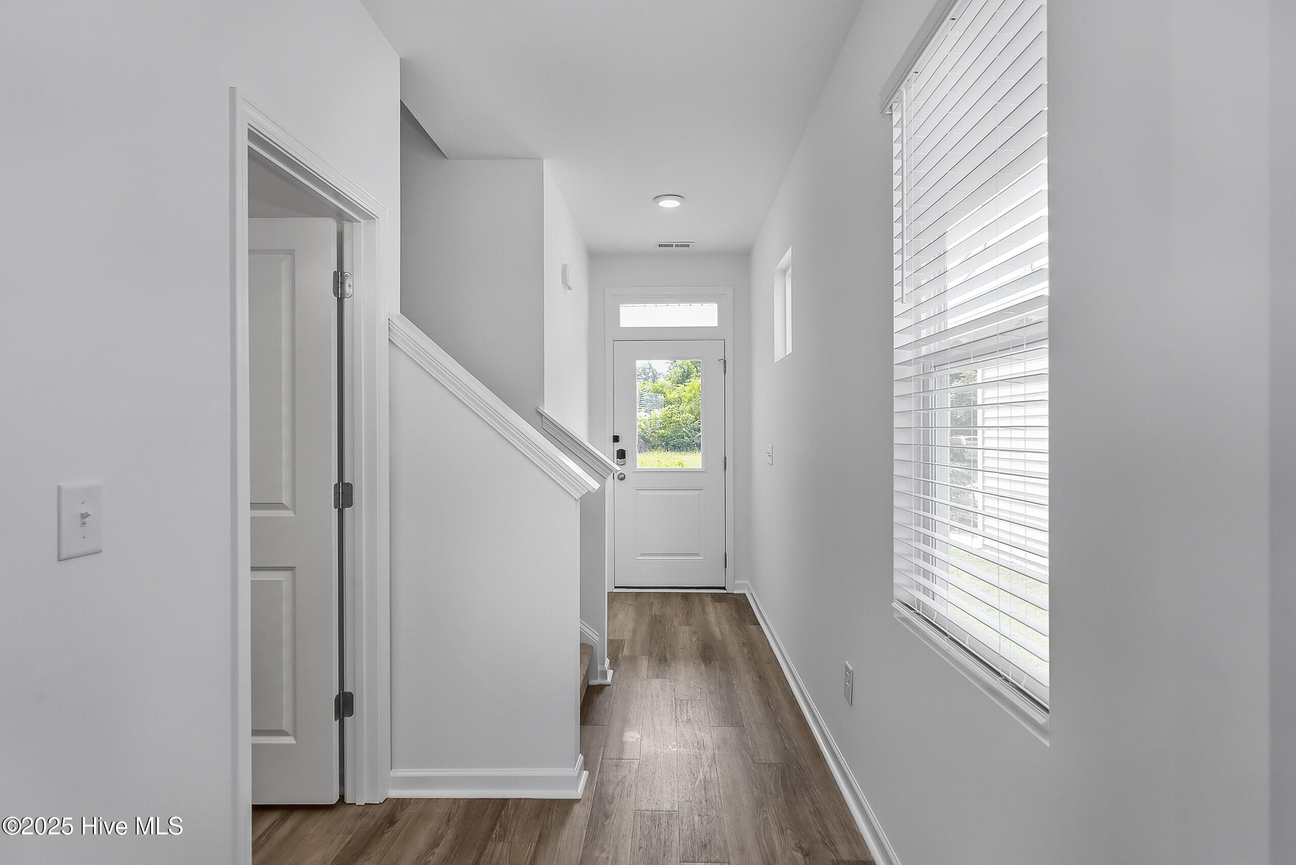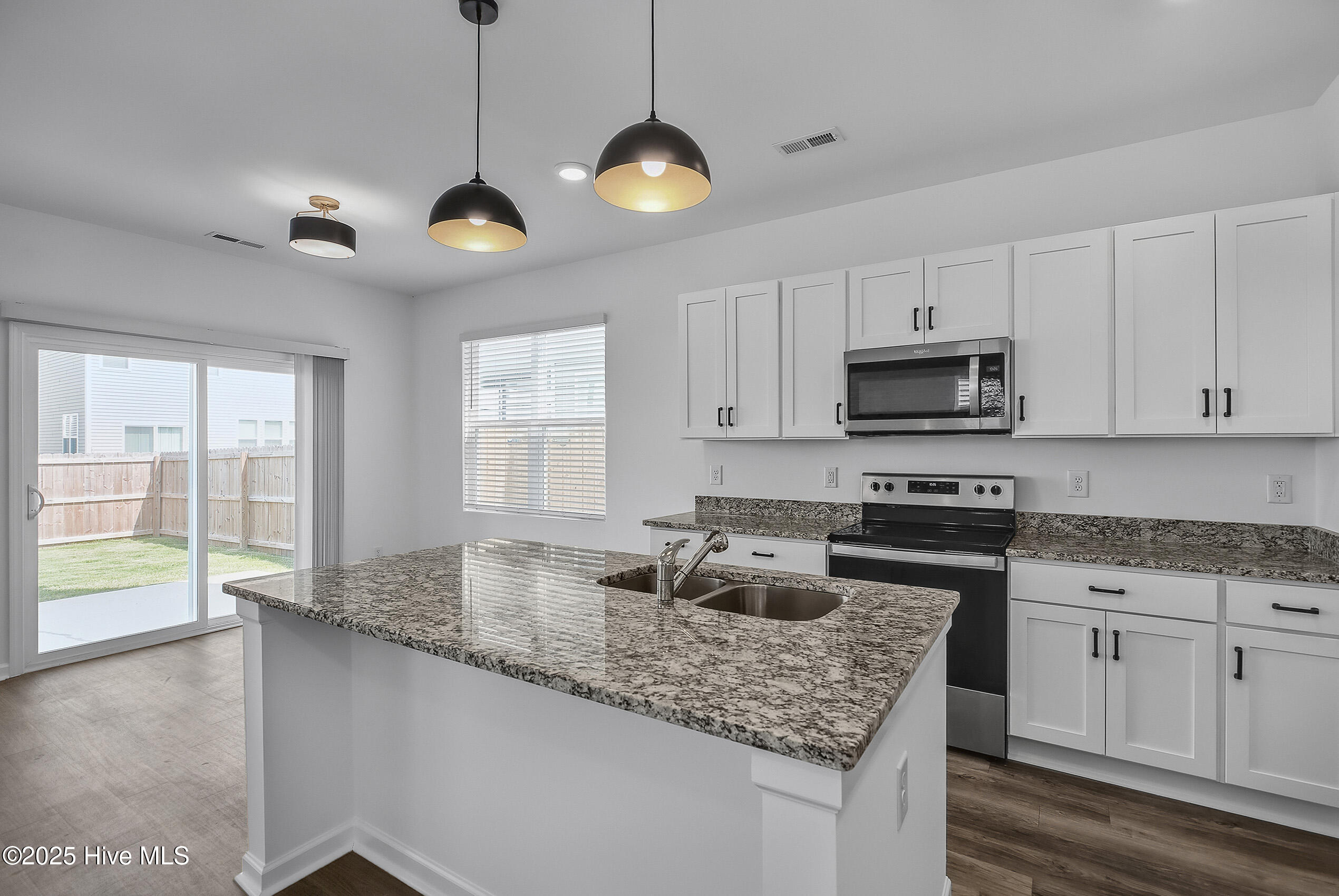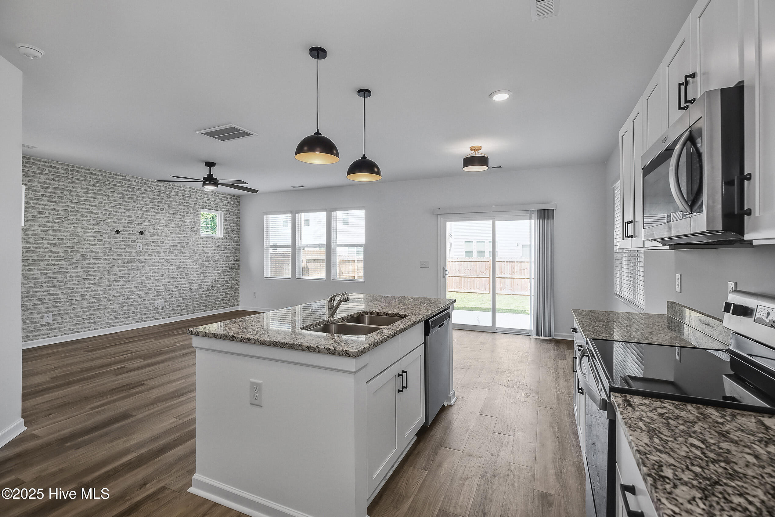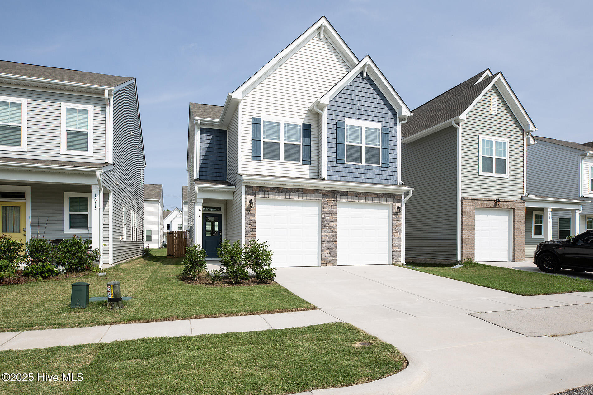 You will love this move in ready home in Clarendon Park! The curb appeal is superb, enhanced by its manicured landscape, low maintenance exterior and attractive architectural accents of differing textures and stacked stone. Quality construction by McKee Homes, this open-designed floorplan is accentuated by its wide plank flooring and a muted color palette. The kitchen boasts high-quality stainless appliances, granite countertops, custom white cabinetry and a sizable pantry. The upstairs primary suite is a retreat of its own - offering abundant windows and a walk-in closet; the primary bathroom encompasses a double vanity, also has a walk-in closet, and a shower with glass showers. Two additional bedrooms are well appointed and have ample closet space. These bedrooms share the hallway bathroom. Also upstairs, a spacious loft can serve as a den, yoga studio or playroom. Other important features include a laundry room, 2-car garage, storage, patio and a large fenced backyard. Clarendon Park is conveniently located near ILM and has quick access to MLK Parkway. The neighborhood's pedestrian friendly sidewalks are a bonus. Welcome home!