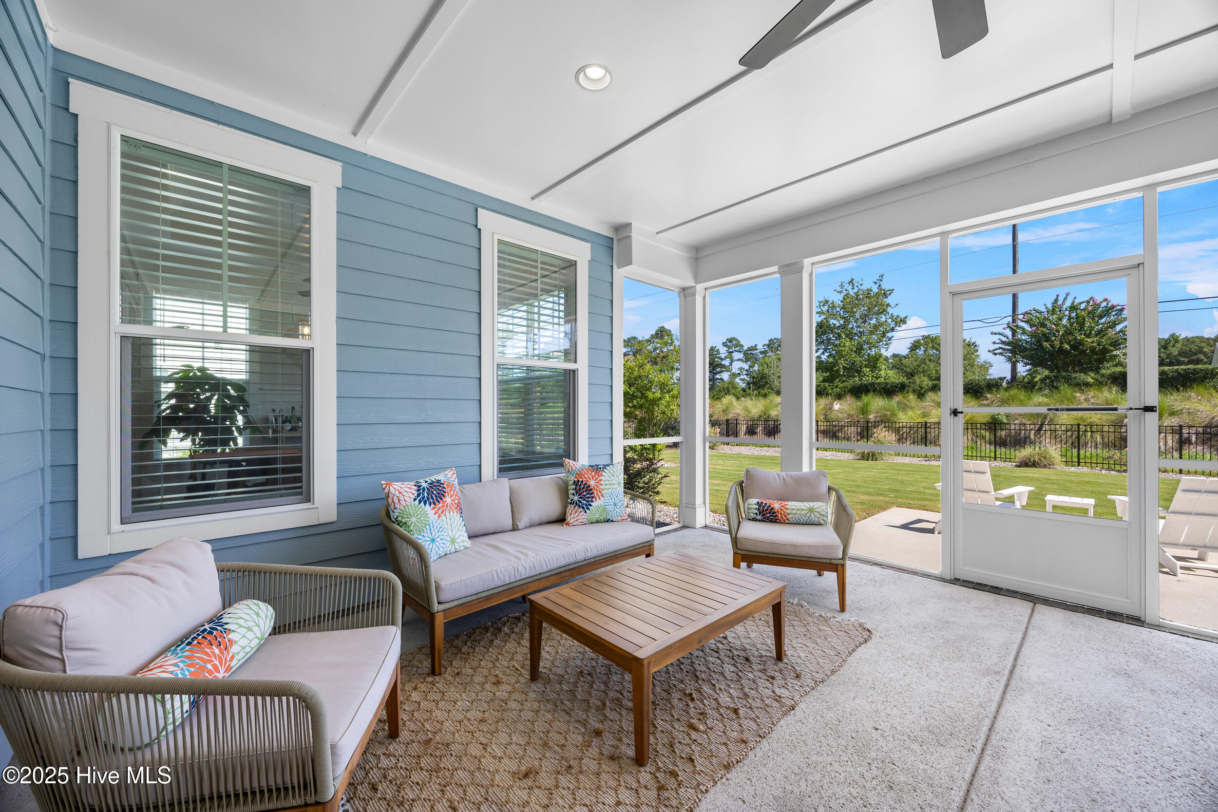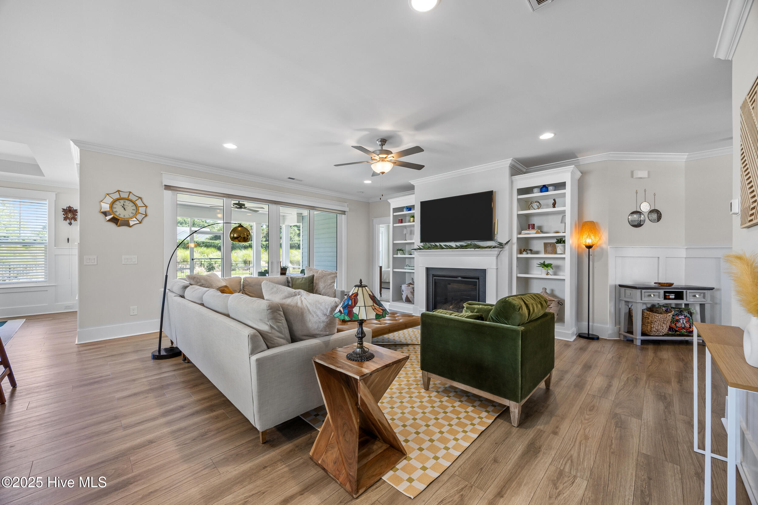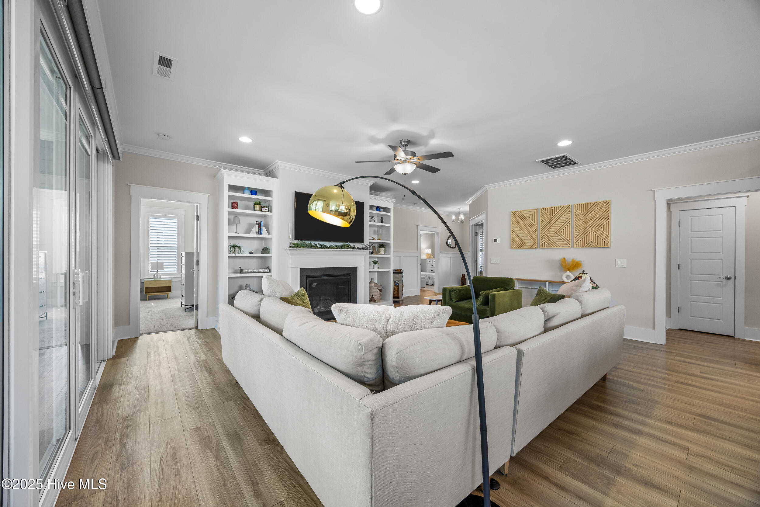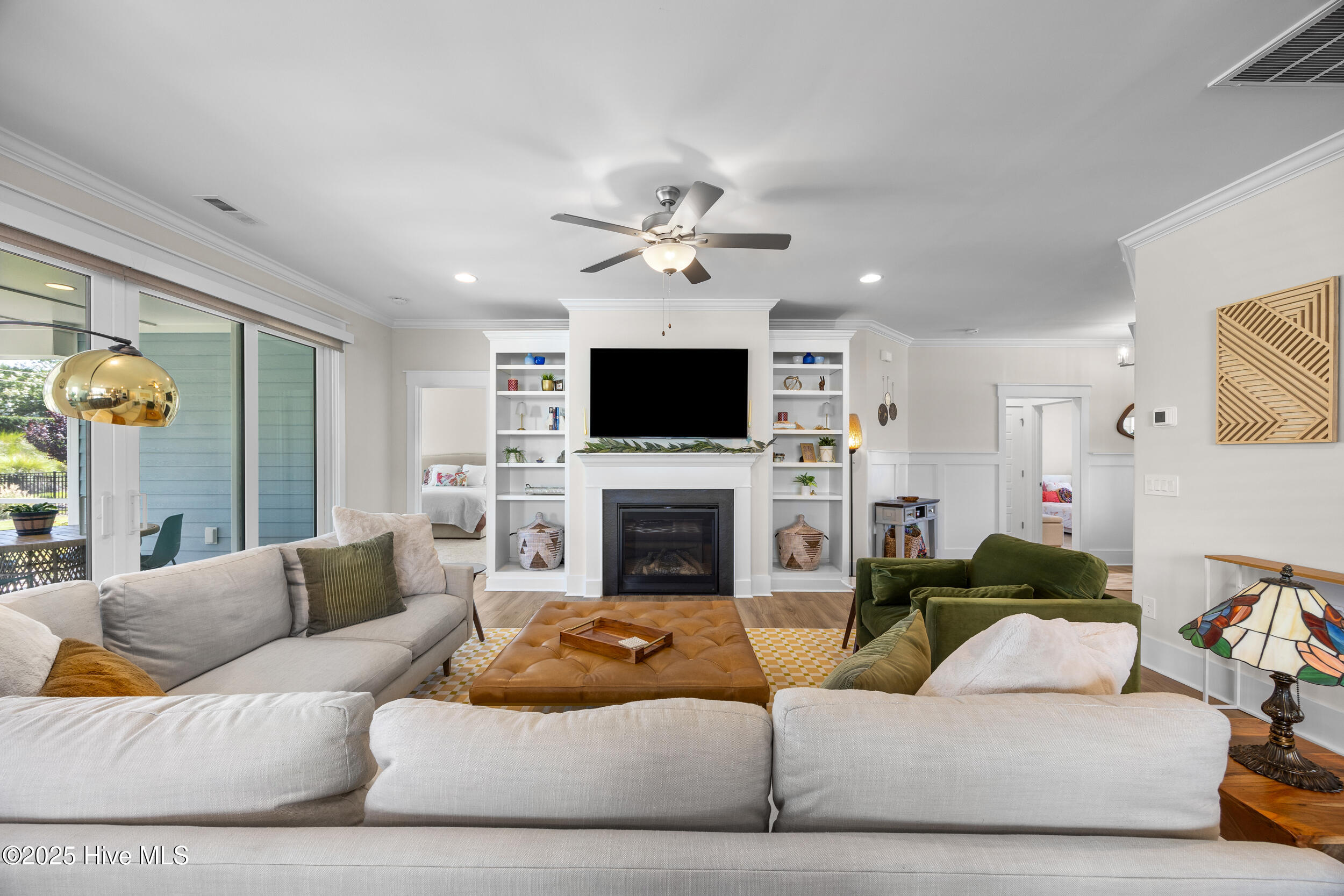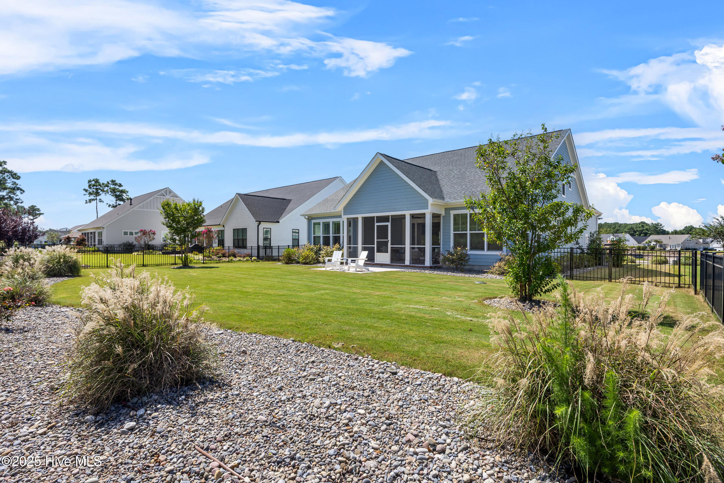 Welcome to luxury coastal living in Salters Haven at Lea Marina! This stunning 4 bedroom, 3 bathroom home with a bonus room offers over 2,500 sq. ft. of thoughtfully designed space, built in 2022 by Bill Clark Homes and loaded with high-end upgrades. Step inside through the inviting foyer accented with wainscoting, and you'll find a flex room with French doors that would make the perfect home office or additional bedroom, and a guest bedroom with a full bath nearby. The open-concept main living area features a spacious living room with a gas log fireplace flanked by custom built-ins, flowing seamlessly into the designer kitchen complete with quartz countertops, upgraded tile backsplash, and stainless steel appliances including a gas range with vent hood, built-in wall oven and microwave. A bright dining area surrounded by windows completes the heart of the home. Just beyond the living room, large sliding glass doors lead to a screened-in porch with a fan, overlooking the fenced, landscaped backyard with an irrigation system. The first-floor owner's suite boasts trey ceilings, a dream walk-in closet with custom built-ins, and a gorgeous ensuite bathroom with dual vanities and a walk-in shower featuring hexagon tile and built-in seating. Upstairs, you'll find a spacious bonus room and a private bedroom suite with an ensuite bath, ideal for guests or multigenerational living. Need storage? This home delivers with a walk-in floored attic offering 480 sq. ft. of additional space. Additional features include LVP flooring throughout, plantation shutters, a mudroom off the 2-car garage, and a dedicated laundry room with shelving and a folding station. Located in the coveted Salters Haven community, residents enjoy resort-style amenities including a marina, award-winning clubhouse, resort-style pool, fire pits, and a kayak launch—all just minutes from the Intracoastal Waterway.