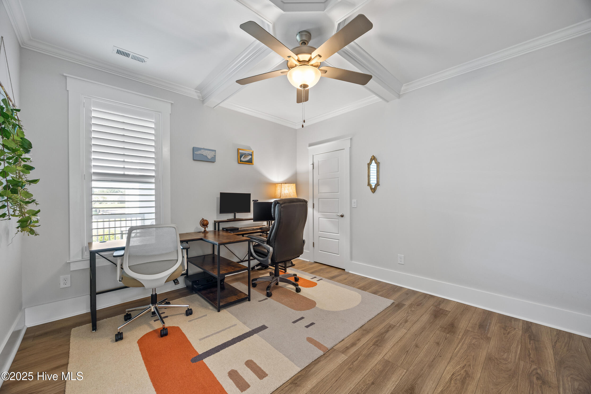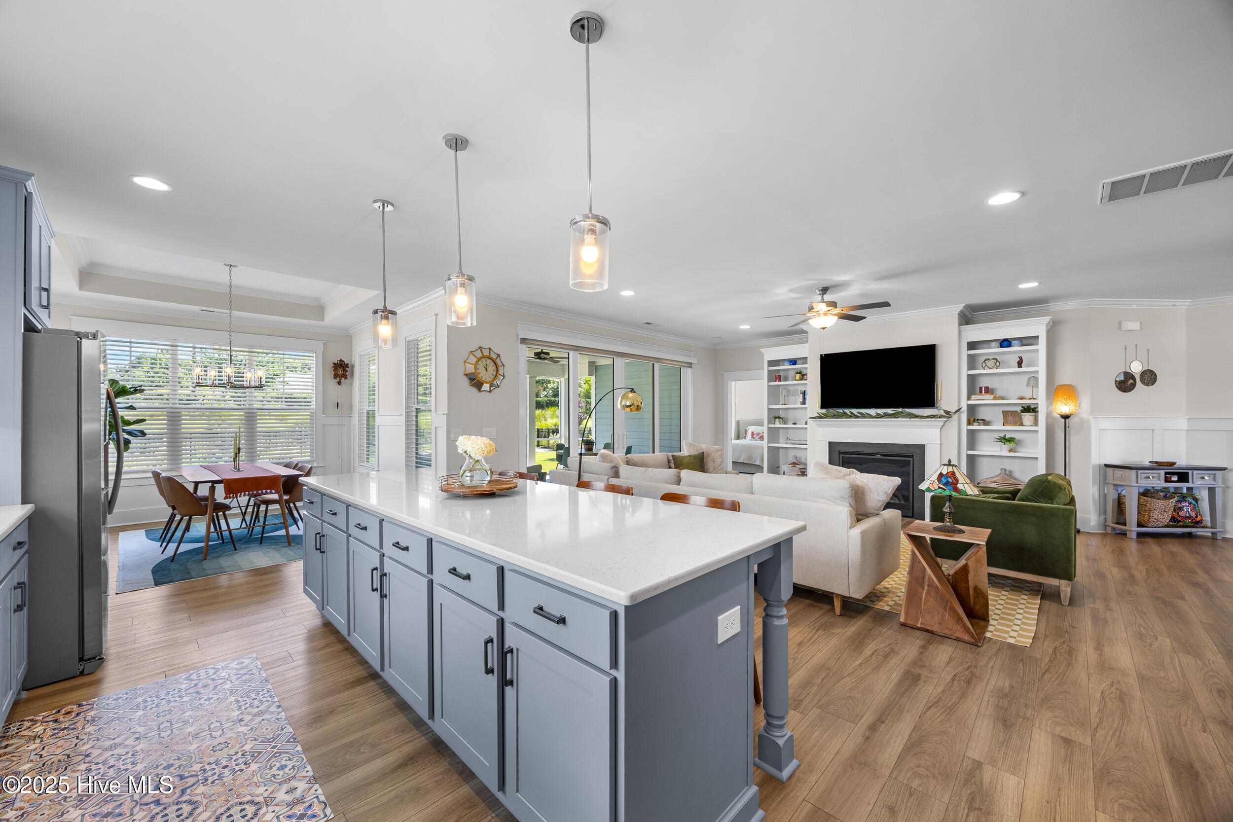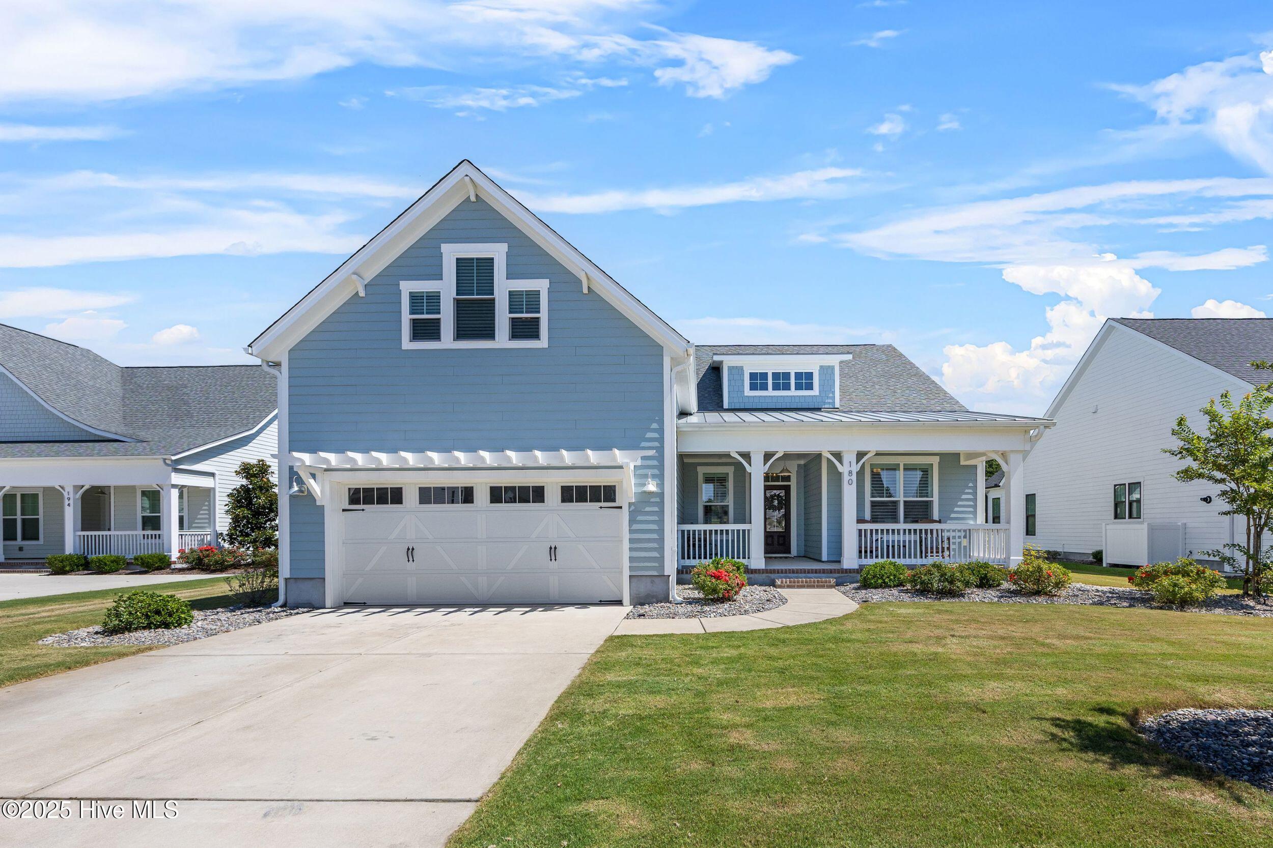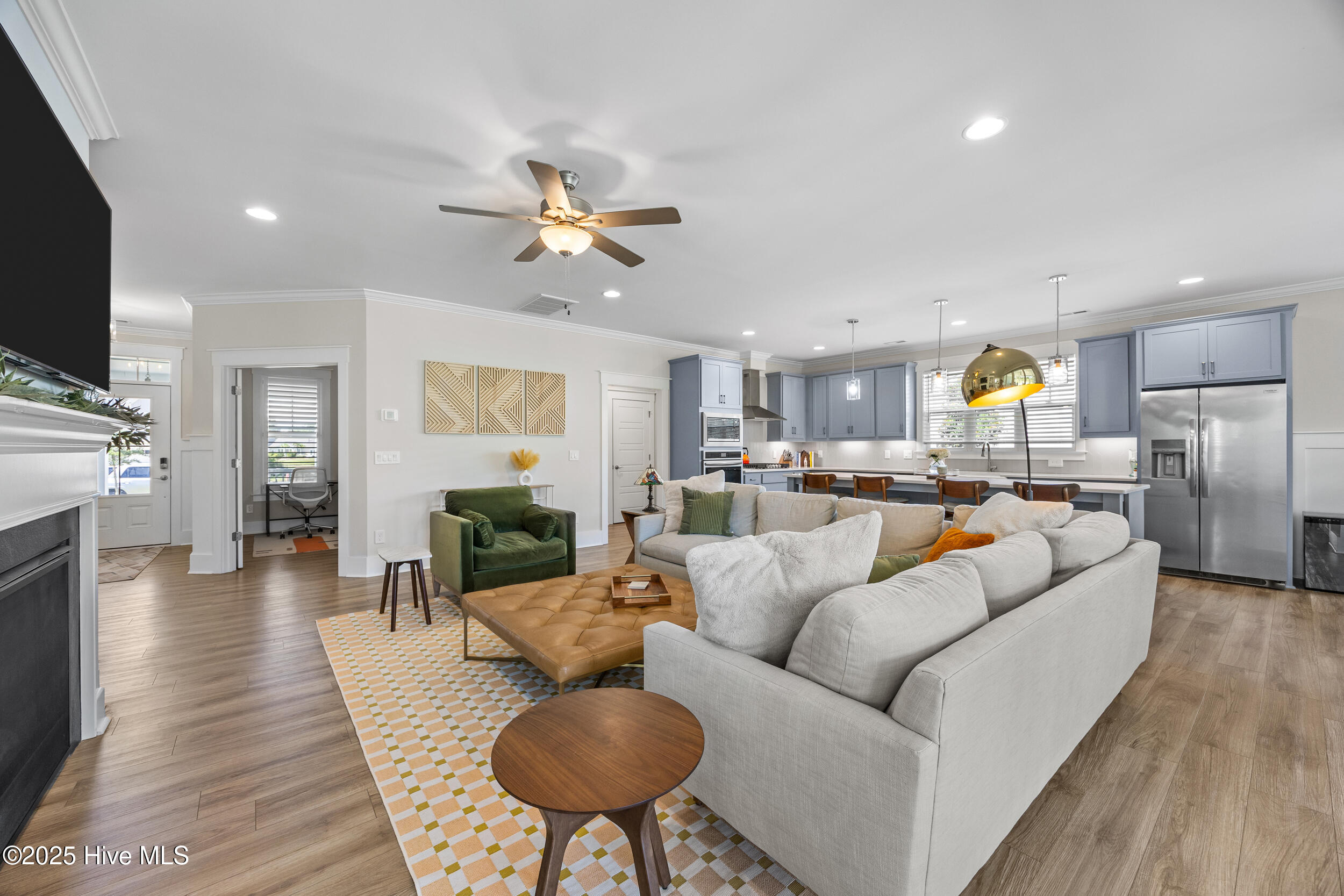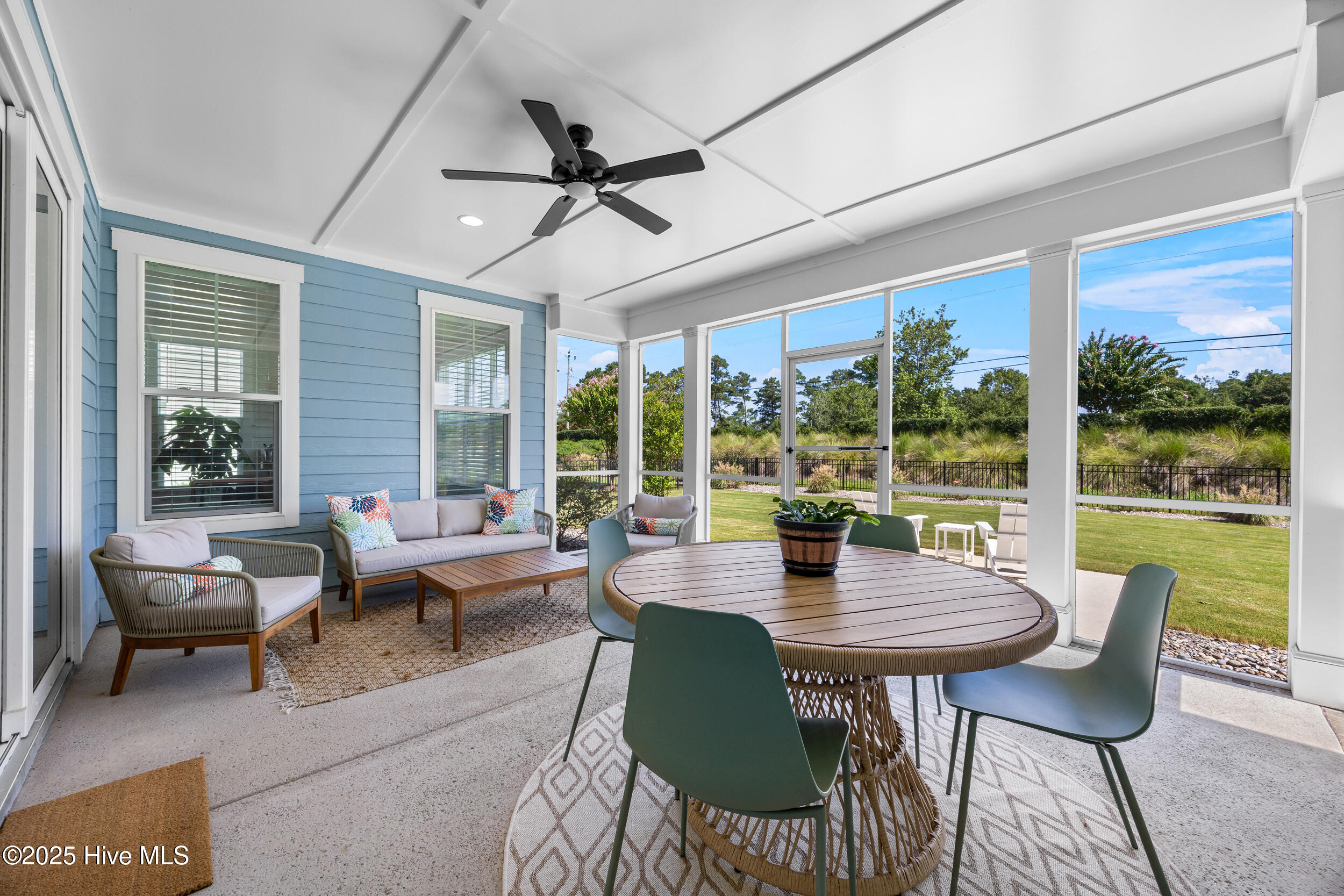 Welcome to luxury coastal living in Salters Haven at Lea Marina! This stunning 4 bedroom, 3 bathroom home with a bonus room offers over 2,500 sq. ft. of thoughtfully designed space, built in 2022 by Bill Clark Homes and loaded with high-end upgrades. Step inside through the inviting foyer accented with wainscoting, and you'll find a flex room with French doors that would make the perfect home office or additional bedroom, and a guest bedroom with a full bath nearby. The open-concept main living area features a spacious living room with a gas log fireplace flanked by custom built-ins, flowing seamlessly into the designer kitchen complete with quartz countertops, upgraded tile backsplash, and stainless steel appliances including a gas range with vent hood, built-in wall oven and microwave. A bright dining area surrounded by windows completes the heart of the home. Just beyond the living room, large sliding glass doors lead to a screened-in porch with a fan, overlooking the fenced, landscaped backyard with an irrigation system. The first-floor owner's suite boasts trey ceilings, a dream walk-in closet with custom built-ins, and a gorgeous ensuite bathroom with dual vanities and a walk-in shower featuring hexagon tile and built-in seating. Upstairs, you'll find a spacious bonus room and a private bedroom suite with an ensuite bath, ideal for guests or multigenerational living. Need storage? This home delivers with a walk-in floored attic offering 480 sq. ft. of additional space. Additional features include LVP flooring throughout, plantation shutters, a mudroom off the 2-car garage, and a dedicated laundry room with shelving and a folding station. Located in the coveted Salters Haven community, residents enjoy resort-style amenities including a marina, award-winning clubhouse, resort-style pool, fire pits, and a kayak launch—all just minutes from the Intracoastal Waterway.