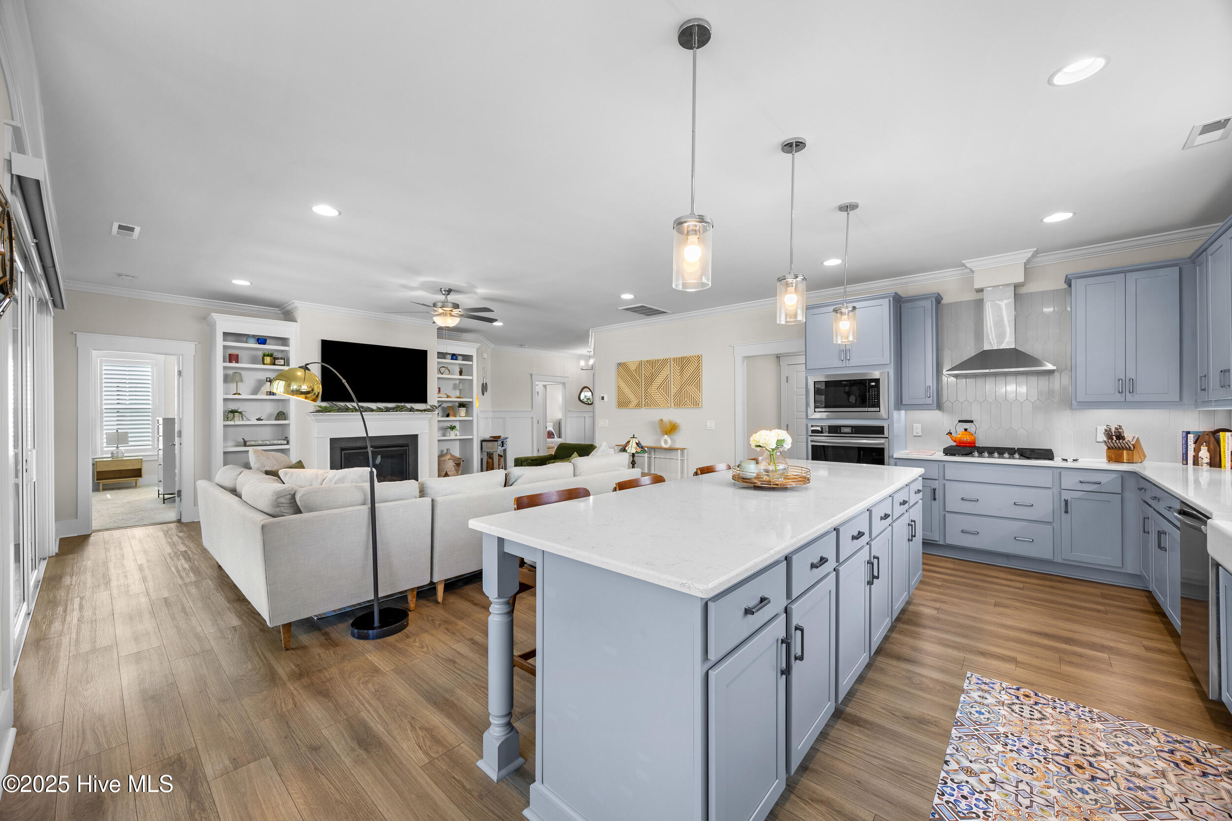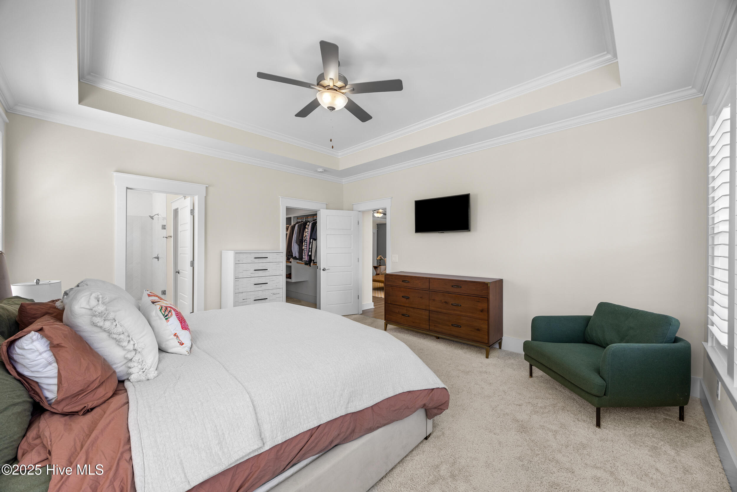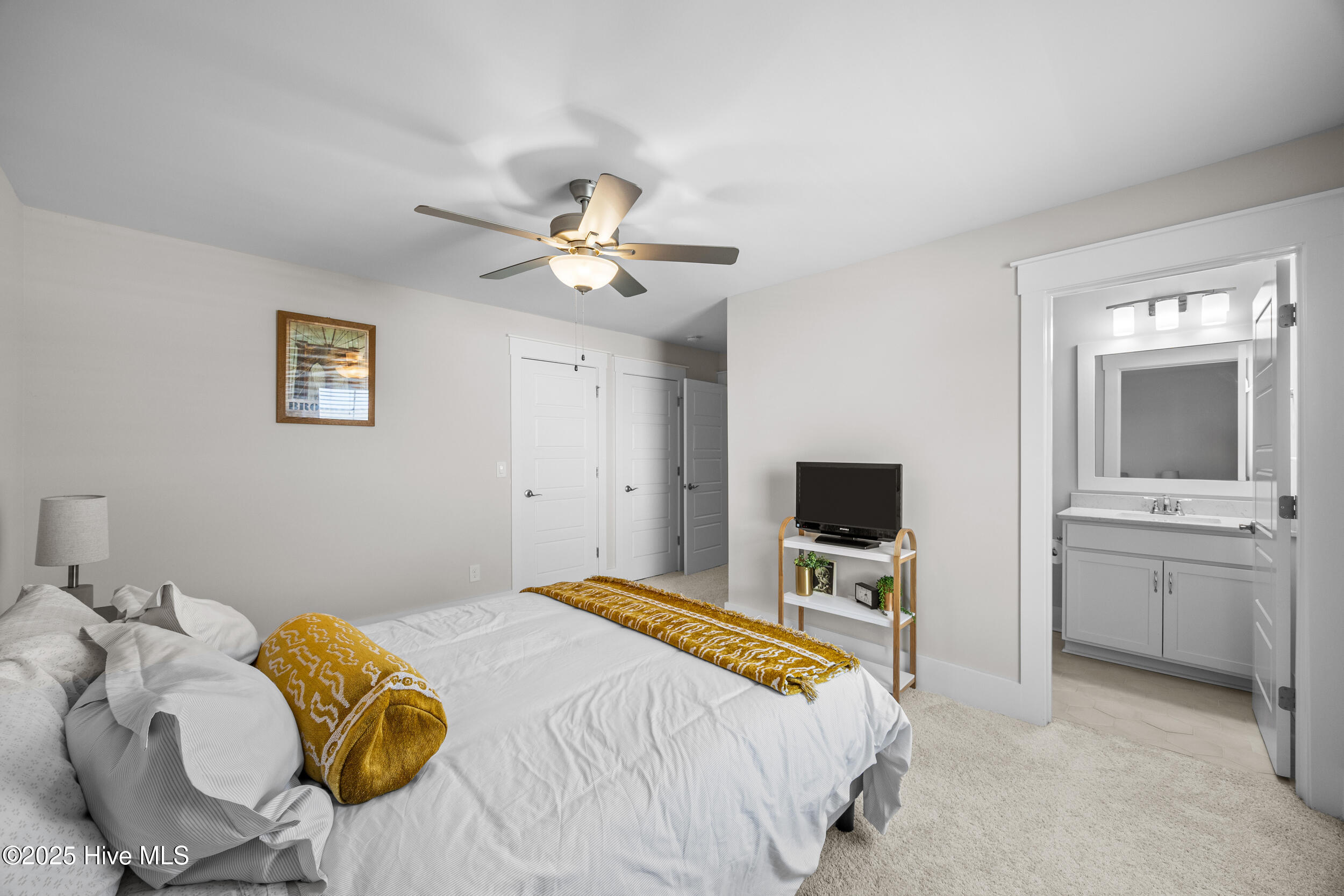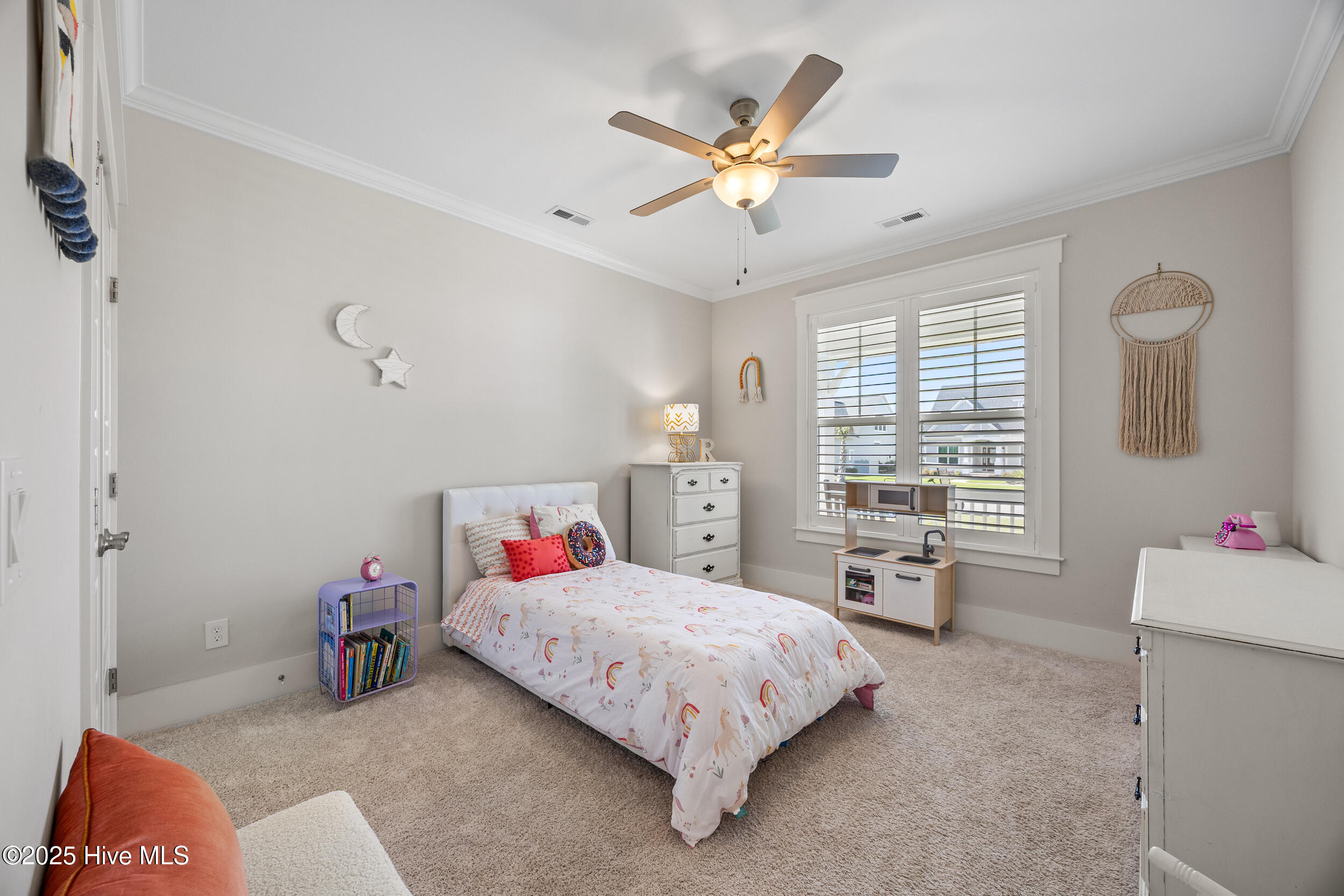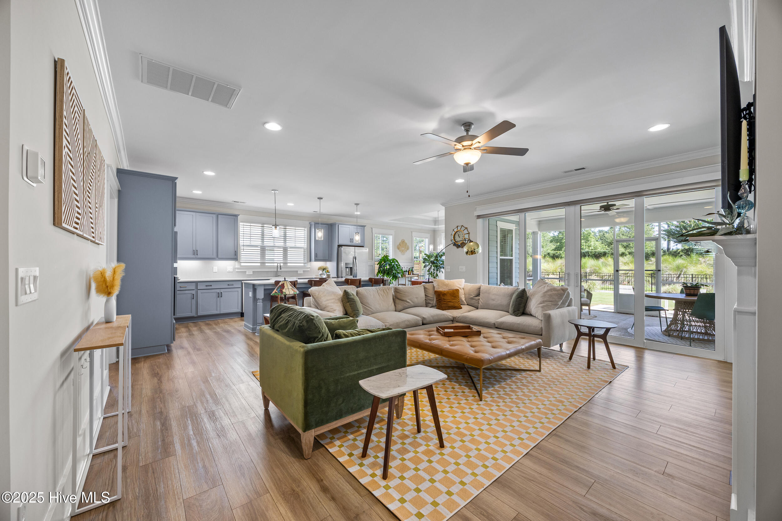 Welcome to luxury coastal living in Salters Haven at Lea Marina! This stunning 4 bedroom, 3 bathroom home with a bonus room offers over 2,500 sq. ft. of thoughtfully designed space, built in 2022 by Bill Clark Homes and loaded with high-end upgrades. Step inside through the inviting foyer accented with wainscoting, and you'll find a flex room with French doors that would make the perfect home office or additional bedroom, and a guest bedroom with a full bath nearby. The open-concept main living area features a spacious living room with a gas log fireplace flanked by custom built-ins, flowing seamlessly into the designer kitchen complete with quartz countertops, upgraded tile backsplash, and stainless steel appliances including a gas range with vent hood, built-in wall oven and microwave. A bright dining area surrounded by windows completes the heart of the home. Just beyond the living room, large sliding glass doors lead to a screened-in porch with a fan, overlooking the fenced, landscaped backyard with an irrigation system. The first-floor owner's suite boasts trey ceilings, a dream walk-in closet with custom built-ins, and a gorgeous ensuite bathroom with dual vanities and a walk-in shower featuring hexagon tile and built-in seating. Upstairs, you'll find a spacious bonus room and a private bedroom suite with an ensuite bath, ideal for guests or multigenerational living. Need storage? This home delivers with a walk-in floored attic offering 480 sq. ft. of additional space. Additional features include LVP flooring throughout, plantation shutters, a mudroom off the 2-car garage, and a dedicated laundry room with shelving and a folding station. Located in the coveted Salters Haven community, residents enjoy resort-style amenities including a marina, award-winning clubhouse, resort-style pool, fire pits, and a kayak launch—all just minutes from the Intracoastal Waterway.