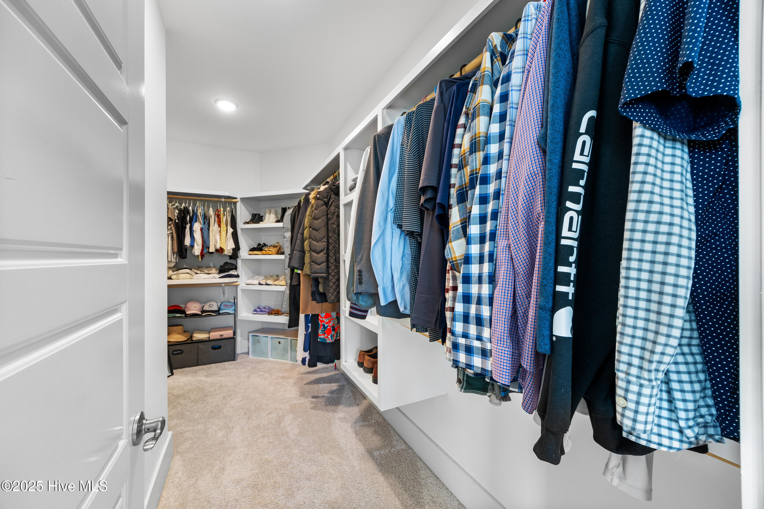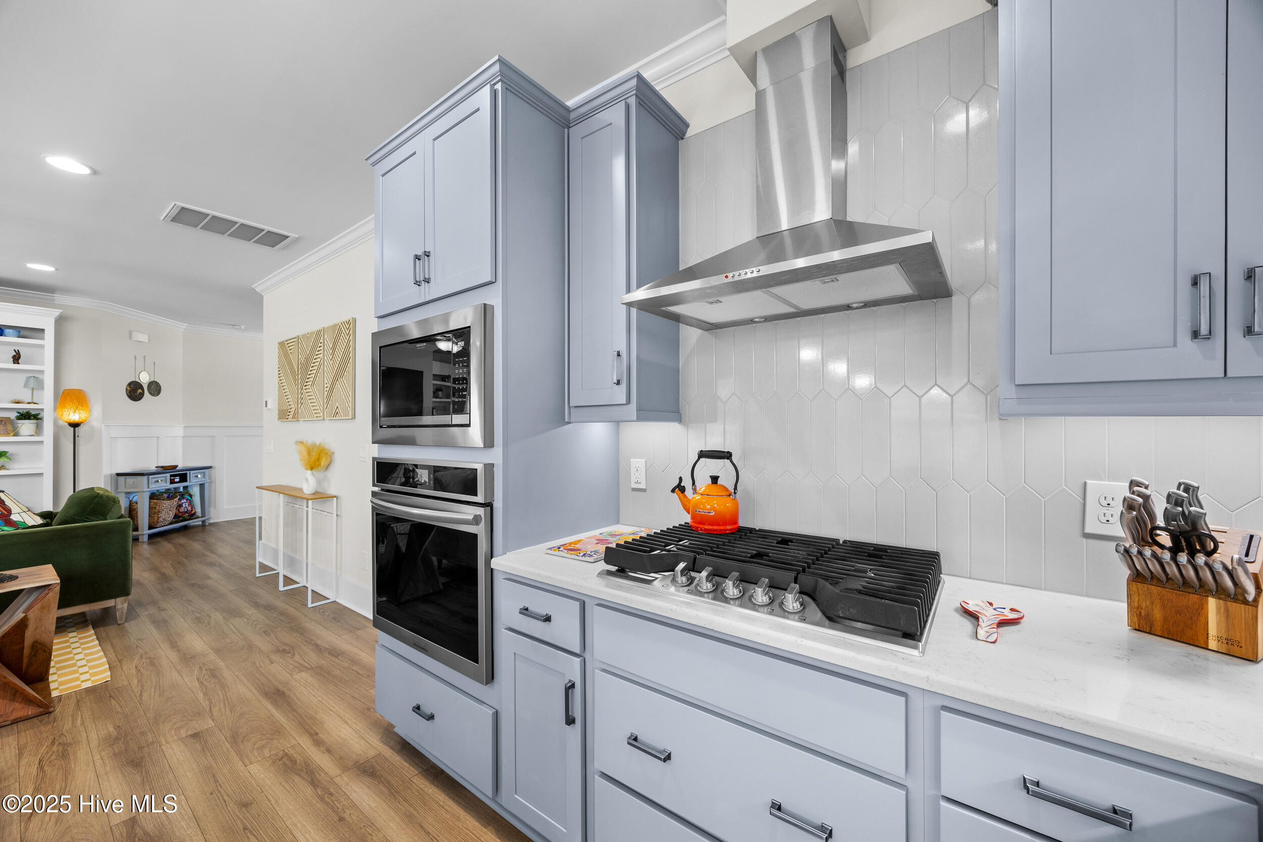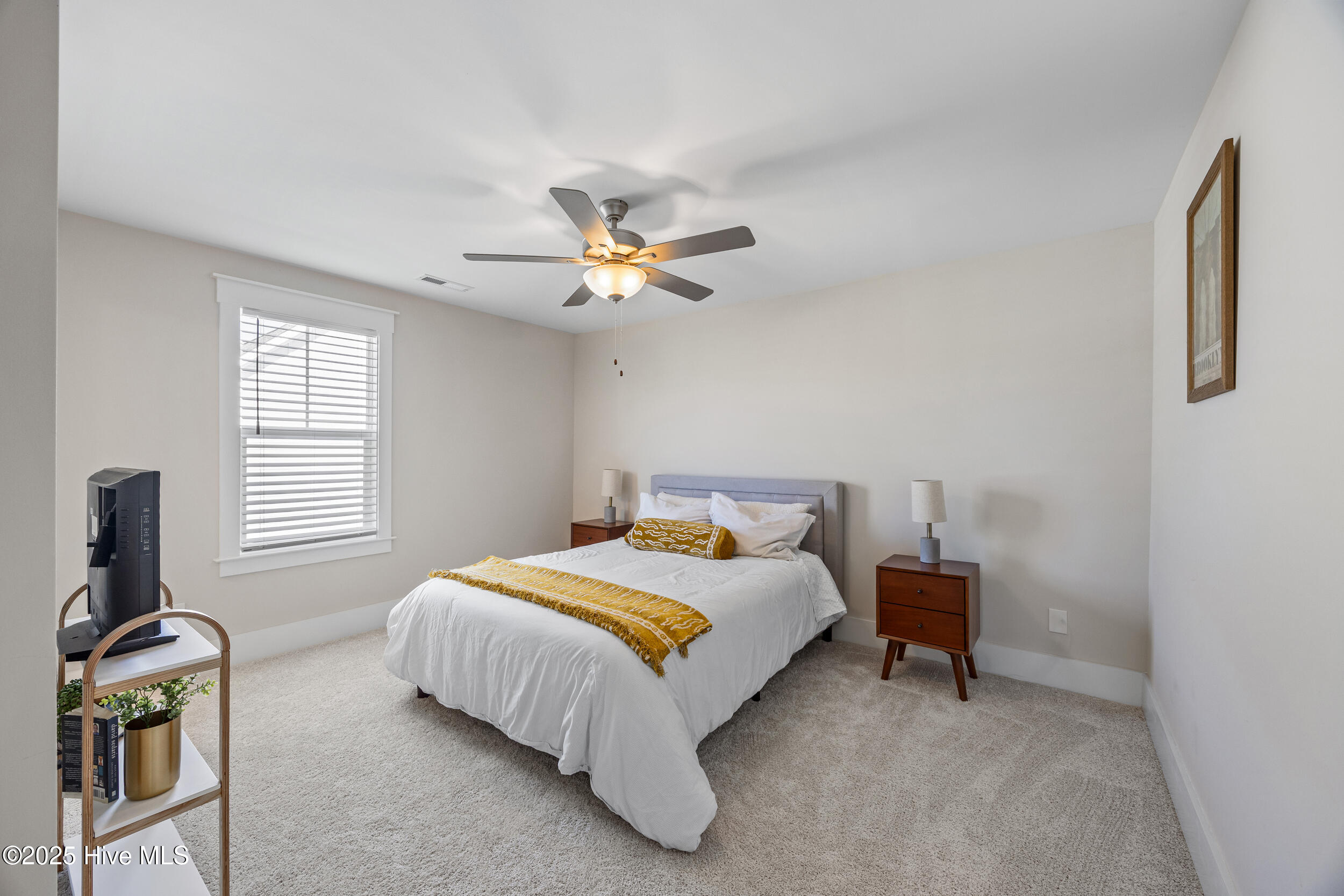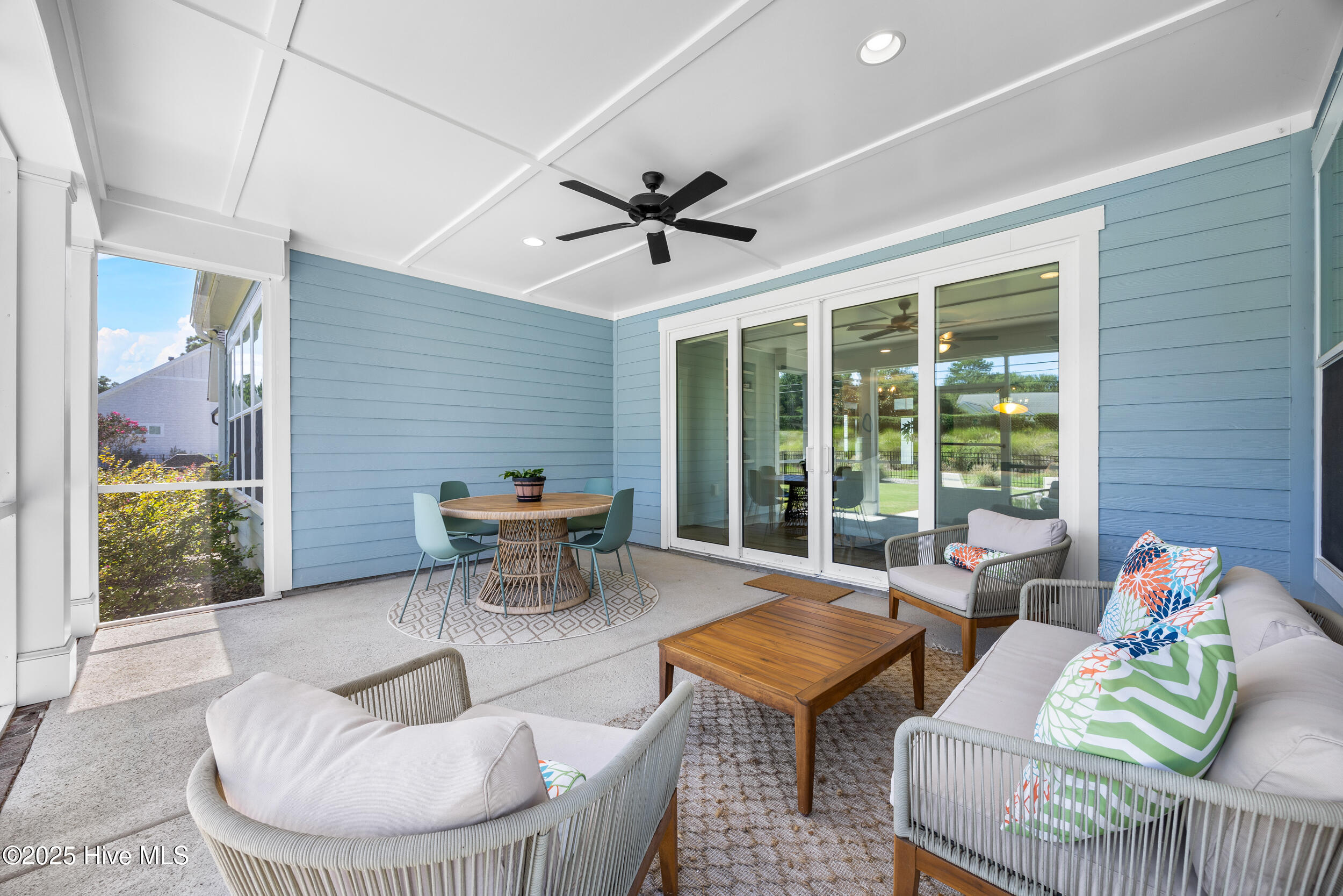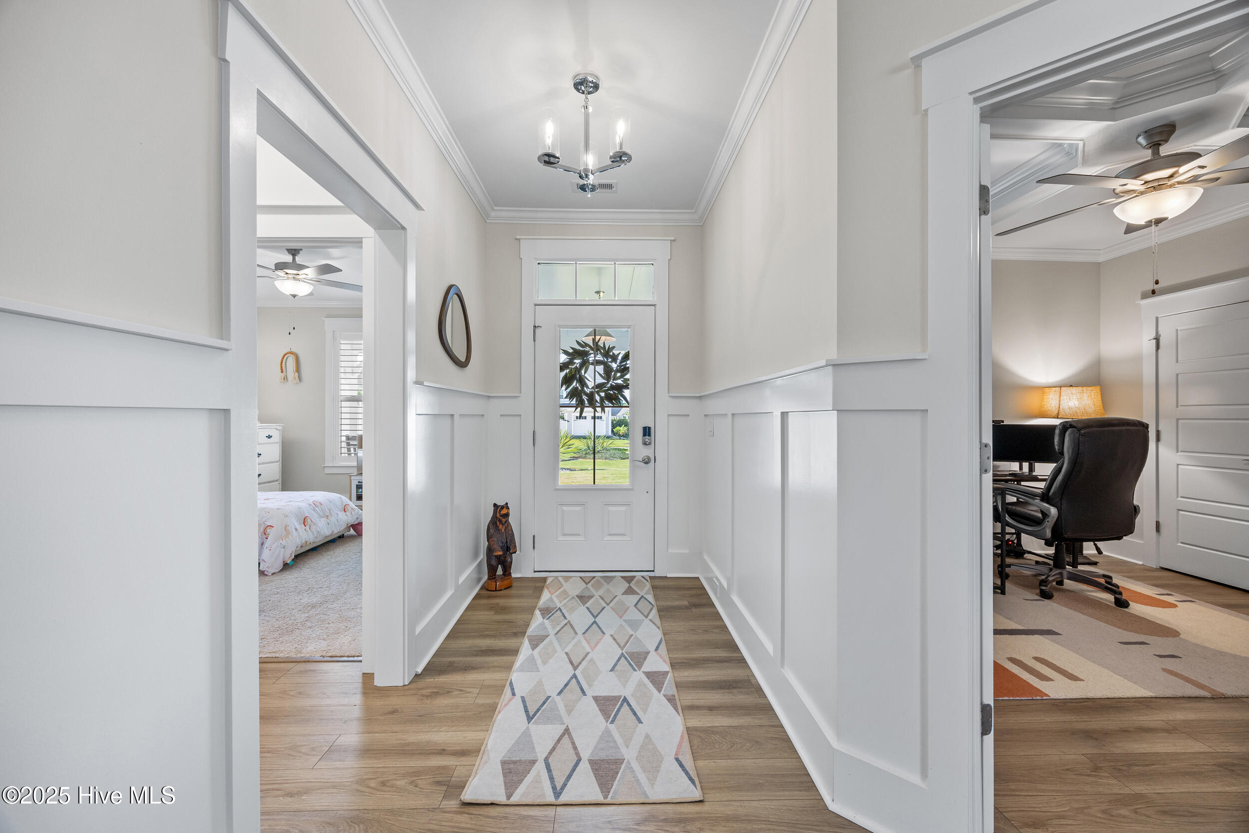 Welcome to luxury coastal living in Salters Haven at Lea Marina! This stunning 4 bedroom, 3 bathroom home with a bonus room offers over 2,500 sq. ft. of thoughtfully designed space, built in 2022 by Bill Clark Homes and loaded with high-end upgrades. Step inside through the inviting foyer accented with wainscoting, and you'll find a flex room with French doors that would make the perfect home office or additional bedroom, and a guest bedroom with a full bath nearby. The open-concept main living area features a spacious living room with a gas log fireplace flanked by custom built-ins, flowing seamlessly into the designer kitchen complete with quartz countertops, upgraded tile backsplash, and stainless steel appliances including a gas range with vent hood, built-in wall oven and microwave. A bright dining area surrounded by windows completes the heart of the home. Just beyond the living room, large sliding glass doors lead to a screened-in porch with a fan, overlooking the fenced, landscaped backyard with an irrigation system. The first-floor owner's suite boasts trey ceilings, a dream walk-in closet with custom built-ins, and a gorgeous ensuite bathroom with dual vanities and a walk-in shower featuring hexagon tile and built-in seating. Upstairs, you'll find a spacious bonus room and a private bedroom suite with an ensuite bath, ideal for guests or multigenerational living. Need storage? This home delivers with a walk-in floored attic offering 480 sq. ft. of additional space. Additional features include LVP flooring throughout, plantation shutters, a mudroom off the 2-car garage, and a dedicated laundry room with shelving and a folding station. Located in the coveted Salters Haven community, residents enjoy resort-style amenities including a marina, award-winning clubhouse, resort-style pool, fire pits, and a kayak launch—all just minutes from the Intracoastal Waterway.