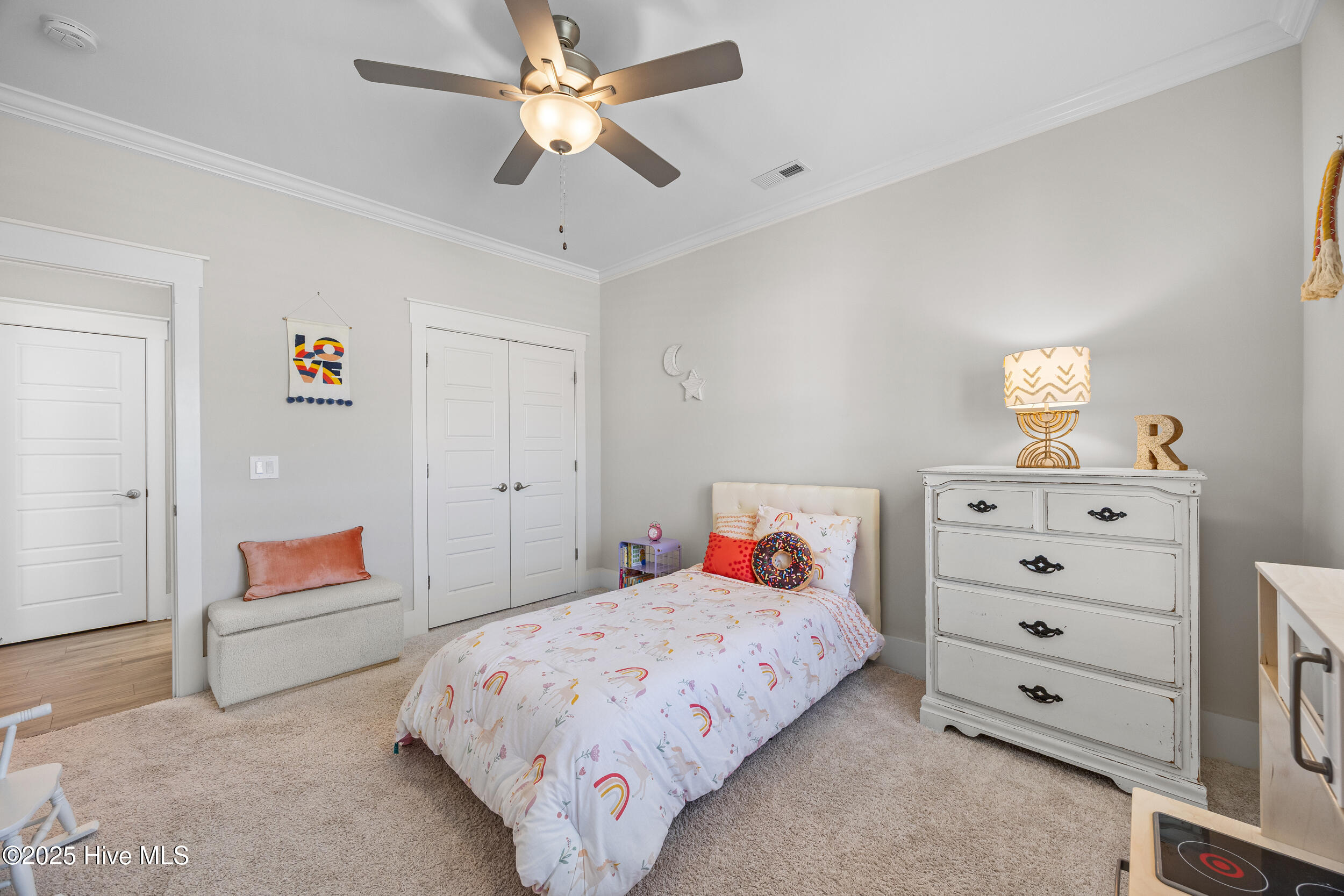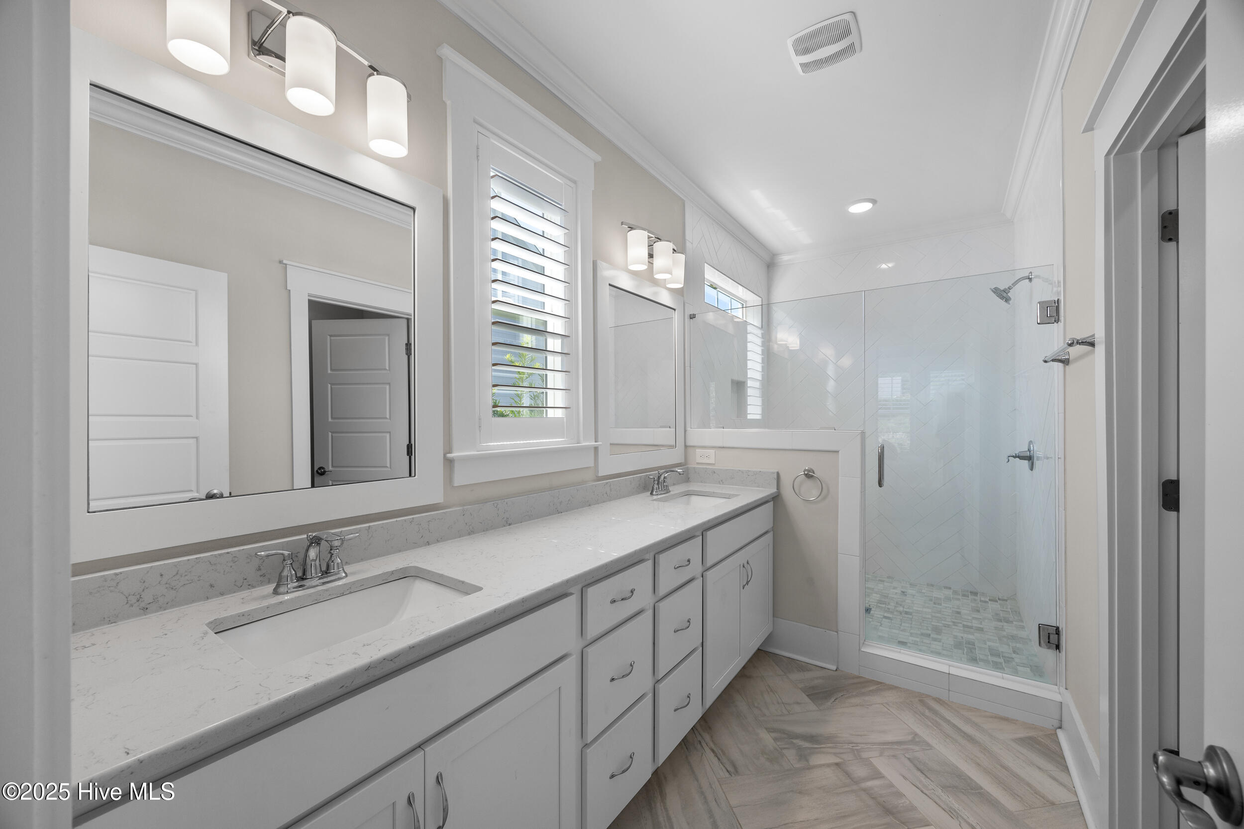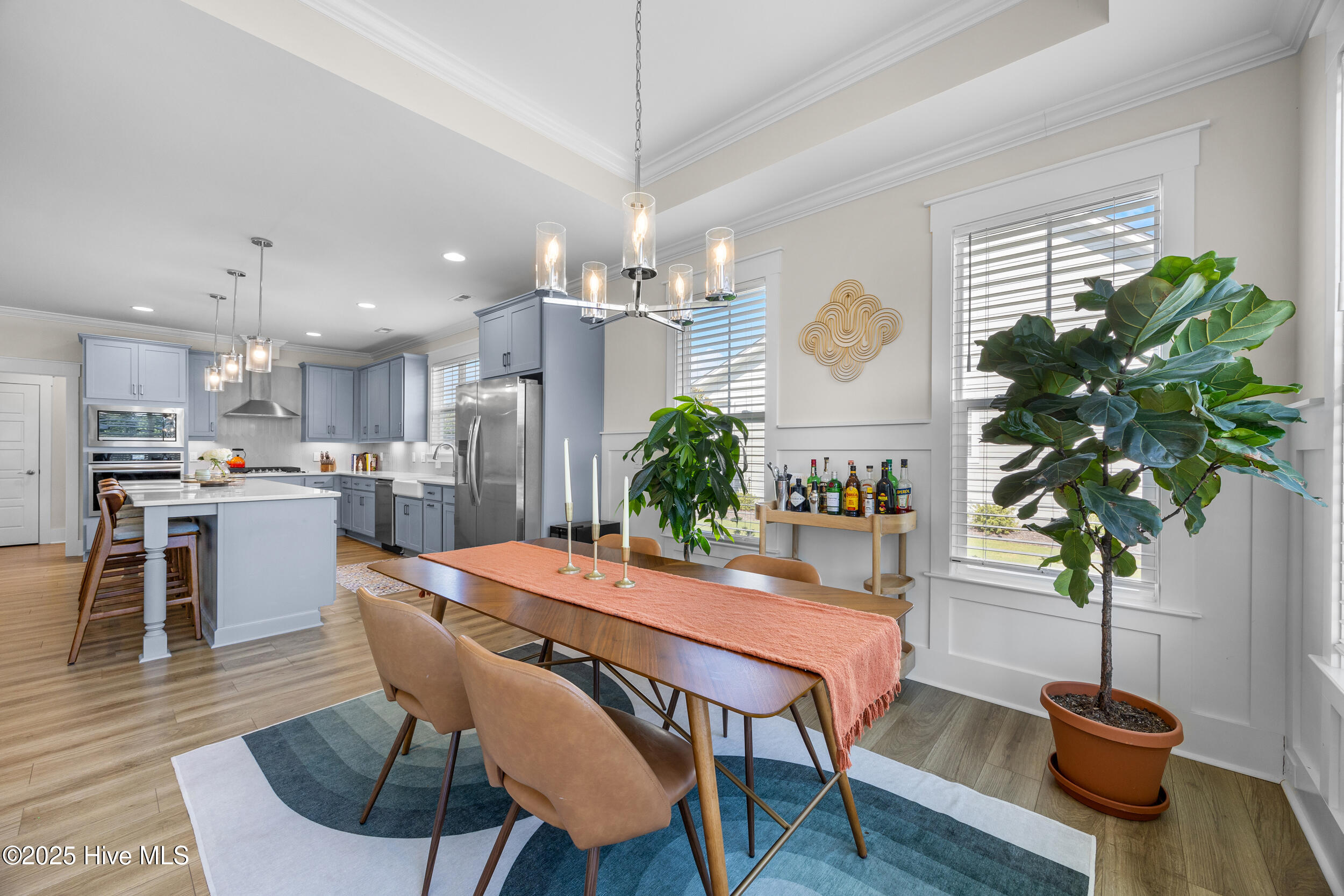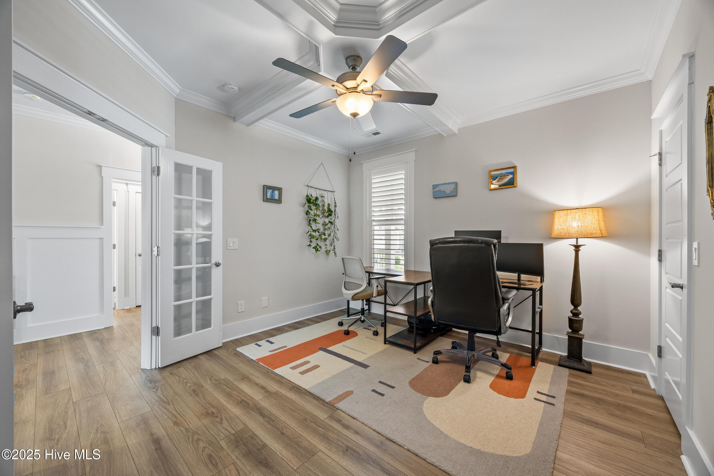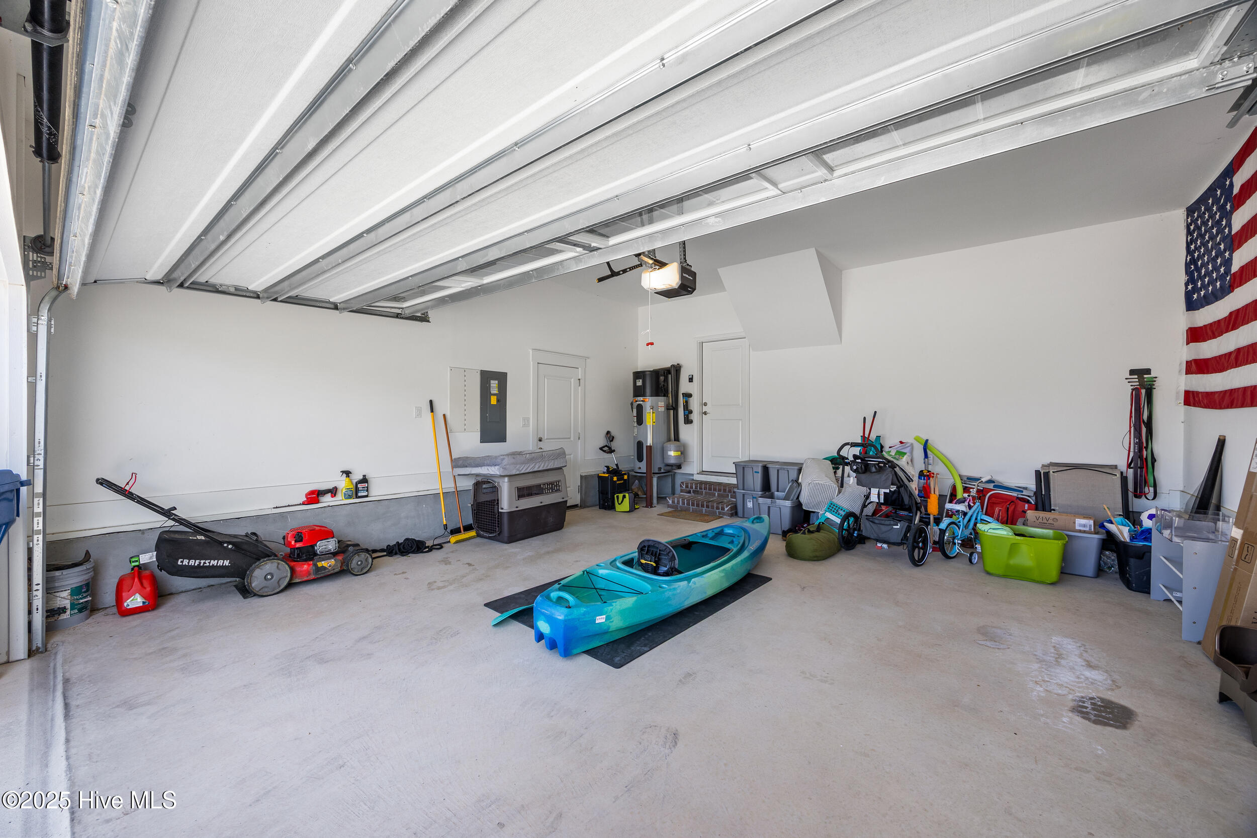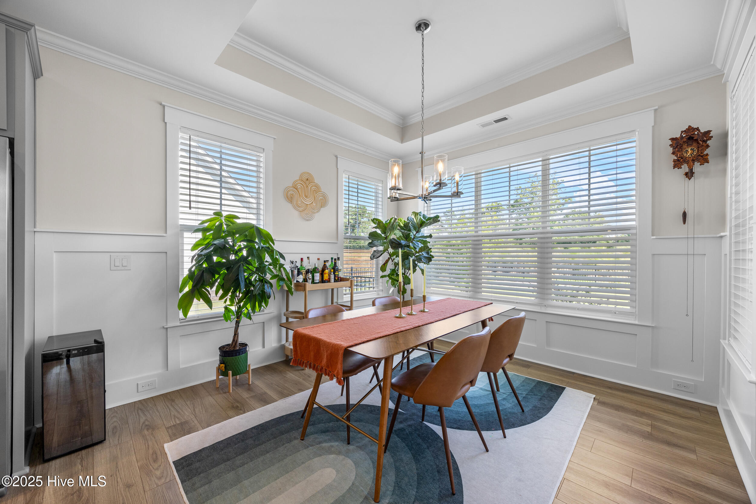 Welcome to luxury coastal living in Salters Haven at Lea Marina! This stunning 4 bedroom, 3 bathroom home with a bonus room offers over 2,500 sq. ft. of thoughtfully designed space, built in 2022 by Bill Clark Homes and loaded with high-end upgrades. Step inside through the inviting foyer accented with wainscoting, and you'll find a flex room with French doors that would make the perfect home office or additional bedroom, and a guest bedroom with a full bath nearby. The open-concept main living area features a spacious living room with a gas log fireplace flanked by custom built-ins, flowing seamlessly into the designer kitchen complete with quartz countertops, upgraded tile backsplash, and stainless steel appliances including a gas range with vent hood, built-in wall oven and microwave. A bright dining area surrounded by windows completes the heart of the home. Just beyond the living room, large sliding glass doors lead to a screened-in porch with a fan, overlooking the fenced, landscaped backyard with an irrigation system. The first-floor owner's suite boasts trey ceilings, a dream walk-in closet with custom built-ins, and a gorgeous ensuite bathroom with dual vanities and a walk-in shower featuring hexagon tile and built-in seating. Upstairs, you'll find a spacious bonus room and a private bedroom suite with an ensuite bath, ideal for guests or multigenerational living. Need storage? This home delivers with a walk-in floored attic offering 480 sq. ft. of additional space. Additional features include LVP flooring throughout, plantation shutters, a mudroom off the 2-car garage, and a dedicated laundry room with shelving and a folding station. Located in the coveted Salters Haven community, residents enjoy resort-style amenities including a marina, award-winning clubhouse, resort-style pool, fire pits, and a kayak launch—all just minutes from the Intracoastal Waterway.