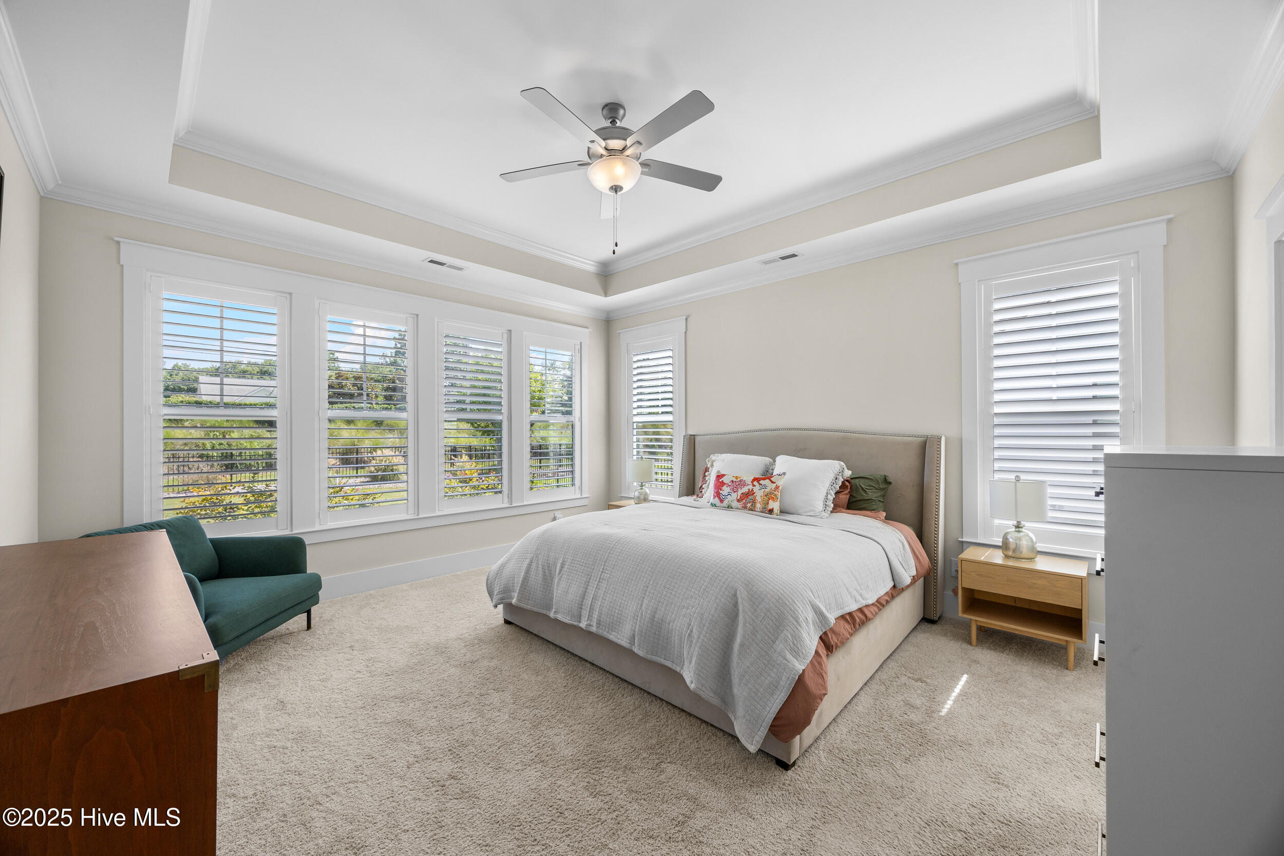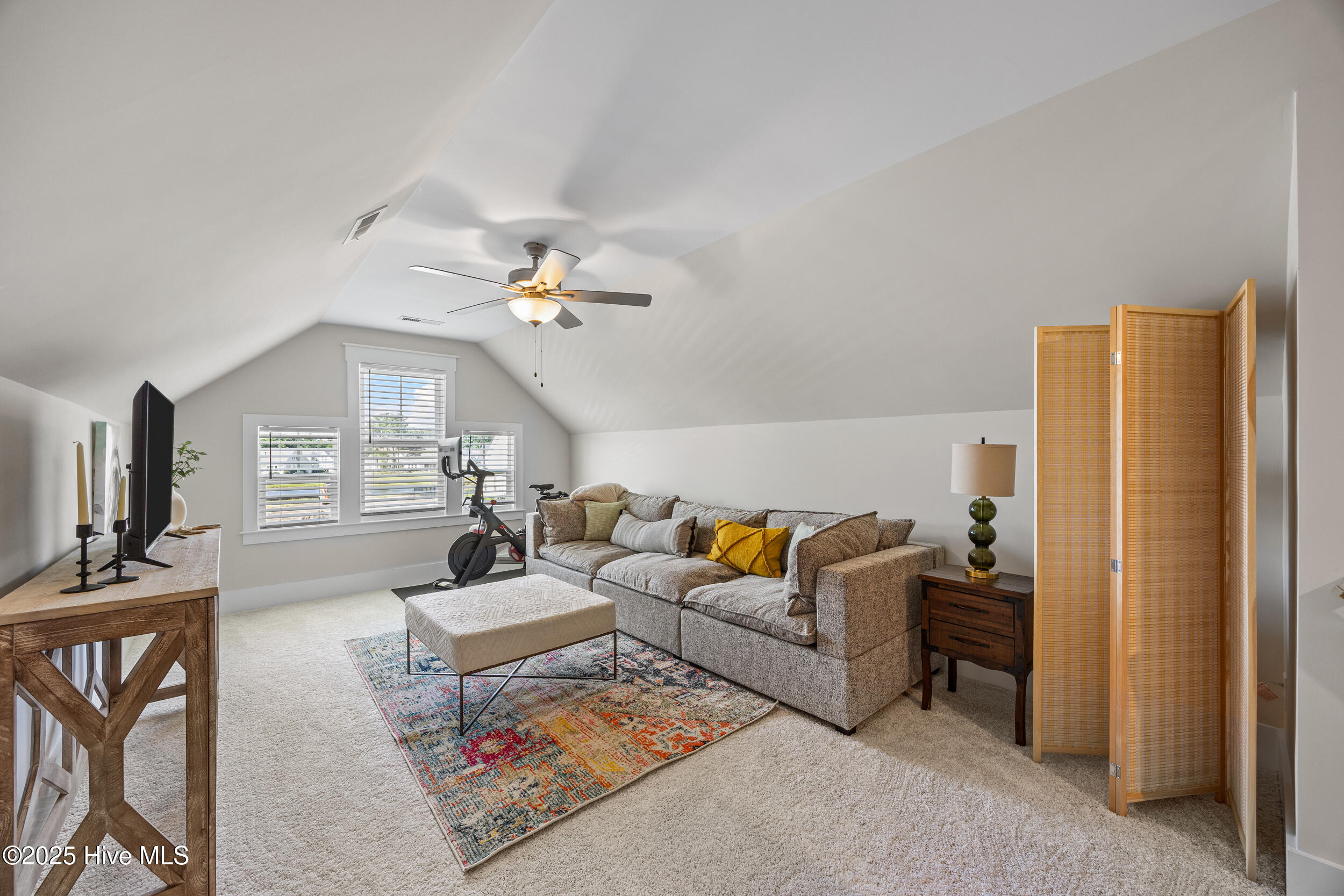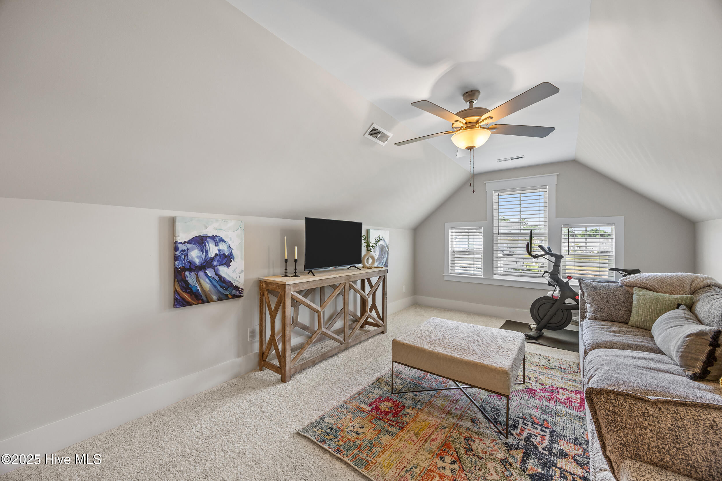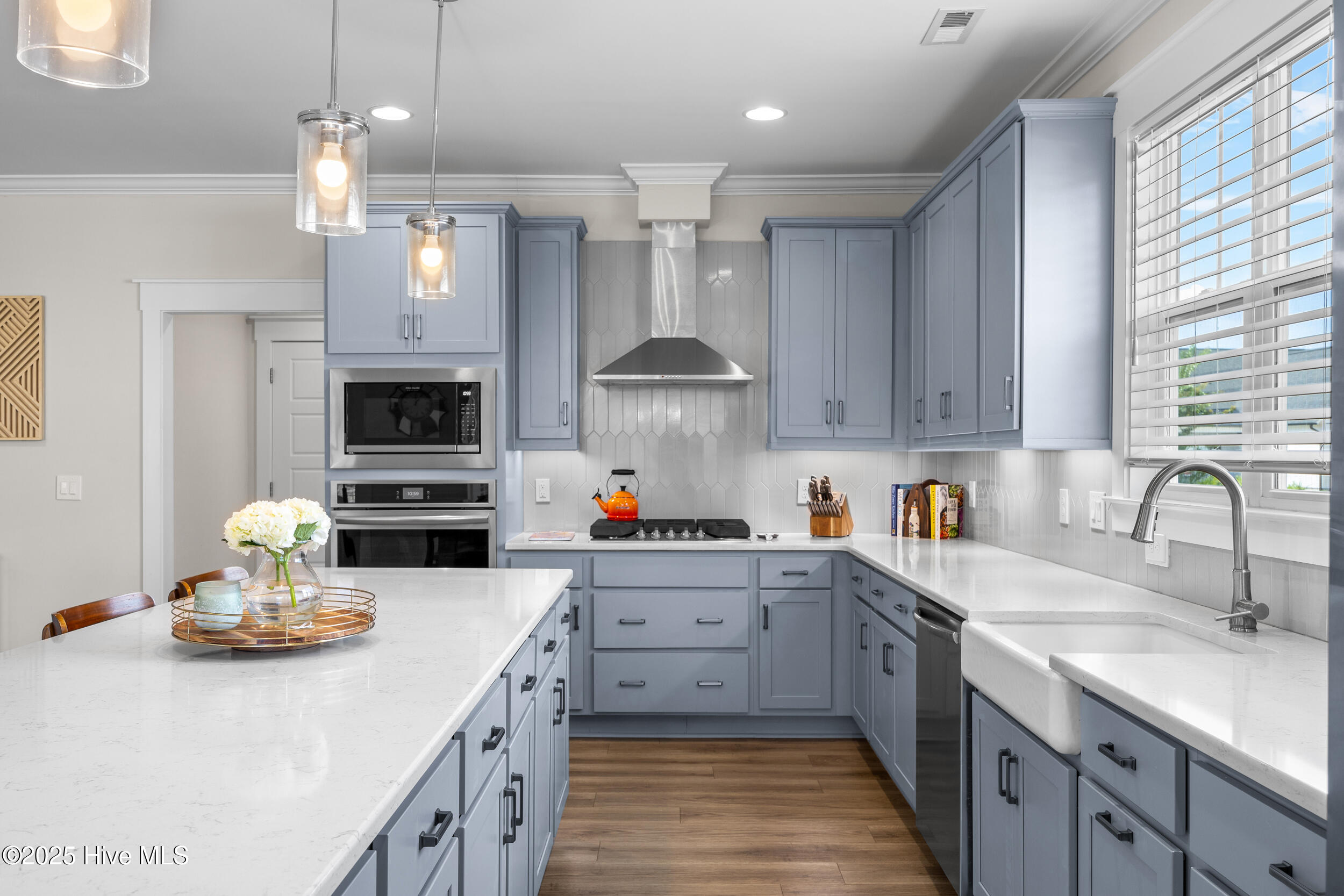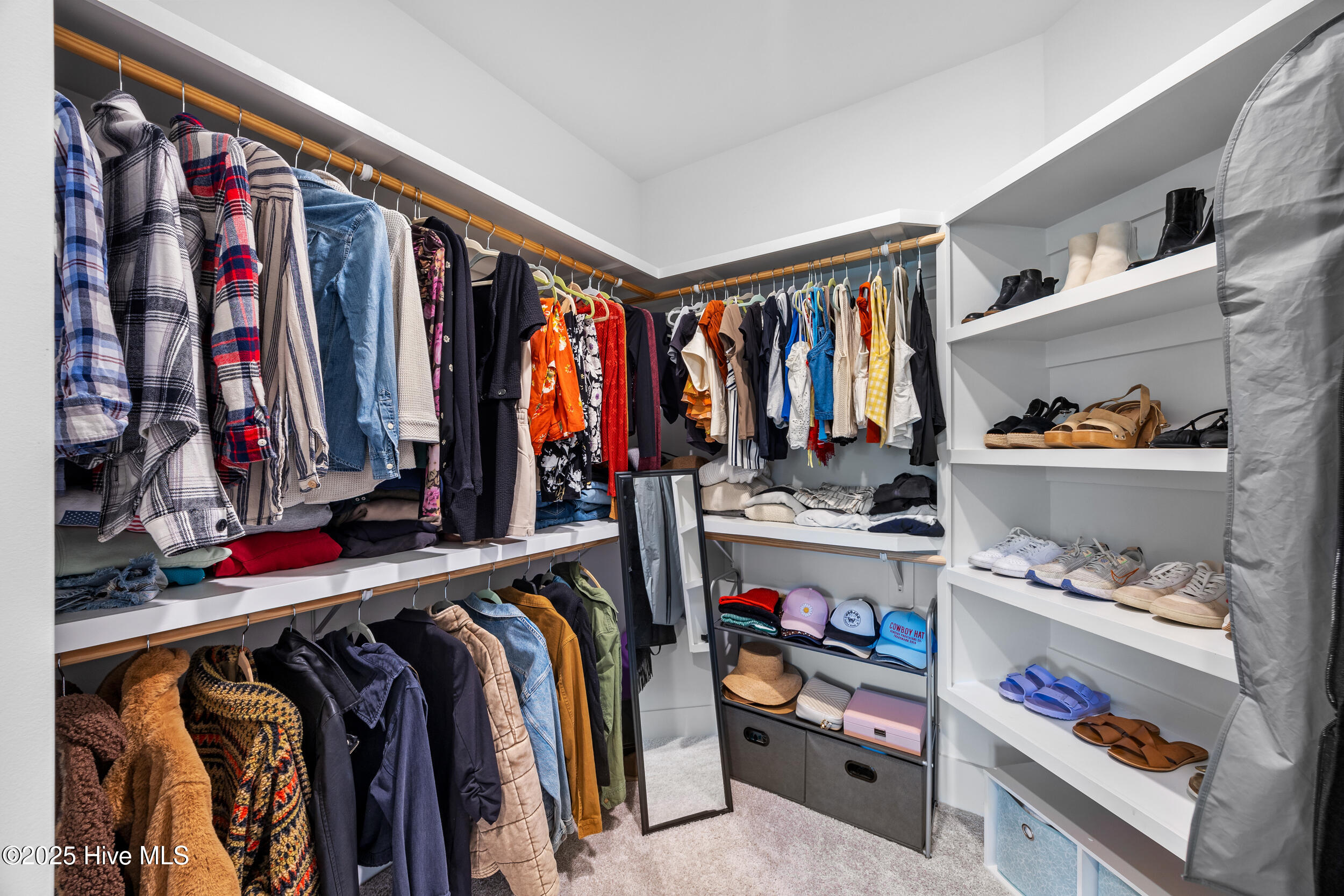 Welcome to luxury coastal living in Salters Haven at Lea Marina! This stunning 4 bedroom, 3 bathroom home with a bonus room offers over 2,500 sq. ft. of thoughtfully designed space, built in 2022 by Bill Clark Homes and loaded with high-end upgrades. Step inside through the inviting foyer accented with wainscoting, and you'll find a flex room with French doors that would make the perfect home office or additional bedroom, and a guest bedroom with a full bath nearby. The open-concept main living area features a spacious living room with a gas log fireplace flanked by custom built-ins, flowing seamlessly into the designer kitchen complete with quartz countertops, upgraded tile backsplash, and stainless steel appliances including a gas range with vent hood, built-in wall oven and microwave. A bright dining area surrounded by windows completes the heart of the home. Just beyond the living room, large sliding glass doors lead to a screened-in porch with a fan, overlooking the fenced, landscaped backyard with an irrigation system. The first-floor owner's suite boasts trey ceilings, a dream walk-in closet with custom built-ins, and a gorgeous ensuite bathroom with dual vanities and a walk-in shower featuring hexagon tile and built-in seating. Upstairs, you'll find a spacious bonus room and a private bedroom suite with an ensuite bath, ideal for guests or multigenerational living. Need storage? This home delivers with a walk-in floored attic offering 480 sq. ft. of additional space. Additional features include LVP flooring throughout, plantation shutters, a mudroom off the 2-car garage, and a dedicated laundry room with shelving and a folding station. Located in the coveted Salters Haven community, residents enjoy resort-style amenities including a marina, award-winning clubhouse, resort-style pool, fire pits, and a kayak launch—all just minutes from the Intracoastal Waterway.