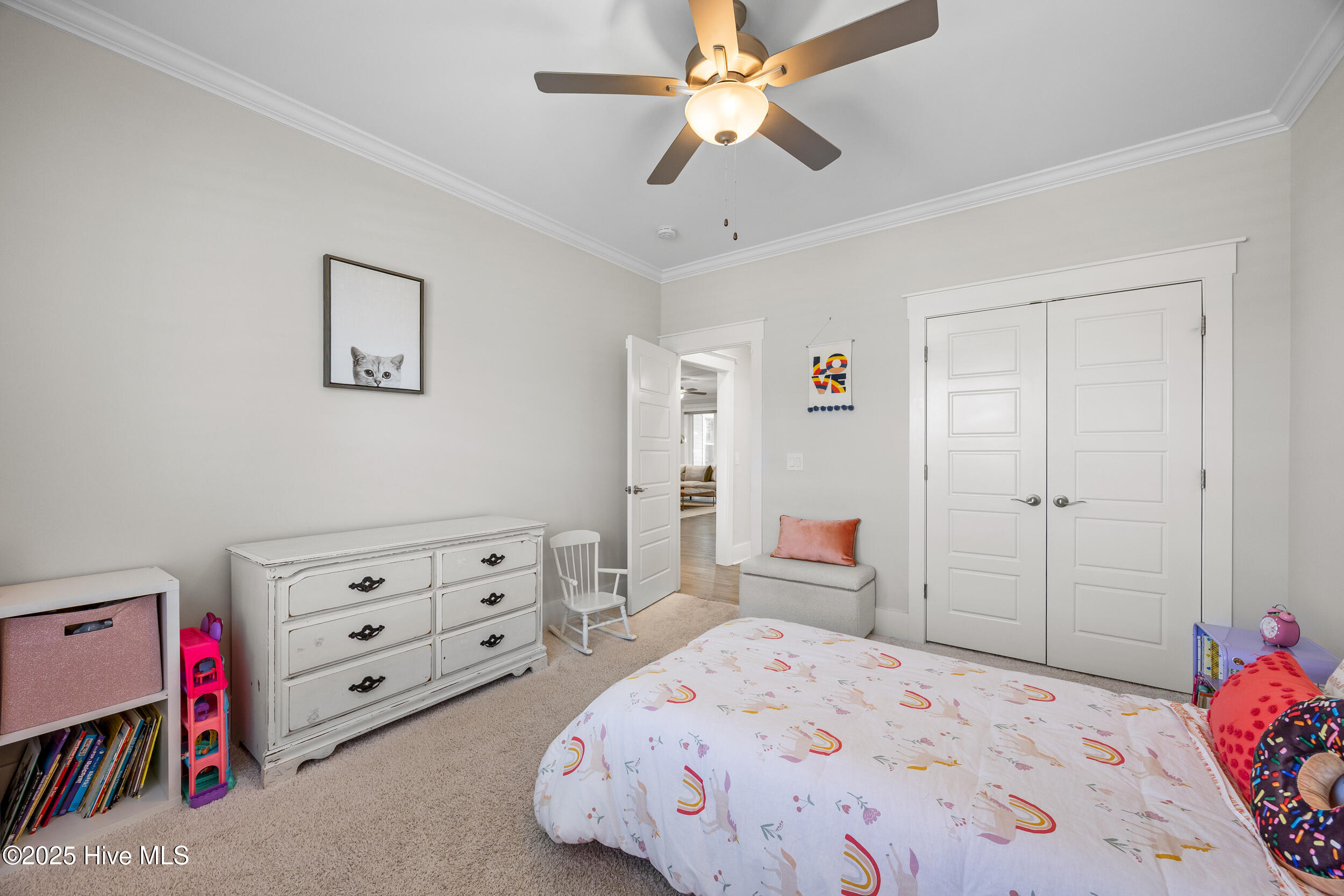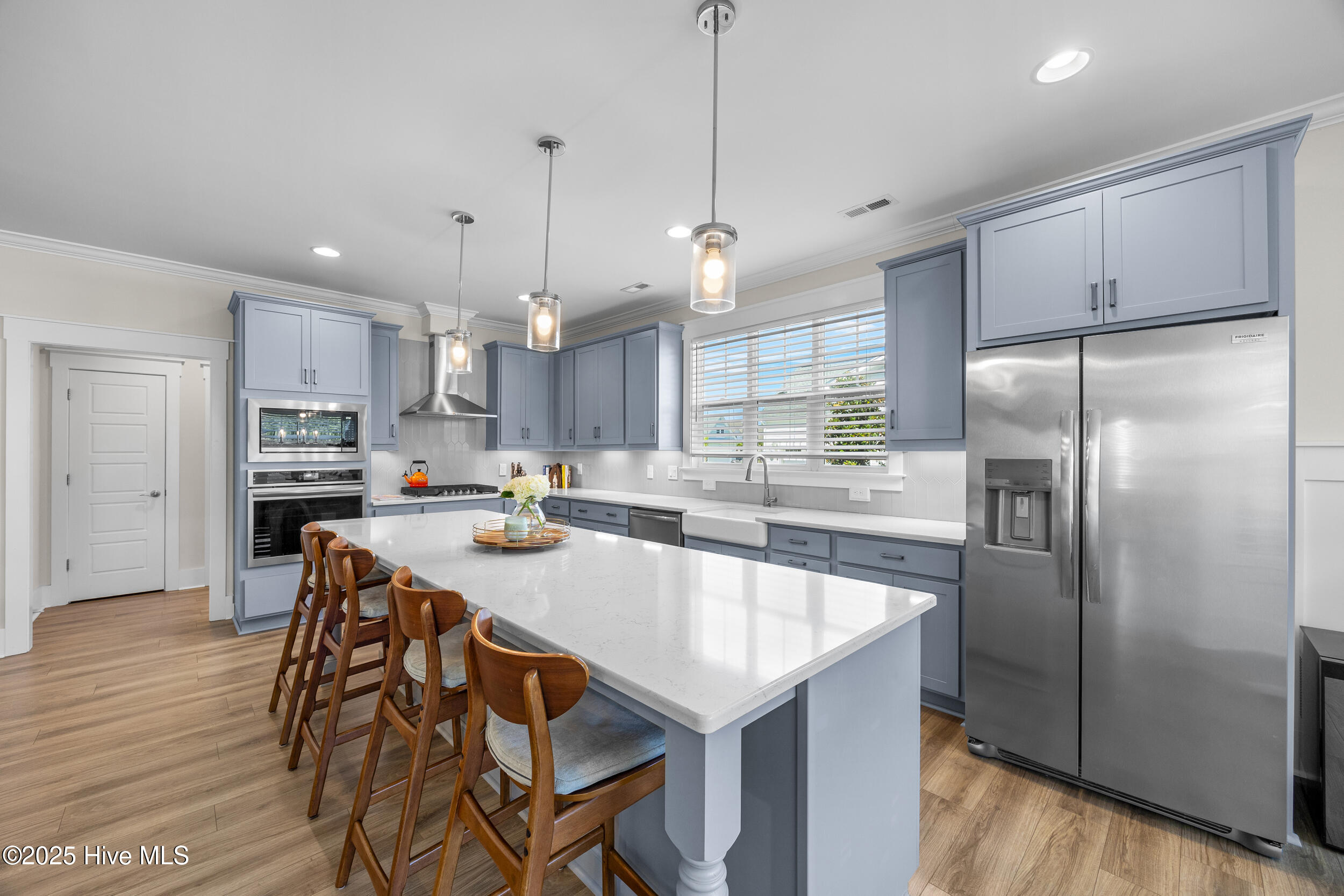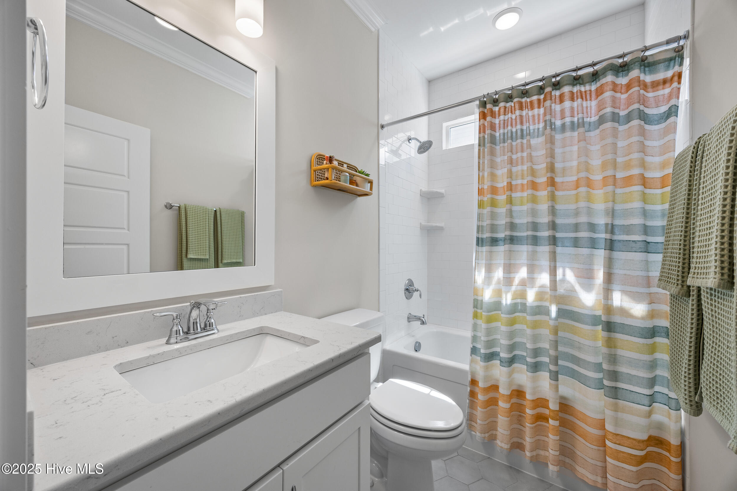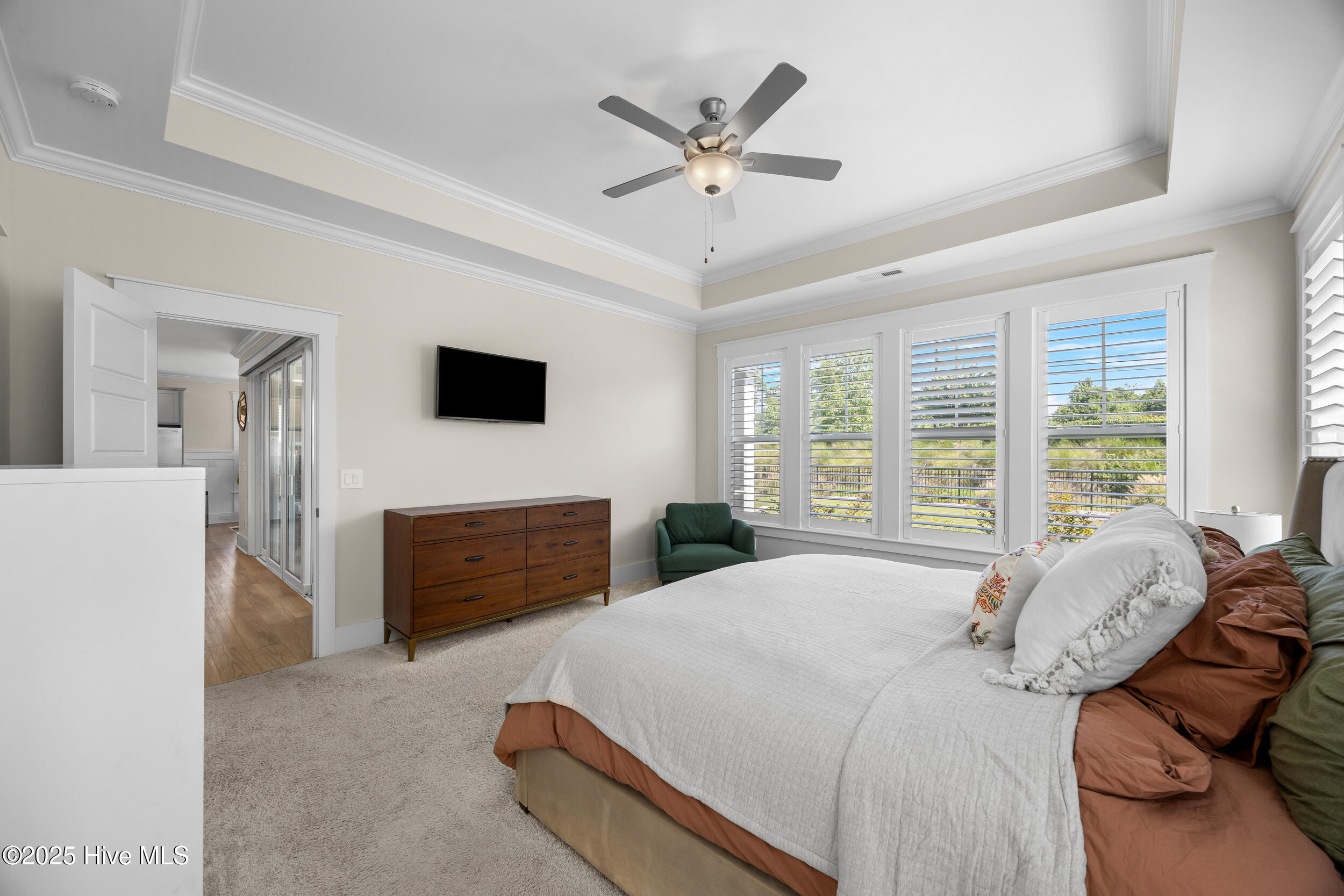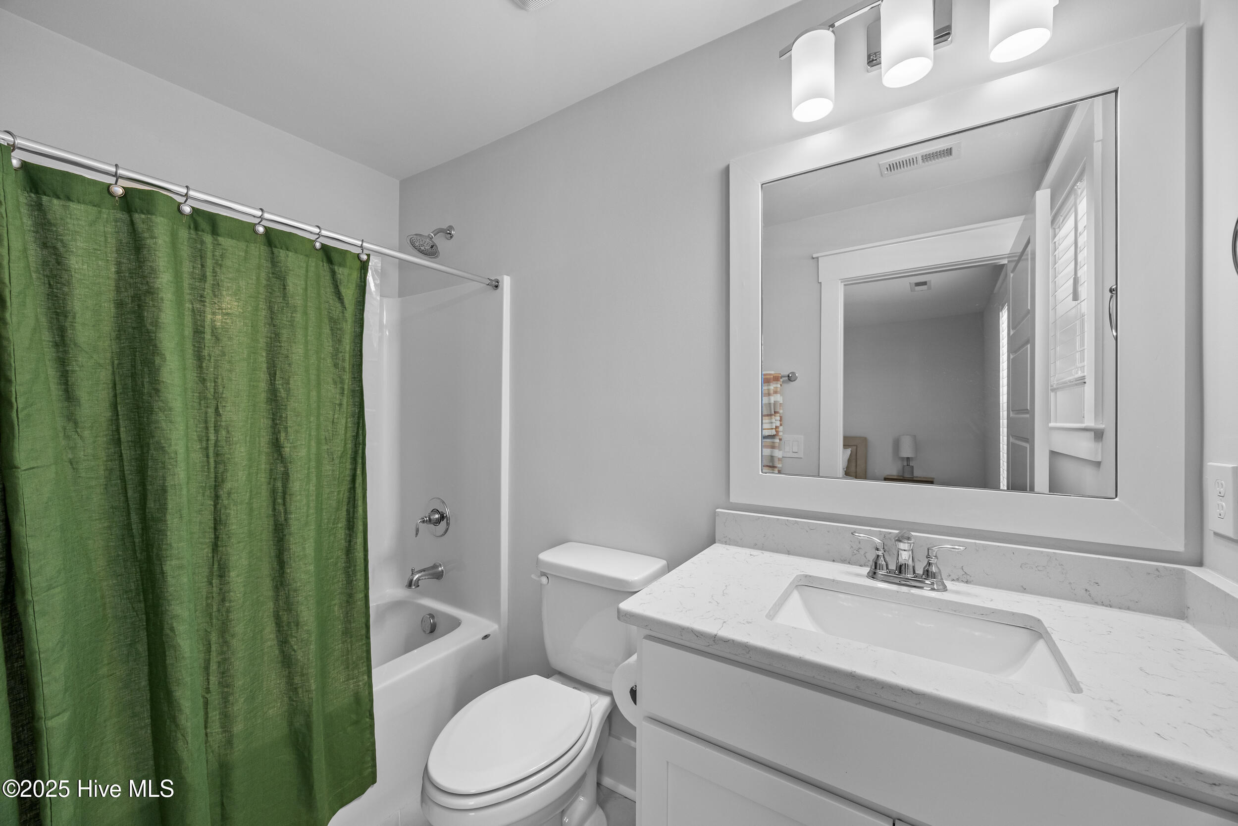 Welcome to luxury coastal living in Salters Haven at Lea Marina! This stunning 4 bedroom, 3 bathroom home with a bonus room offers over 2,500 sq. ft. of thoughtfully designed space, built in 2022 by Bill Clark Homes and loaded with high-end upgrades. Step inside through the inviting foyer accented with wainscoting, and you'll find a flex room with French doors that would make the perfect home office or additional bedroom, and a guest bedroom with a full bath nearby. The open-concept main living area features a spacious living room with a gas log fireplace flanked by custom built-ins, flowing seamlessly into the designer kitchen complete with quartz countertops, upgraded tile backsplash, and stainless steel appliances including a gas range with vent hood, built-in wall oven and microwave. A bright dining area surrounded by windows completes the heart of the home. Just beyond the living room, large sliding glass doors lead to a screened-in porch with a fan, overlooking the fenced, landscaped backyard with an irrigation system. The first-floor owner's suite boasts trey ceilings, a dream walk-in closet with custom built-ins, and a gorgeous ensuite bathroom with dual vanities and a walk-in shower featuring hexagon tile and built-in seating. Upstairs, you'll find a spacious bonus room and a private bedroom suite with an ensuite bath, ideal for guests or multigenerational living. Need storage? This home delivers with a walk-in floored attic offering 480 sq. ft. of additional space. Additional features include LVP flooring throughout, plantation shutters, a mudroom off the 2-car garage, and a dedicated laundry room with shelving and a folding station. Located in the coveted Salters Haven community, residents enjoy resort-style amenities including a marina, award-winning clubhouse, resort-style pool, fire pits, and a kayak launch—all just minutes from the Intracoastal Waterway.