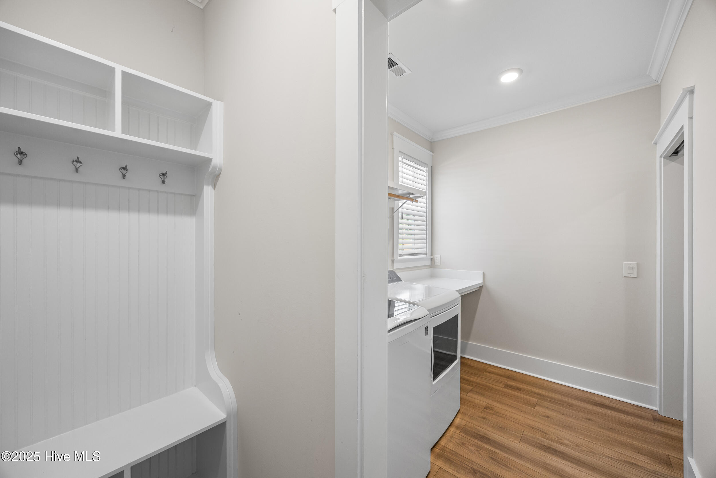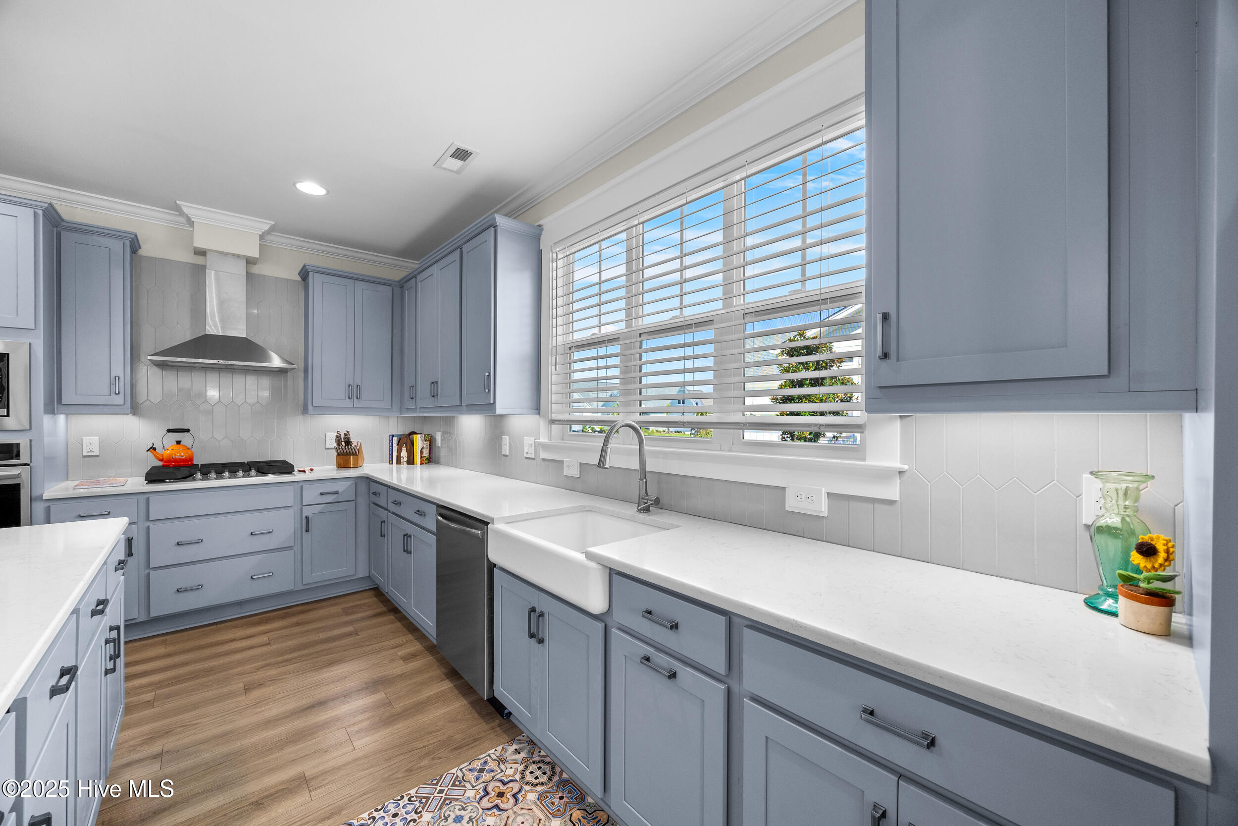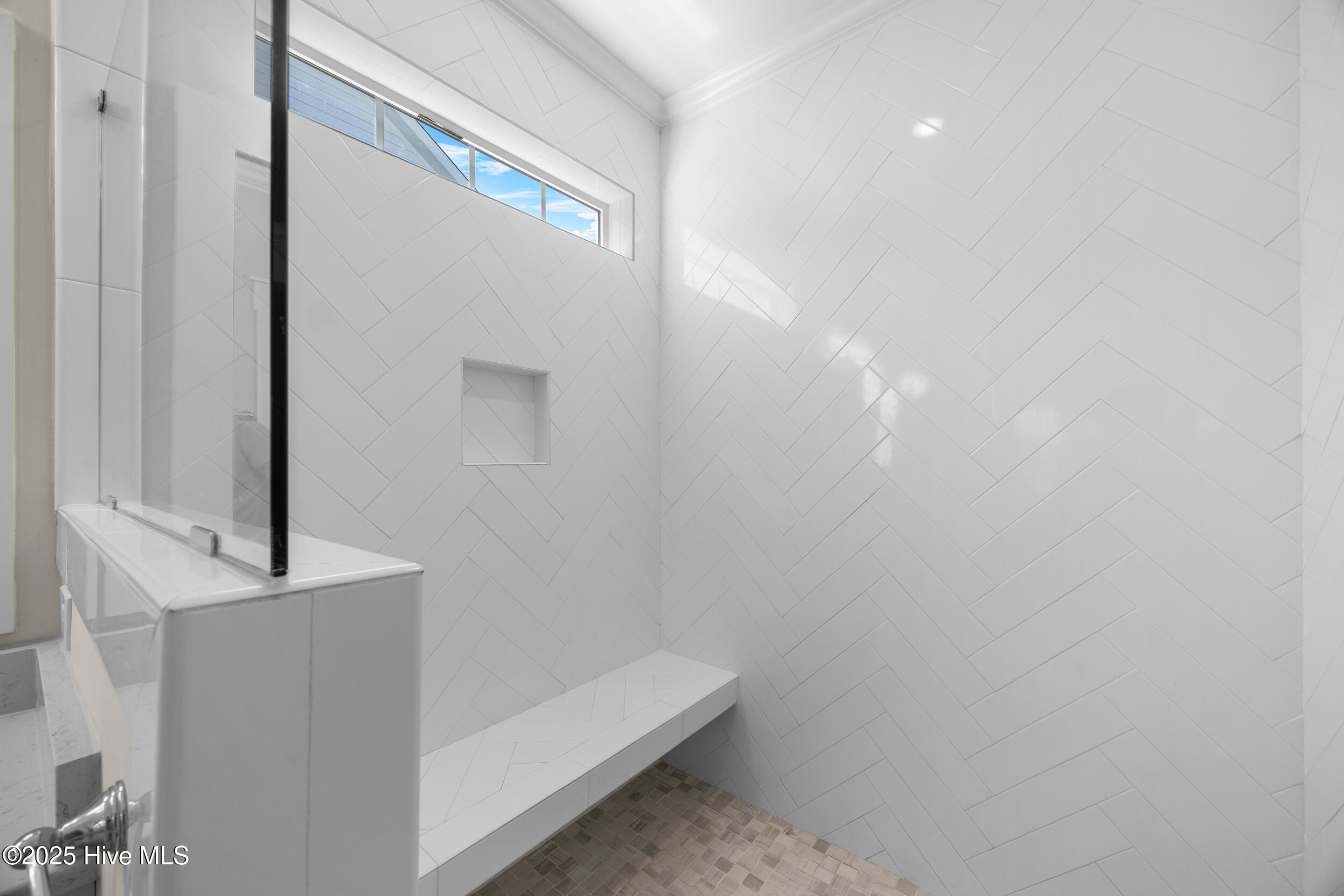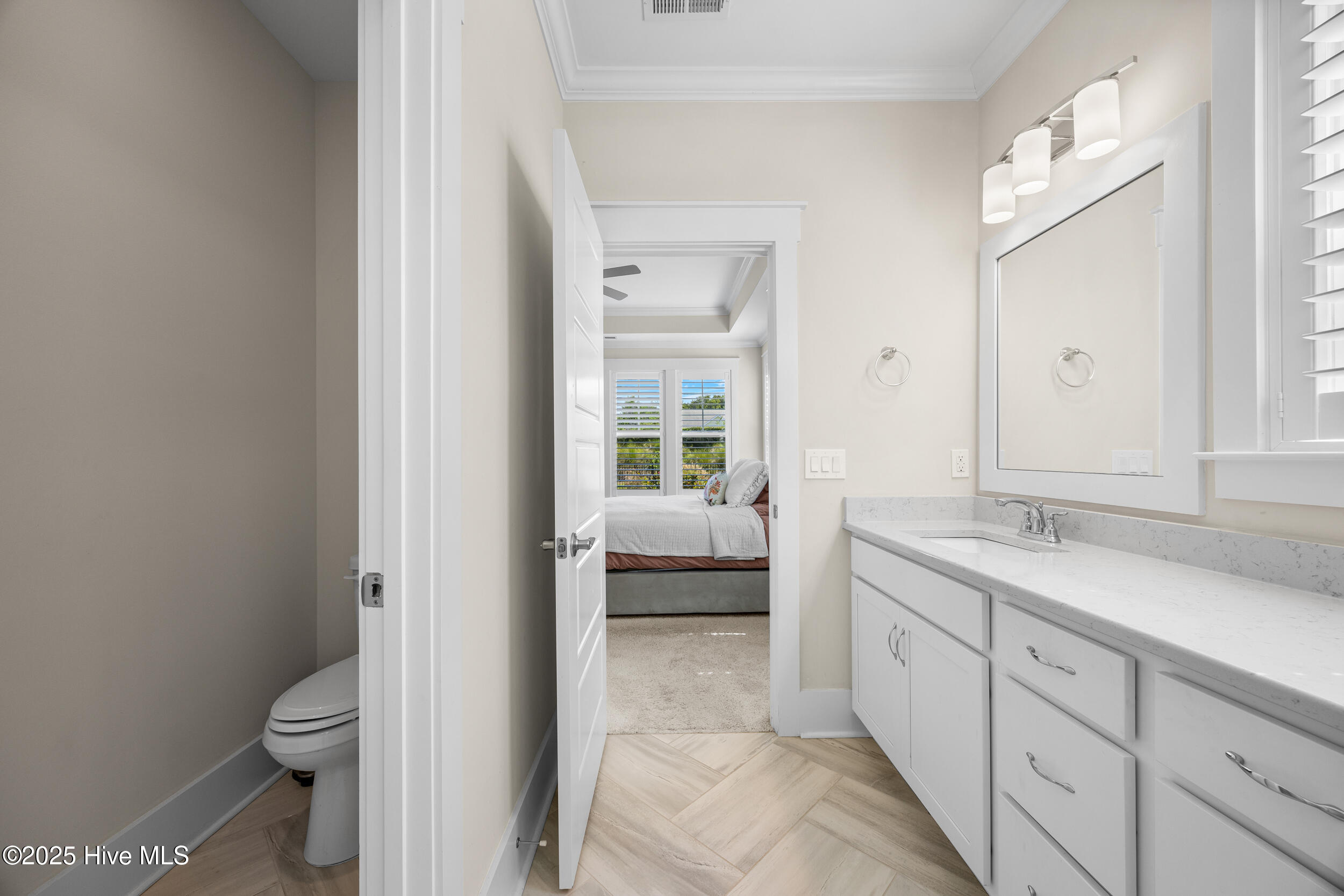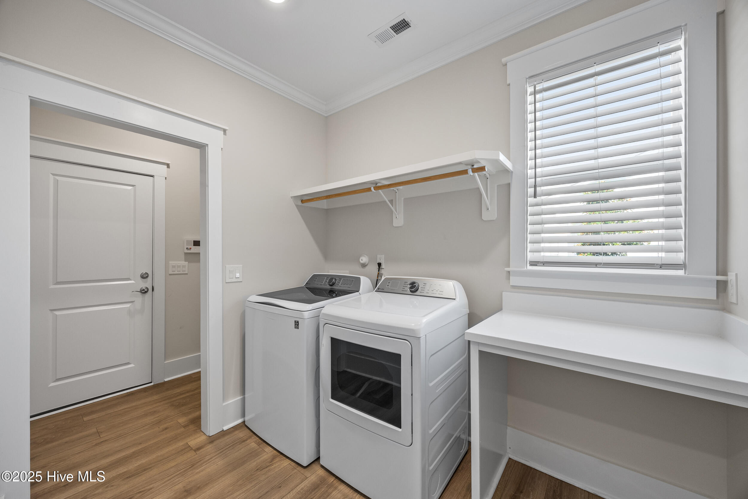 Welcome to luxury coastal living in Salters Haven at Lea Marina! This stunning 4 bedroom, 3 bathroom home with a bonus room offers over 2,500 sq. ft. of thoughtfully designed space, built in 2022 by Bill Clark Homes and loaded with high-end upgrades. Step inside through the inviting foyer accented with wainscoting, and you'll find a flex room with French doors that would make the perfect home office or additional bedroom, and a guest bedroom with a full bath nearby. The open-concept main living area features a spacious living room with a gas log fireplace flanked by custom built-ins, flowing seamlessly into the designer kitchen complete with quartz countertops, upgraded tile backsplash, and stainless steel appliances including a gas range with vent hood, built-in wall oven and microwave. A bright dining area surrounded by windows completes the heart of the home. Just beyond the living room, large sliding glass doors lead to a screened-in porch with a fan, overlooking the fenced, landscaped backyard with an irrigation system. The first-floor owner's suite boasts trey ceilings, a dream walk-in closet with custom built-ins, and a gorgeous ensuite bathroom with dual vanities and a walk-in shower featuring hexagon tile and built-in seating. Upstairs, you'll find a spacious bonus room and a private bedroom suite with an ensuite bath, ideal for guests or multigenerational living. Need storage? This home delivers with a walk-in floored attic offering 480 sq. ft. of additional space. Additional features include LVP flooring throughout, plantation shutters, a mudroom off the 2-car garage, and a dedicated laundry room with shelving and a folding station. Located in the coveted Salters Haven community, residents enjoy resort-style amenities including a marina, award-winning clubhouse, resort-style pool, fire pits, and a kayak launch—all just minutes from the Intracoastal Waterway.
