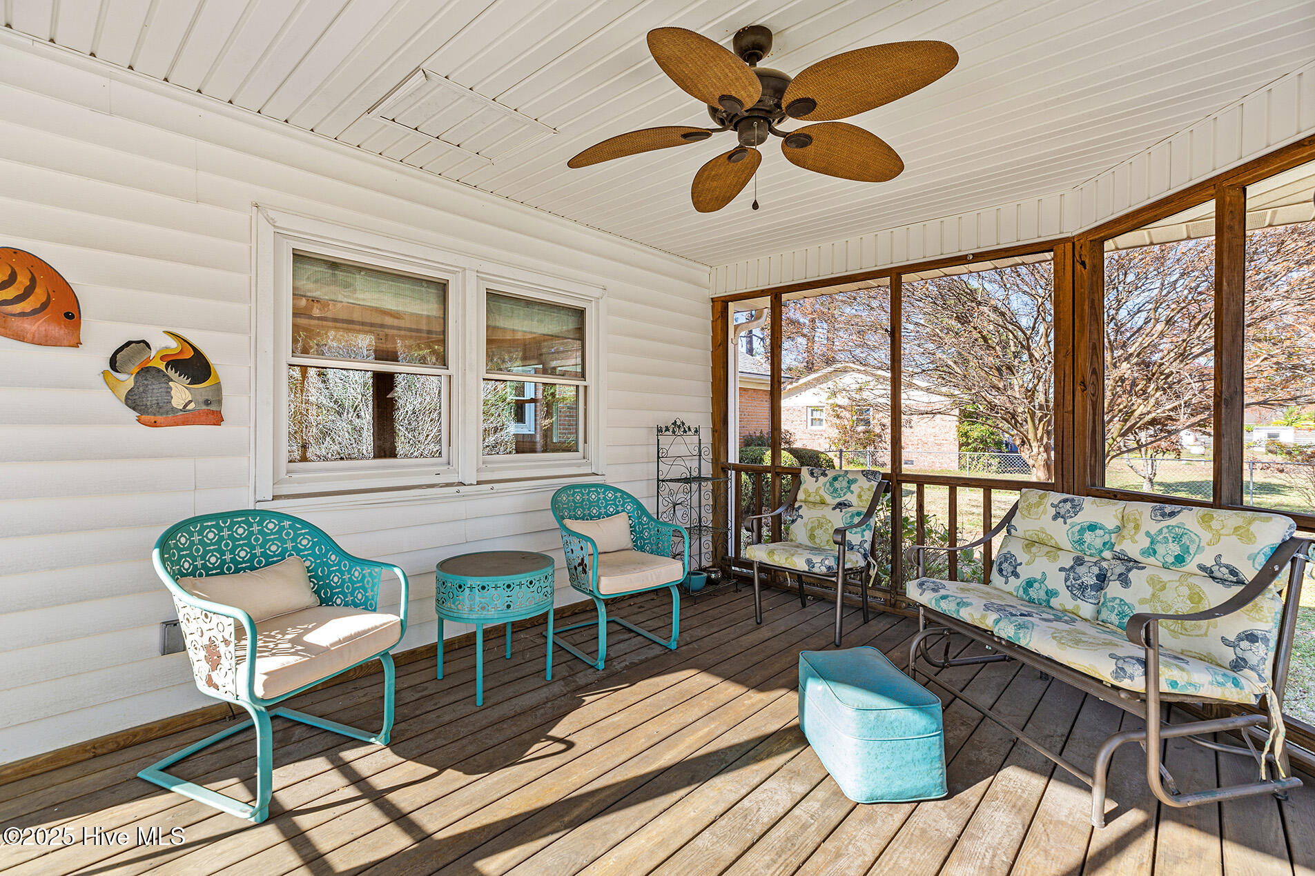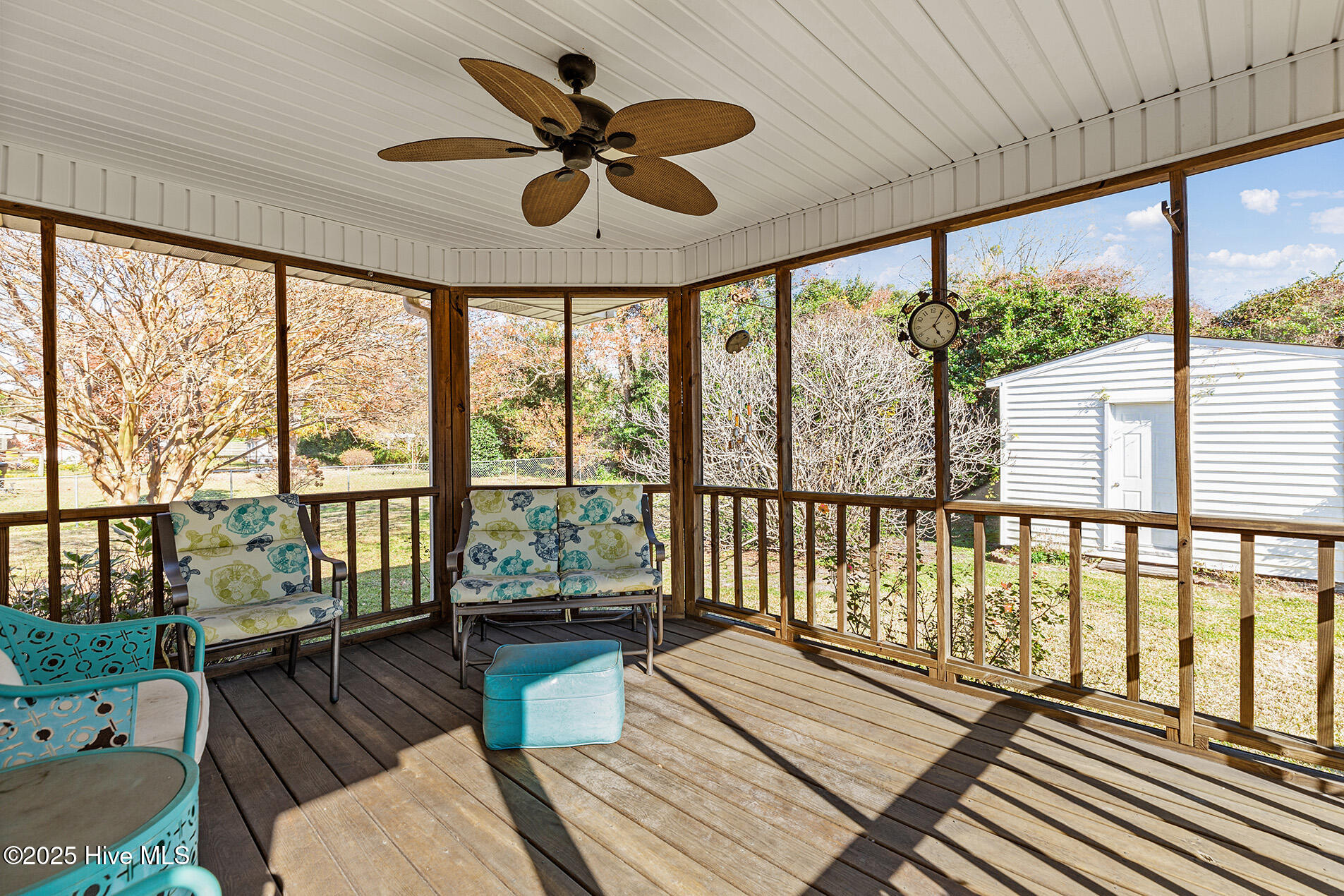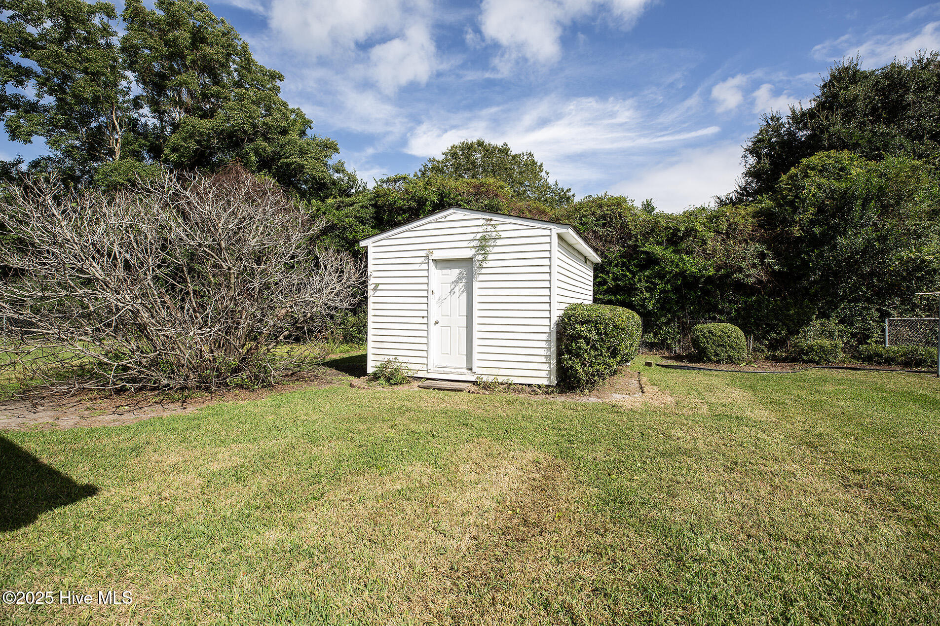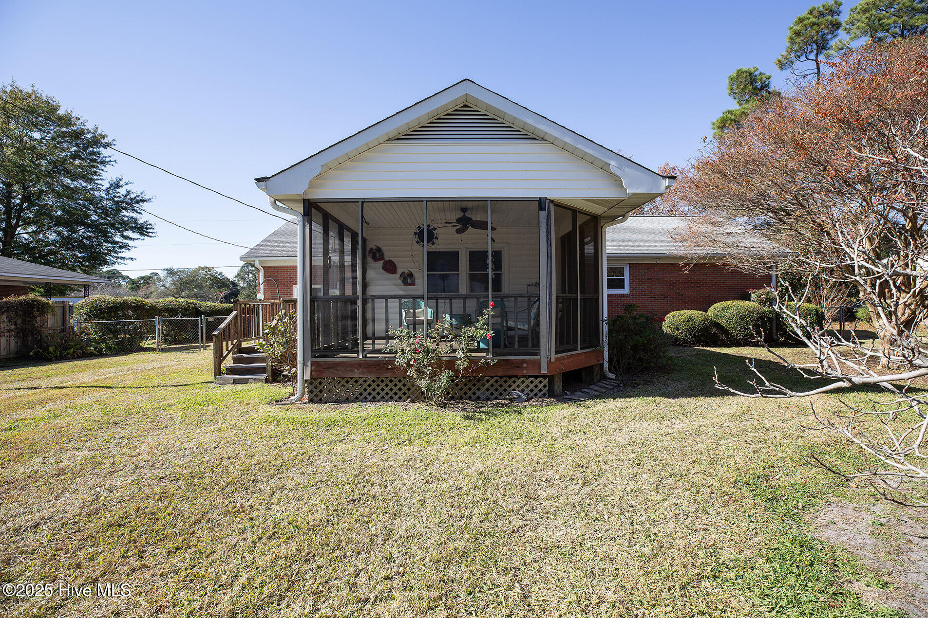 You will love this well-maintained, 3 bedroom and 1.5 bath - ranch style home in sought-after Crestwood. The curb appeal is enhanced by its manicured landscape and mature oaks. The interior is warm and inviting - accentuated by its muted color palette, wide door openings and vintage characteristics. The spacious kitchen boasts ample countertops, authentic wood cabinetry, original paneling, and an eat-in kitchen. One of the prominent features is the cheerful den overlooking the large fenced backyard. The primary bedroom has ample closet space and is adjoined to its primary half bath. The second and third bedrooms are both generously proportioned and also have adequate closets. Other features of this home include formal areas, plank flooring, a single car garage, screened porch, spacious deck, and a storage shed. The location is near I-40, ILM airport, shopping, and an array of dining options. Welcome home!