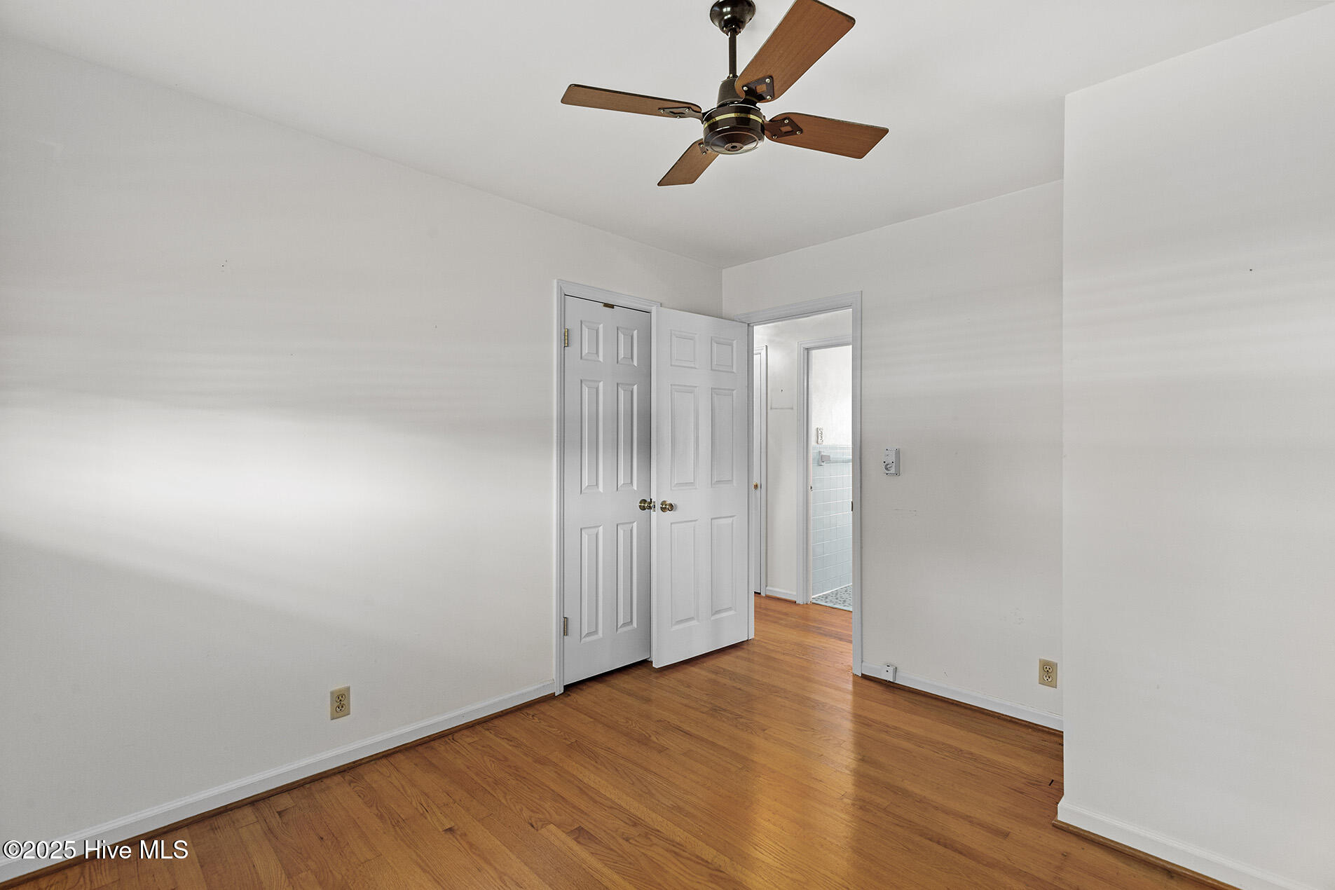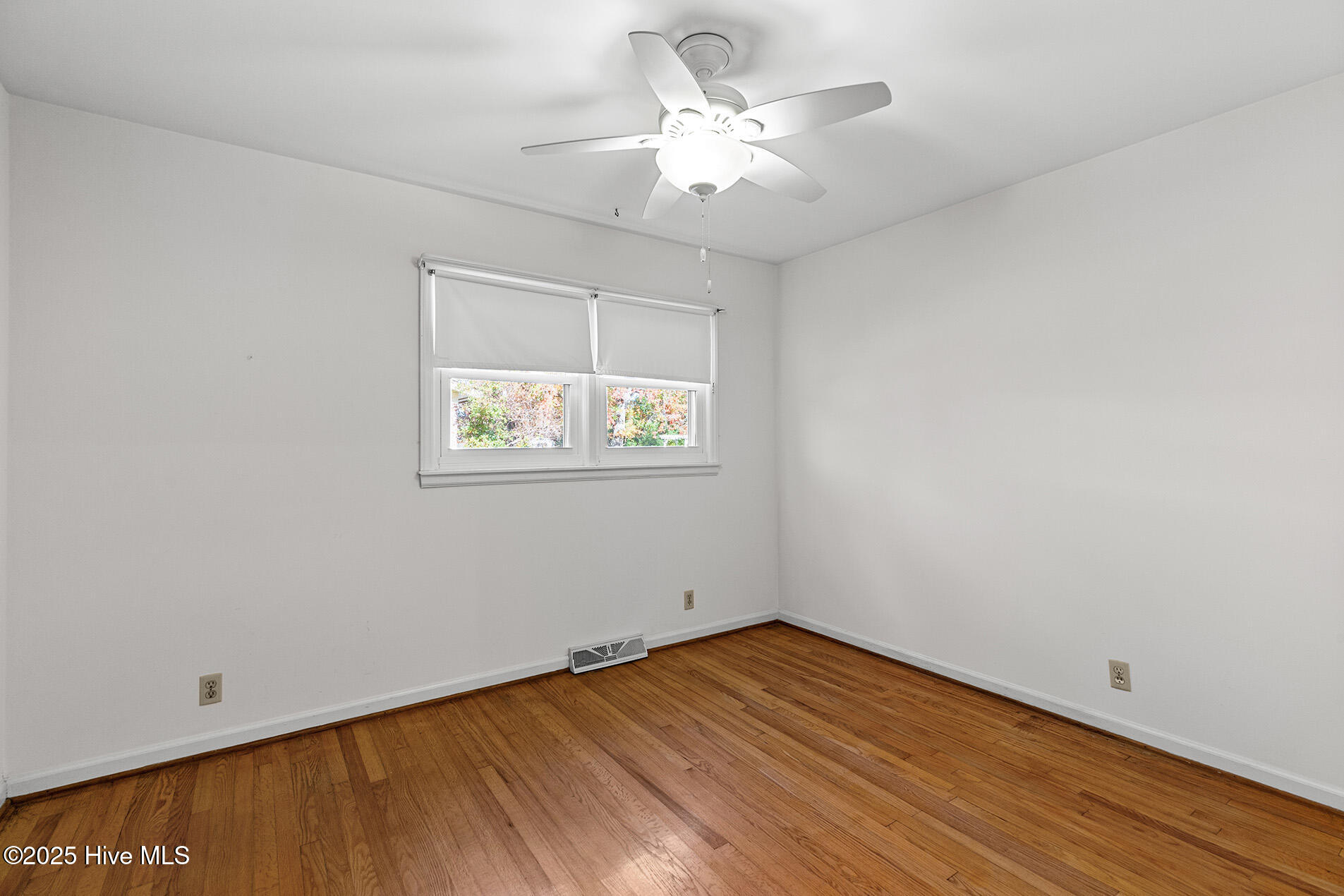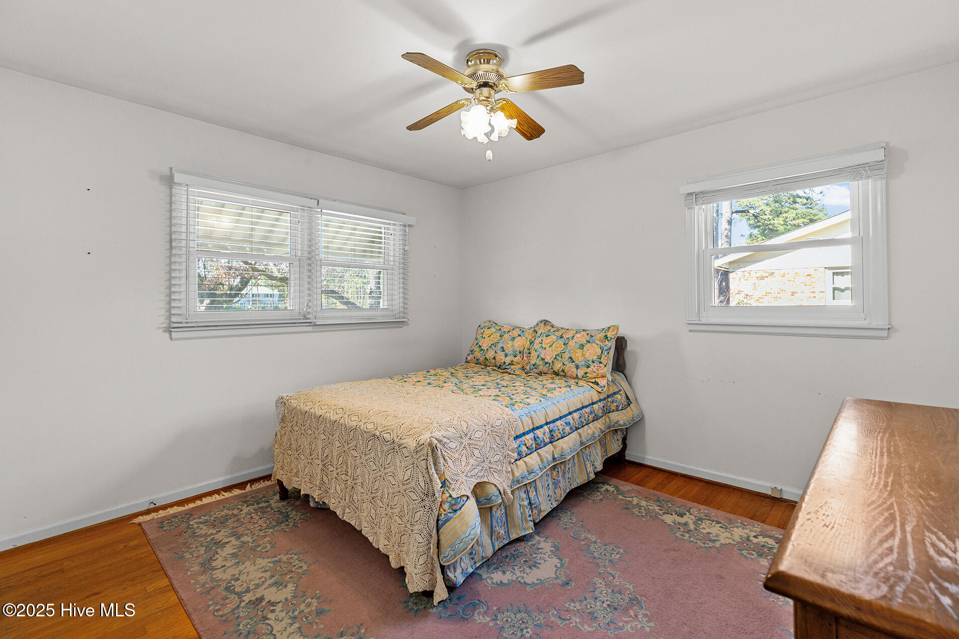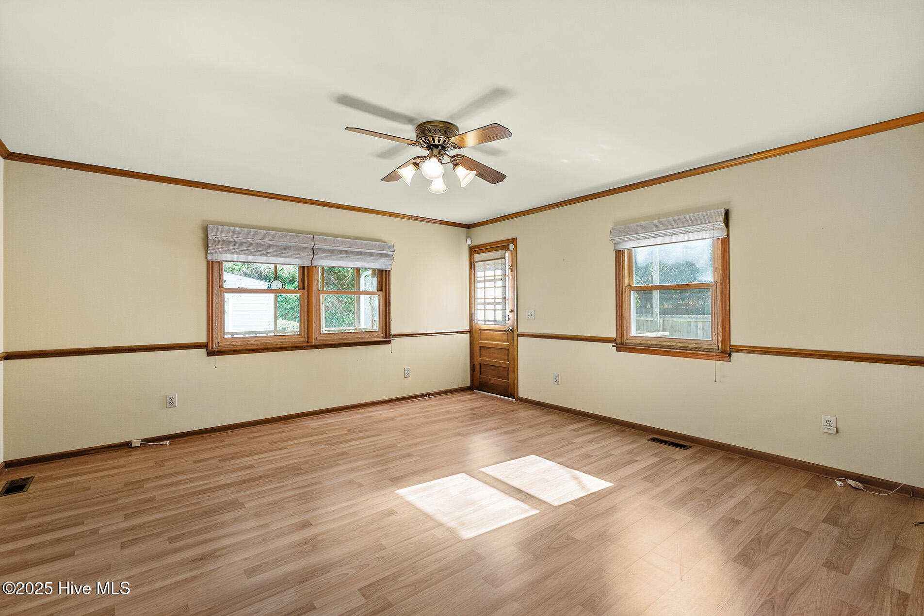 You will love this well-maintained, 3 bedroom and 1.5 bath - ranch style home in sought-after Crestwood. The curb appeal is enhanced by its manicured landscape and mature oaks. The interior is warm and inviting - accentuated by its muted color palette, wide door openings and vintage characteristics. The spacious kitchen boasts ample countertops, authentic wood cabinetry, original paneling, and an eat-in kitchen. One of the prominent features is the cheerful den overlooking the large fenced backyard. The primary bedroom has ample closet space and is adjoined to its primary half bath. The second and third bedrooms are both generously proportioned and also have adequate closets. Other features of this home include formal areas, plank flooring, a single car garage, screened porch, spacious deck, and a storage shed. The location is near I-40, ILM airport, shopping, and an array of dining options. Welcome home!